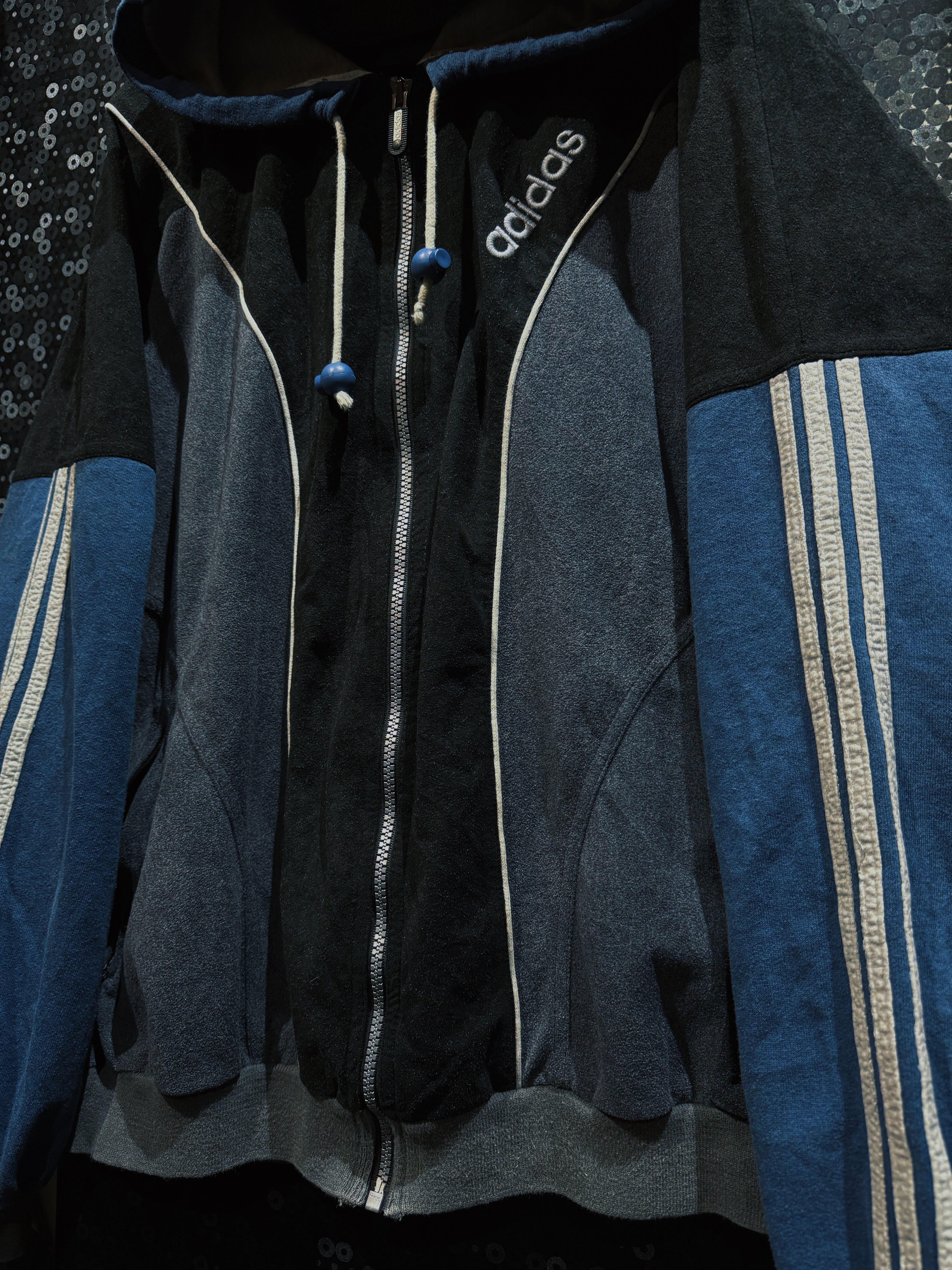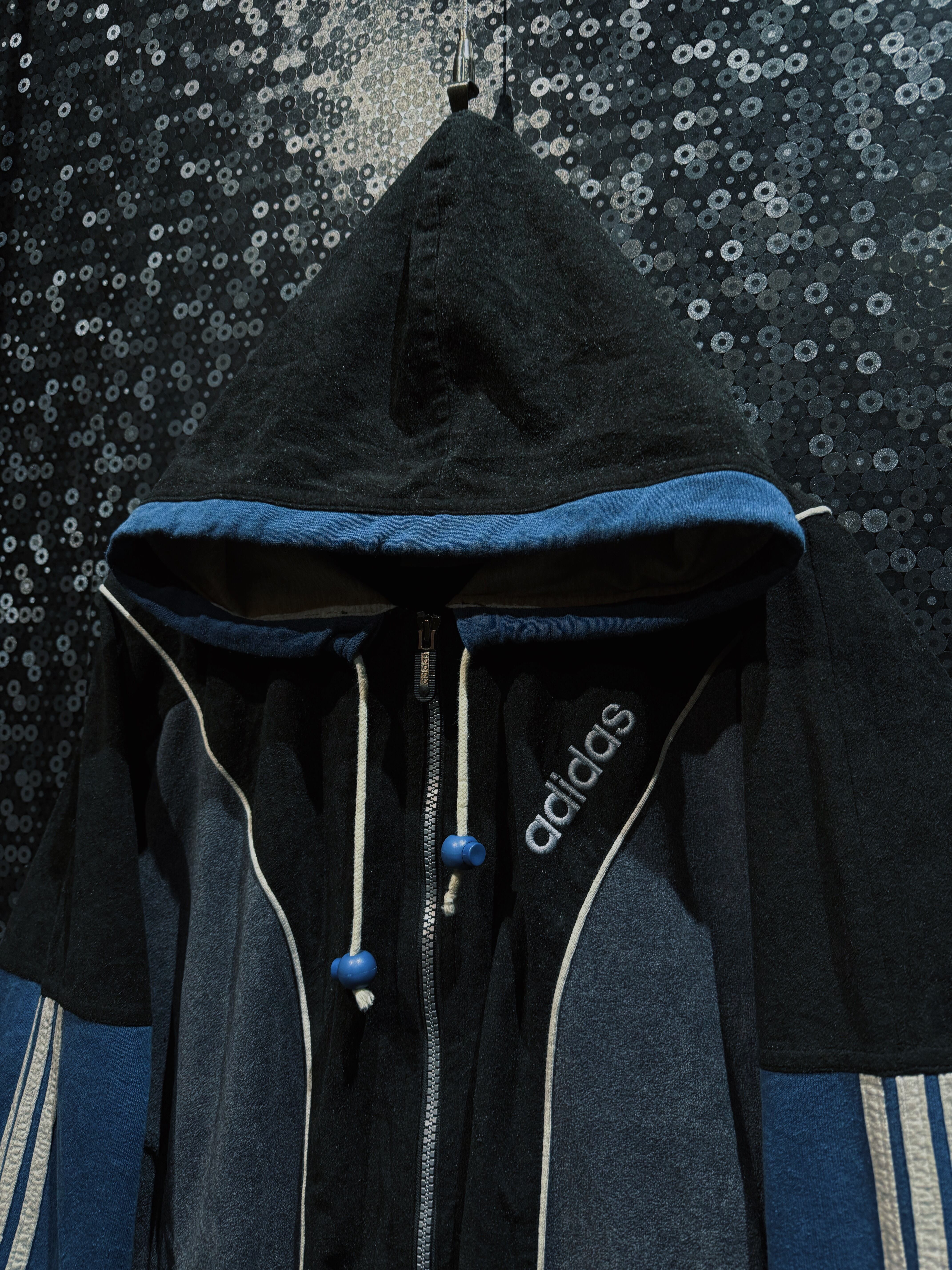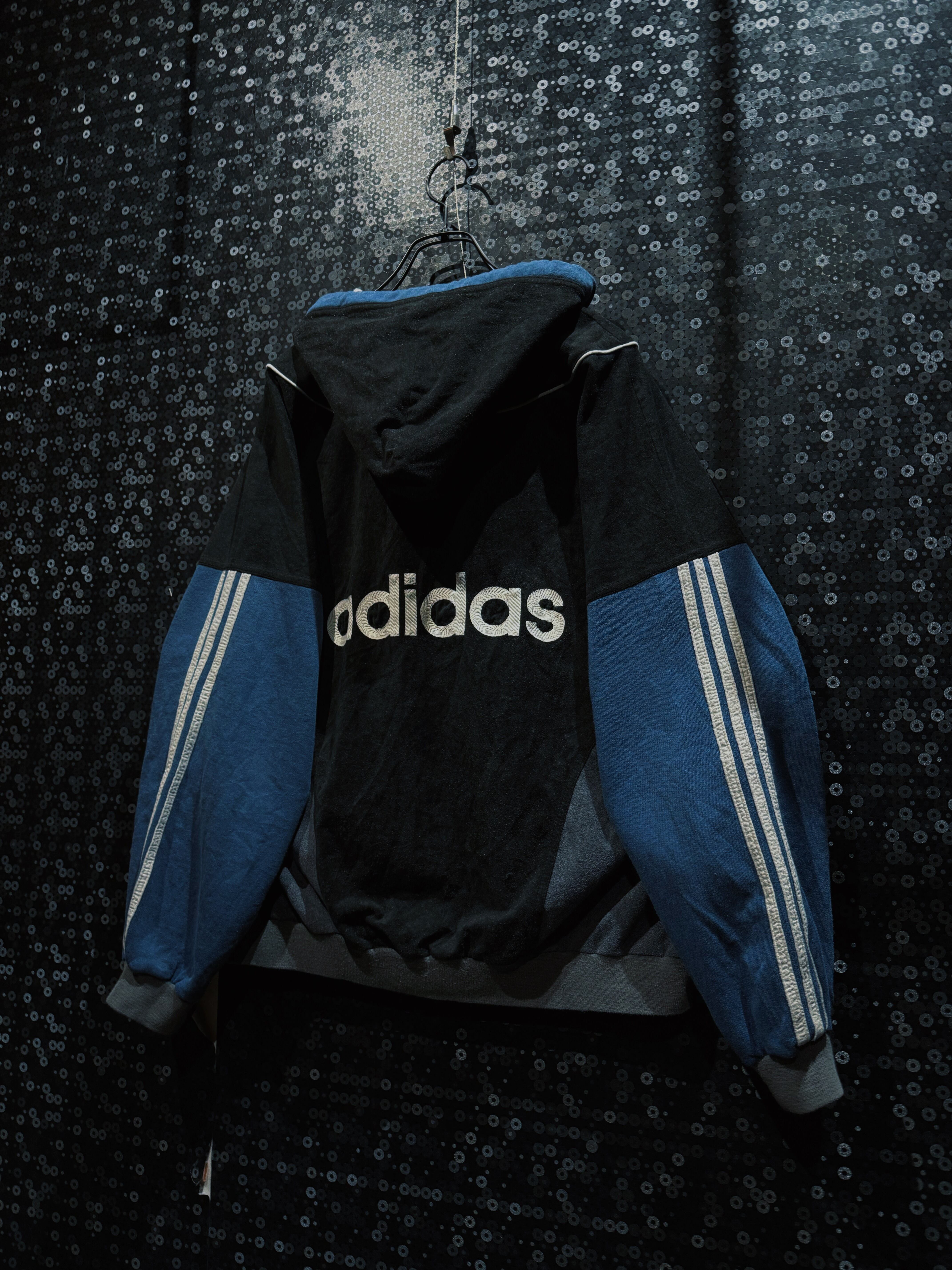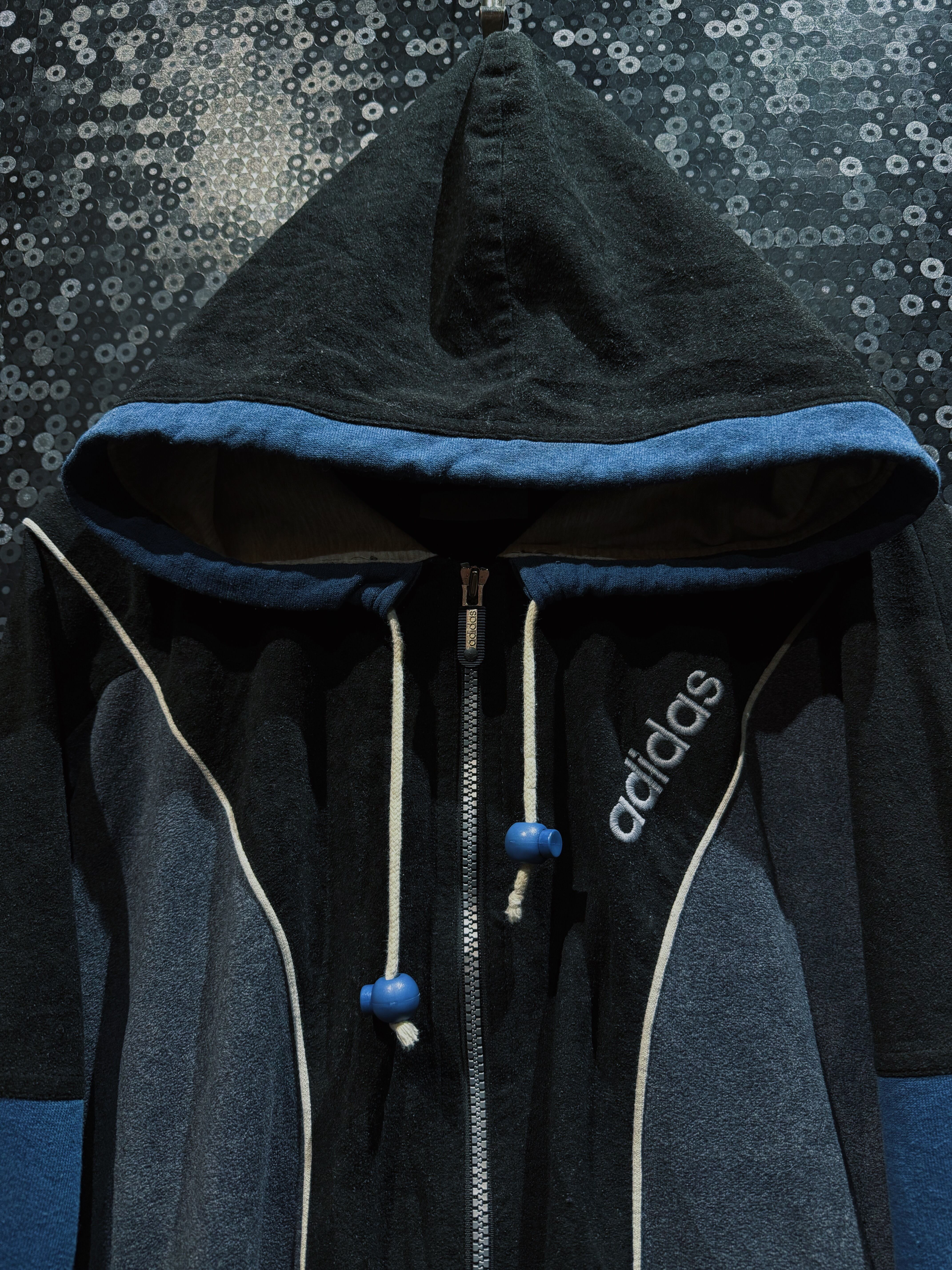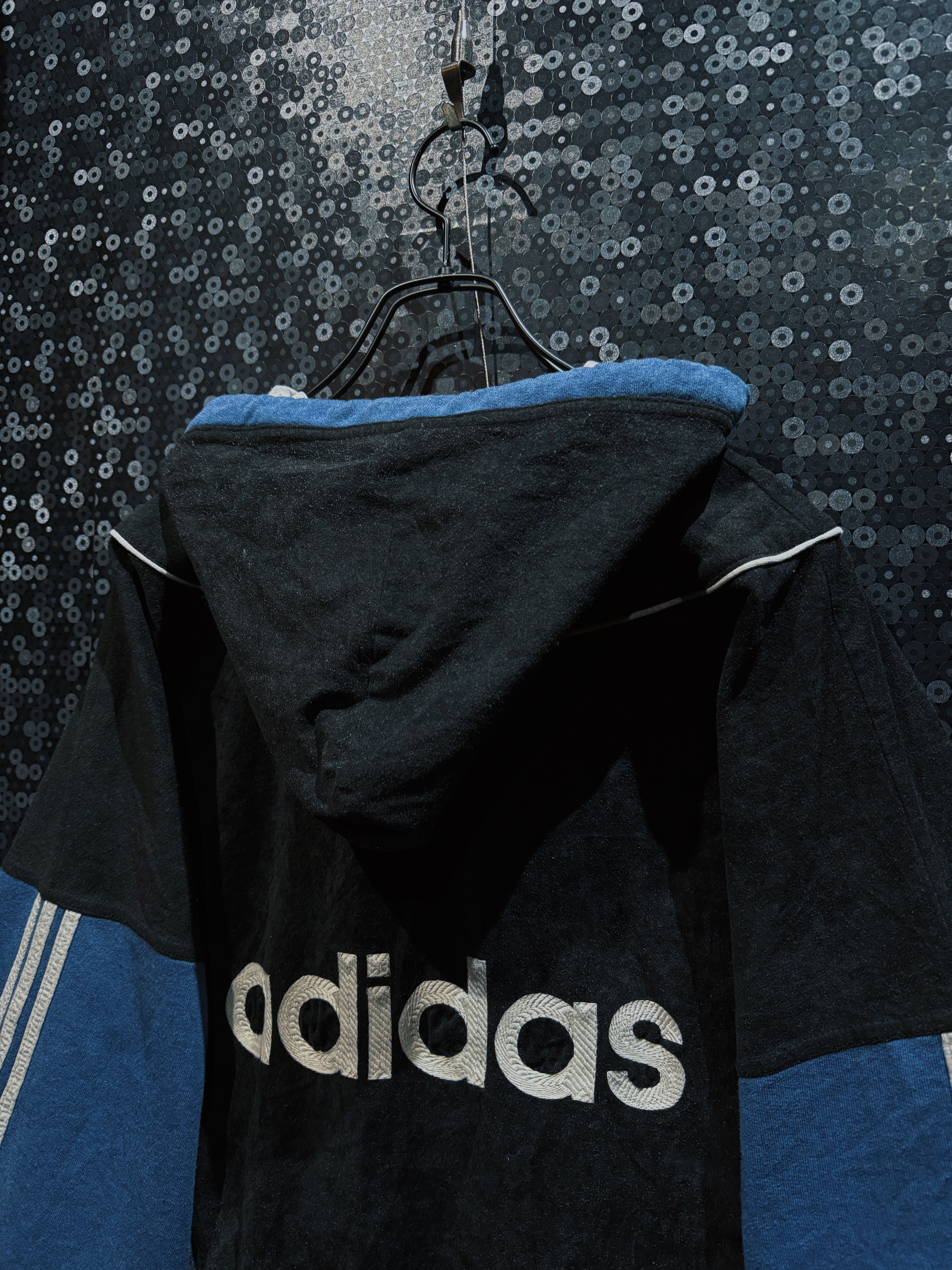 肉厚なフリースボディをベースに、ブラック×ネイビーの切り替えが映えるadidas originalsのジップフーディー。