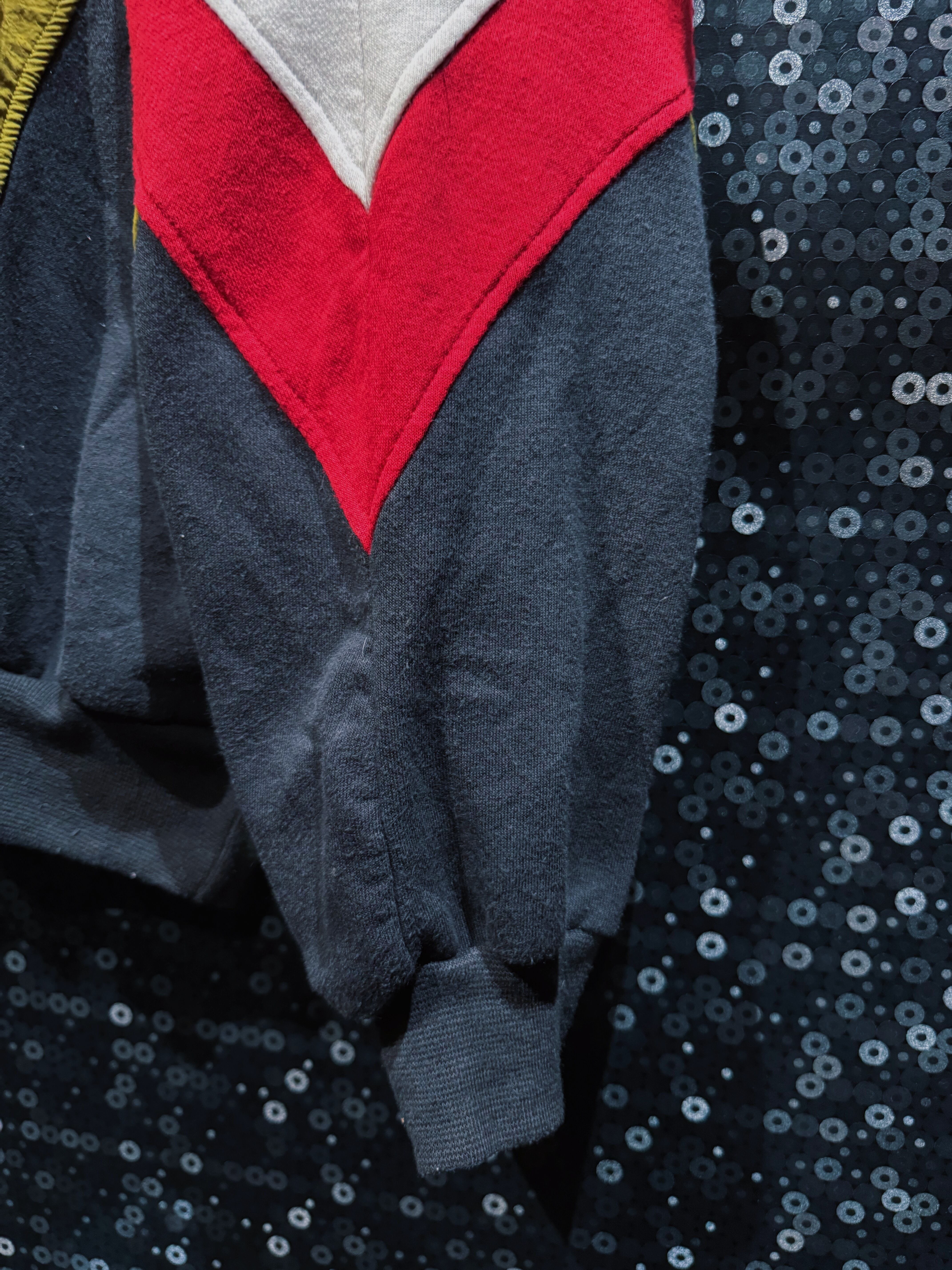 胸元にはレッド刺繍のadidasロゴ、背面にはトレフォイル刺繍が入り、前後で異なる表情を持たせている点も非常に魅力的。フードまで含めた切替構成により、どの角度から見ても情報量が多く、着用時の存在感は群を抜いている。
