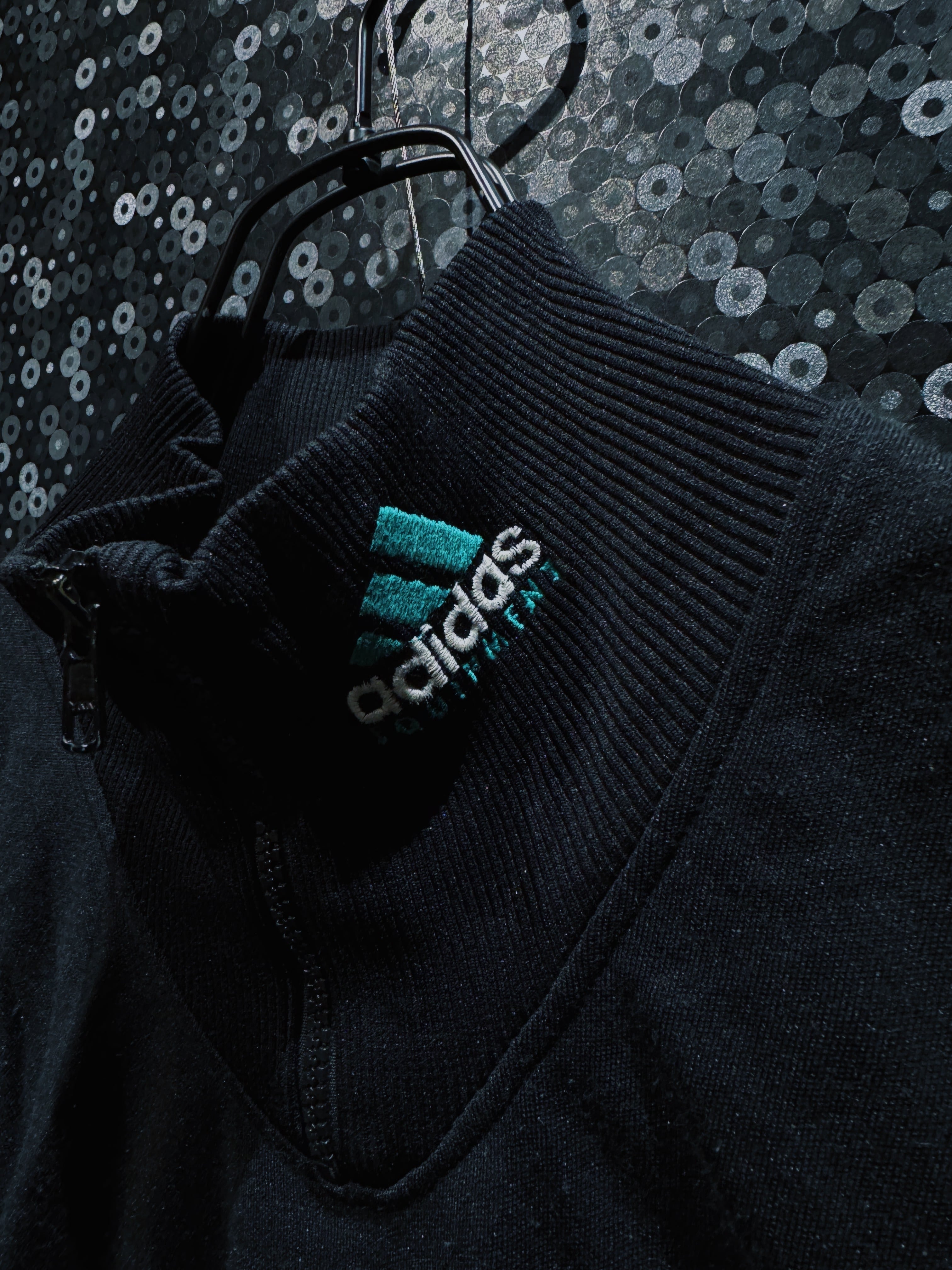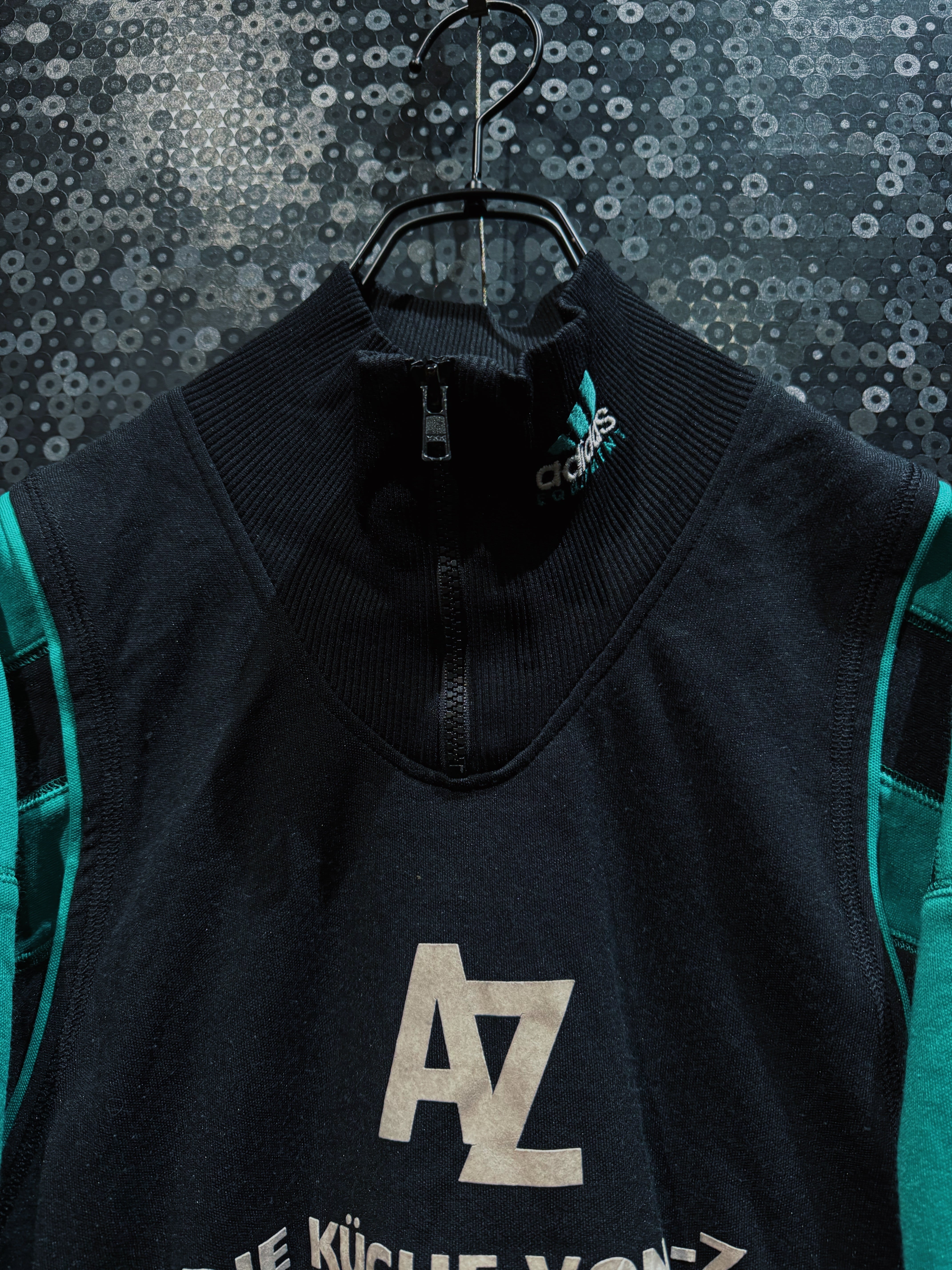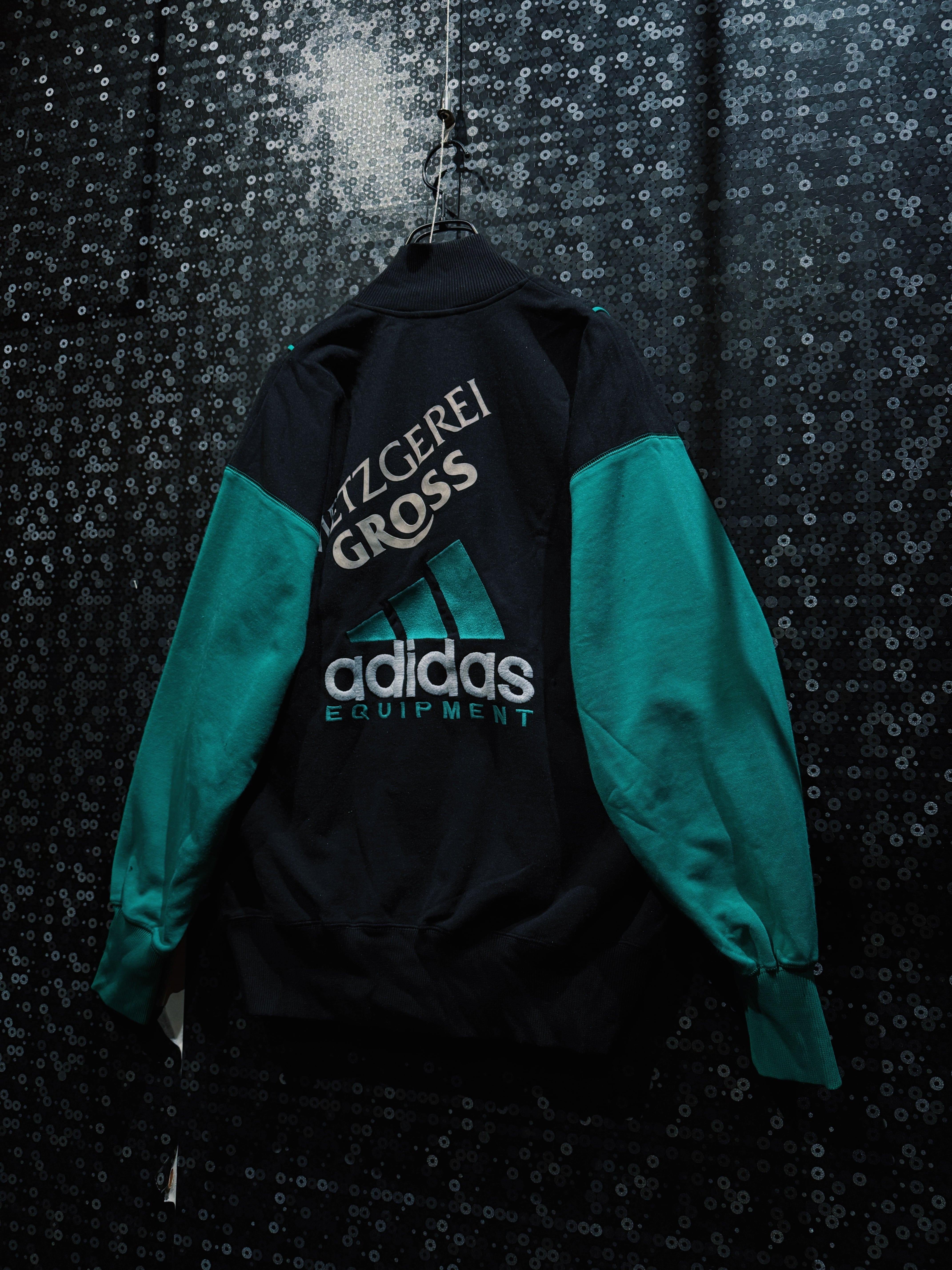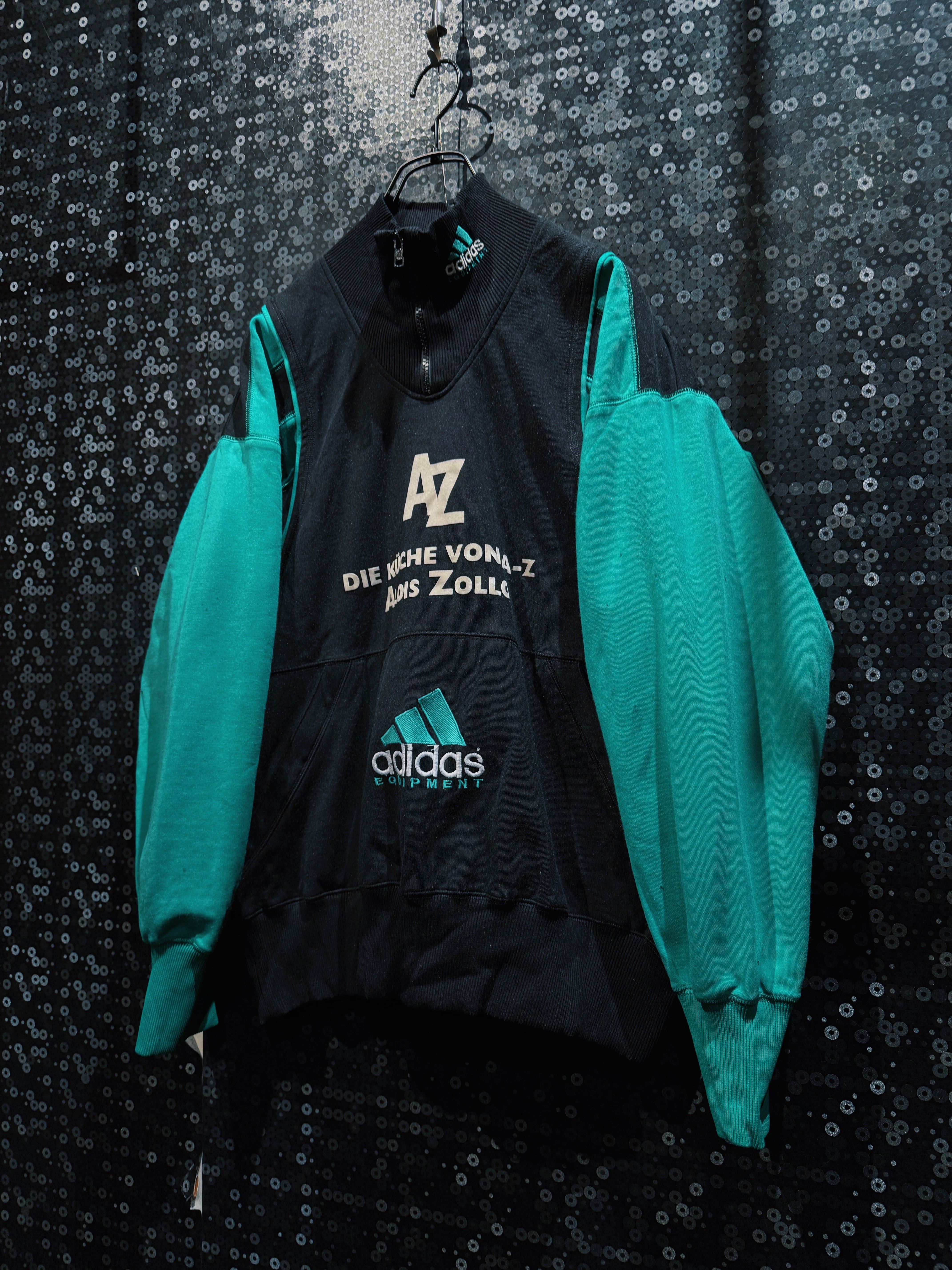 ブラックボディにエメラルドグリーンのスリーブを組み合わせた、adidas EQUIPMENTらしい無骨さと実用美が詰まったハーフジップトラックジャケット。