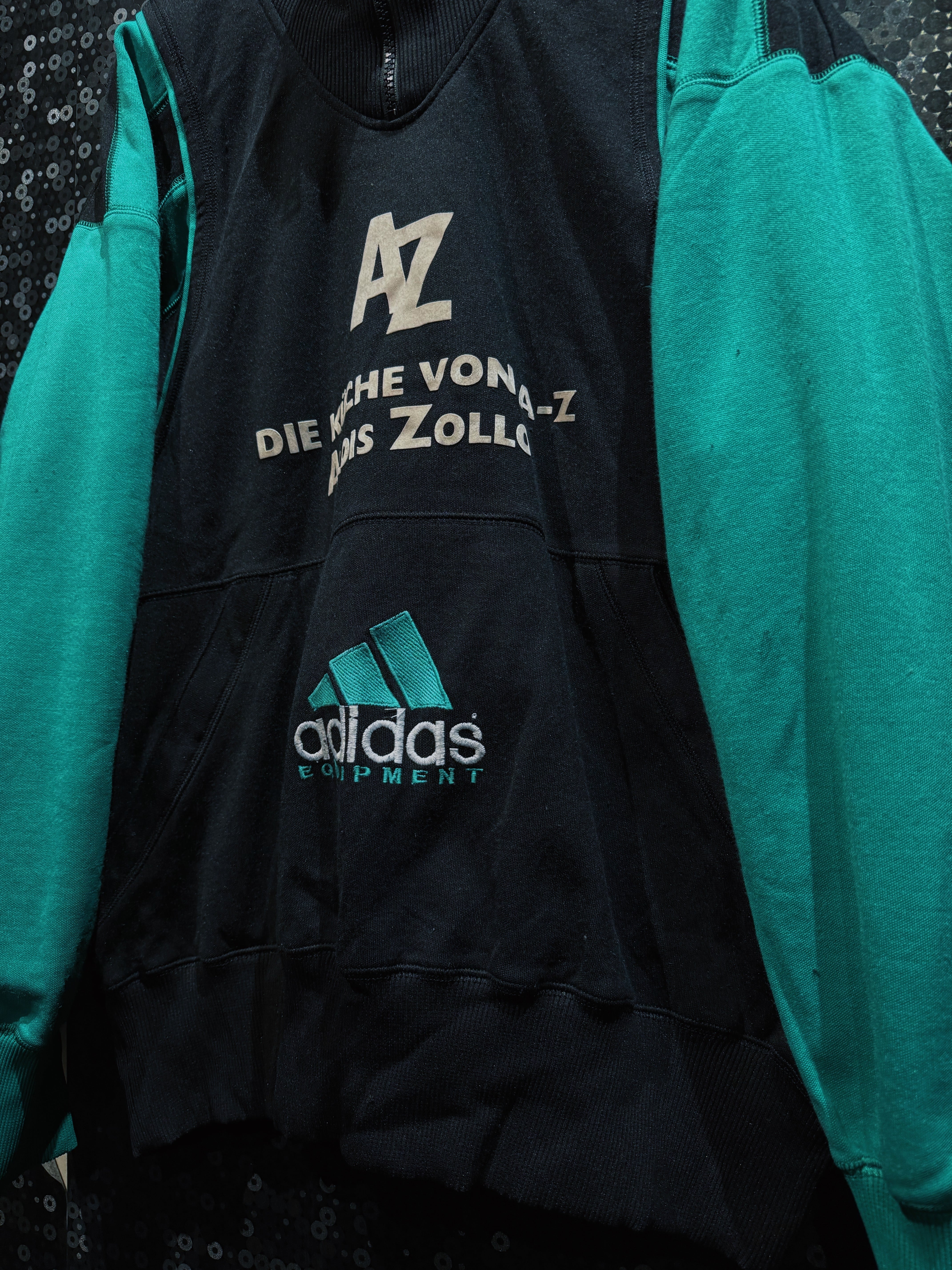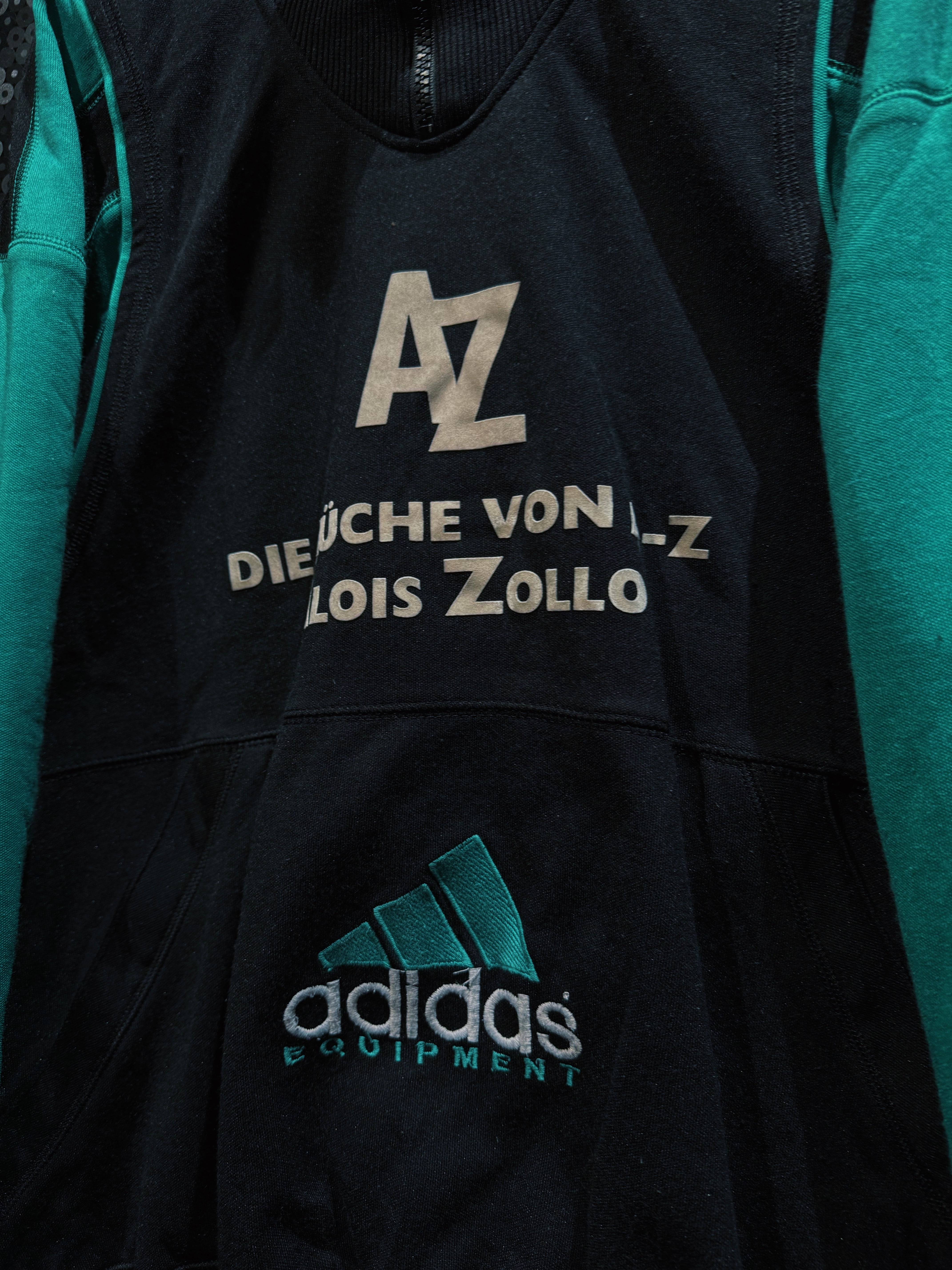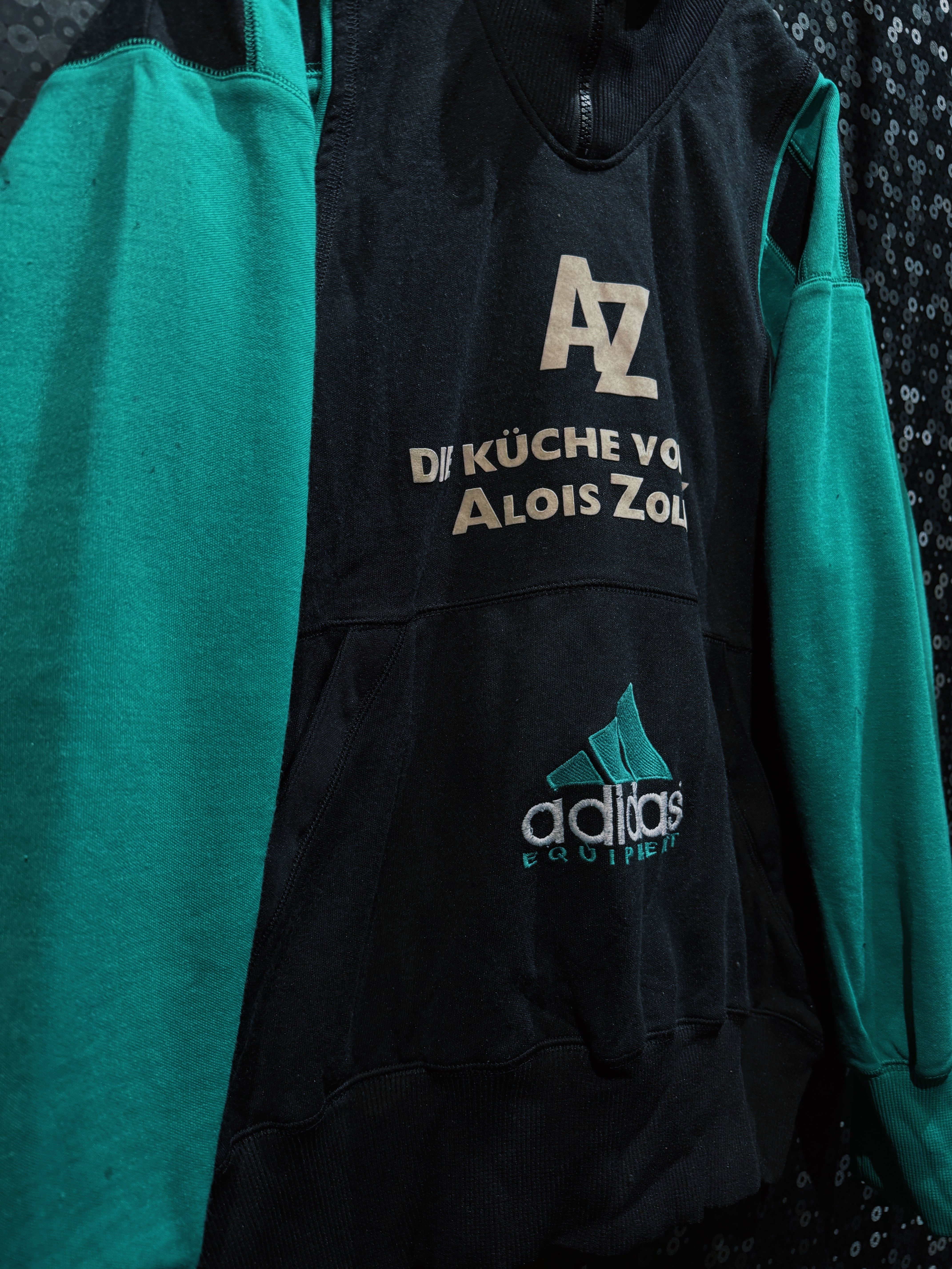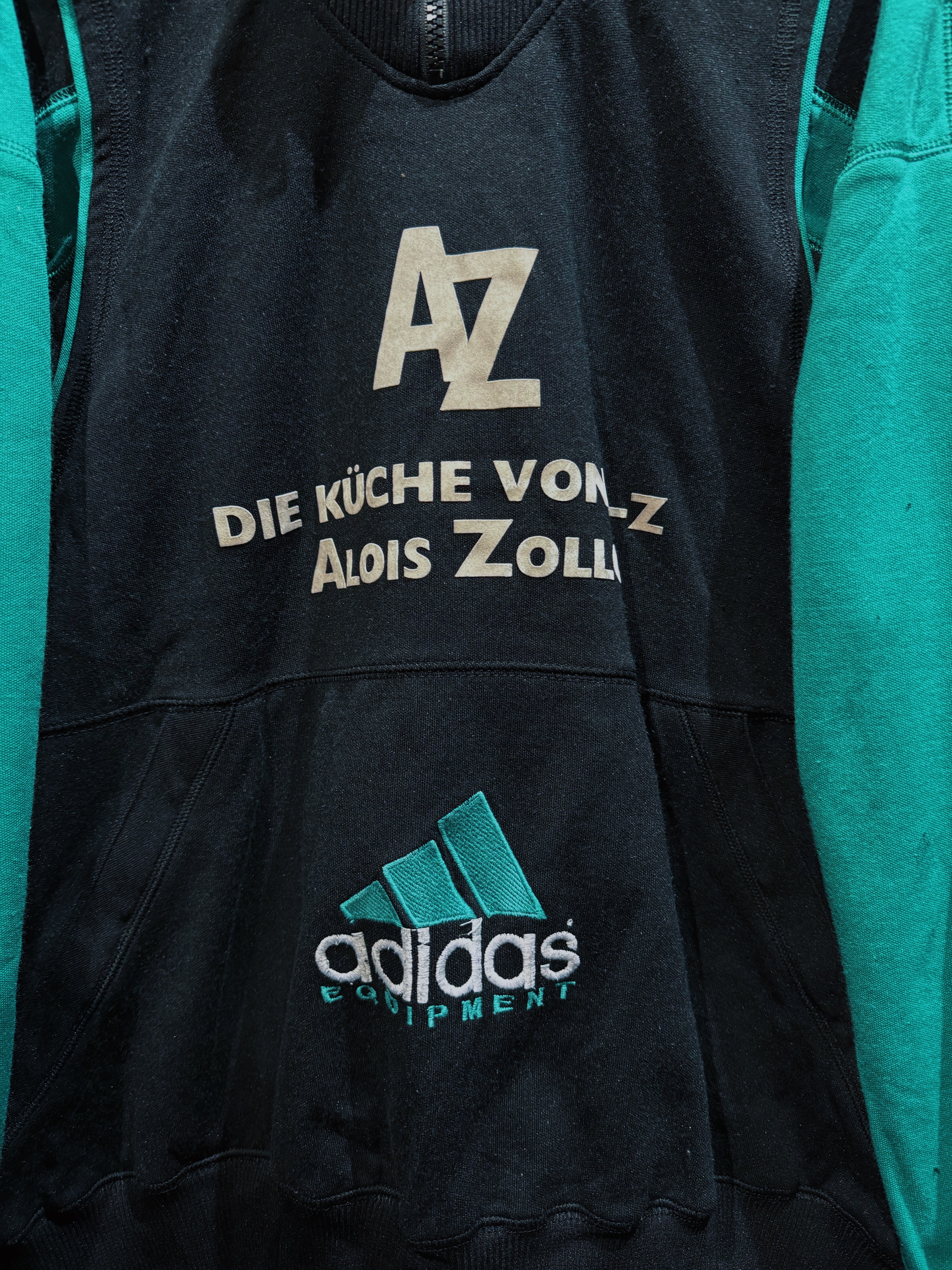 フロントには「DIE KÜCHE VON ALOIS ZOLLI」のテキストプリント、バックには大胆なadidas EQUIPMENTロゴとレタリングが配置され、ユニフォームやワークウェア由来の空気感を強く感じさせるデザイン。