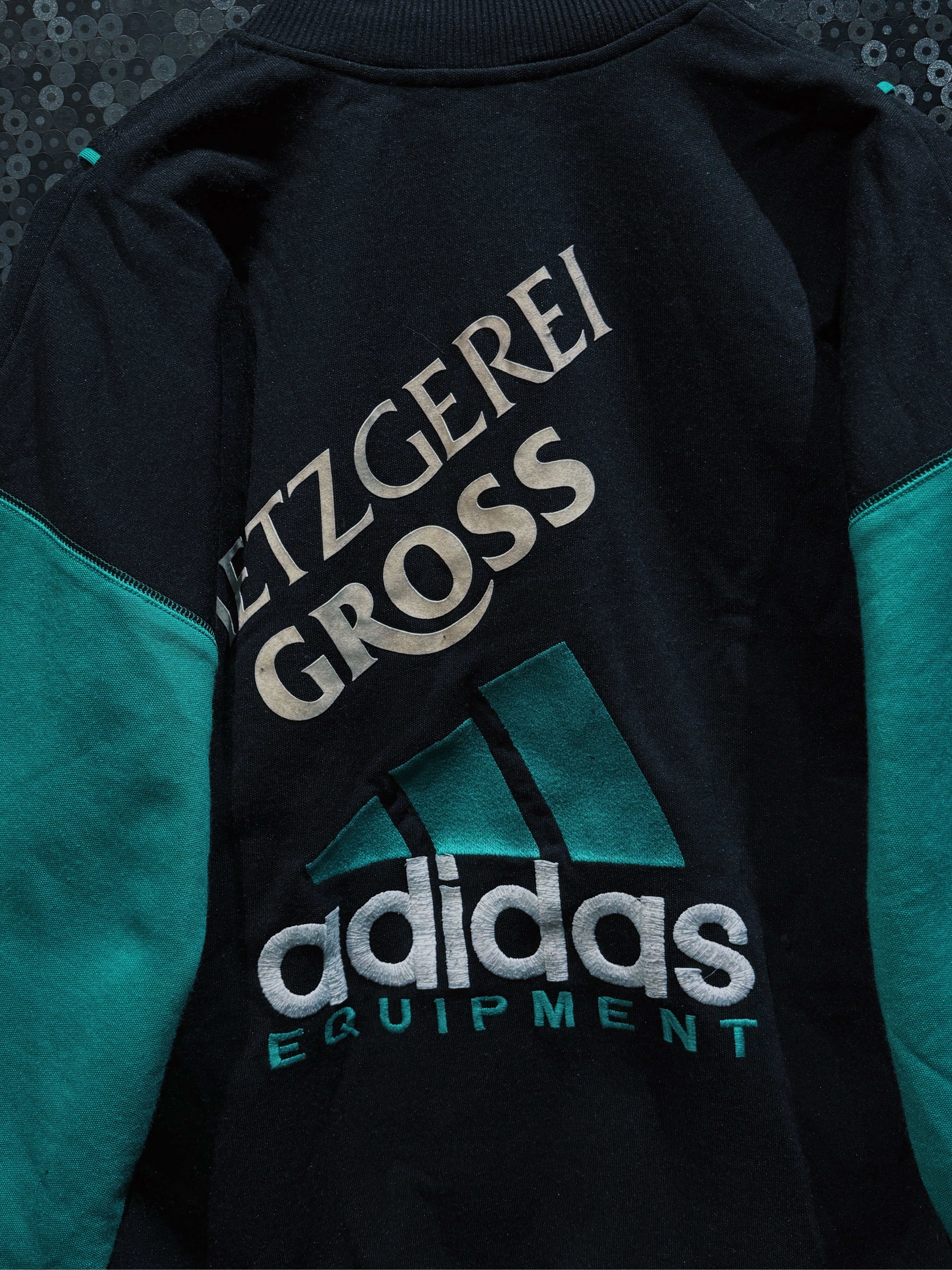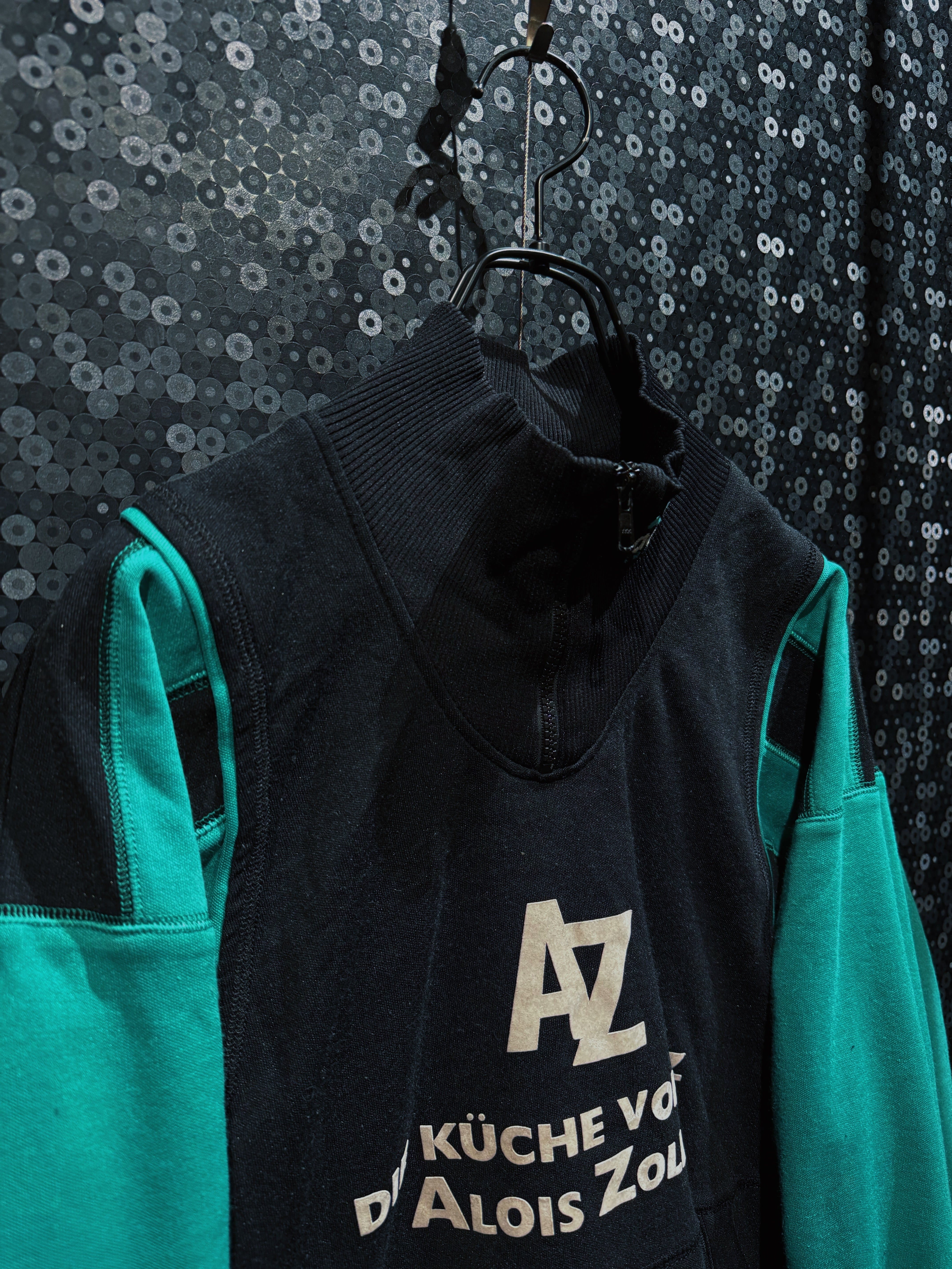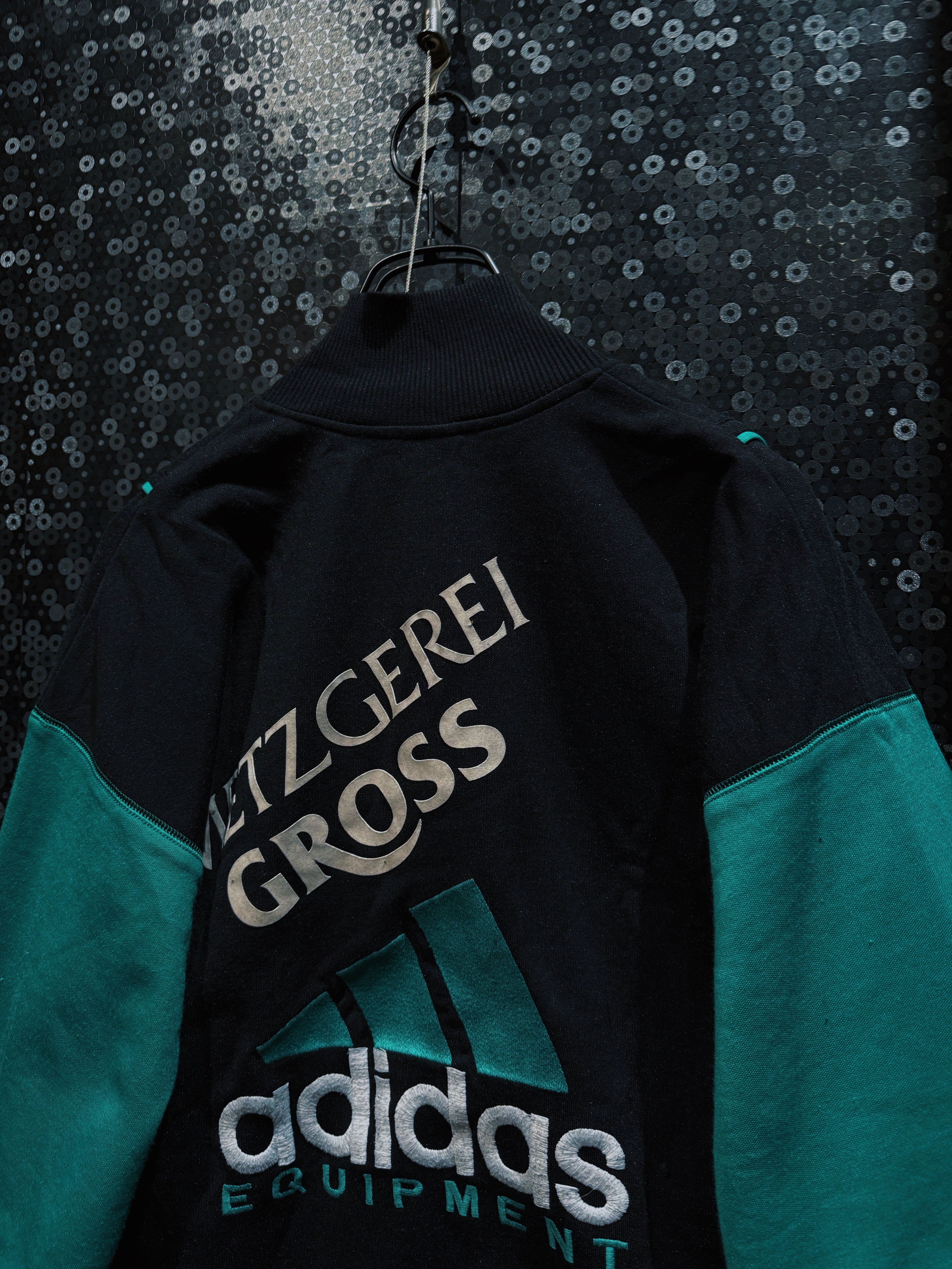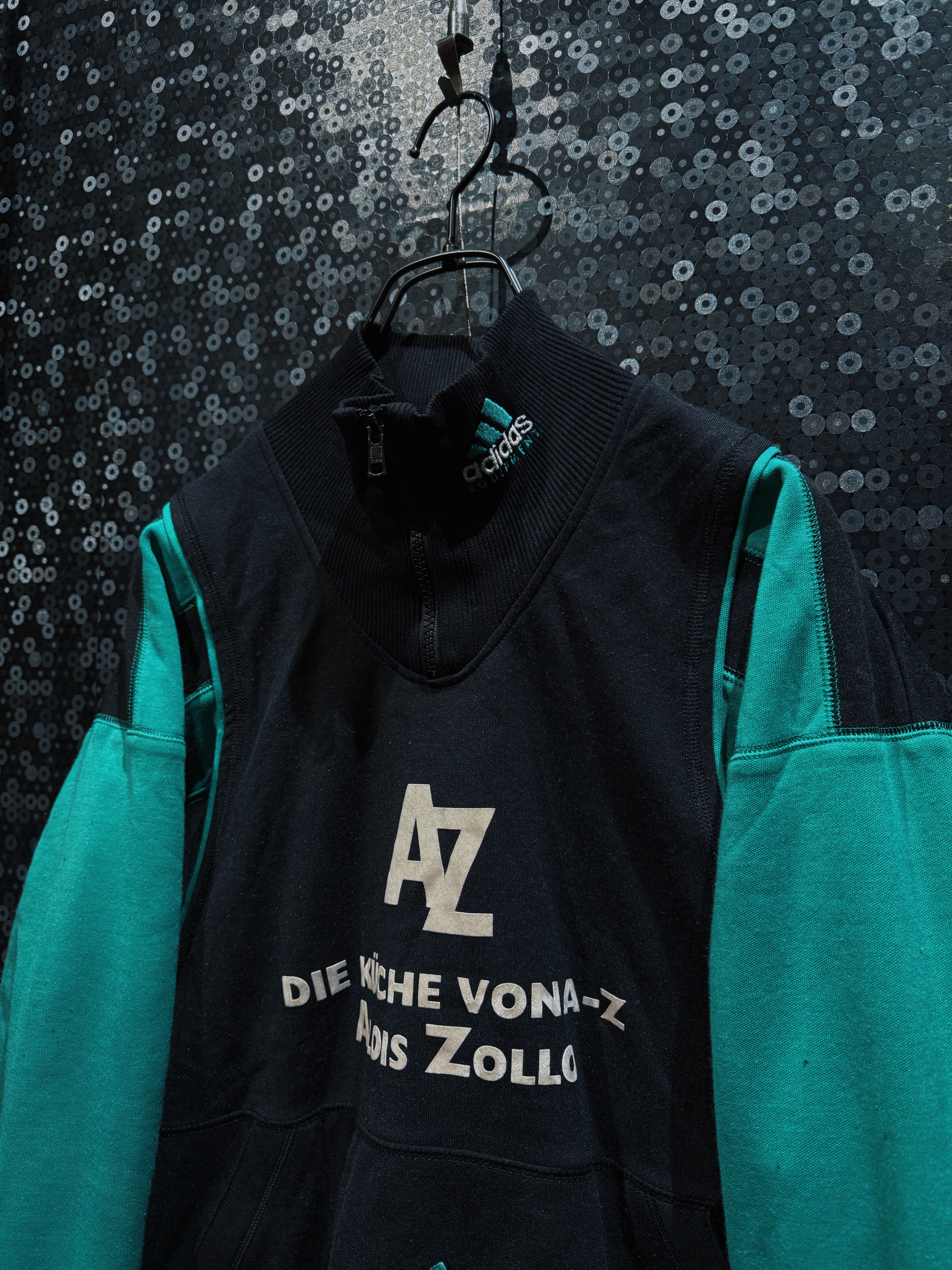 フロントには「DIE KÜCHE VON ALOIS ZOLLI」のテキストプリント、バックには大胆なadidas EQUIPMENTロゴとレタリングが配置され、ユニフォームやワークウェア由来の空気感を強く感じさせるデザイン。