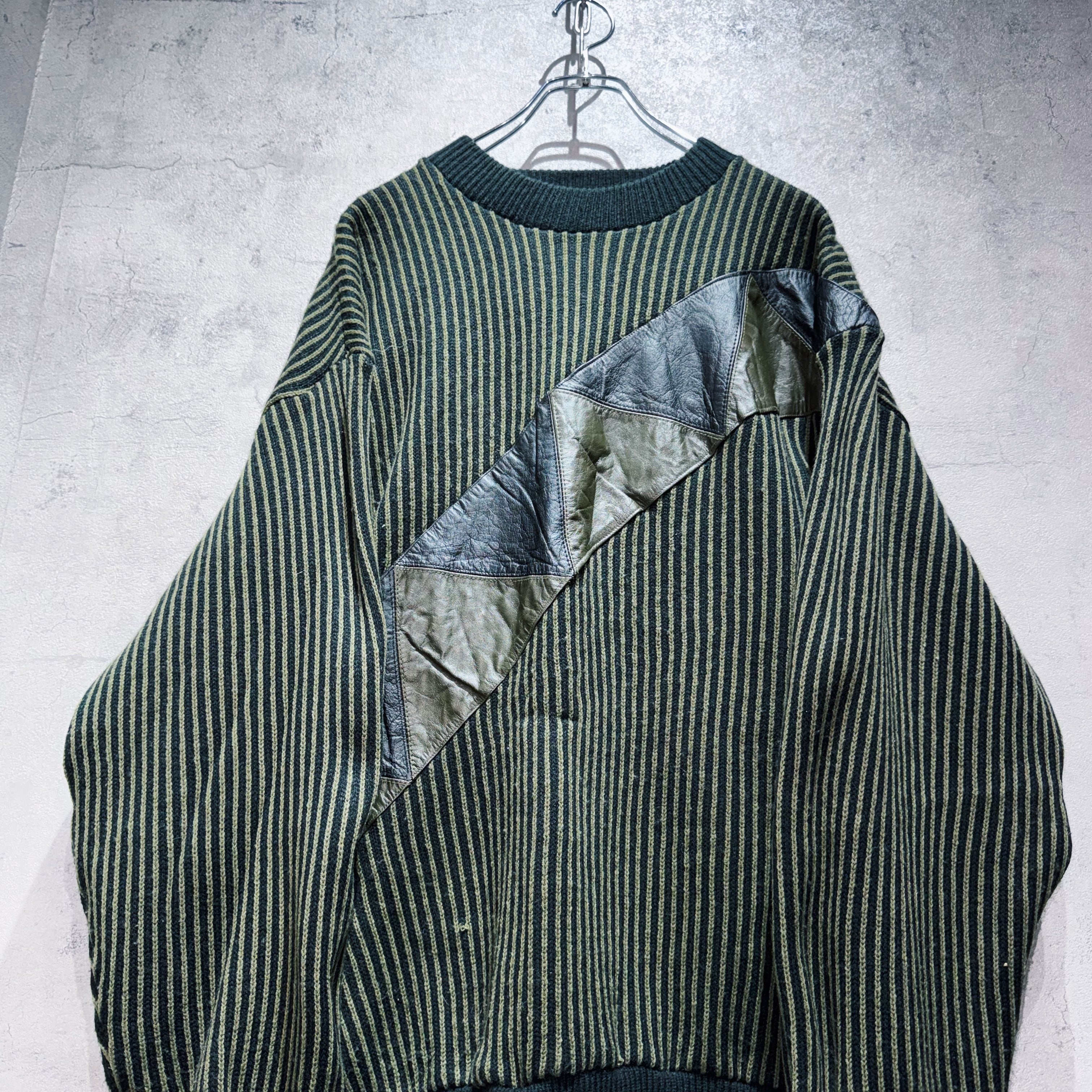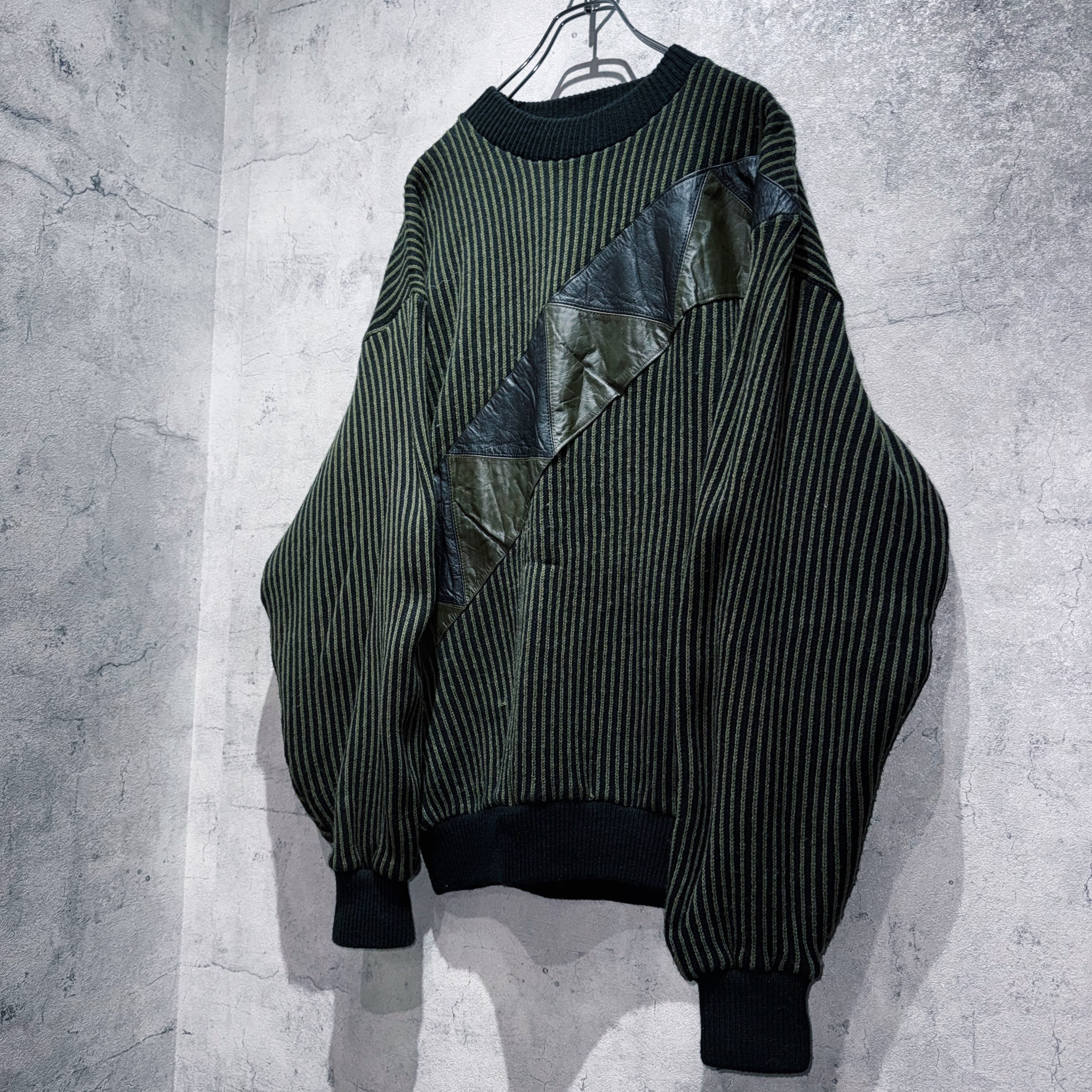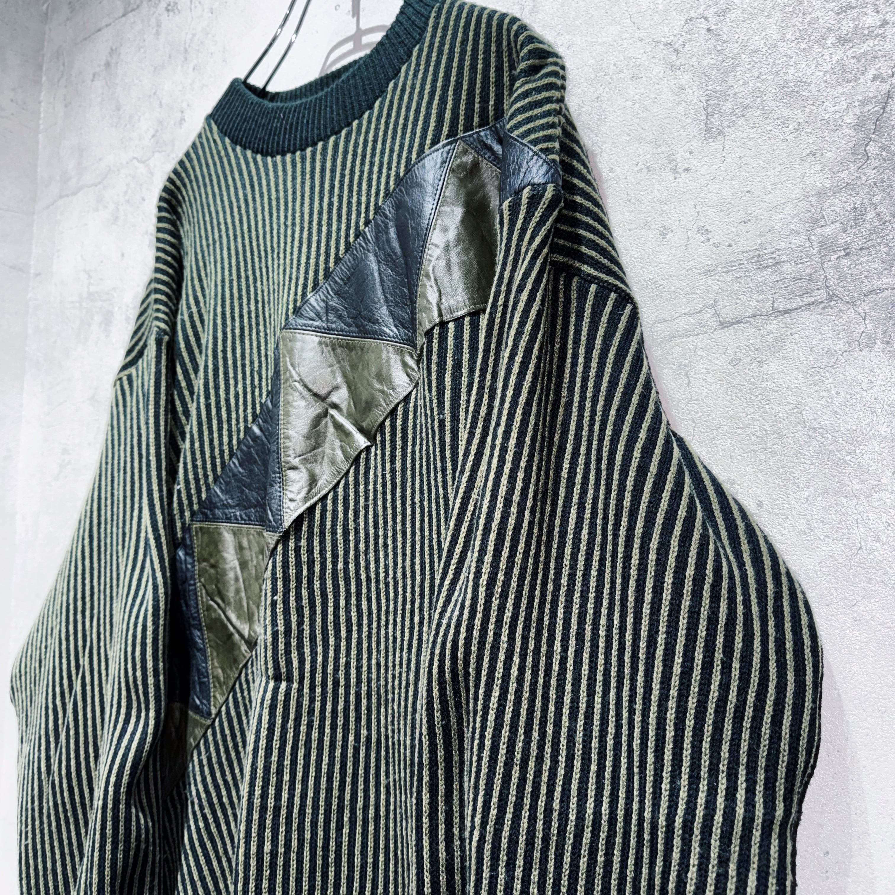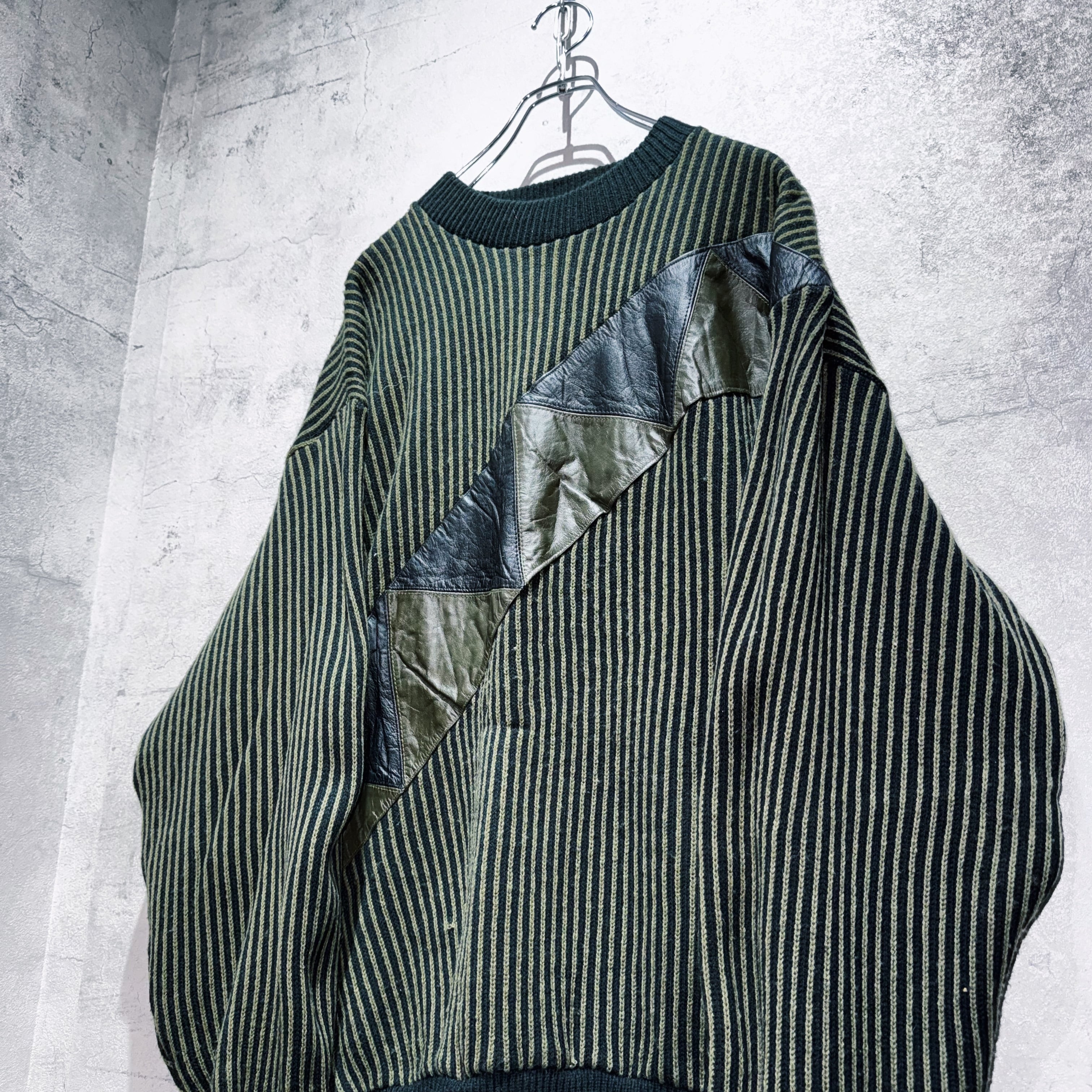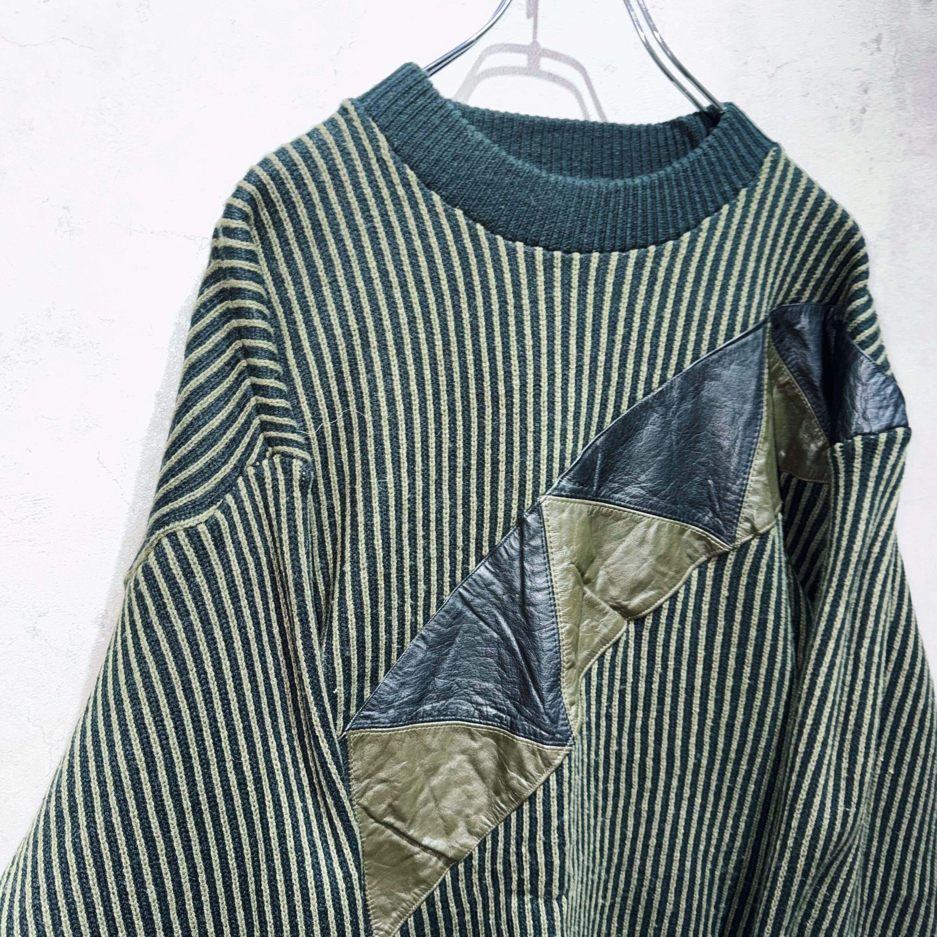 ヴィンテージレザースイッチングデザインストライプパターンニット