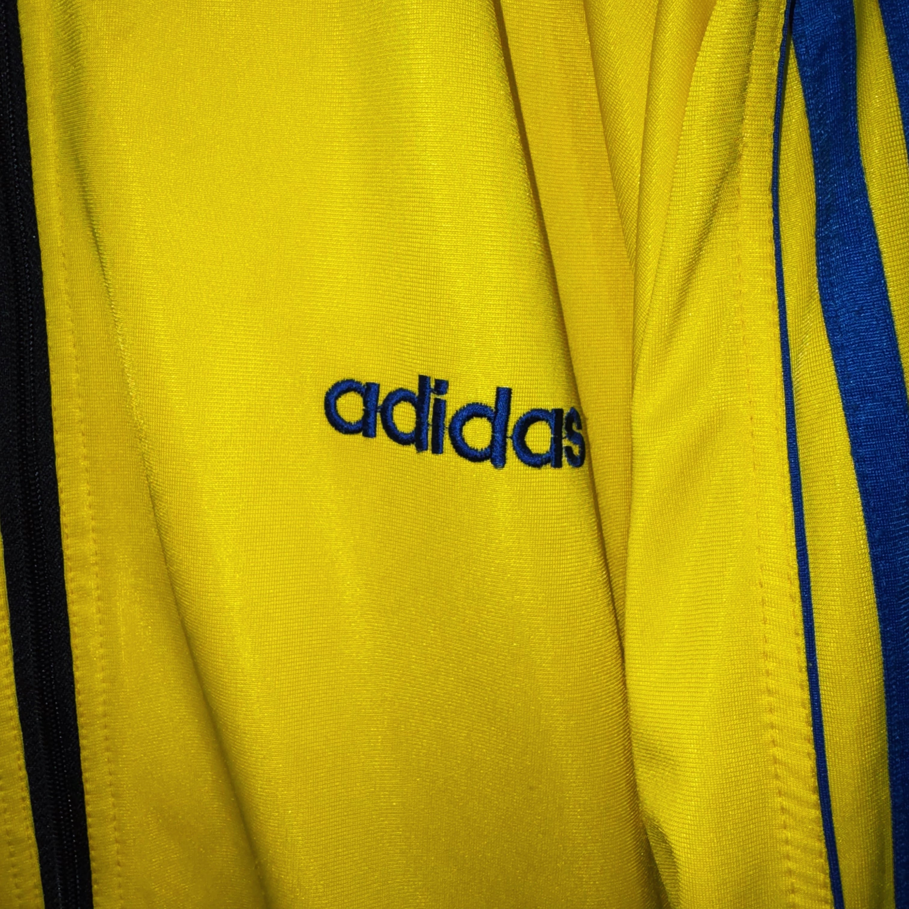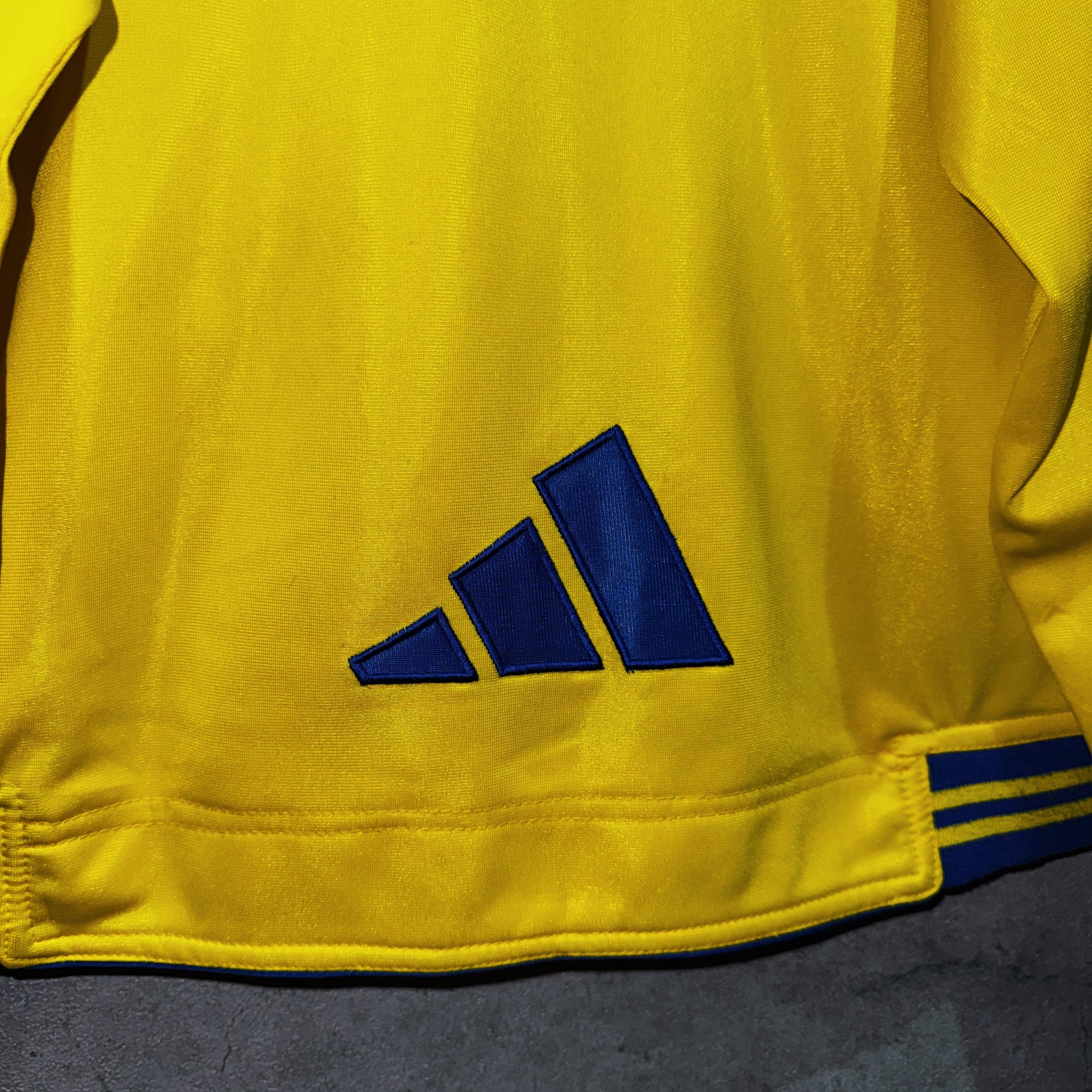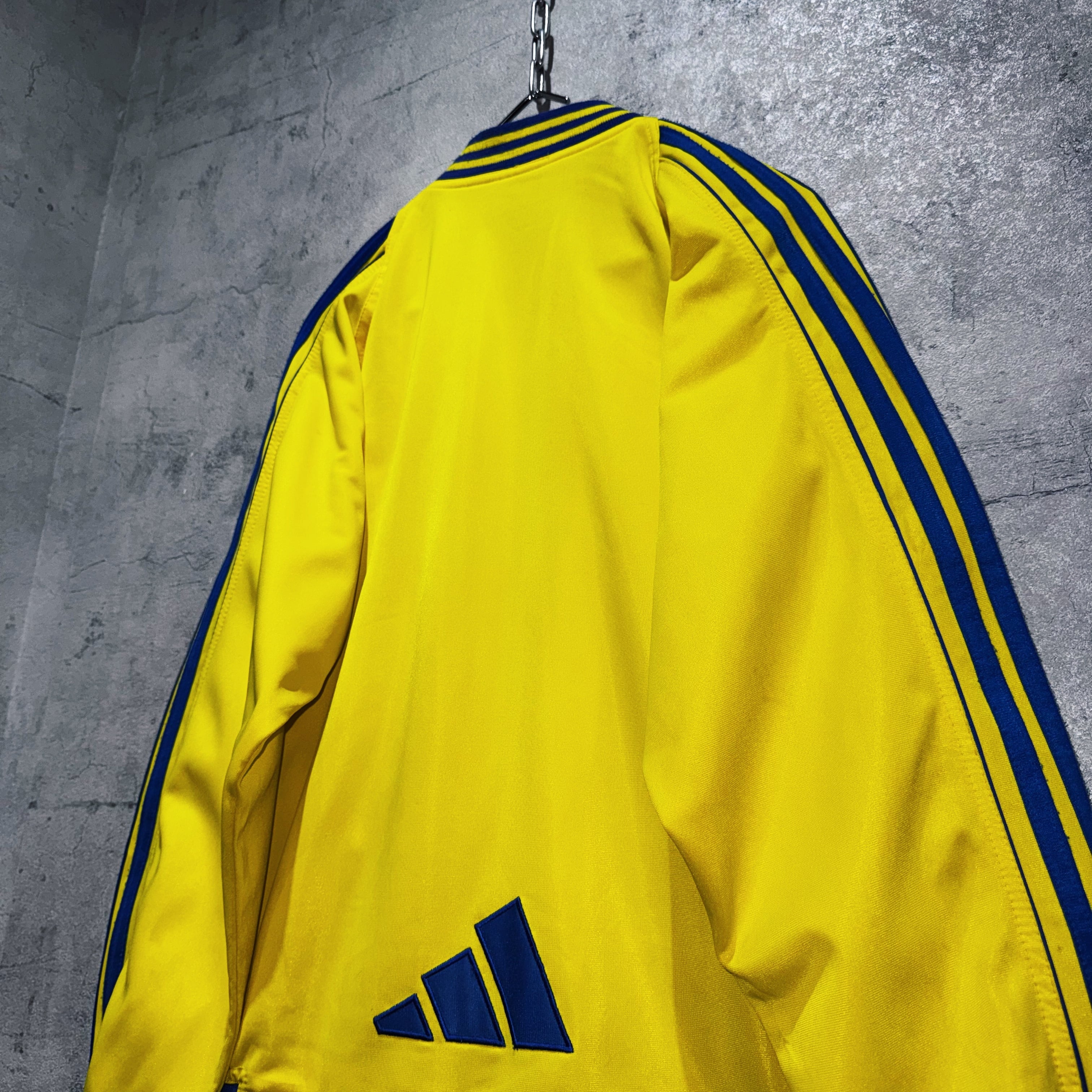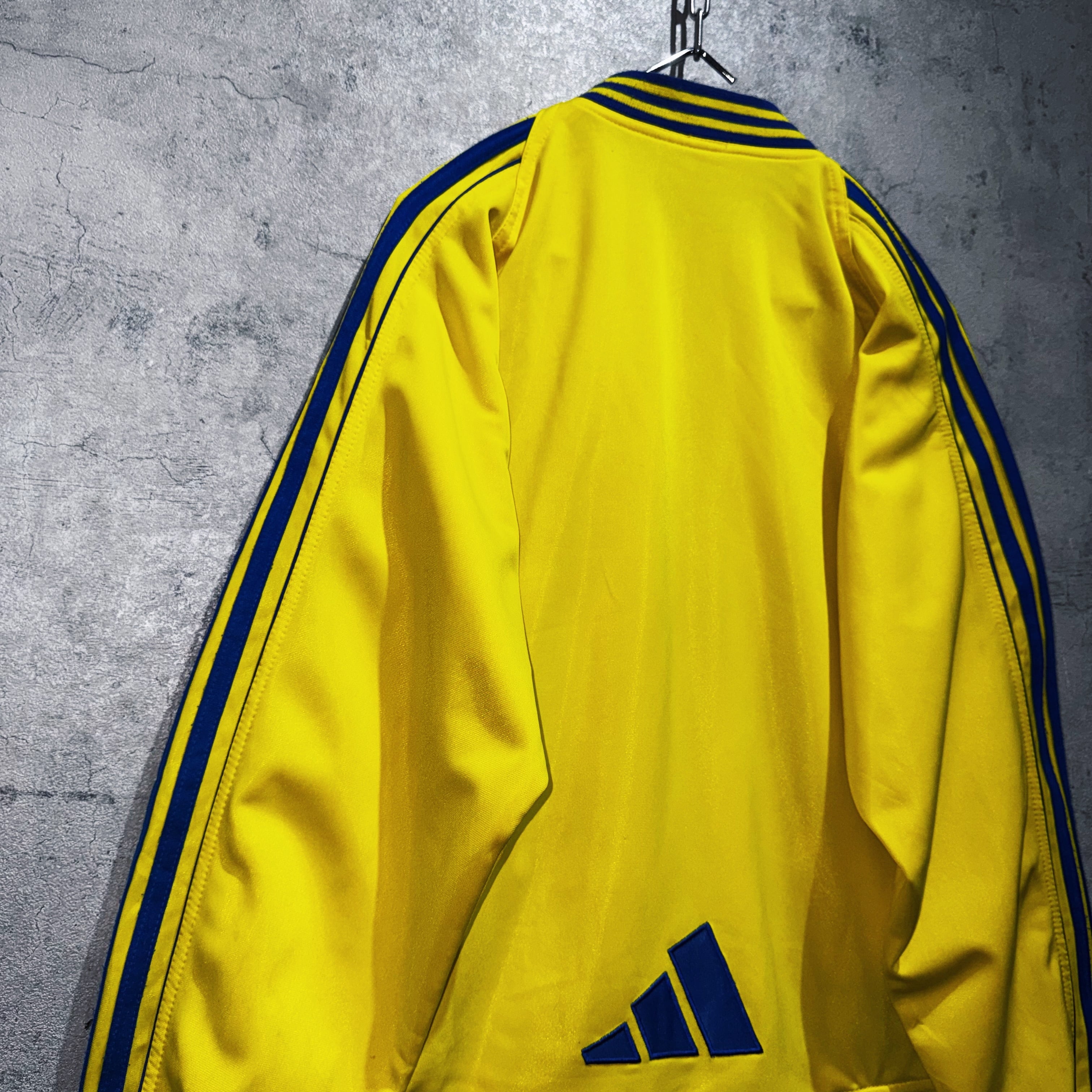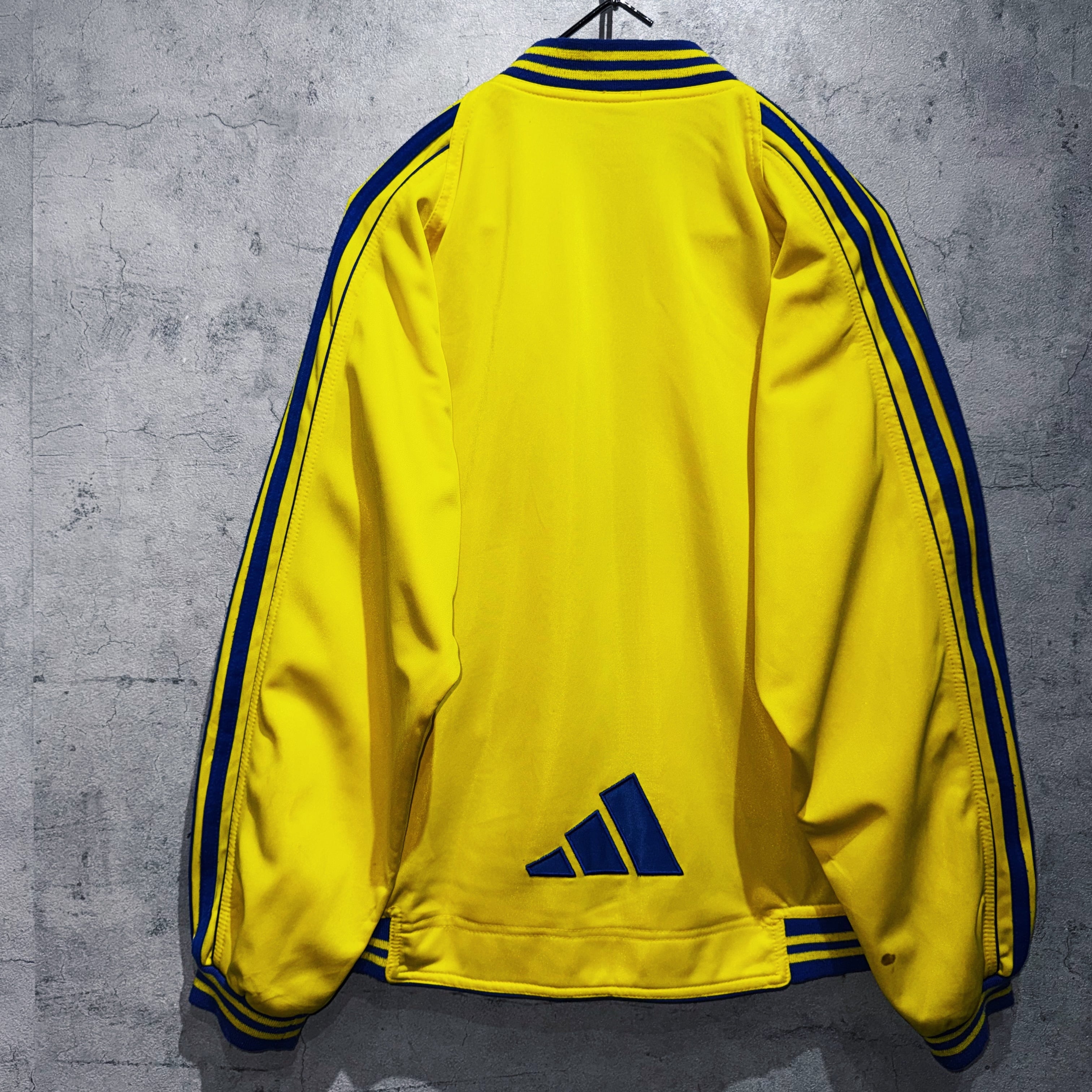 かなり存在感のあるイエローカラーのボディに、ブルーのスイッチングカラーがアクセントになったトラックジャケット。スタンドではなくクルーネックにすることでスタイリッシュな仕上がりに。