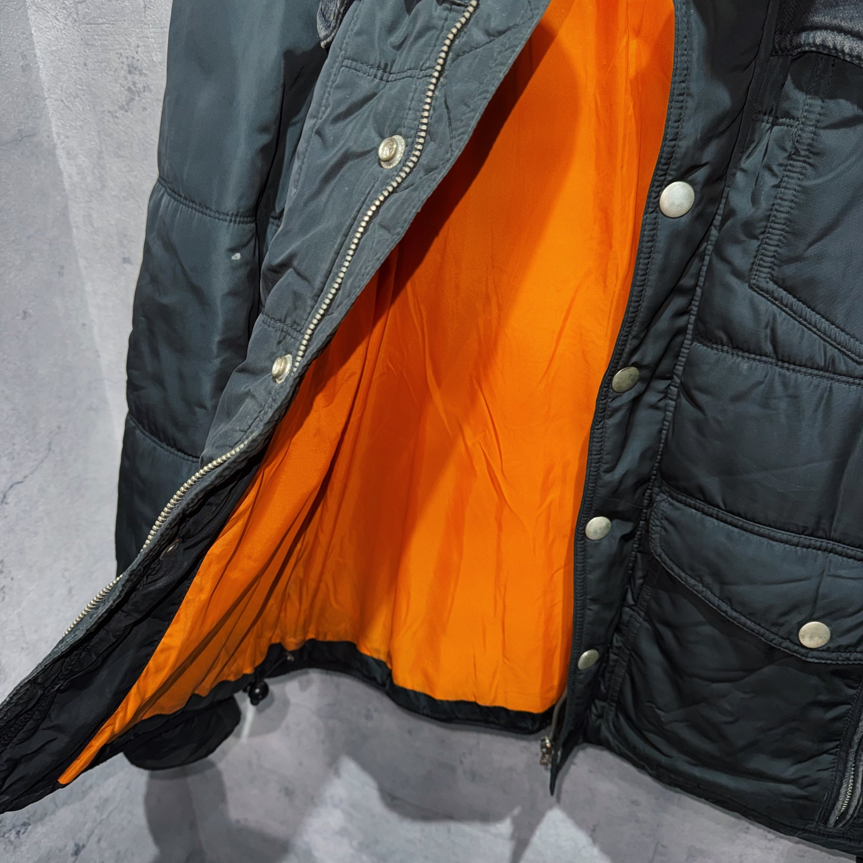 左袖にはブランドロゴをあしらうことでアイコニックな仕上がりに。裏地はMA-1などであるオレンジレスキューカラーになっており、古着好きとしては痺れるディテールですかね。
