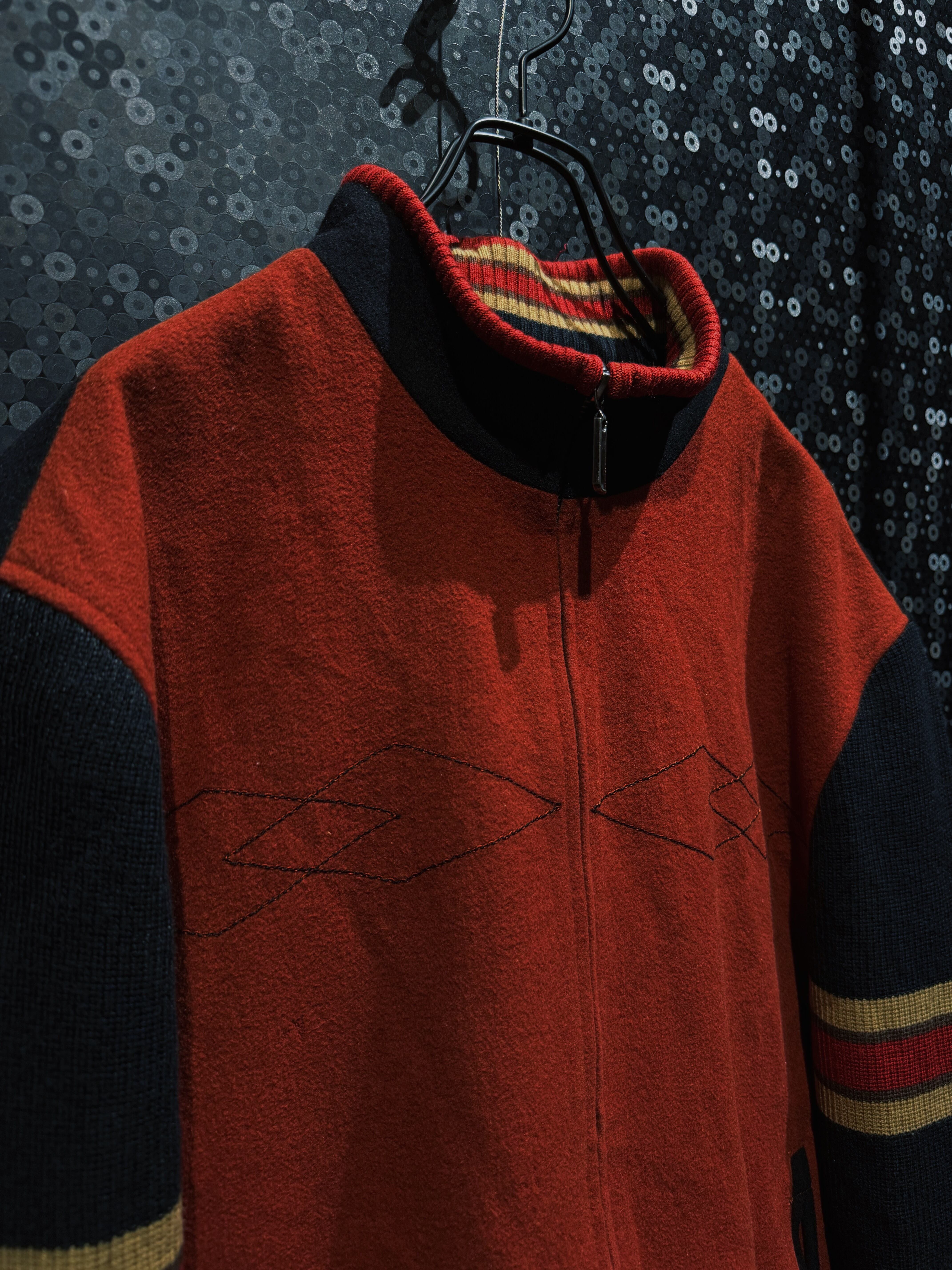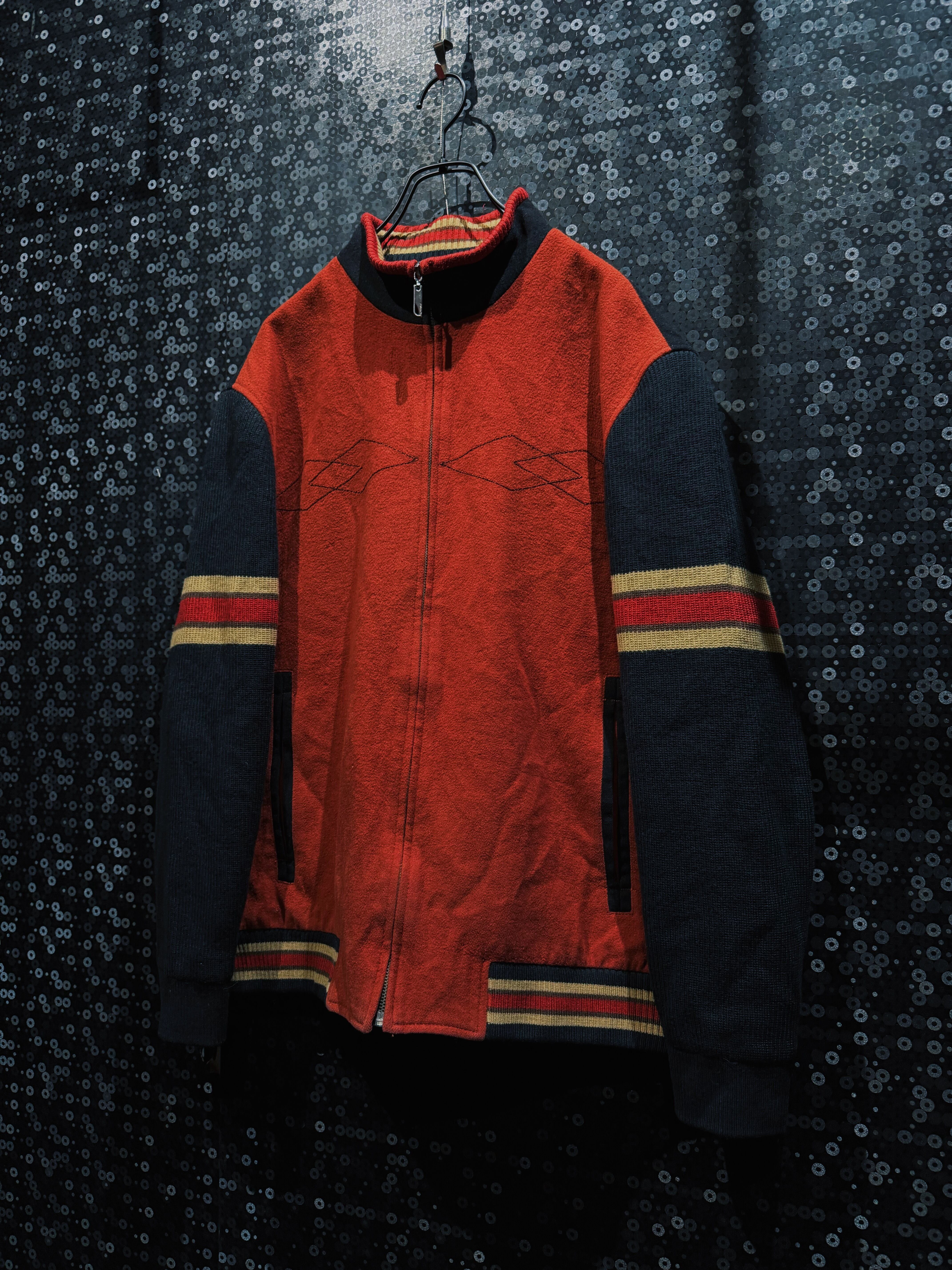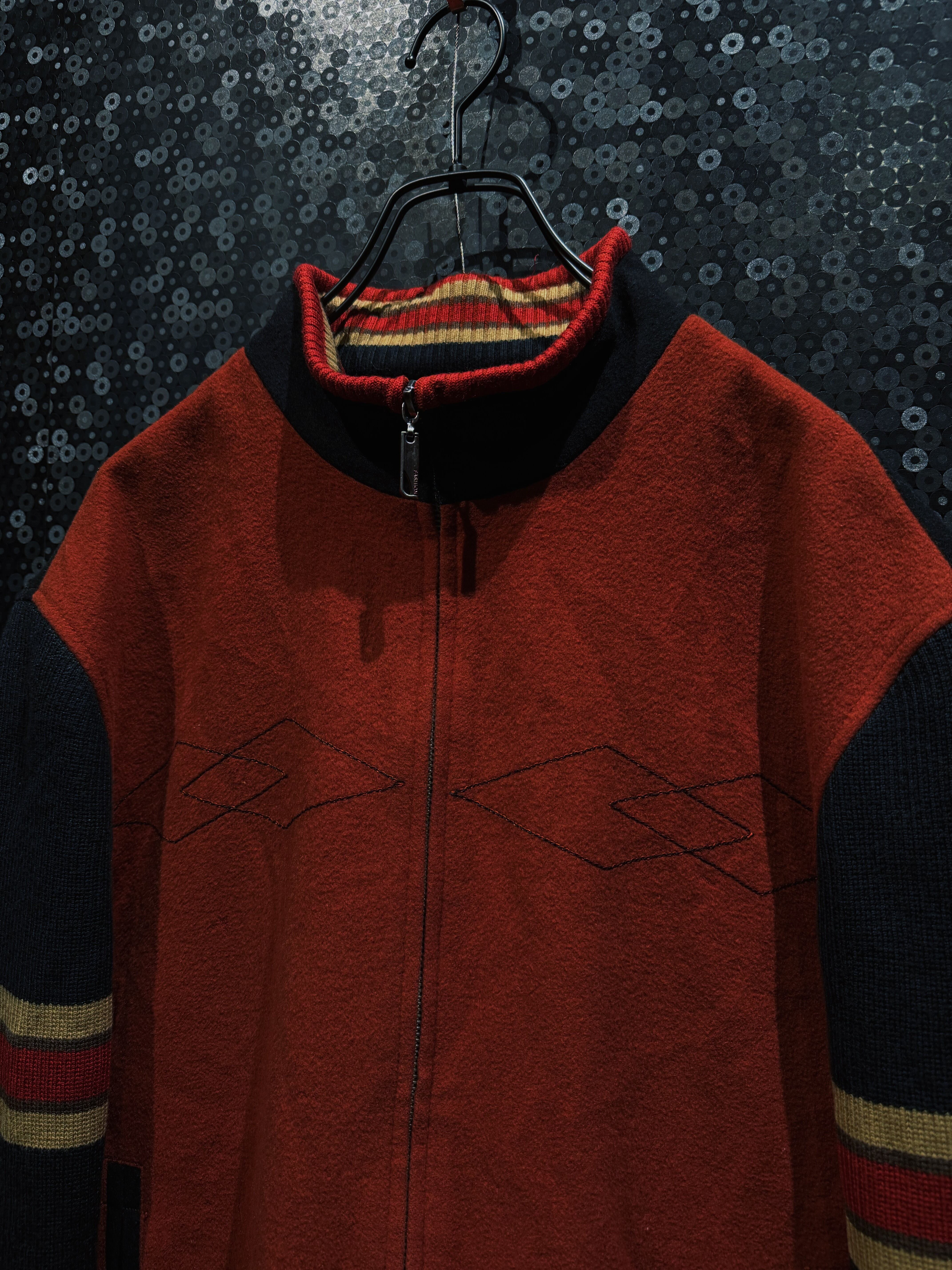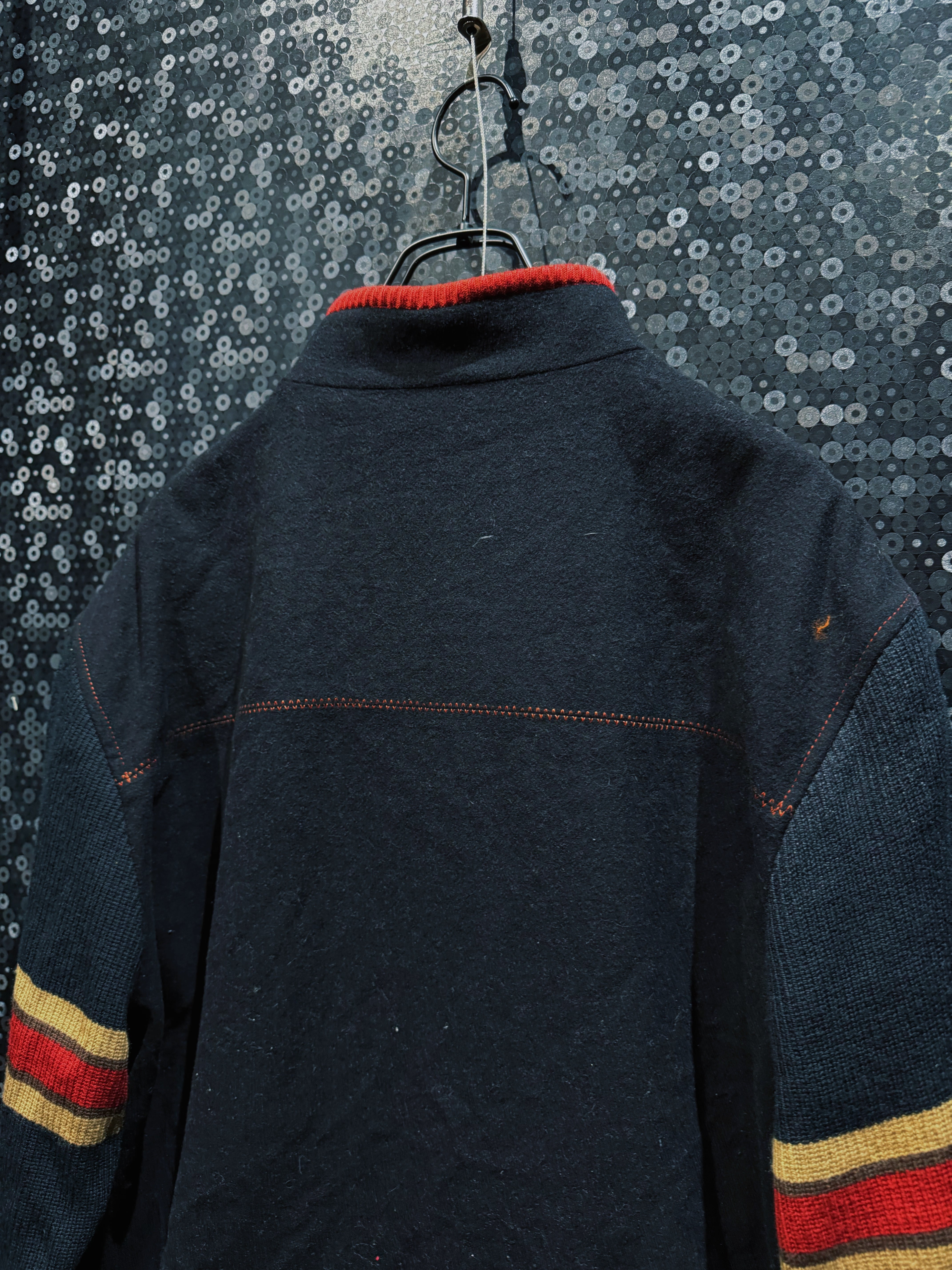 重厚なオレンジウールをベースに、袖へ切り替えられたブラックニット、そしてリブに走るレッド×イエローのラインが強烈な存在感を放つヴィンテージジップジャケット。フロントはフルジップ仕様で、胸元には幾何学的なステッチワークが入り、無地ながらも単調にならない構成。素材感のコントラストが非常に強く、ウールの温もりとニットの柔らかさが同居した、今の量産品ではまず見ない作り込みが魅力。