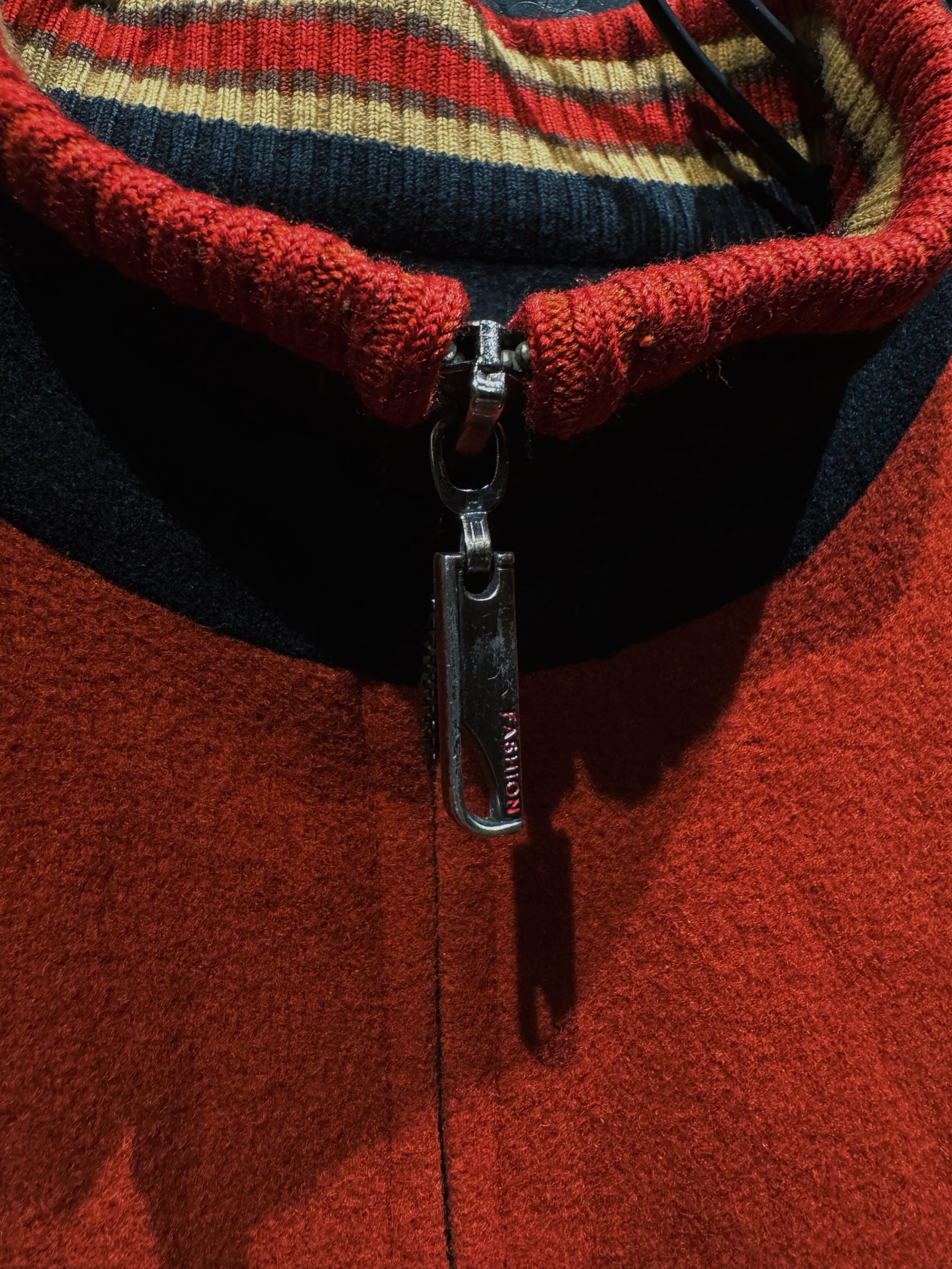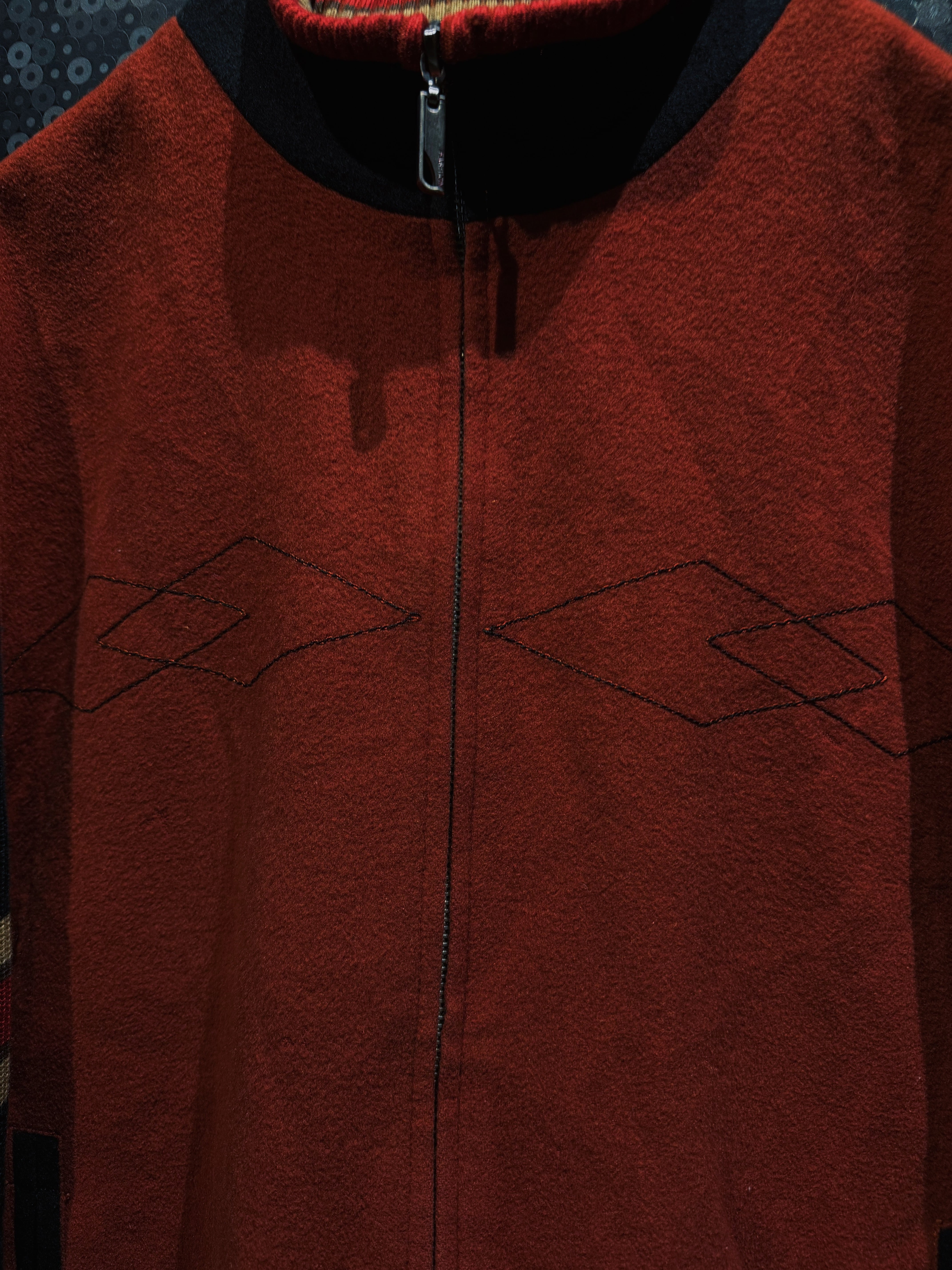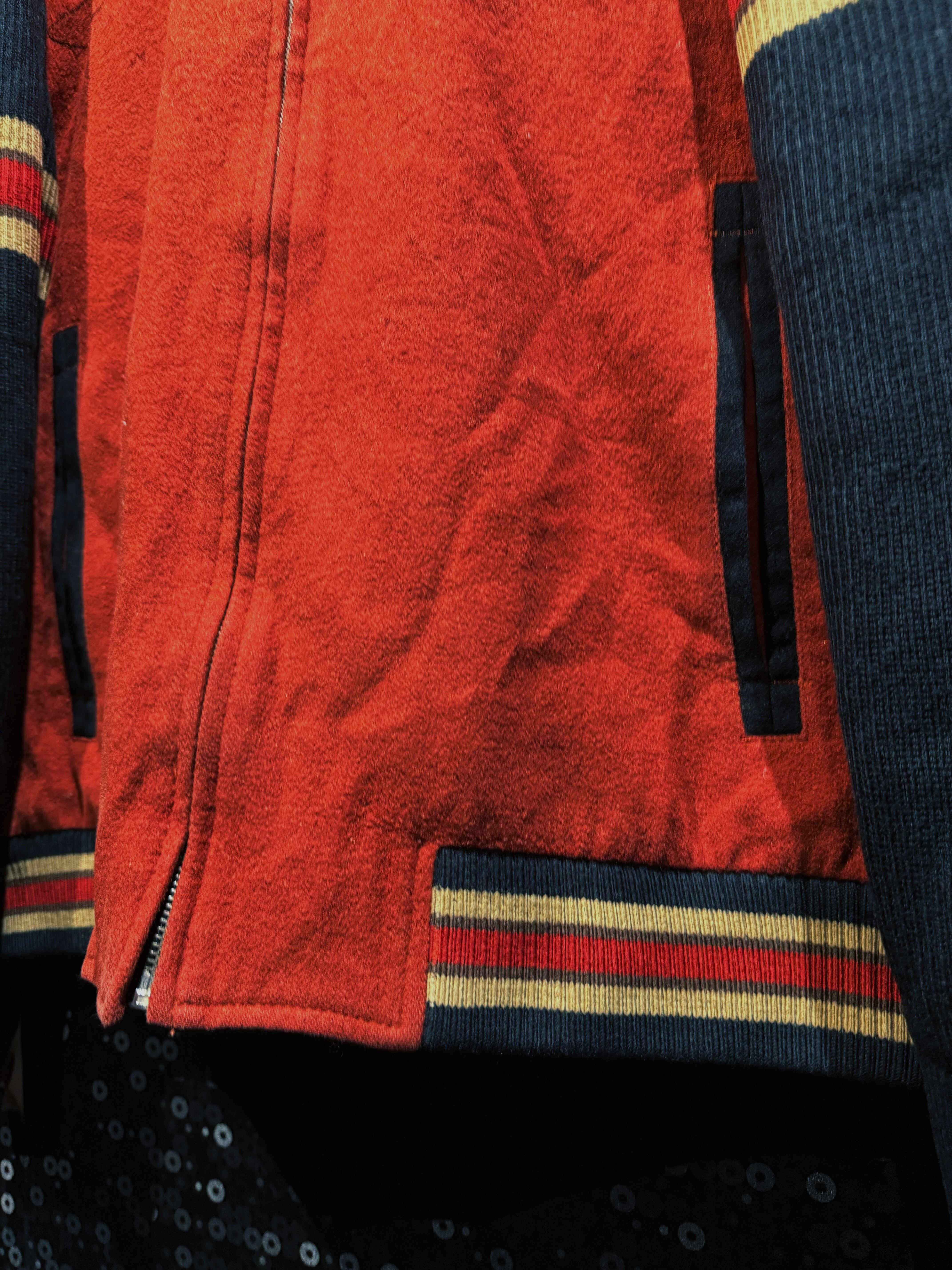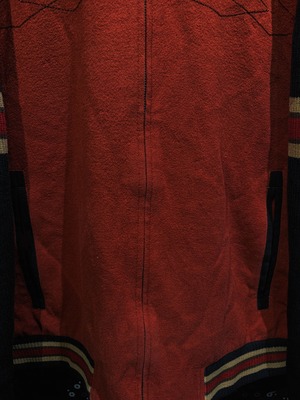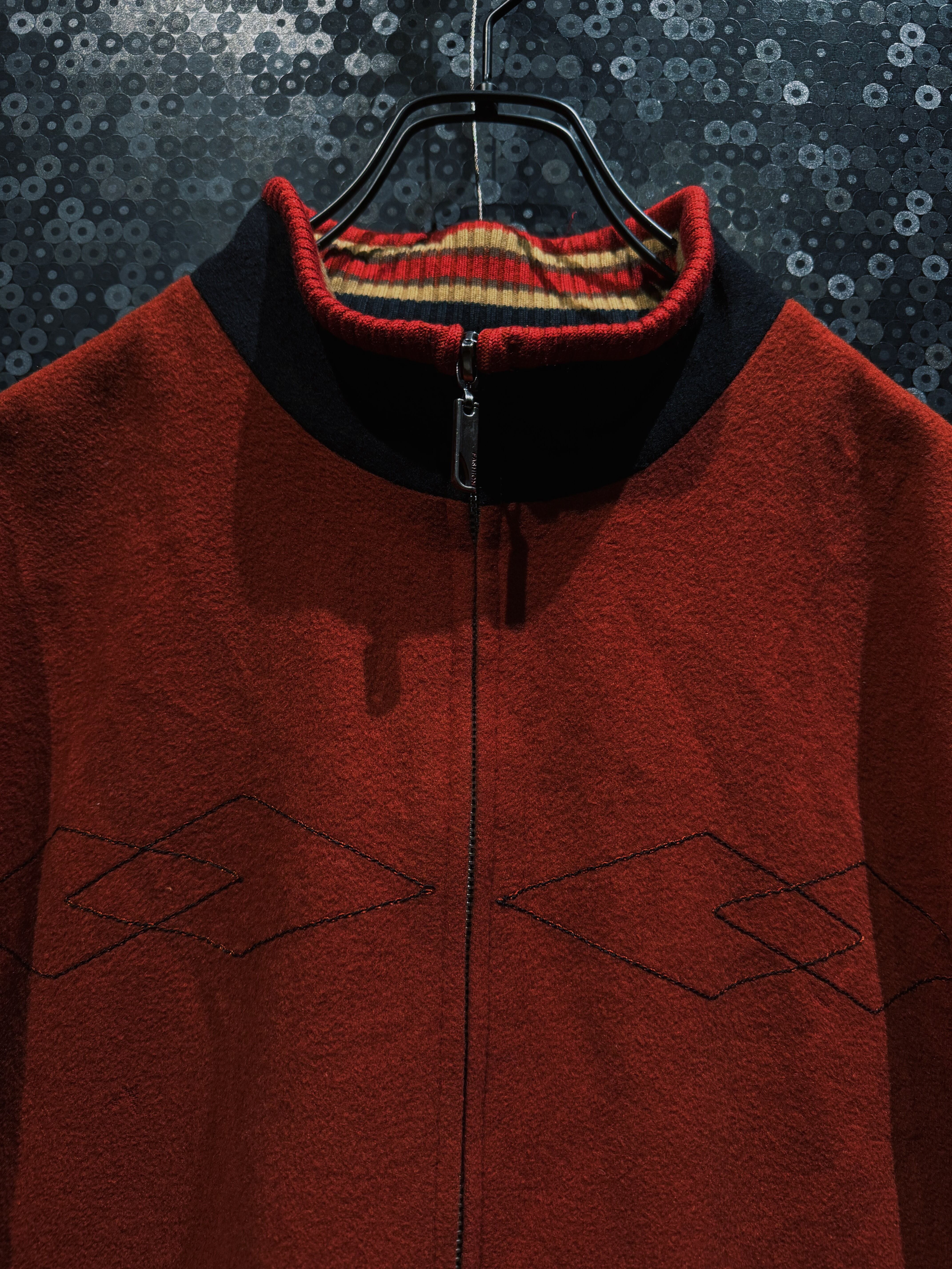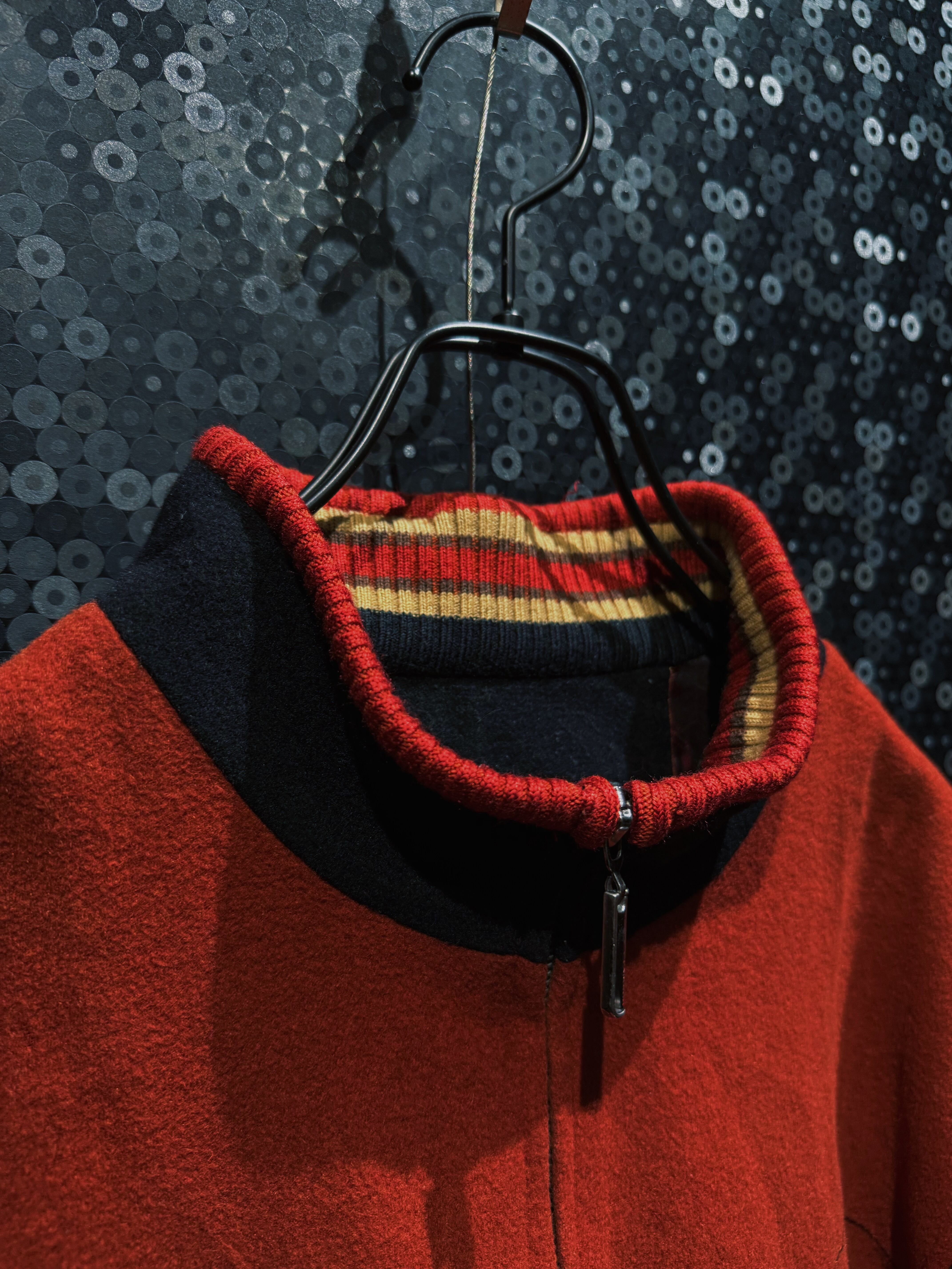 重厚なオレンジウールをベースに、袖へ切り替えられたブラックニット、そしてリブに走るレッド×イエローのラインが強烈な存在感を放つヴィンテージジップジャケット。フロントはフルジップ仕様で、胸元には幾何学的なステッチワークが入り、無地ながらも単調にならない構成。素材感のコントラストが非常に強く、ウールの温もりとニットの柔らかさが同居した、今の量産品ではまず見ない作り込みが魅力。