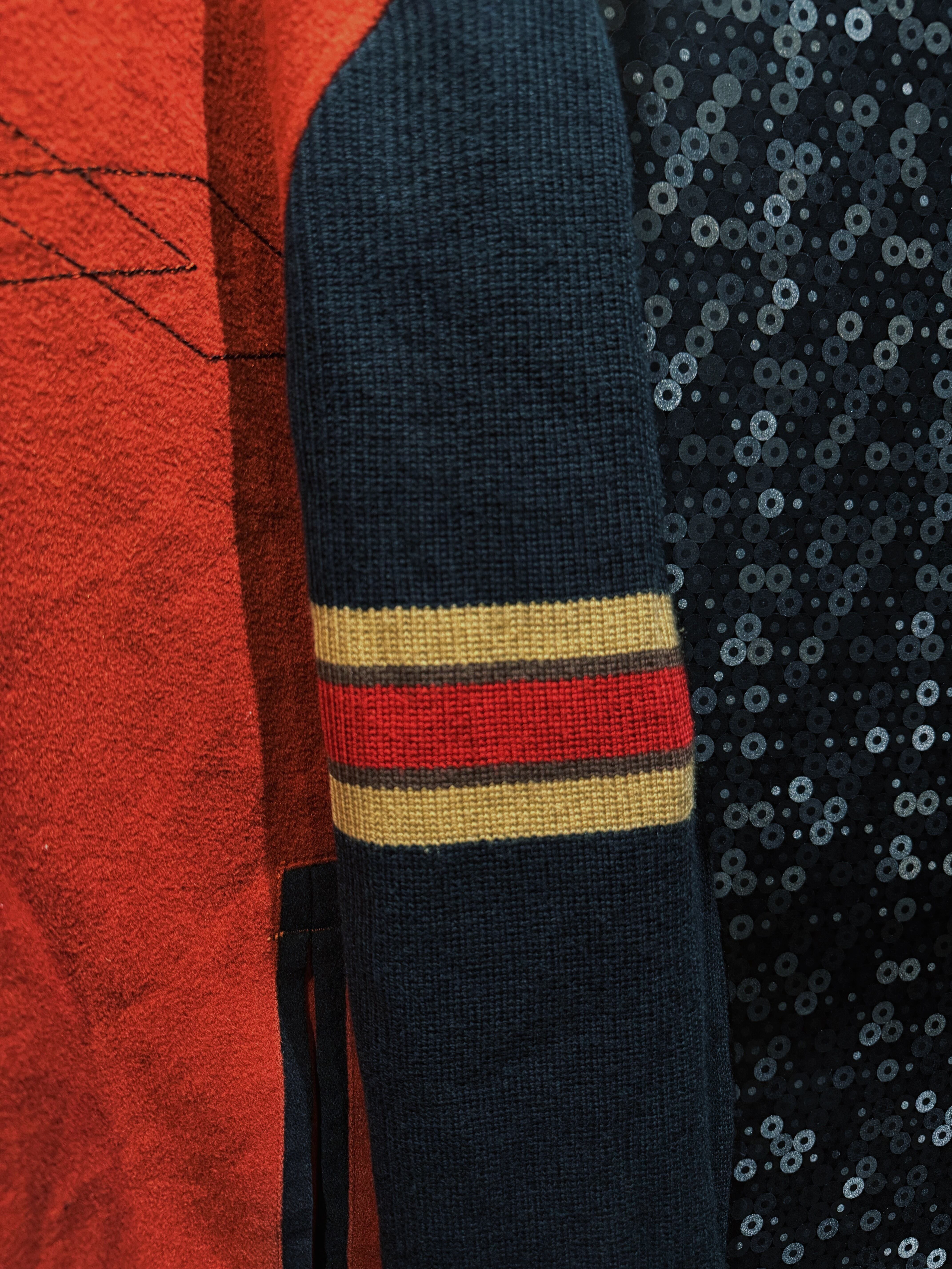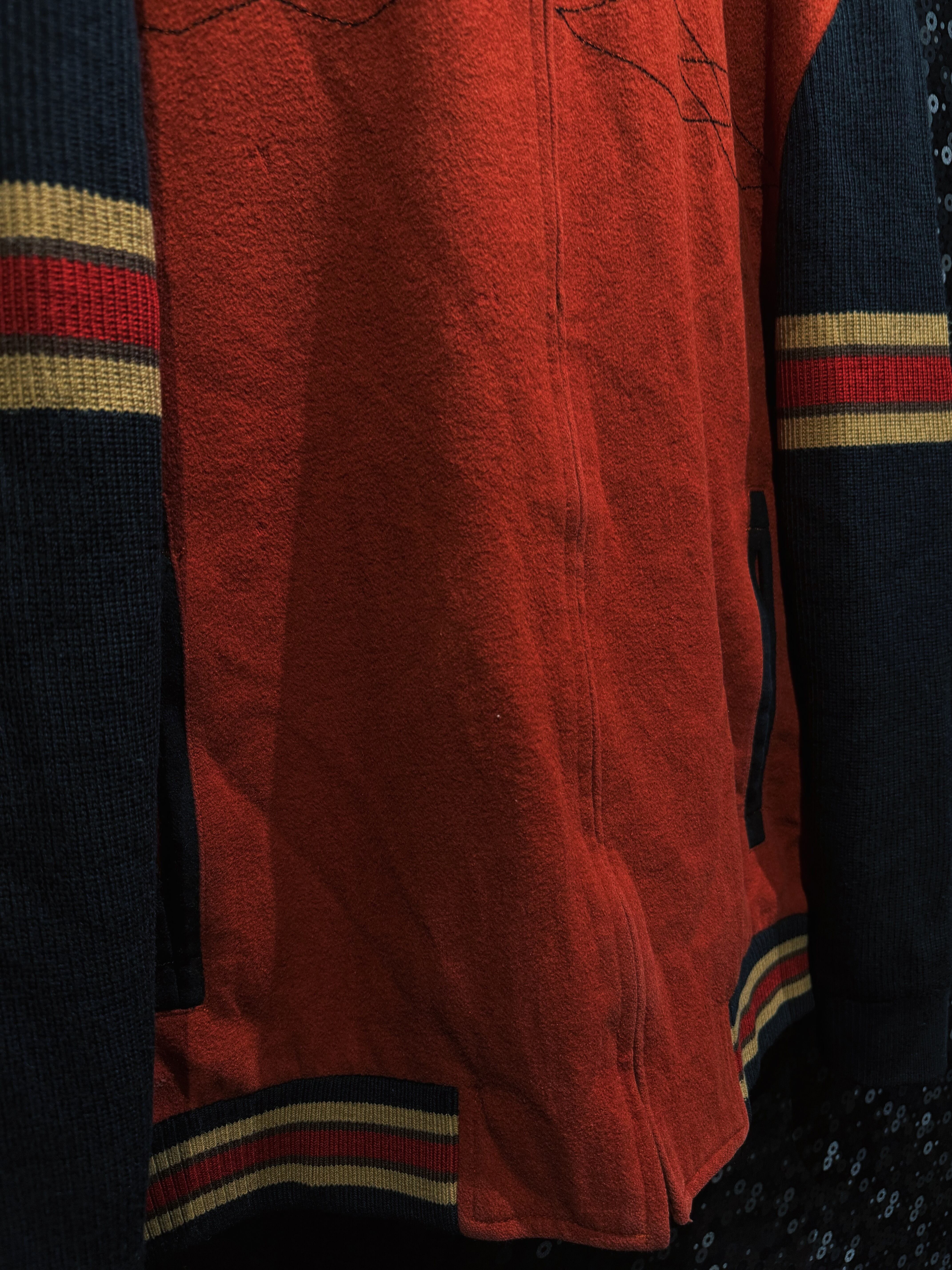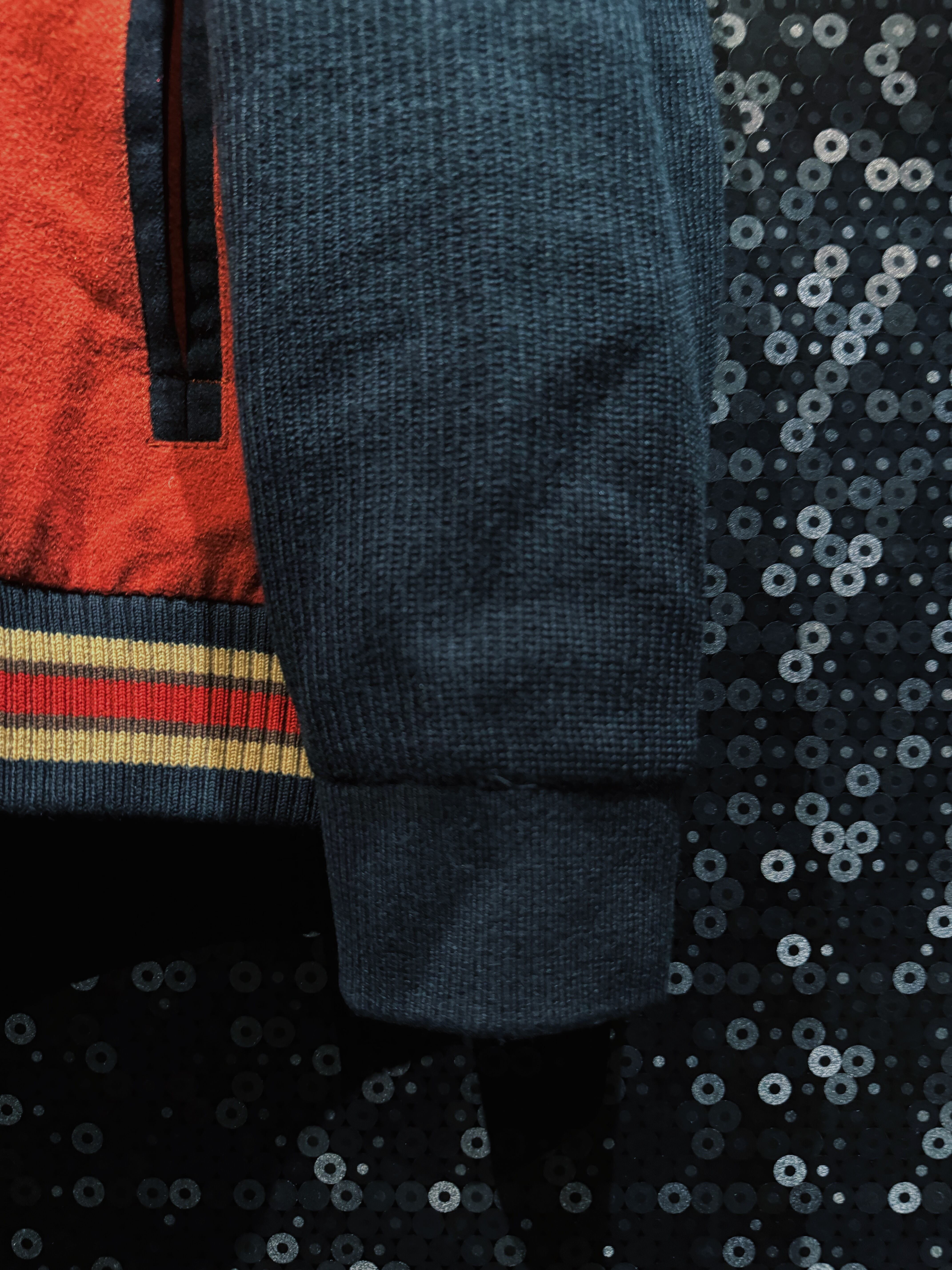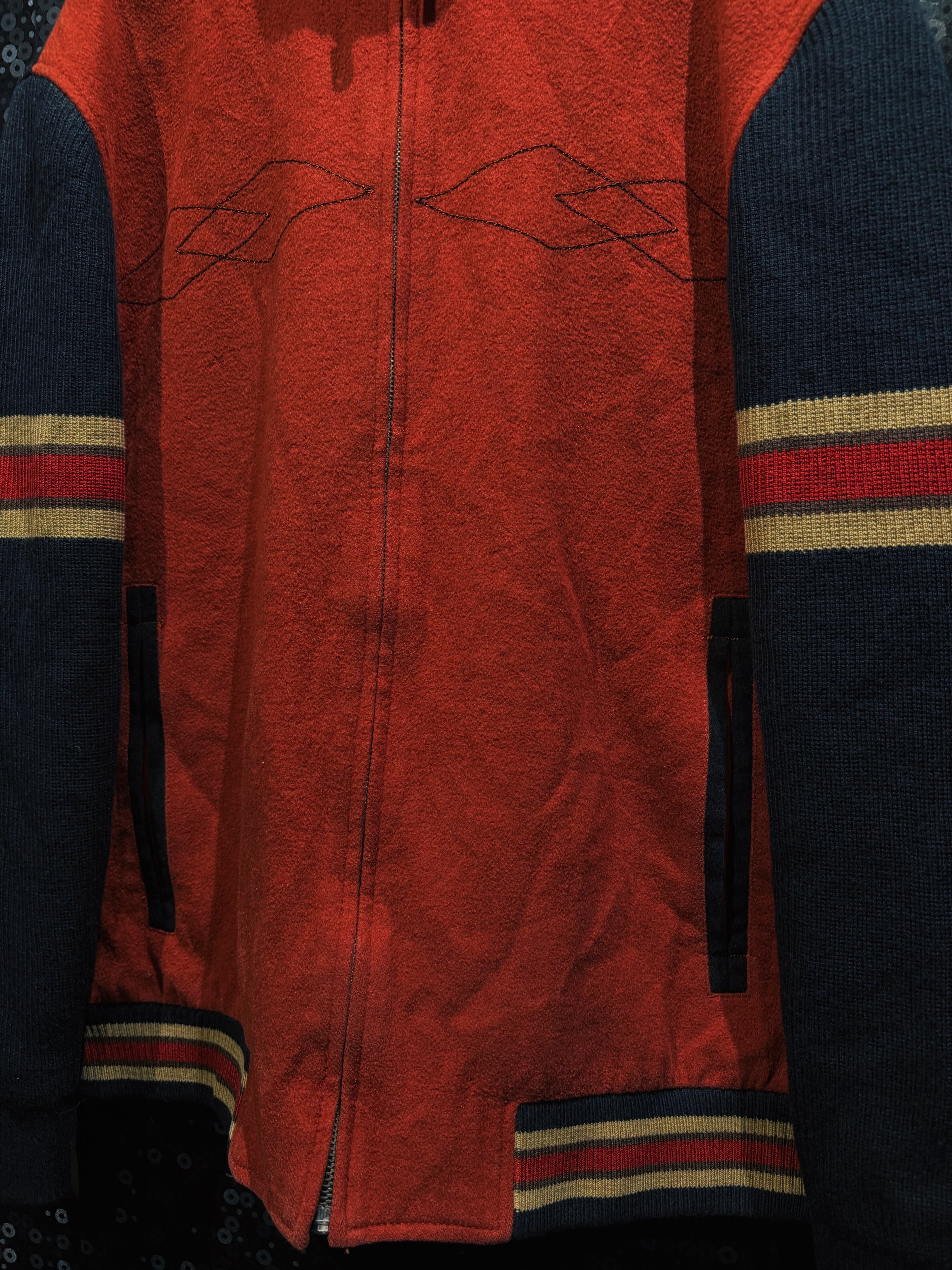 重厚なオレンジウールをベースに、袖へ切り替えられたブラックニット、そしてリブに走るレッド×イエローのラインが強烈な存在感を放つヴィンテージジップジャケット。フロントはフルジップ仕様で、胸元には幾何学的なステッチワークが入り、無地ながらも単調にならない構成。素材感のコントラストが非常に強く、ウールの温もりとニットの柔らかさが同居した、今の量産品ではまず見ない作り込みが魅力。