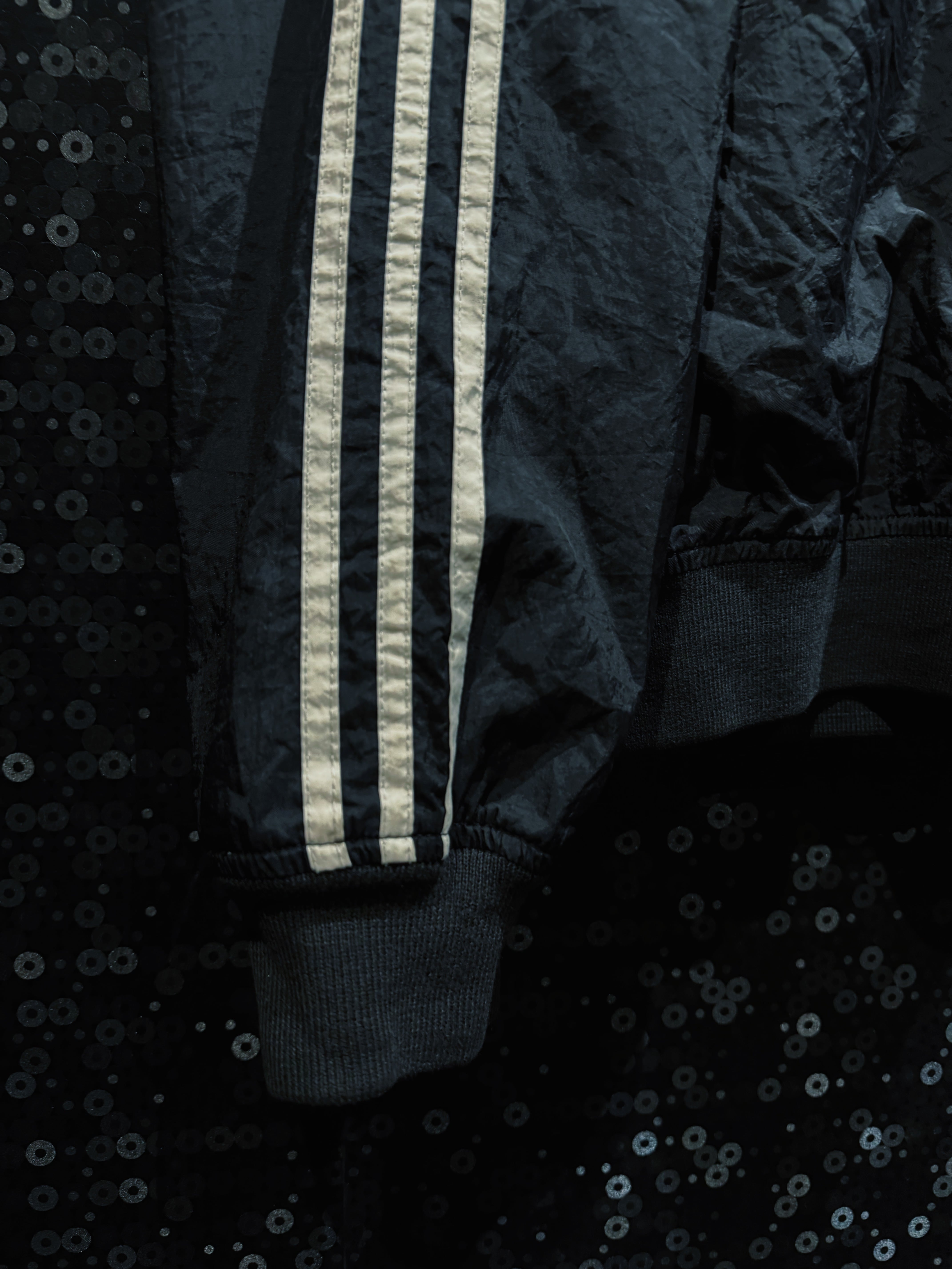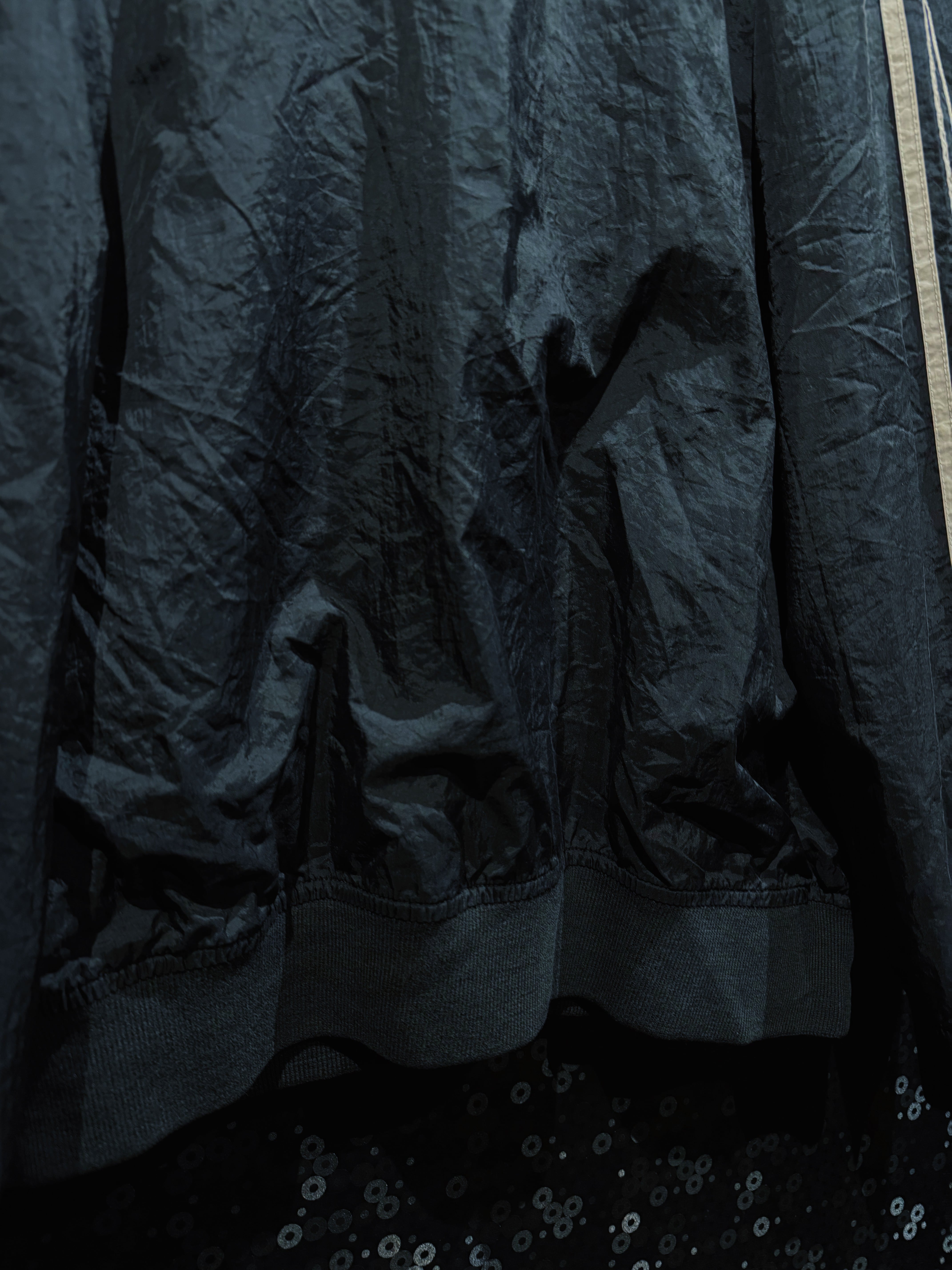 ブラックボディにホワイトのロゴとスリーストライプという王道配色ながら、ナイロン特有のシワ感と光沢が加わることで、スウェットとはまったく違う表情に仕上がっている。