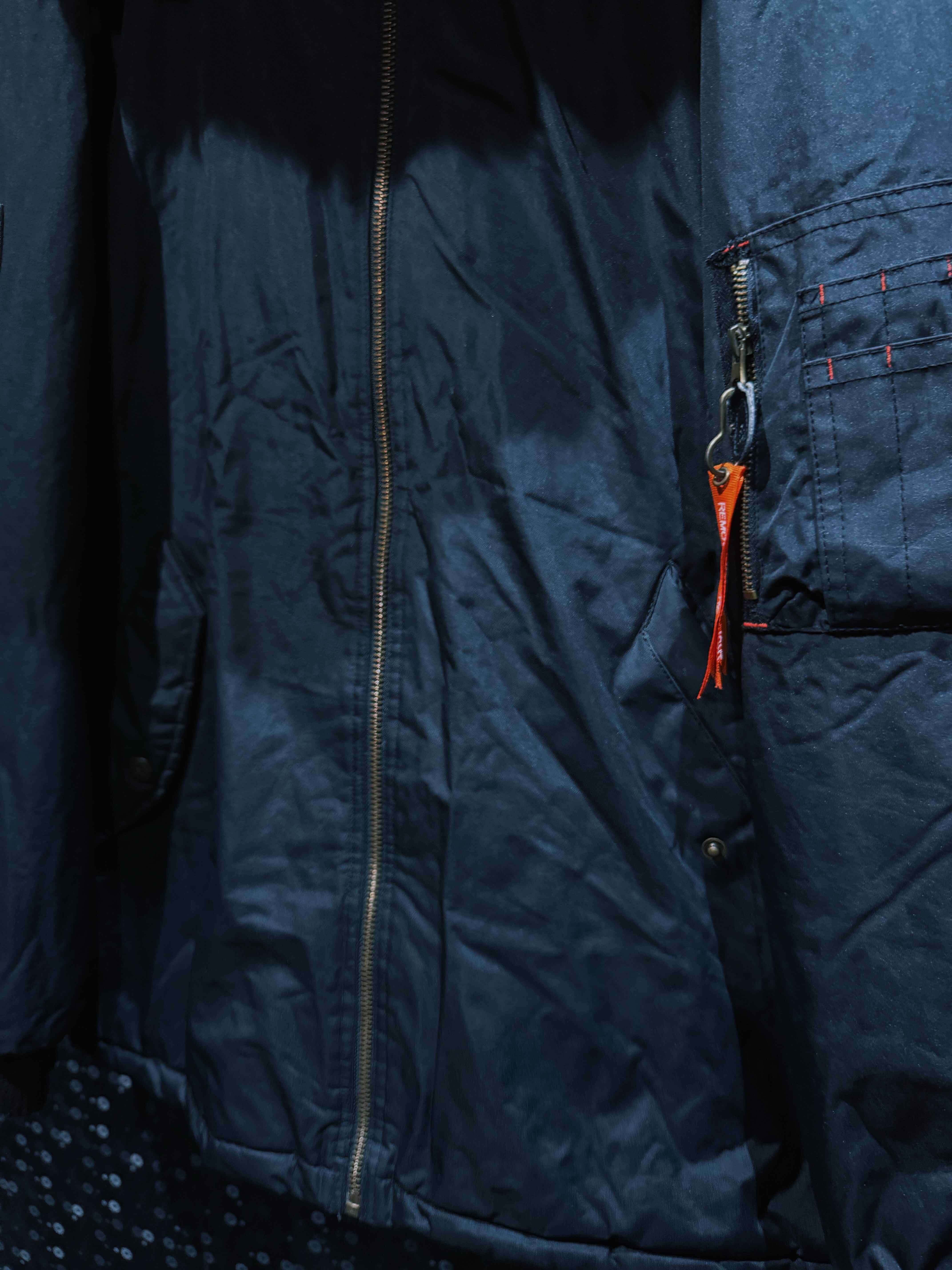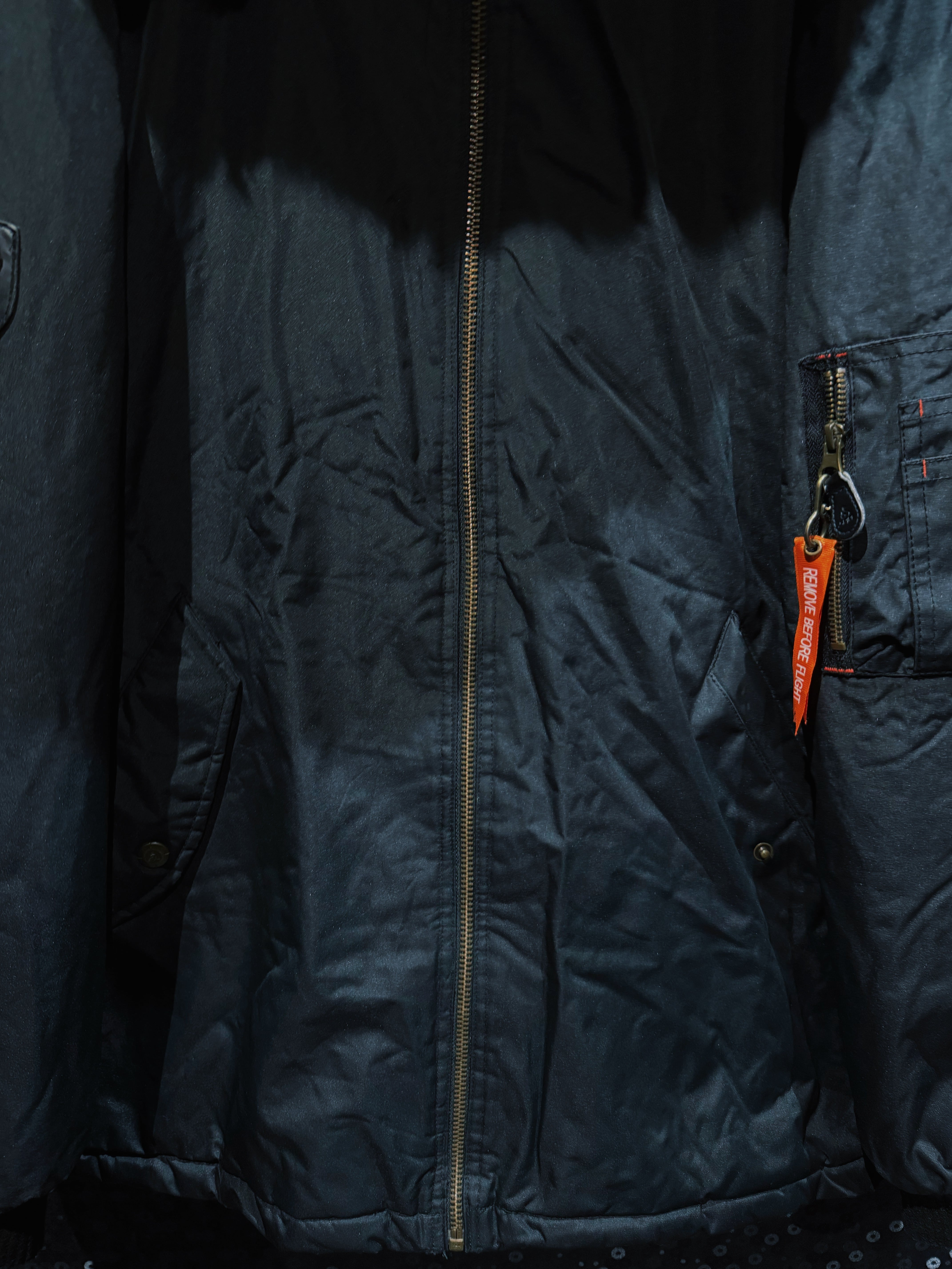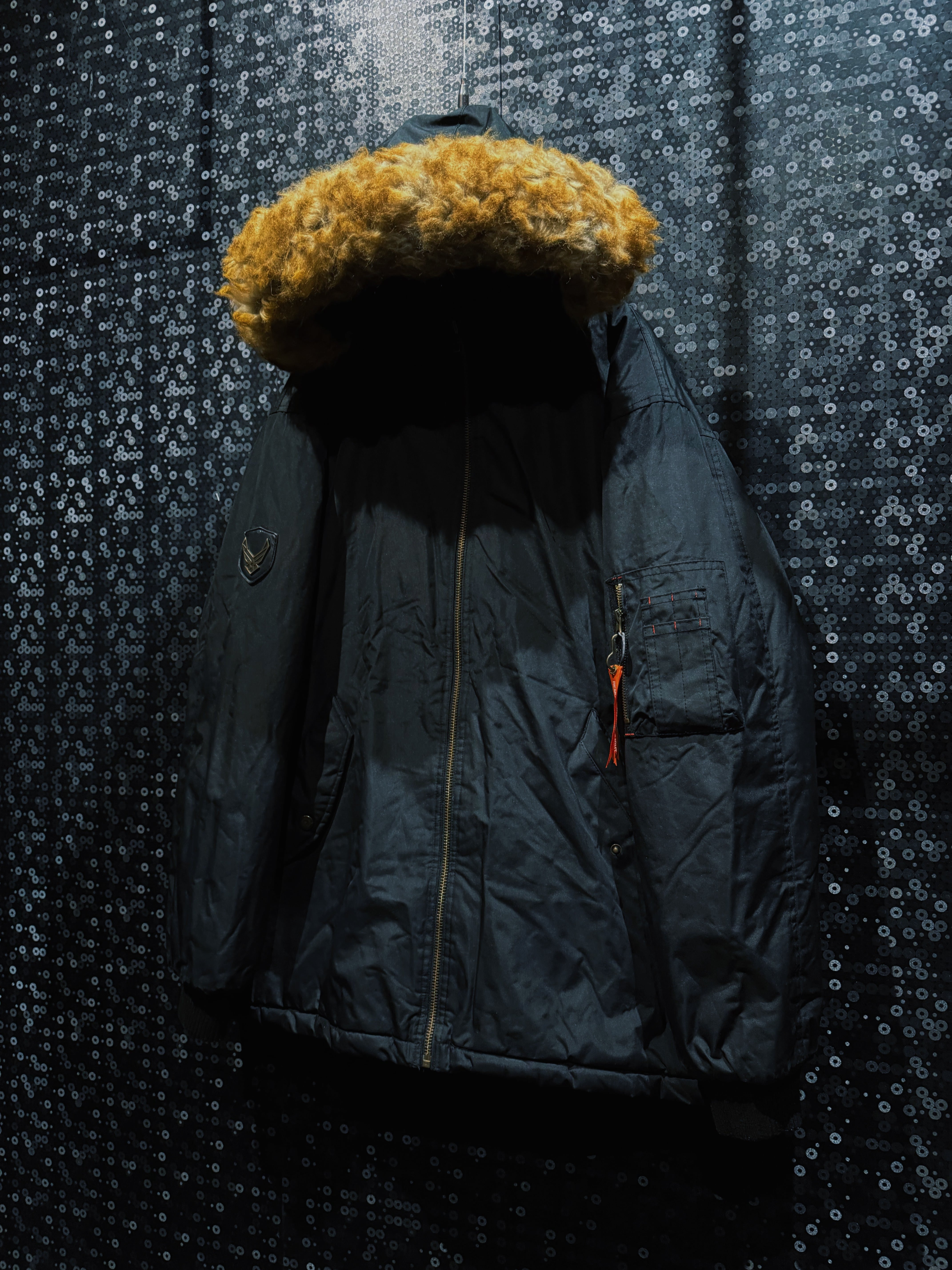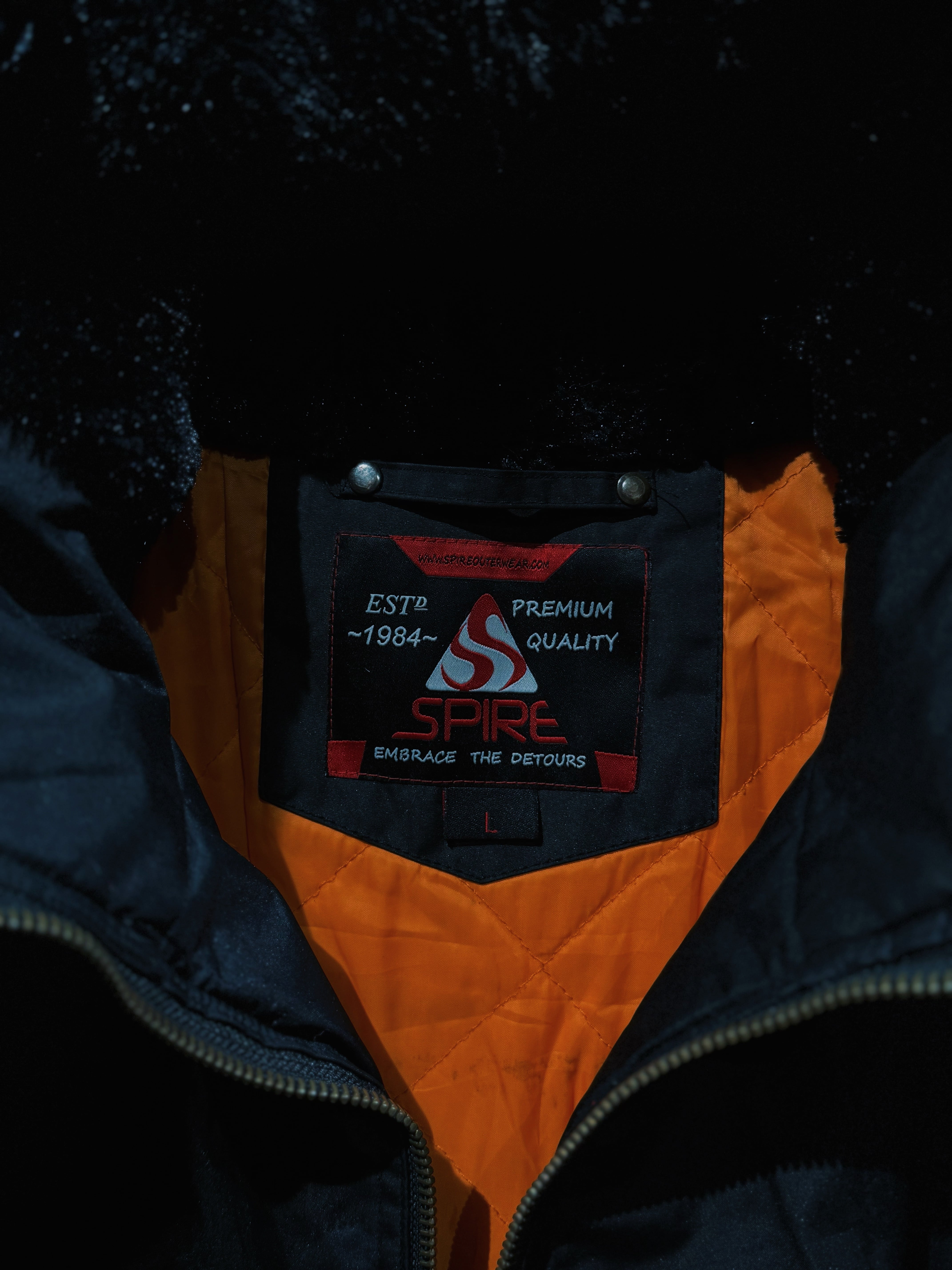 1984年創業のブランド SPIRE によるフライトジャケットタイプの一着。ミリタリー由来の無骨なシルエットをベースに、重厚感のある中綿ボディとオレンジライニングを組み合わせた、王道でありながらも存在感の強い仕上がり。フード周りにはボリュームのあるファーがあしらわれ、防寒性とビジュアルの両面でインパクトを放つ。