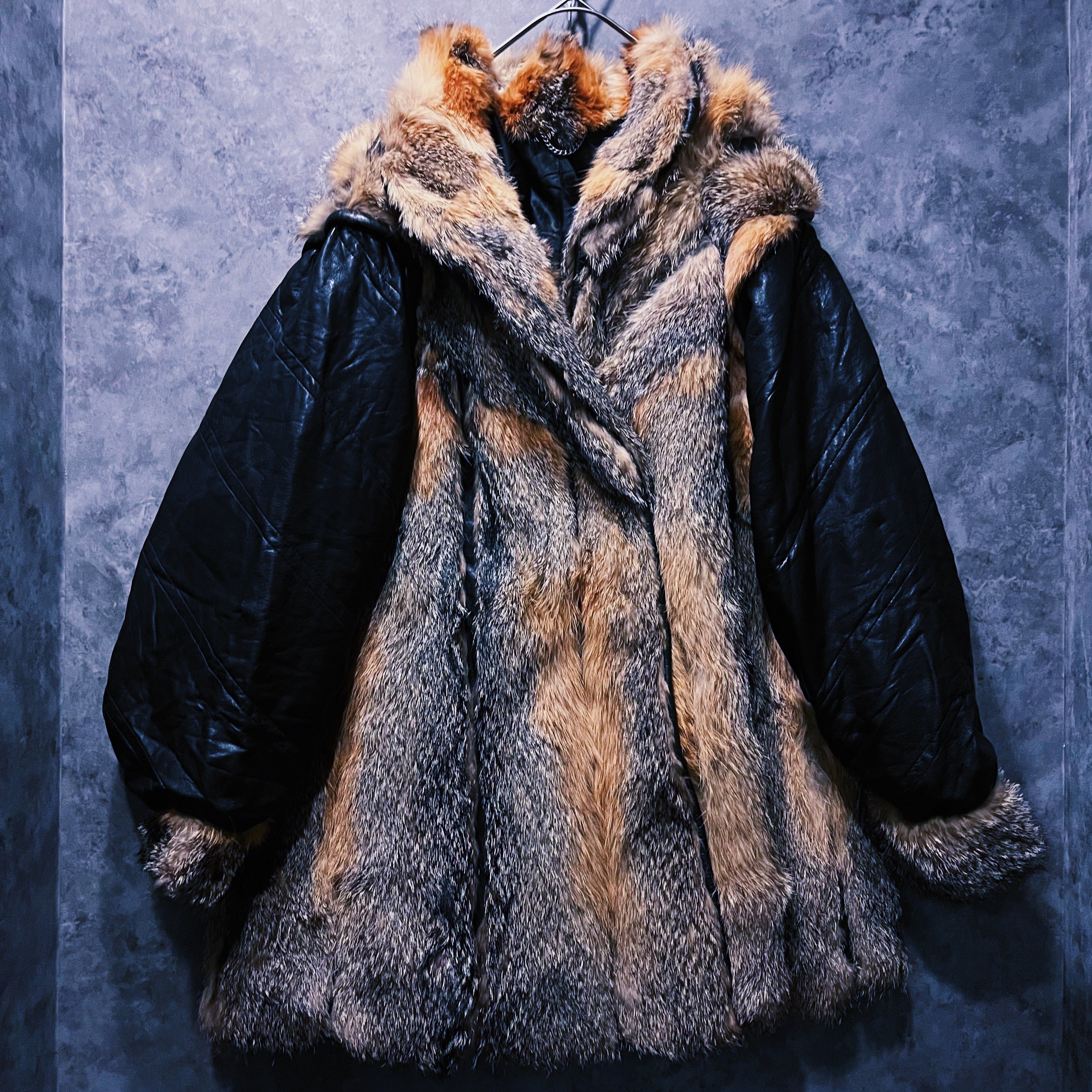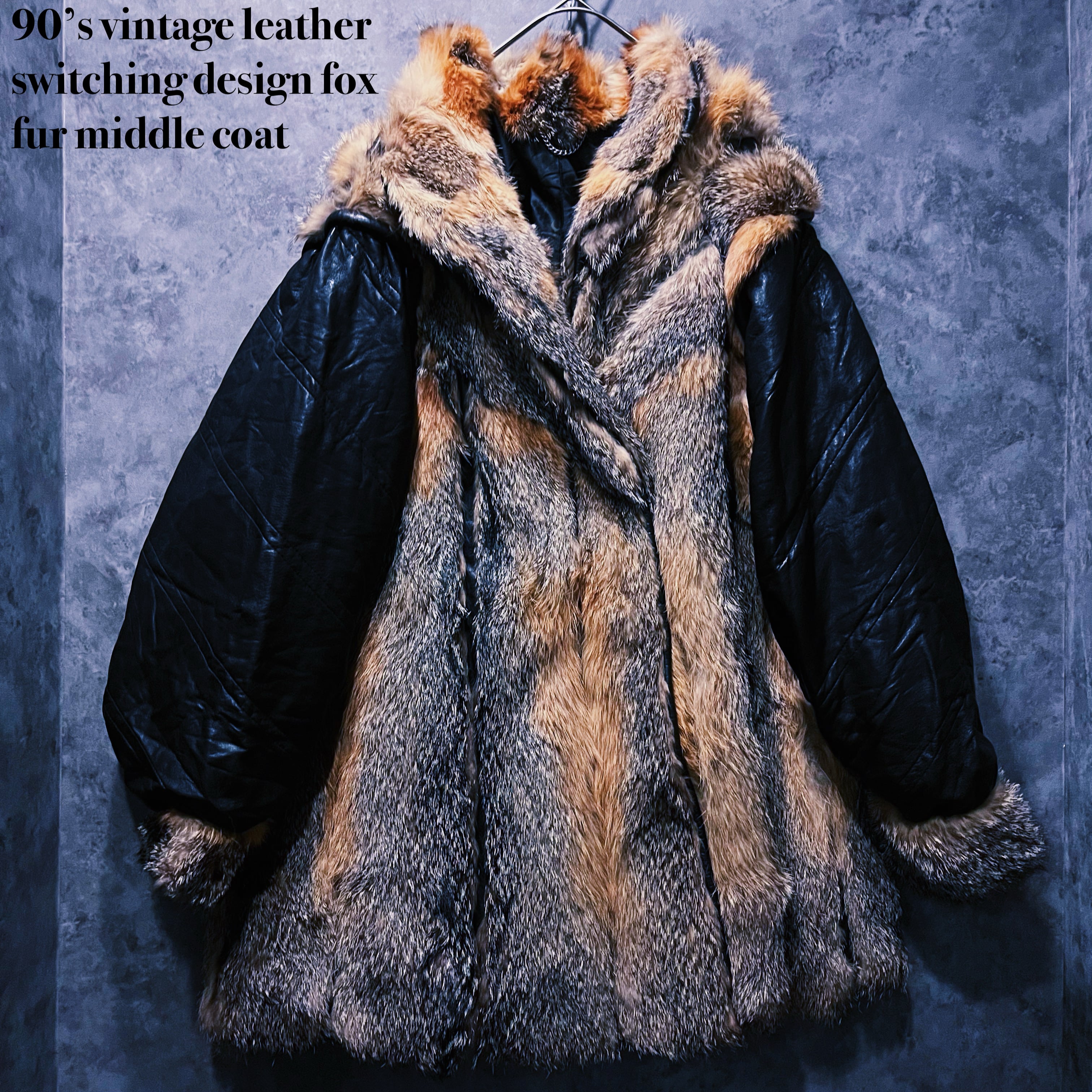 90’sヴィンテージレザースイッチングデザインフォックスファーミドルコート