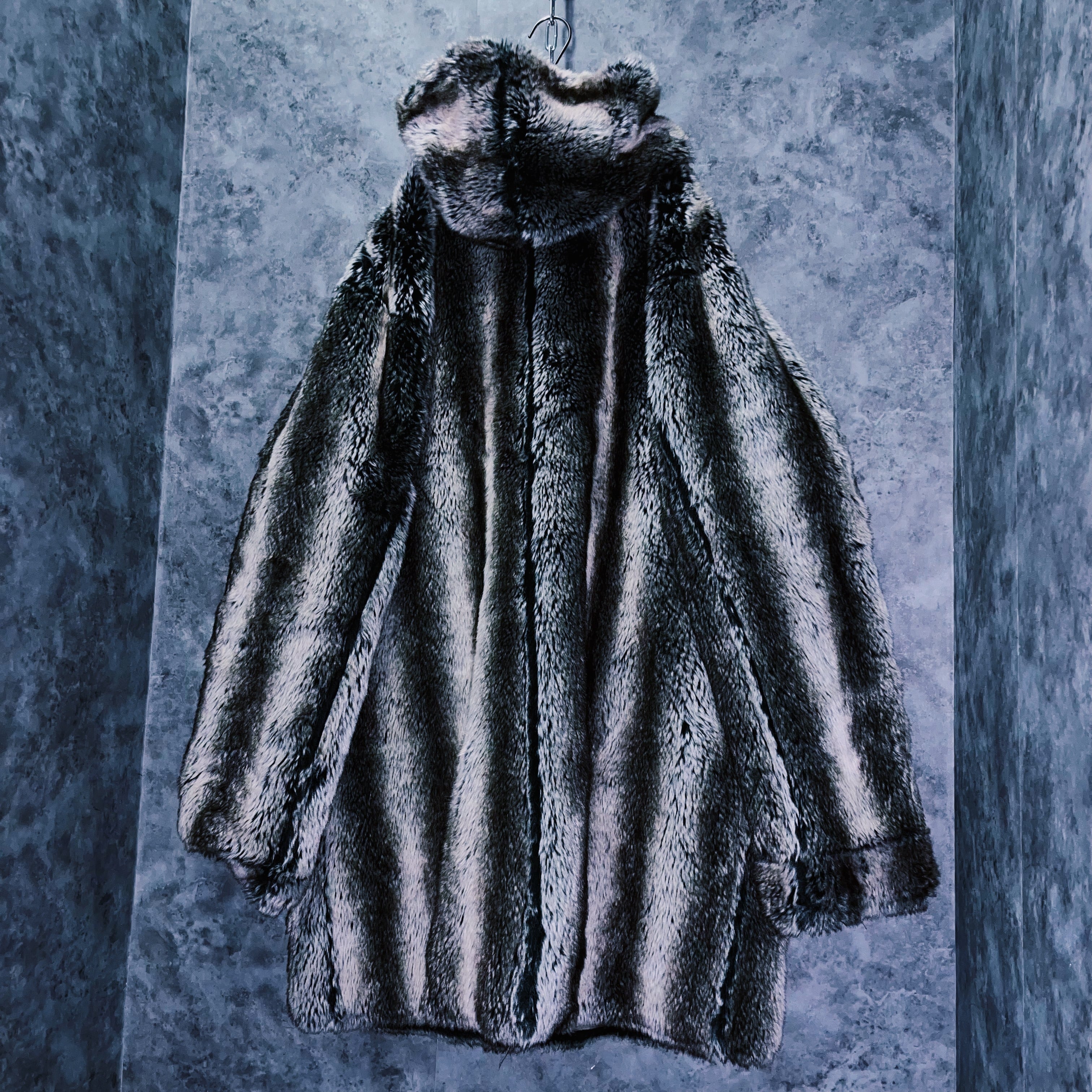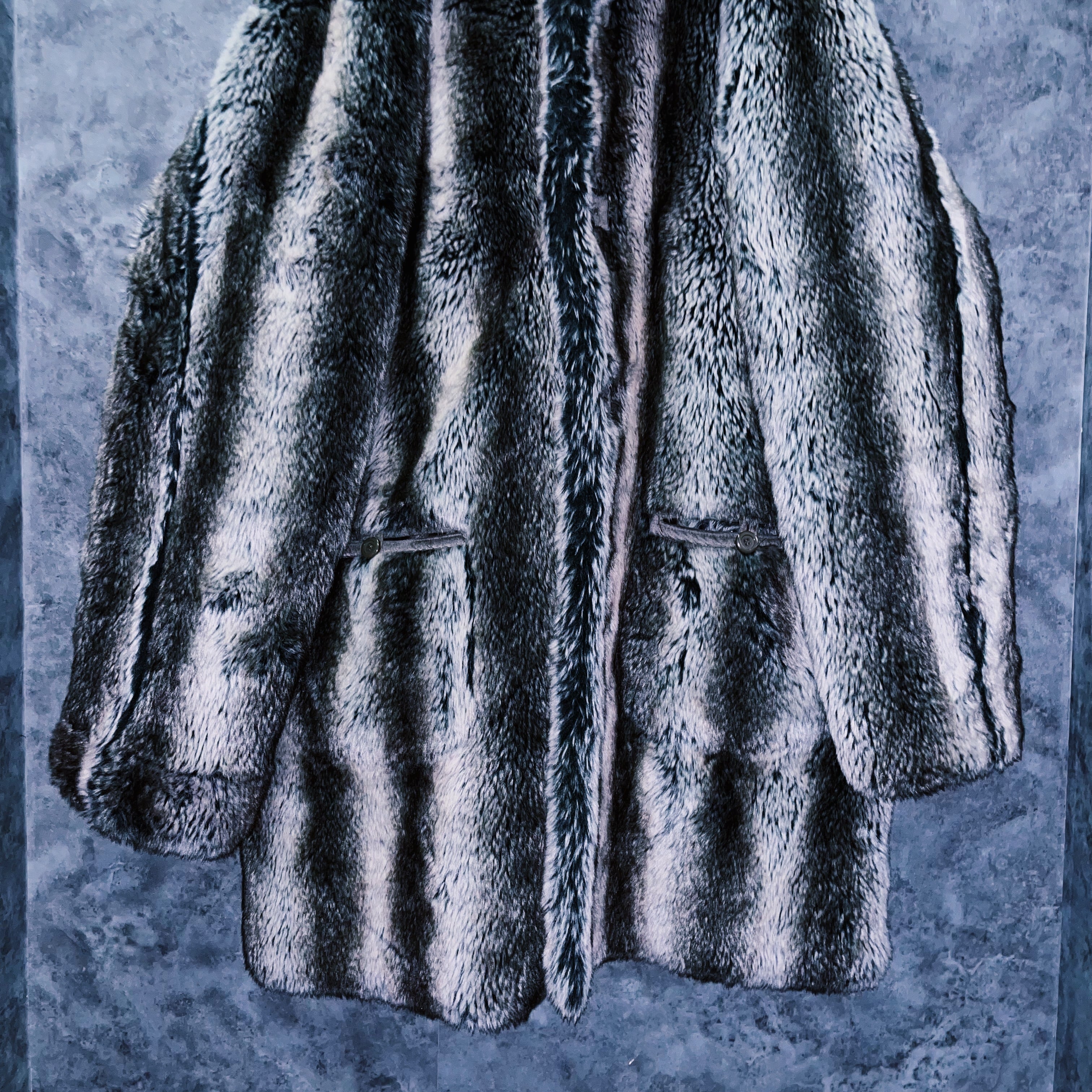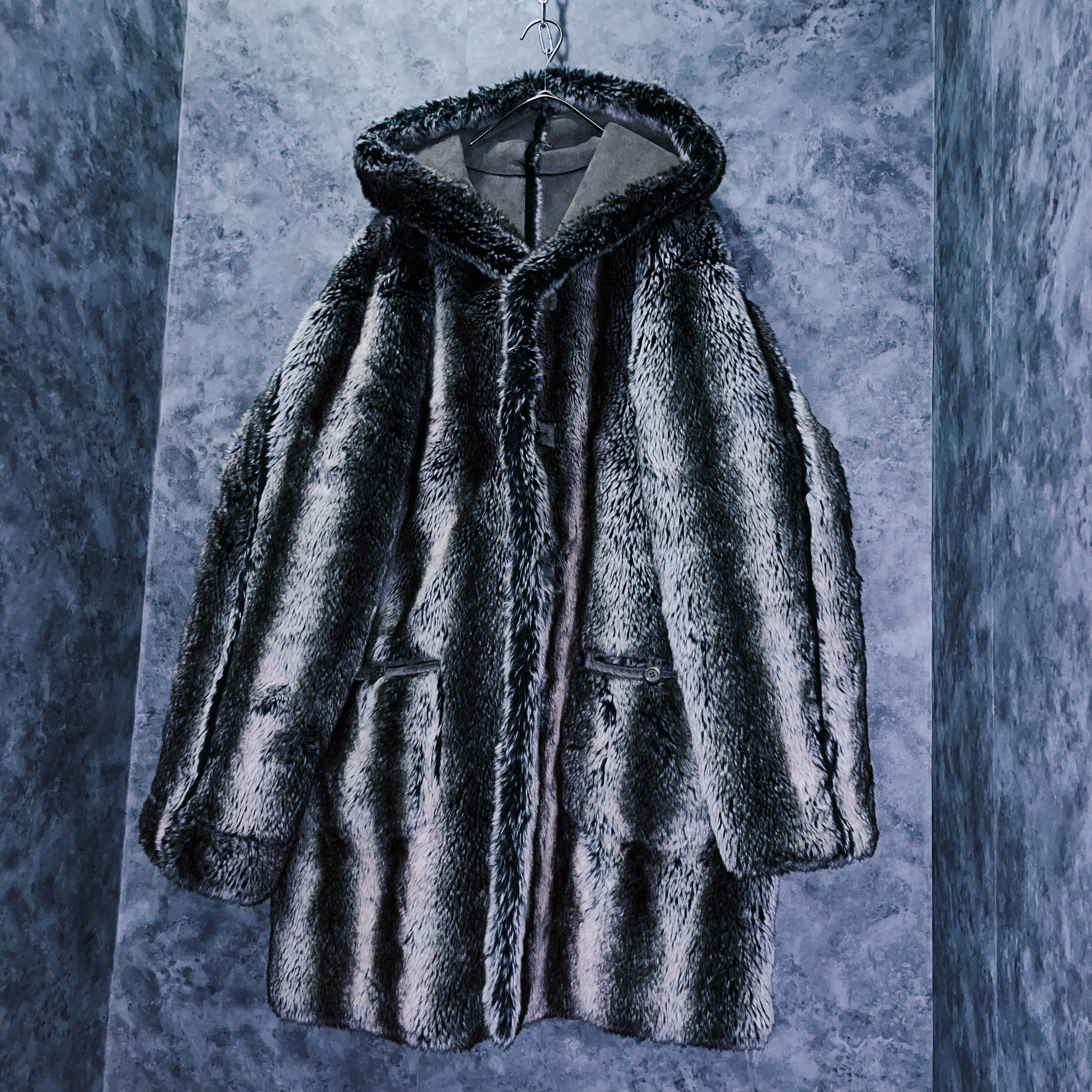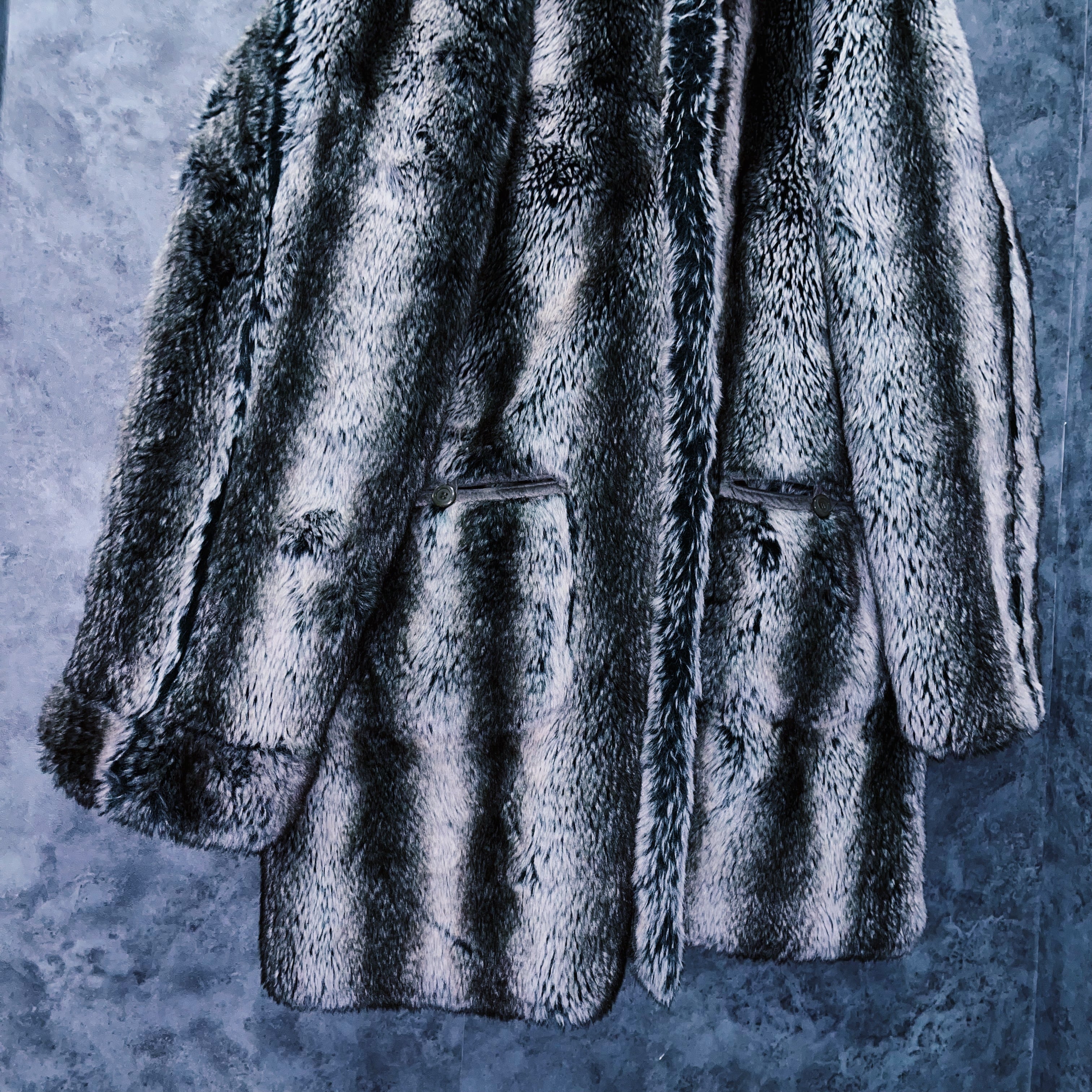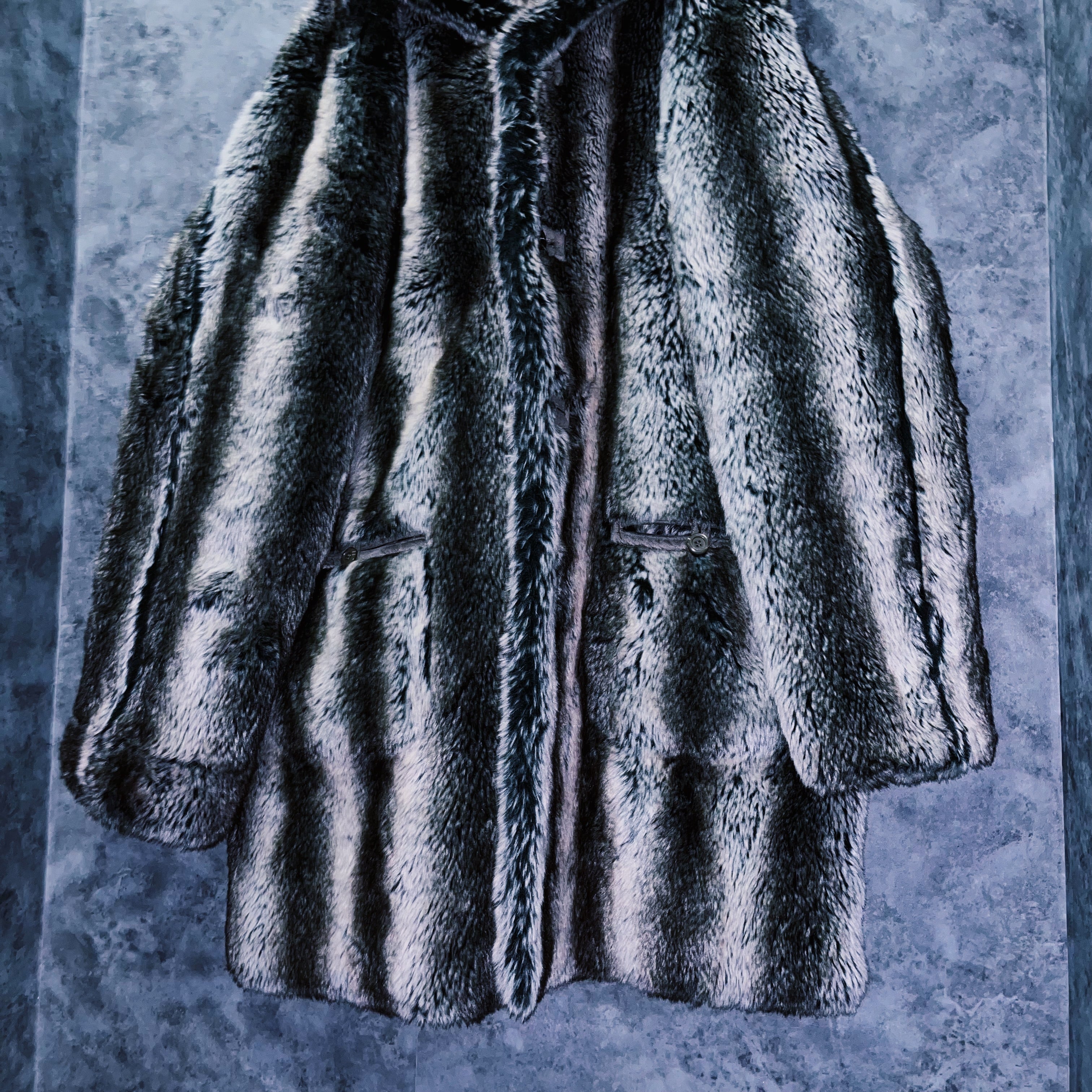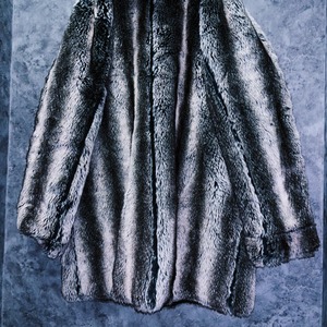 全体をホワイト、灰味がかったブラックカラーでストライプデザインに仕上げたフェイクファーコート。