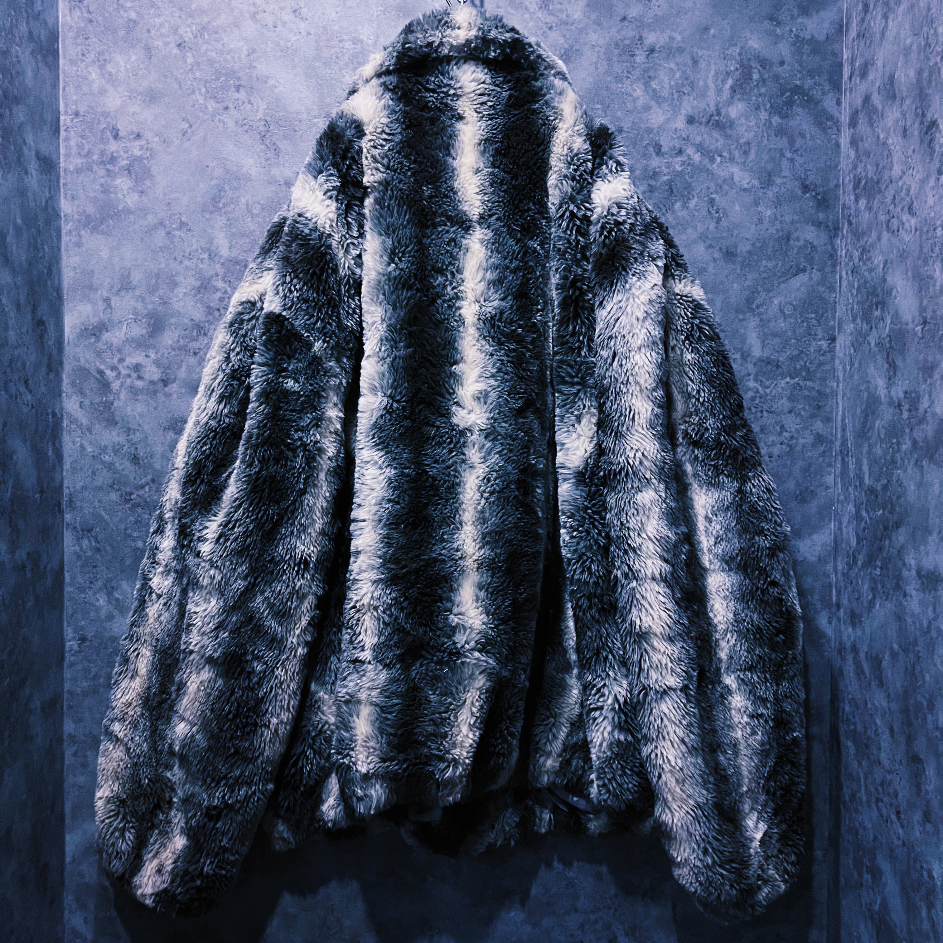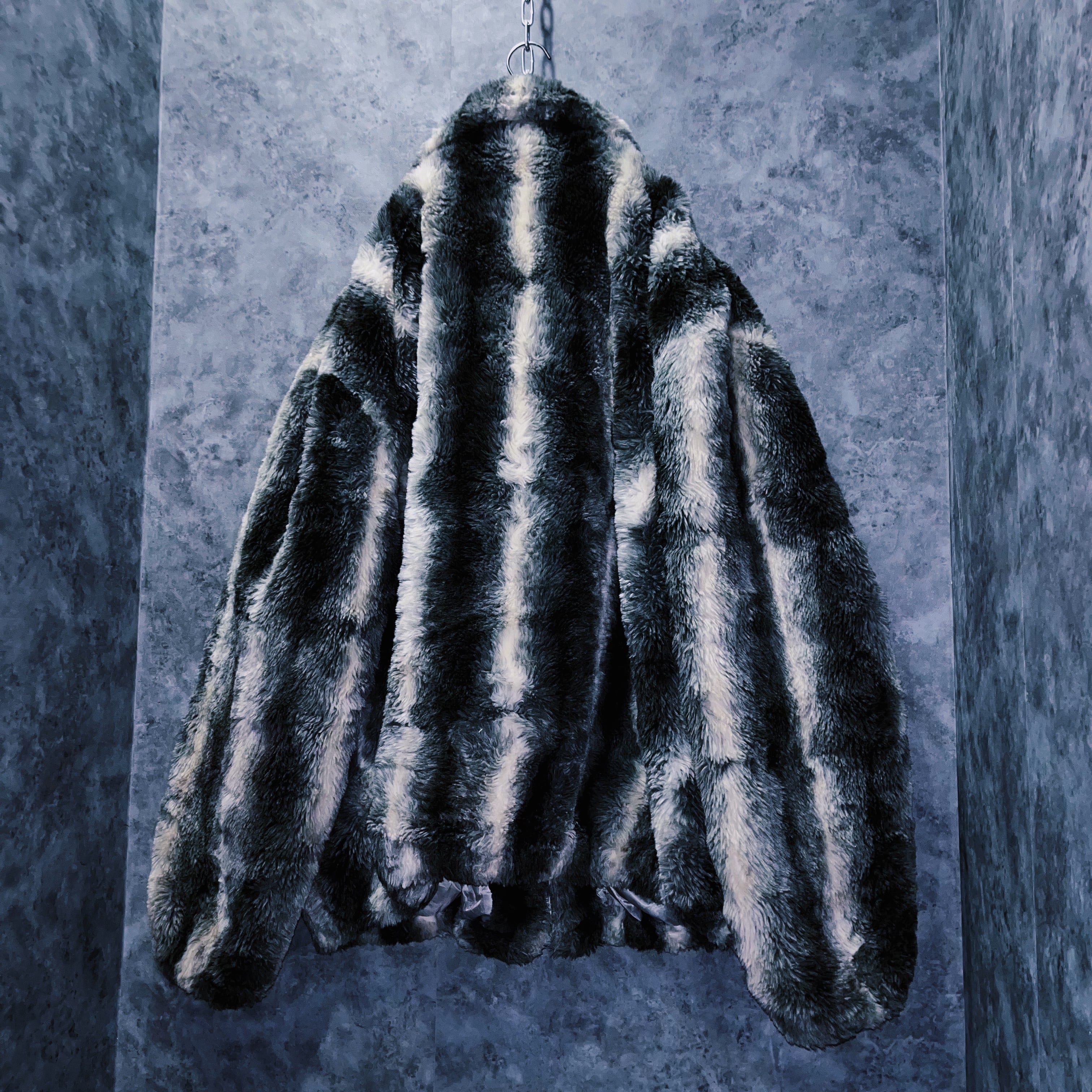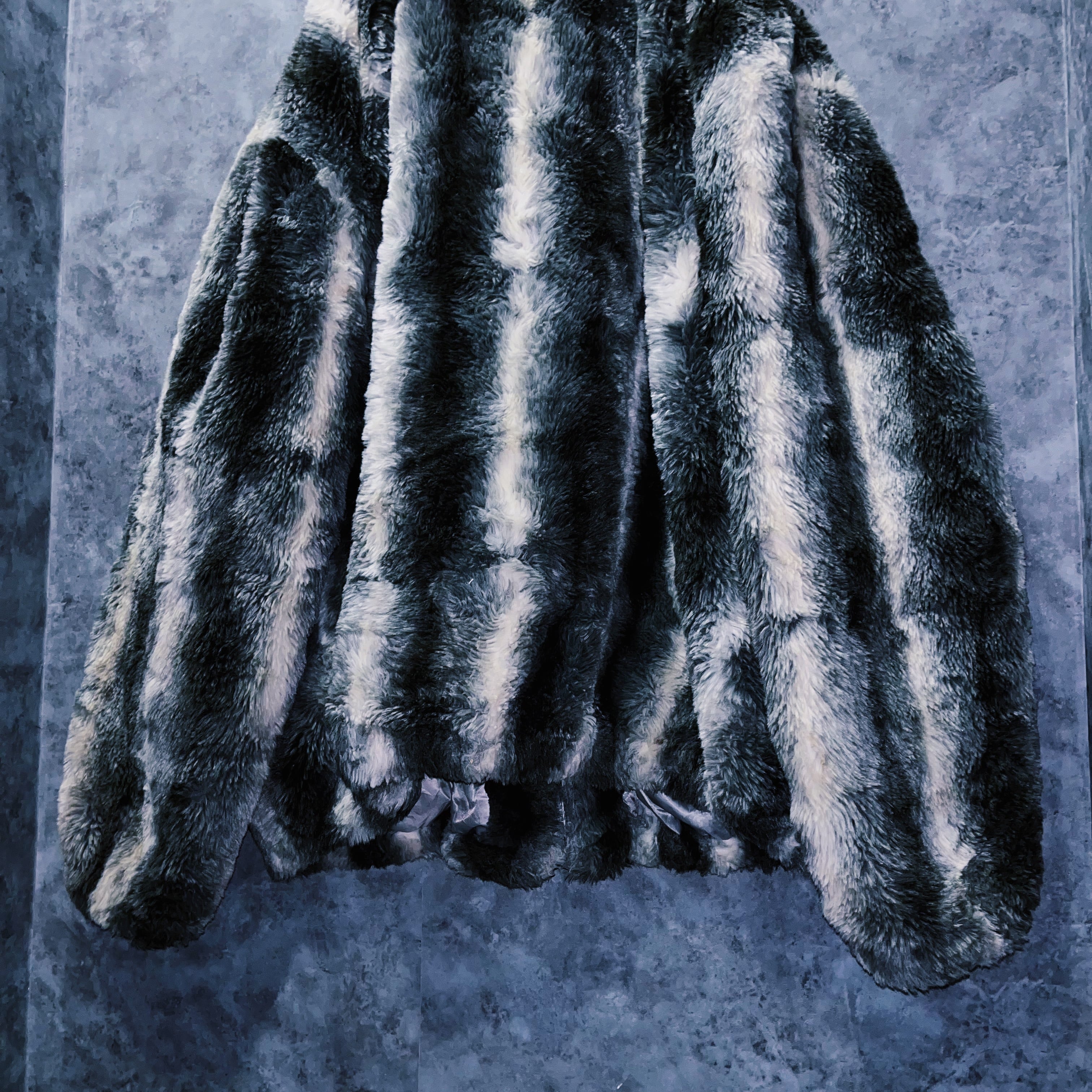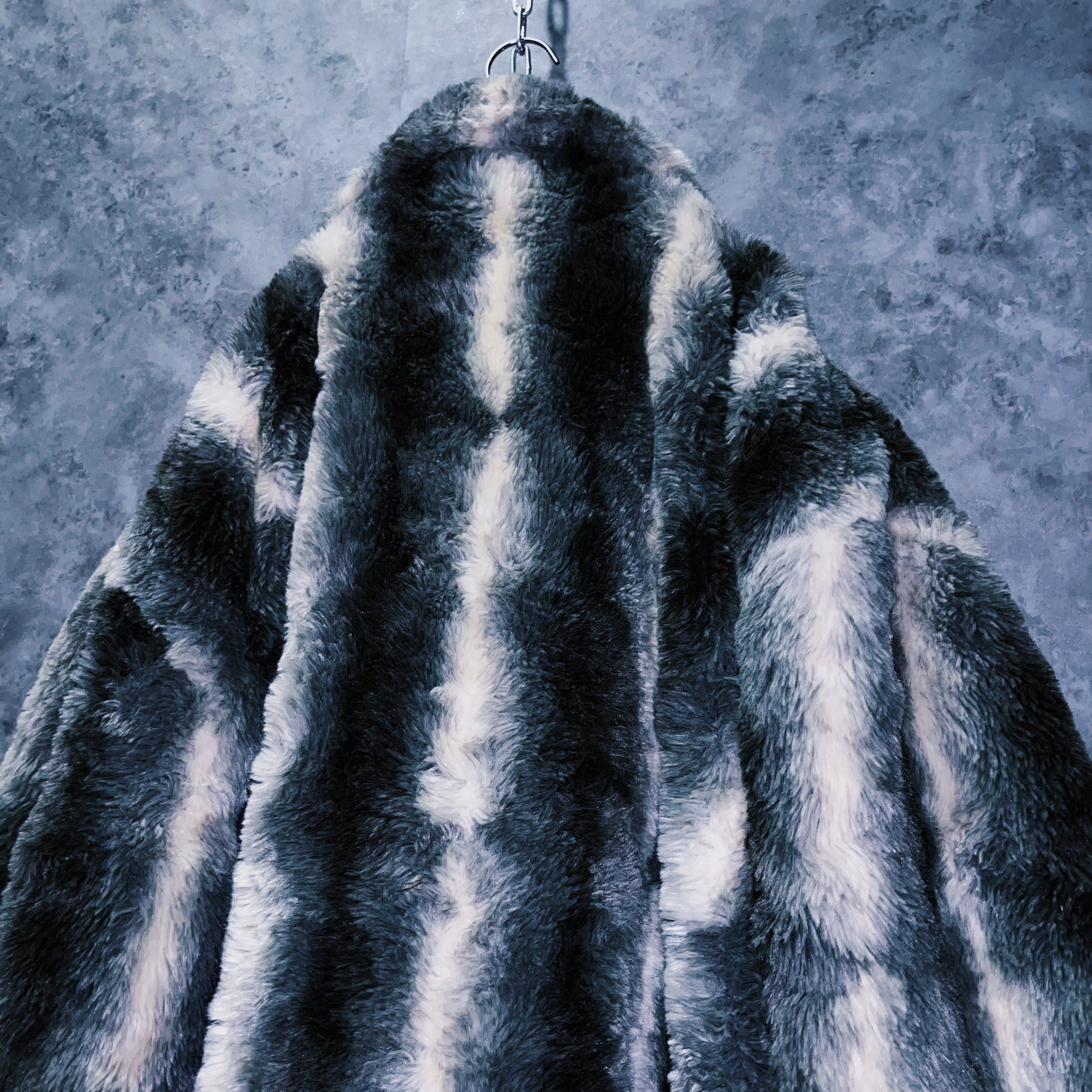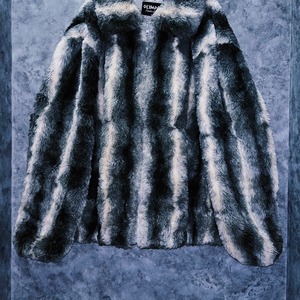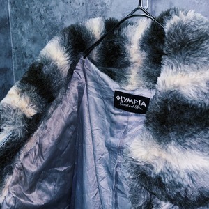 全体をホワイト、灰味がかったブラックカラーでストライプデザインに仕上げたフェイクファーコート。