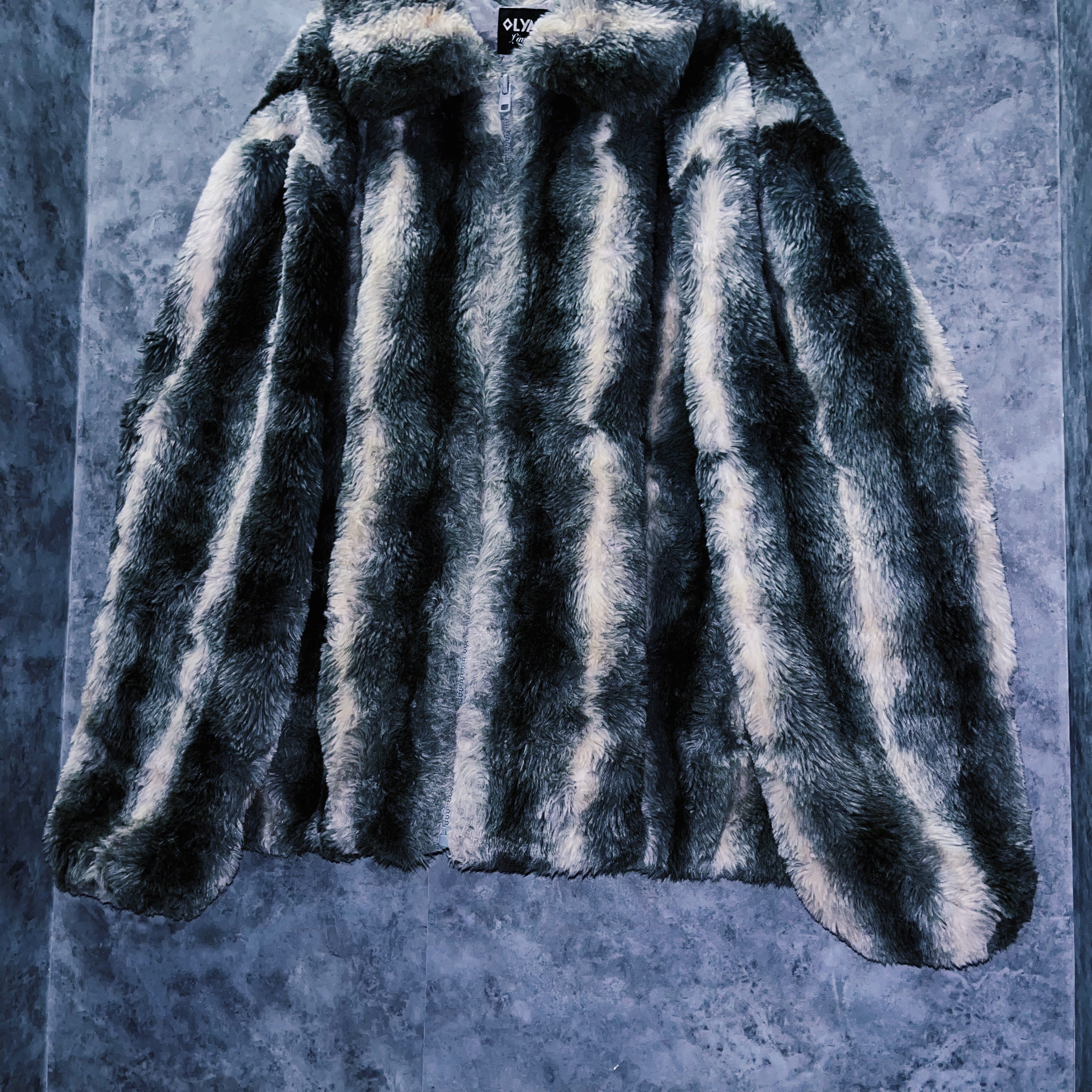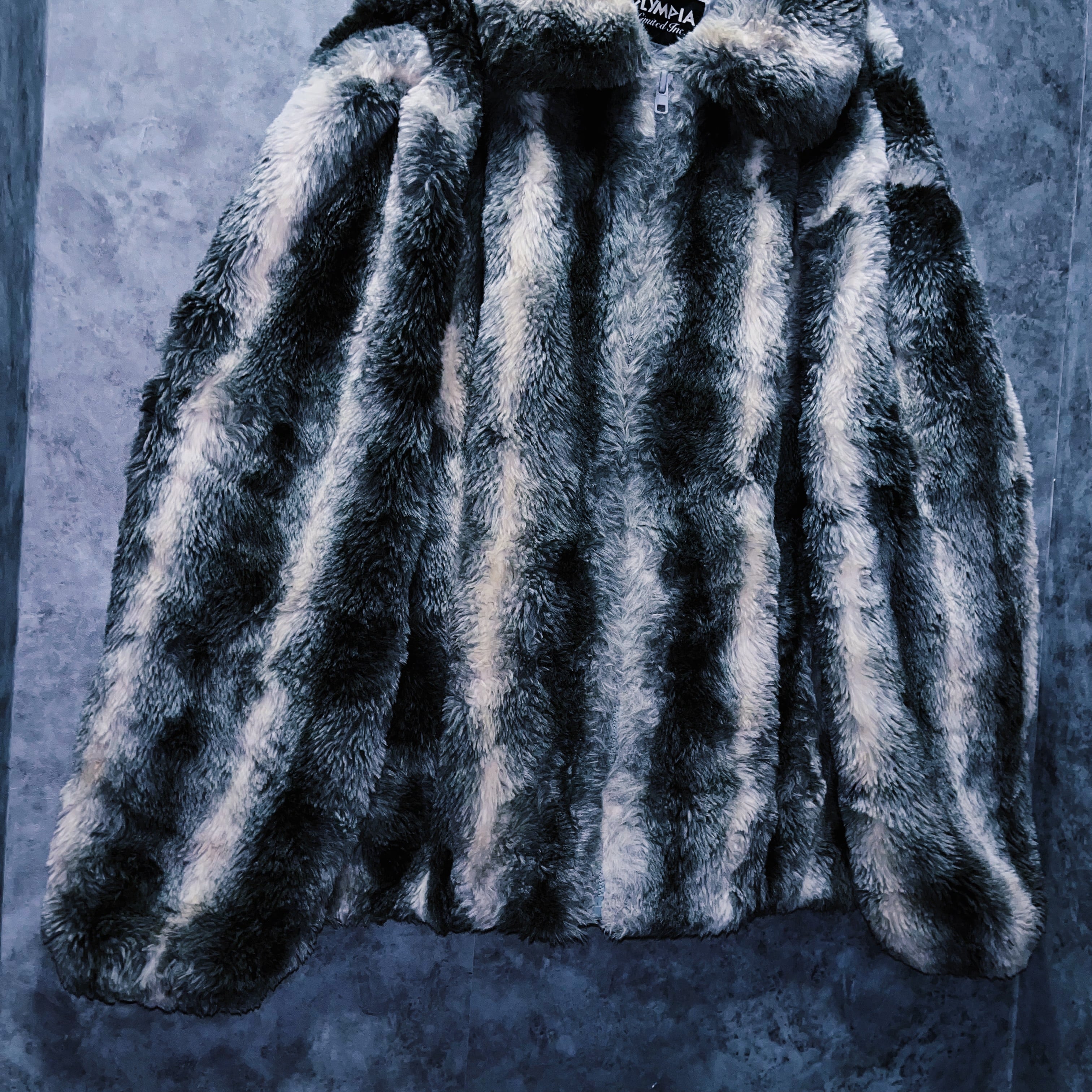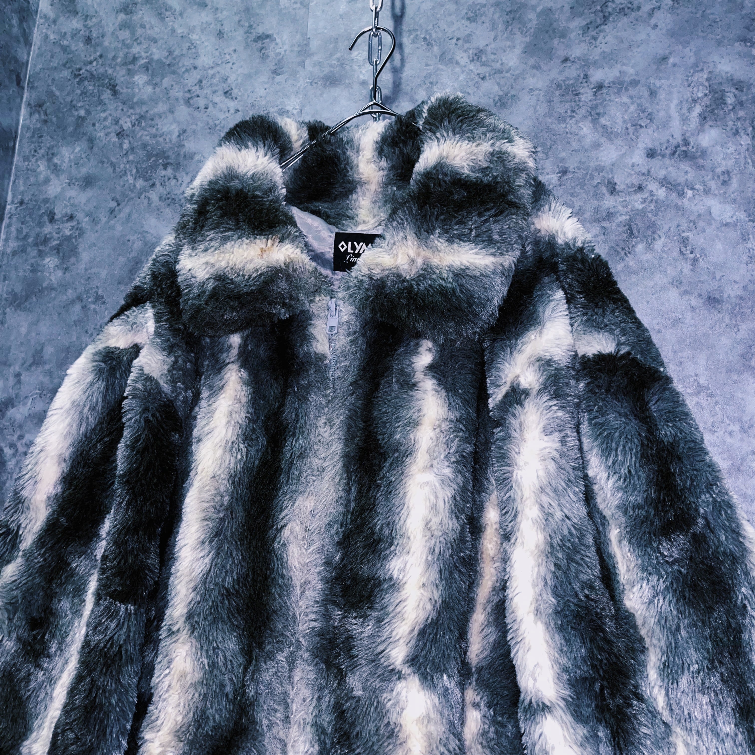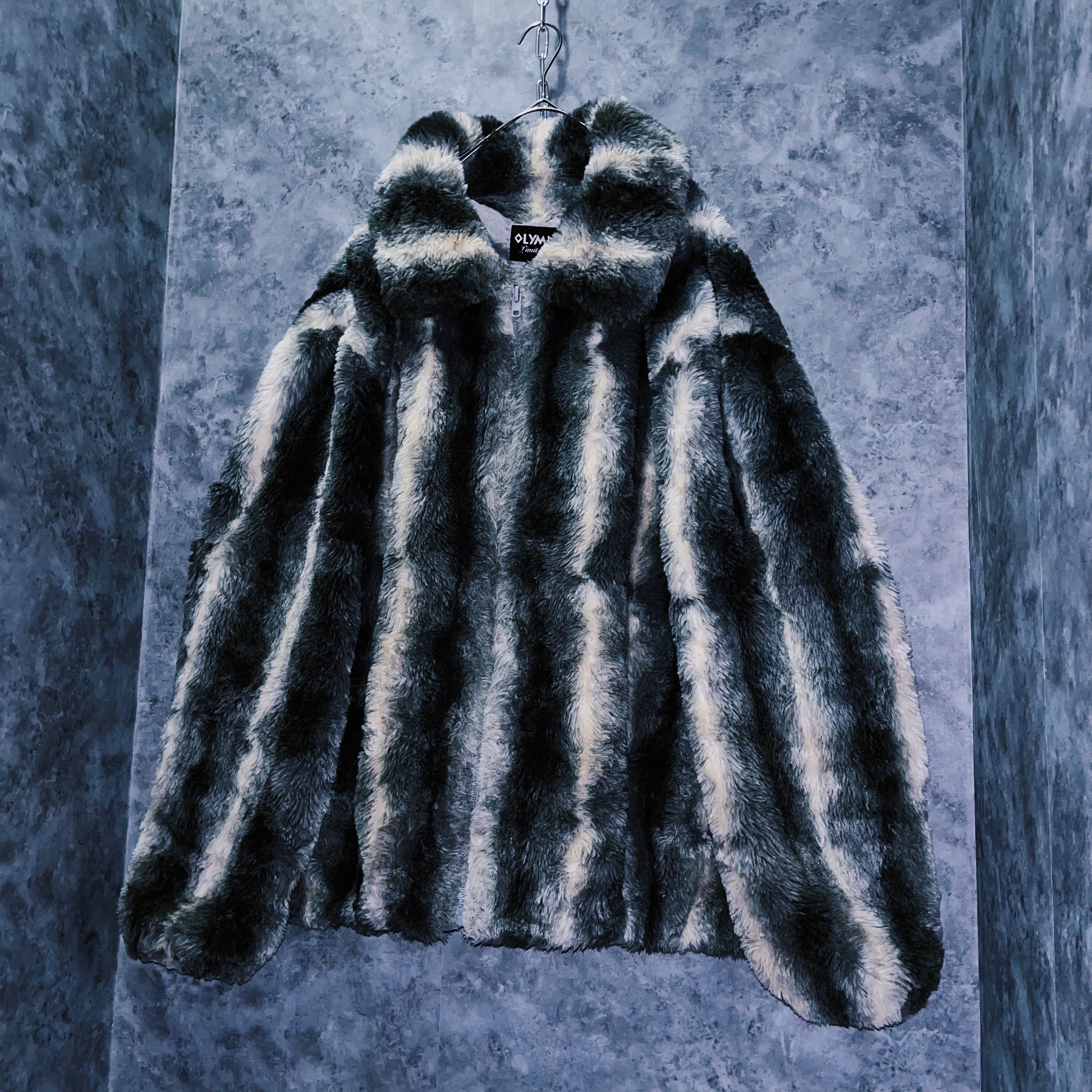 全体をホワイト、灰味がかったブラックカラーでストライプデザインに仕上げたフェイクファーコート。