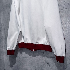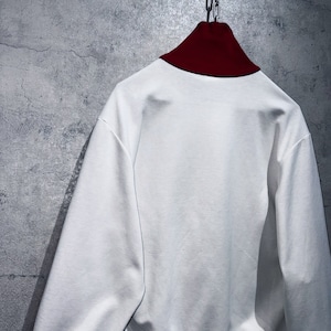 今回はホワイト×レッドカラーでご用意。3本線に加え、トレフォイルのワッペンがフロントの下の方にあるのもDESCENTE製らしいディテールですね。