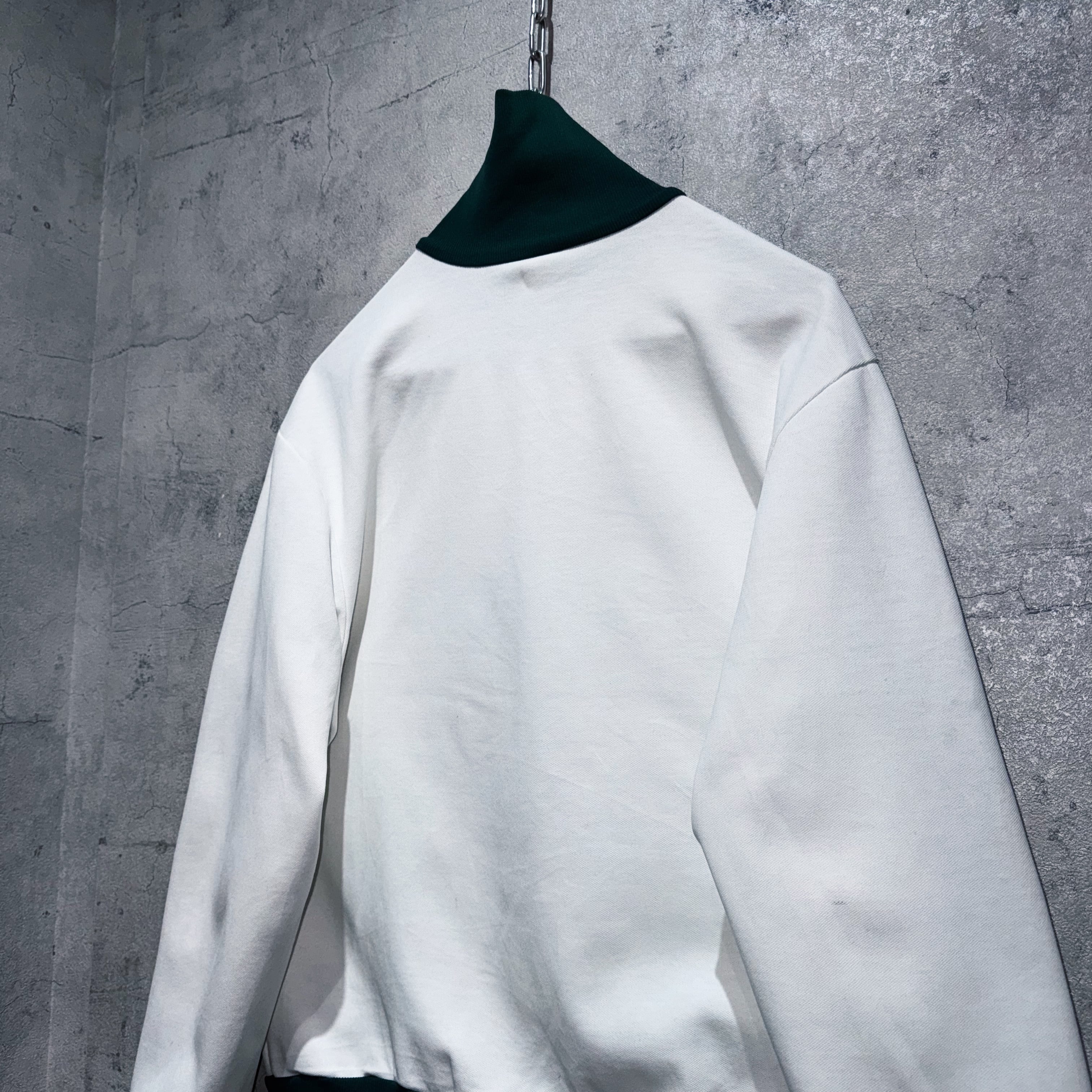 今回はホワイト×グリーンカラーのポピュラーな色合いでご用意。3本線に加え、トレフォイルのワッペンがフロントの下の方にあるのもDESCENTE製らしいディテールですね。