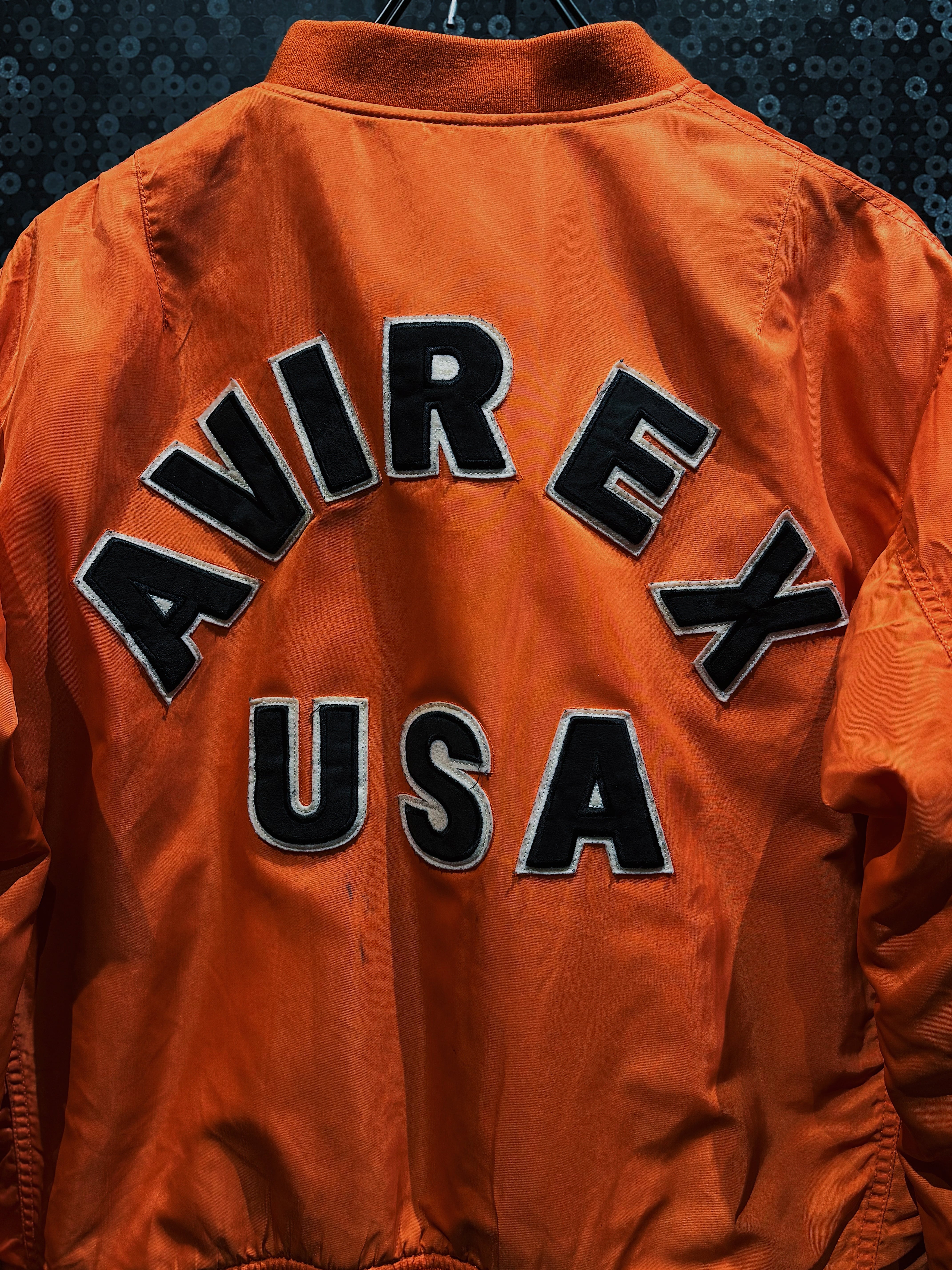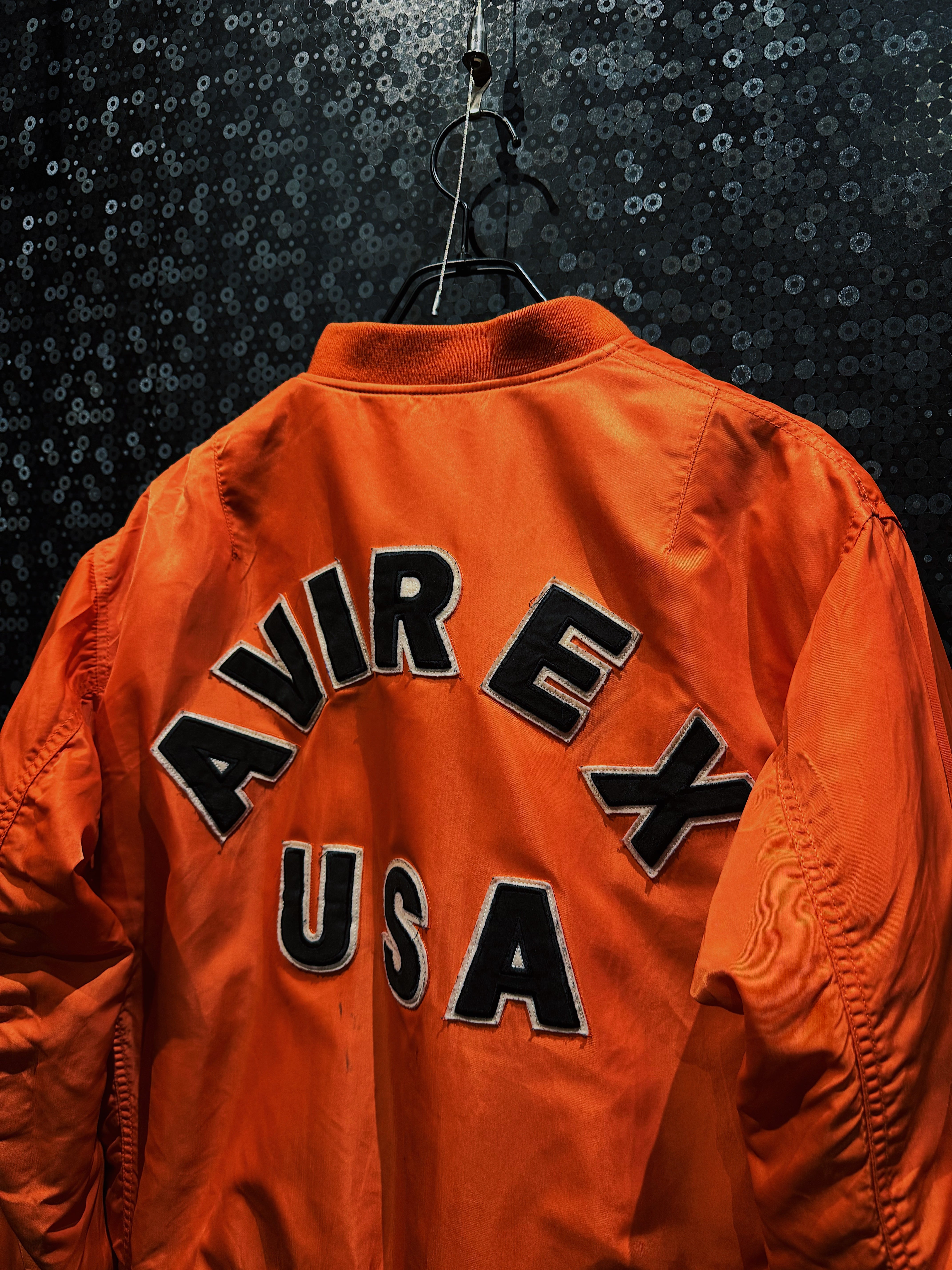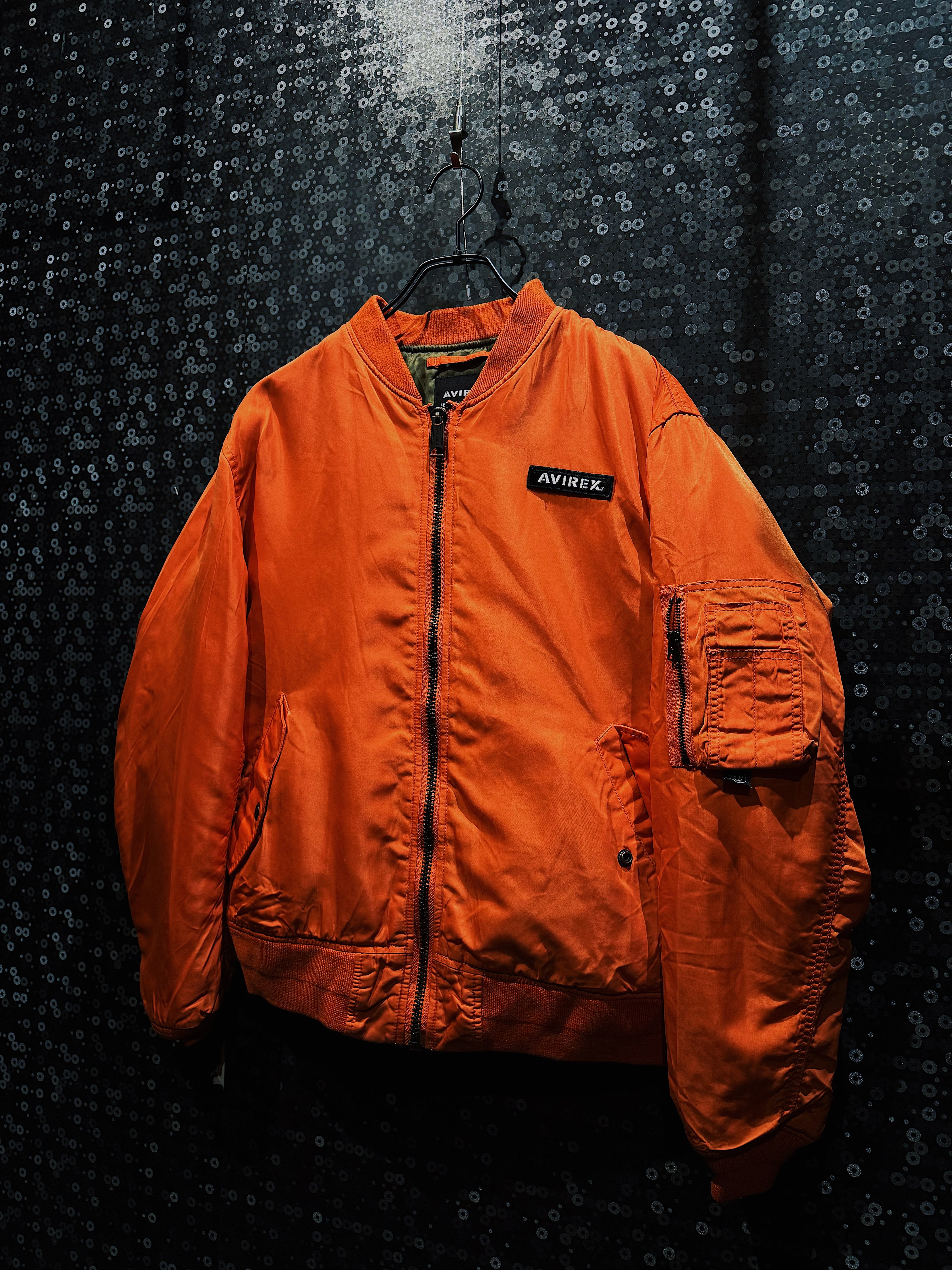 鮮烈なレスキューオレンジが一目で視線を掴む、AVIREXのヴィンテージMA-1フライトジャケット。フロントは比較的ミニマルな構成ながら、バックに大胆に配置された「AVIREX USA」のアーチロゴ刺繍が、この一着のキャラクターを決定づけている。
