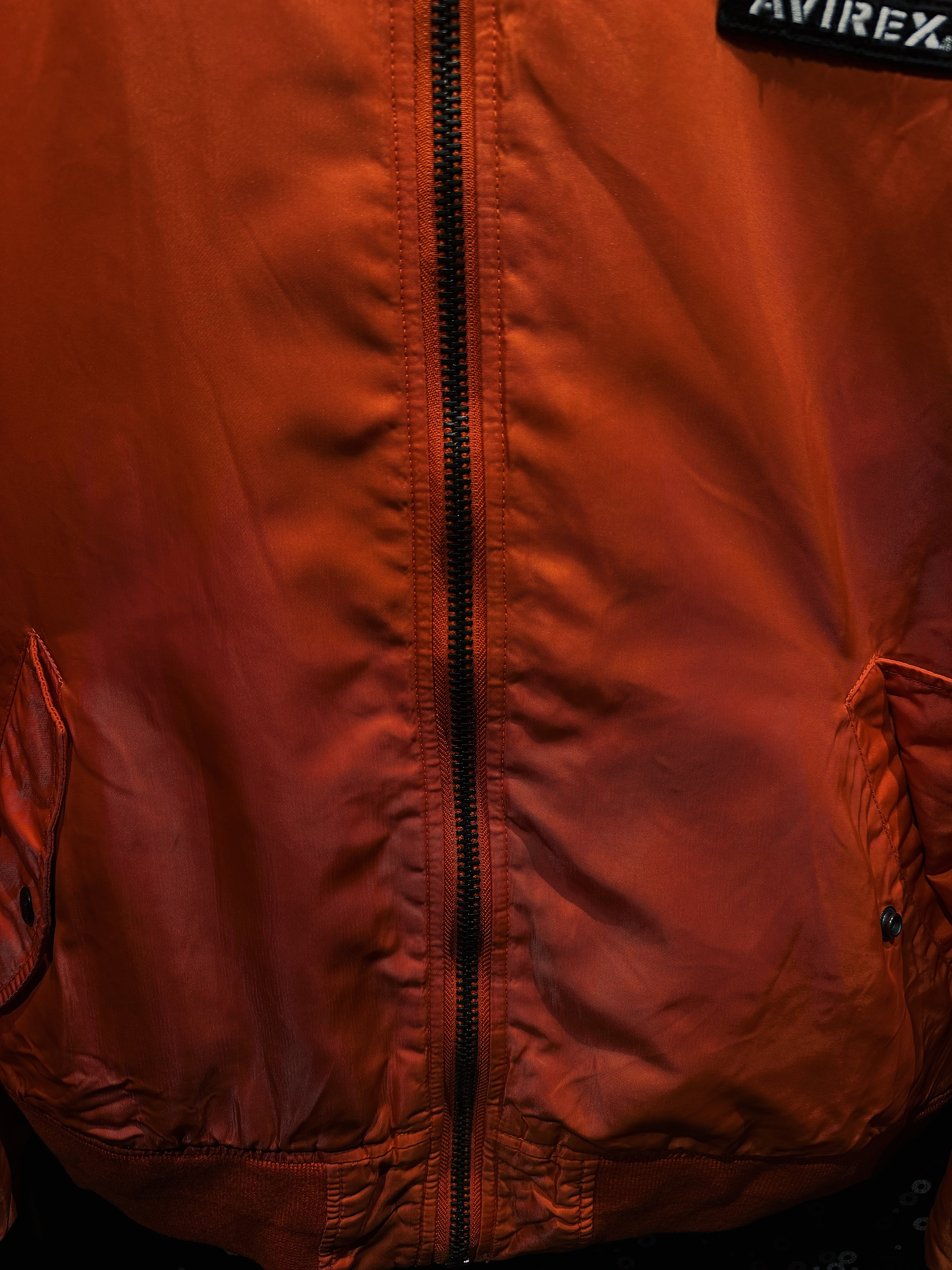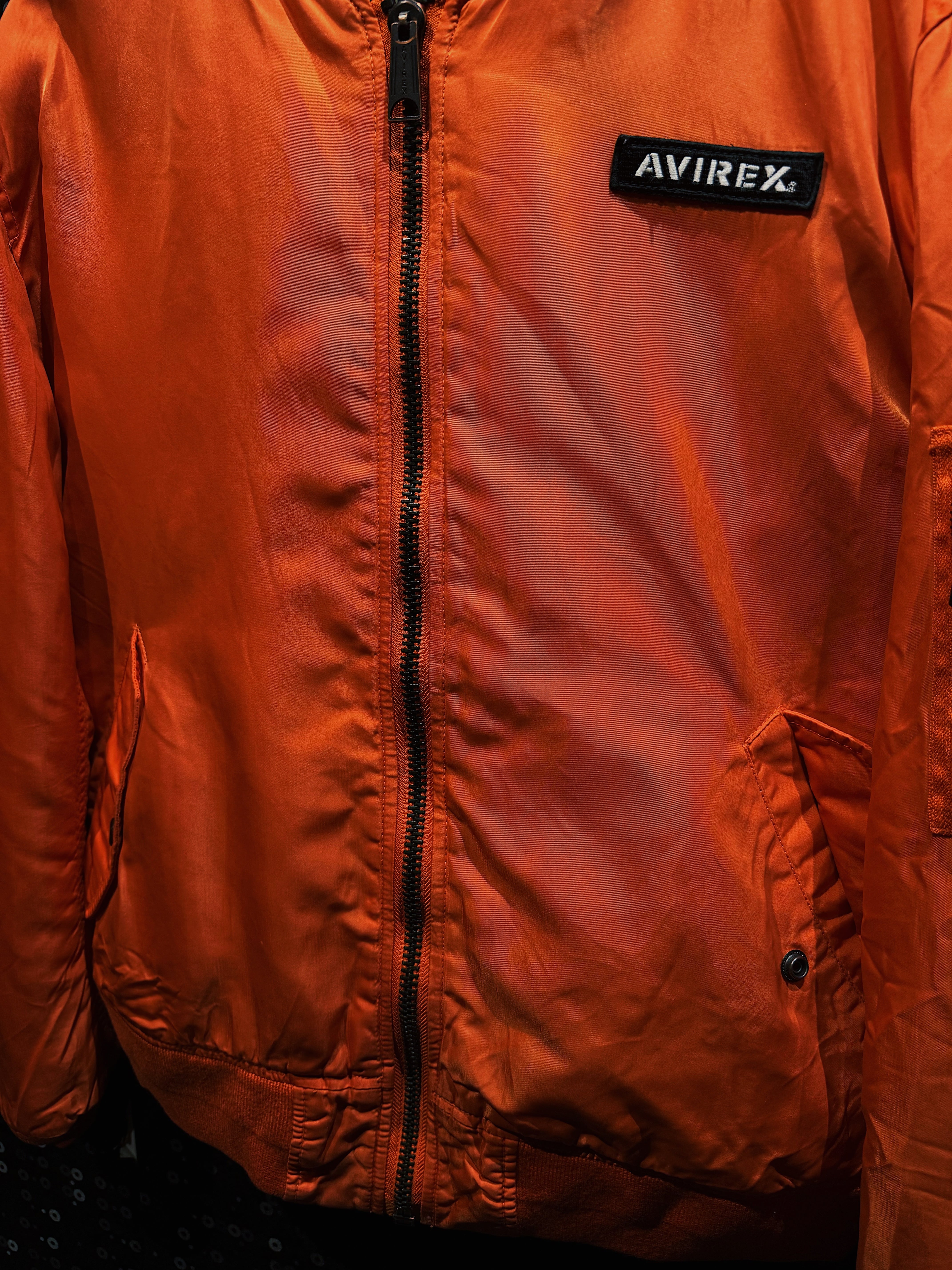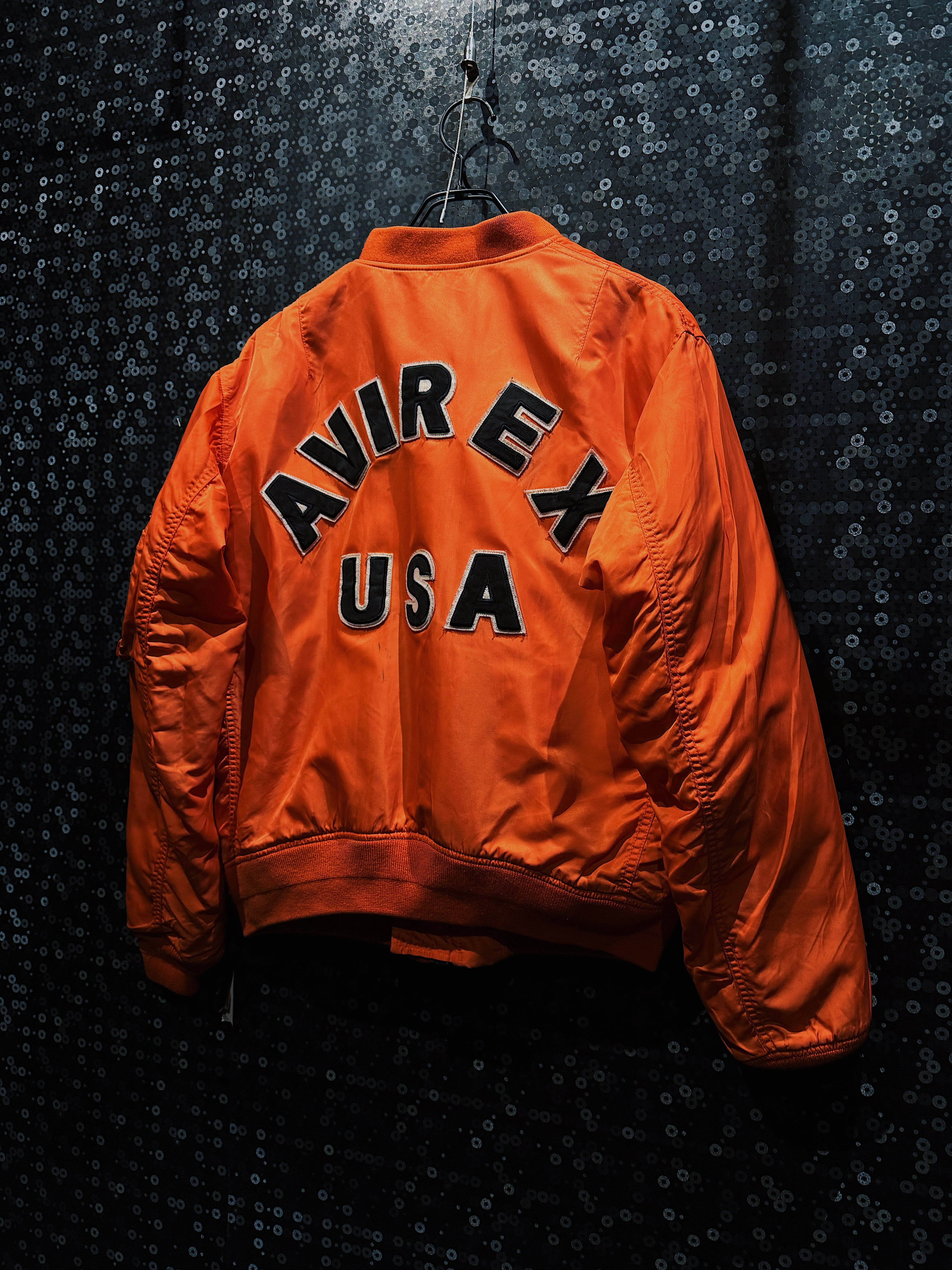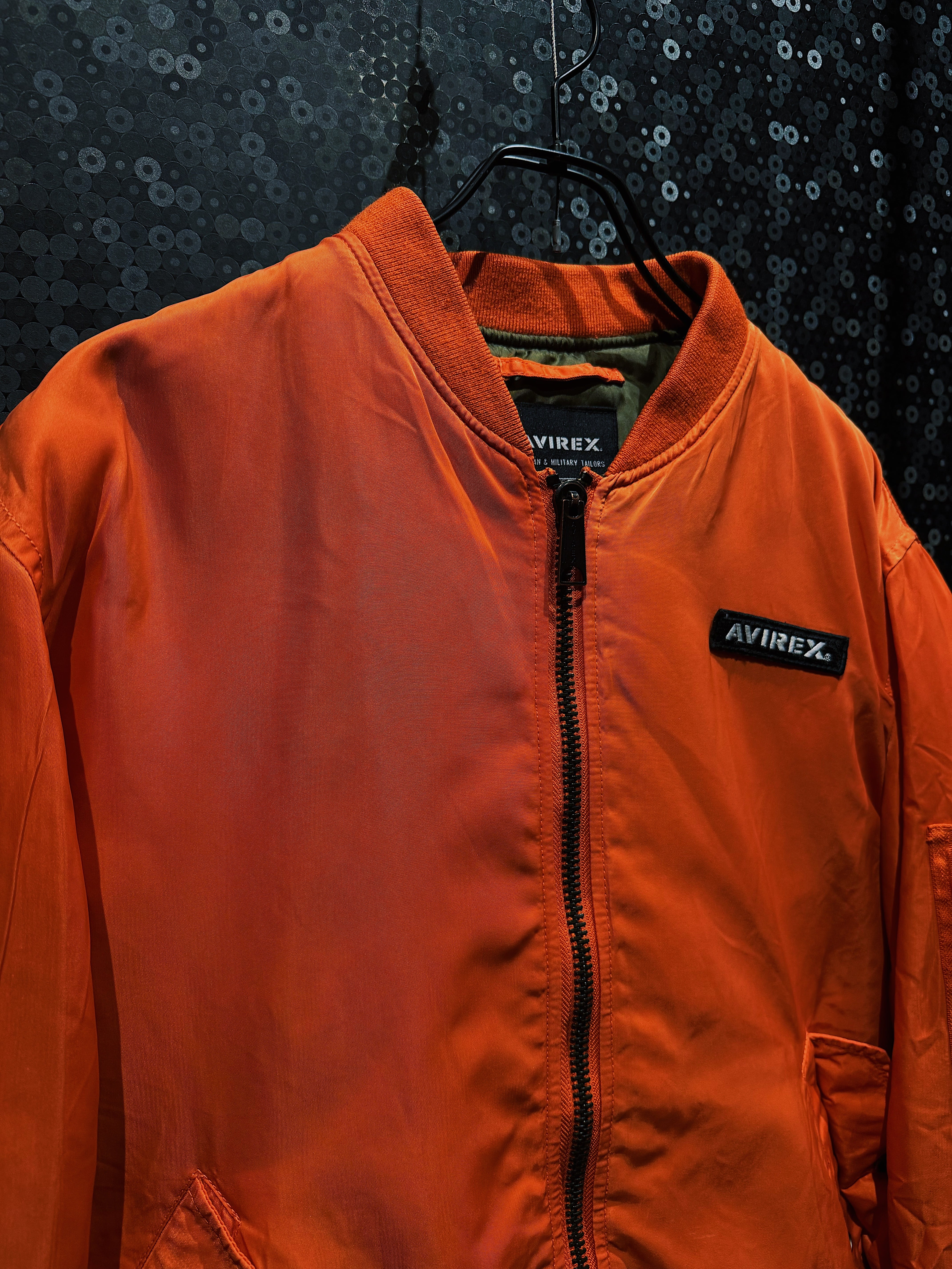 鮮烈なレスキューオレンジが一目で視線を掴む、AVIREXのヴィンテージMA-1フライトジャケット。フロントは比較的ミニマルな構成ながら、バックに大胆に配置された「AVIREX USA」のアーチロゴ刺繍が、この一着のキャラクターを決定づけている。
