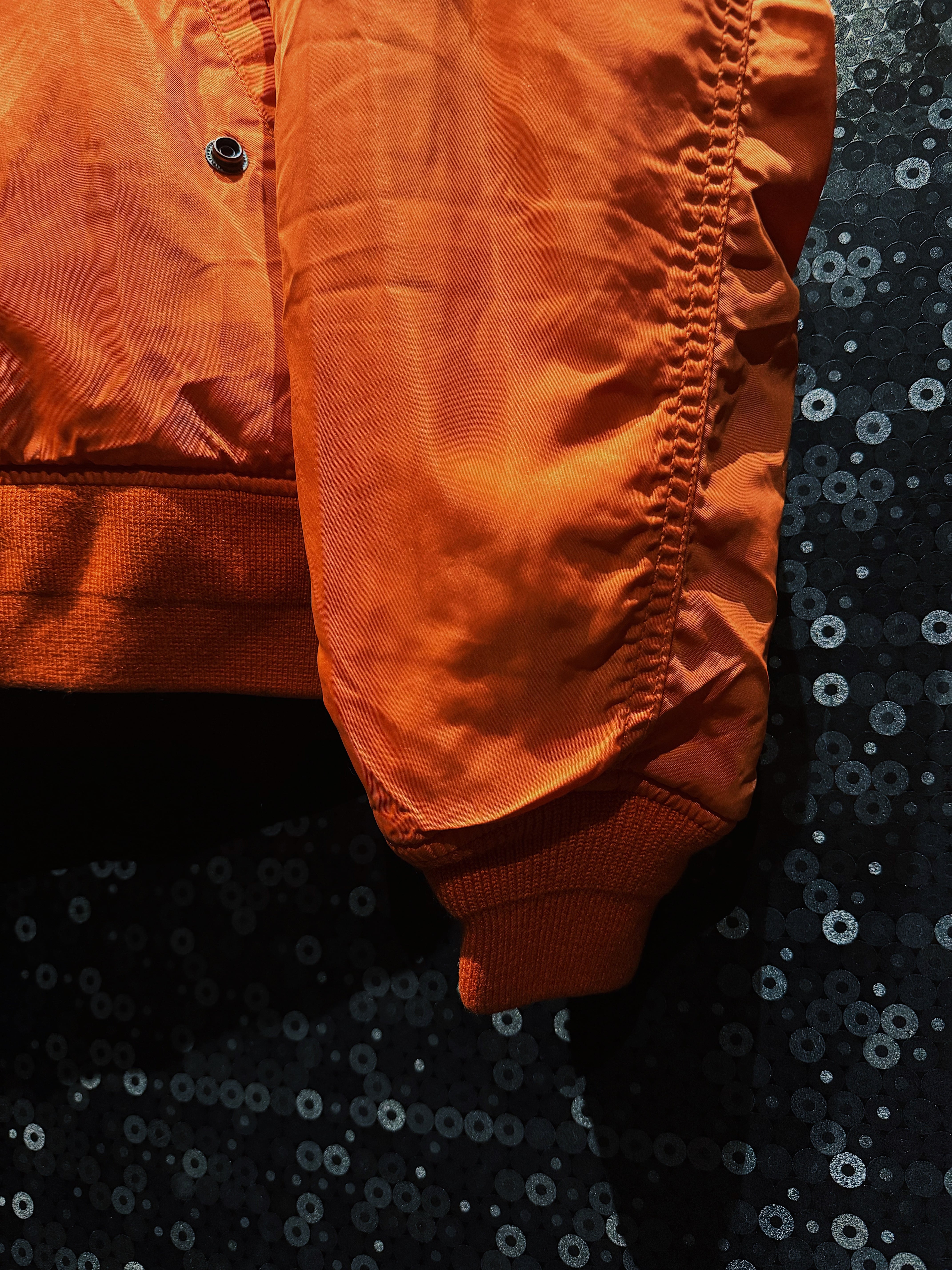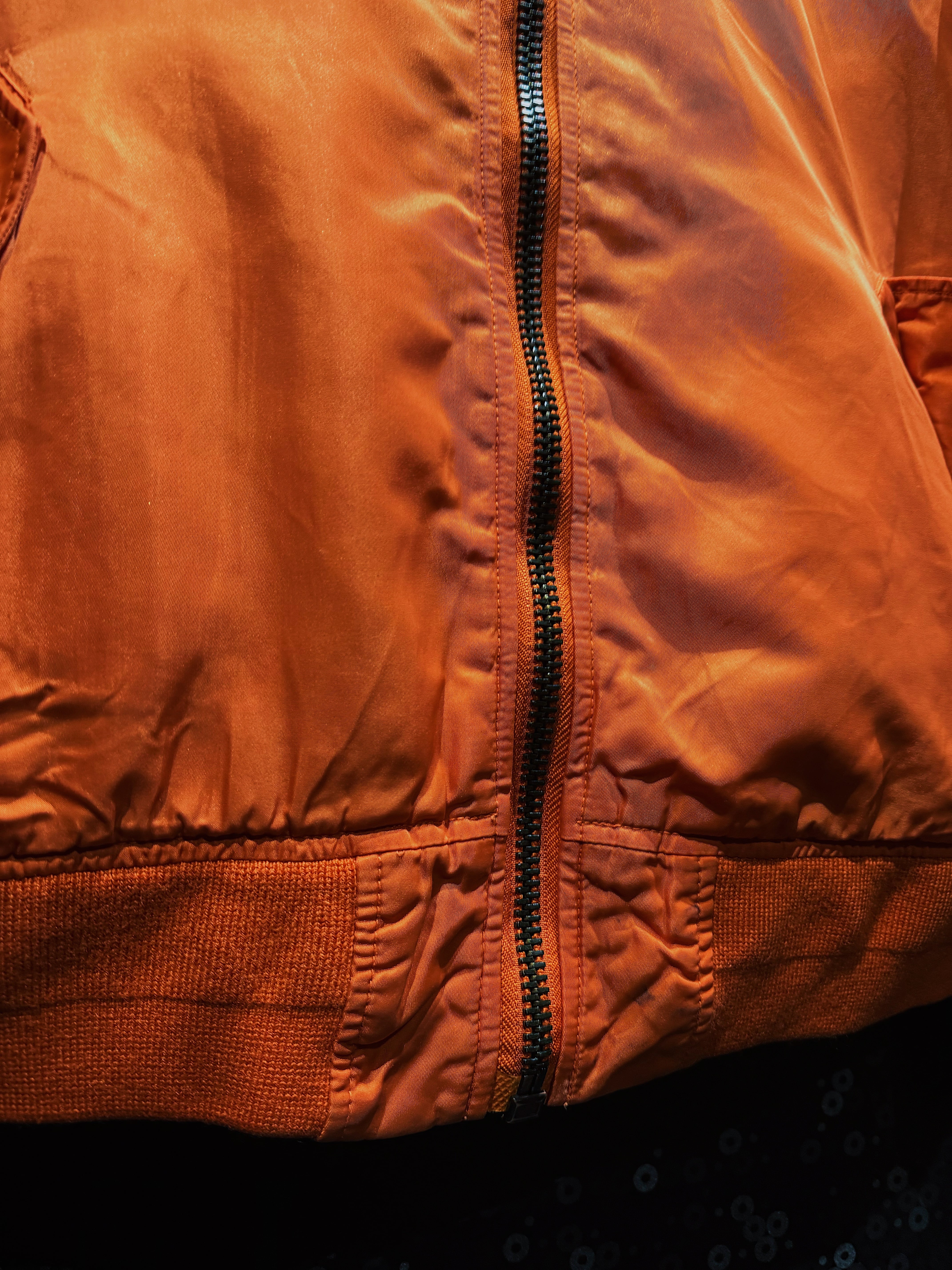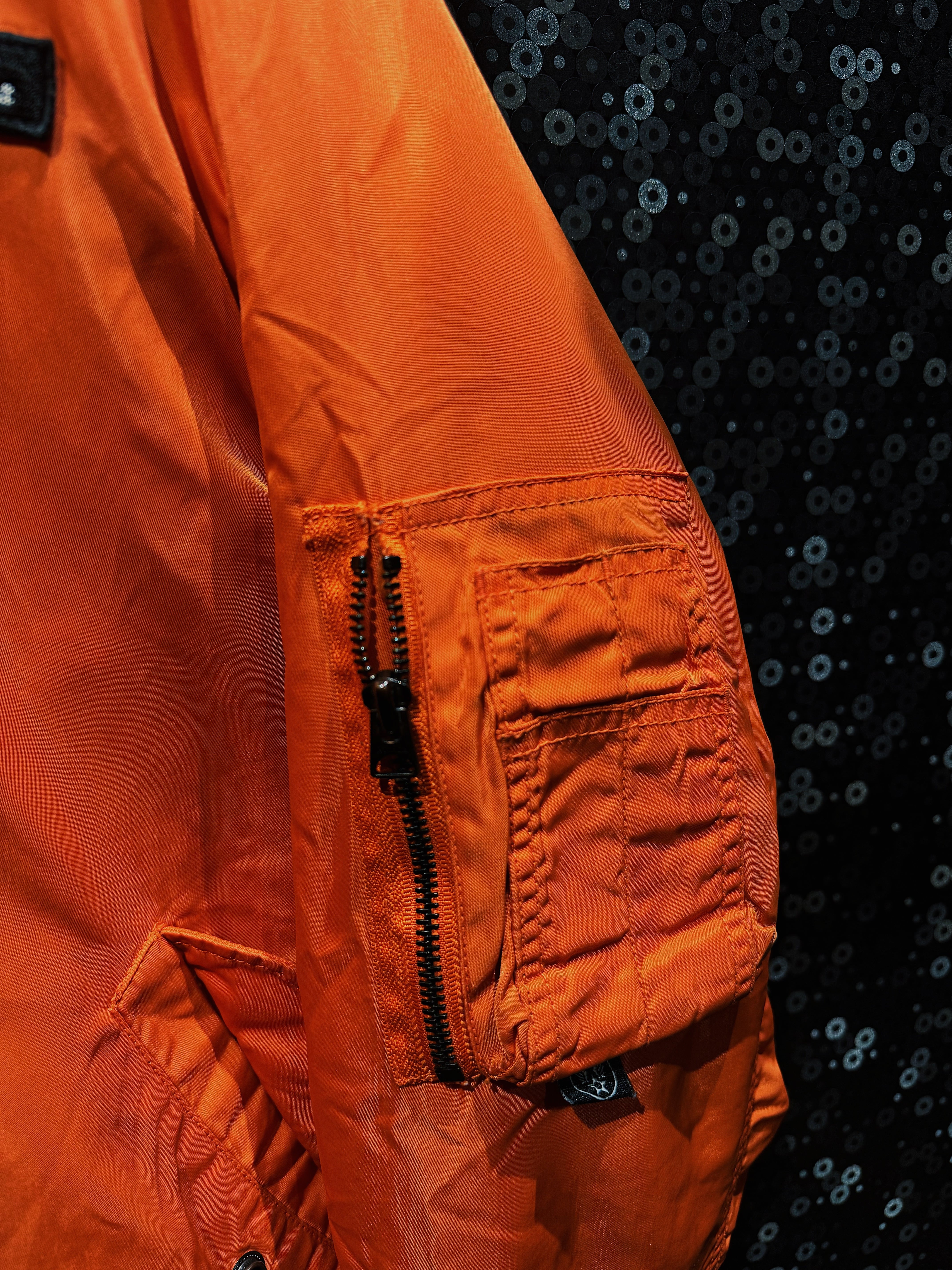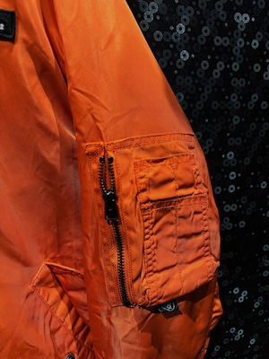 フロントのMA-1特有のユーティリティポケット、袖のシガレットポケットも健在で、機能美としての完成度は高い。一方で、経年によるナイロンのフェードやシワ感が加わることで、いわゆる“新品のフライトジャケット”には出せない空気感を獲得している。