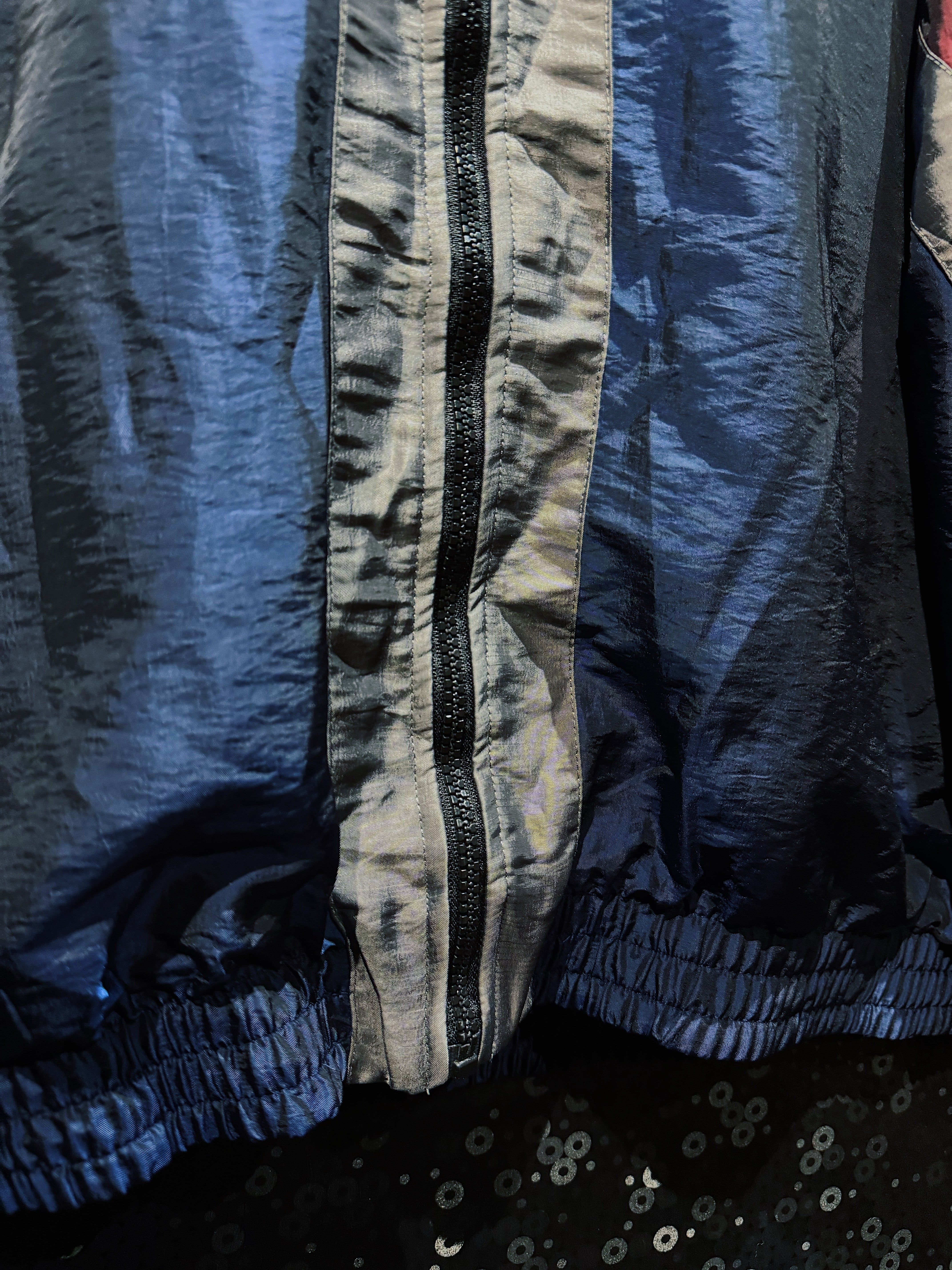 フロント中央に配置されたグレーパネルが全体の配色を引き締め、左右対称の切替ラインが当時らしいダイナミックなシルエットを強調。リブ仕様のネックと裾が丸みのあるボリューム感を生み、インナー次第でストリートにもテック寄りにも振れる懐の深さを持つ一着。