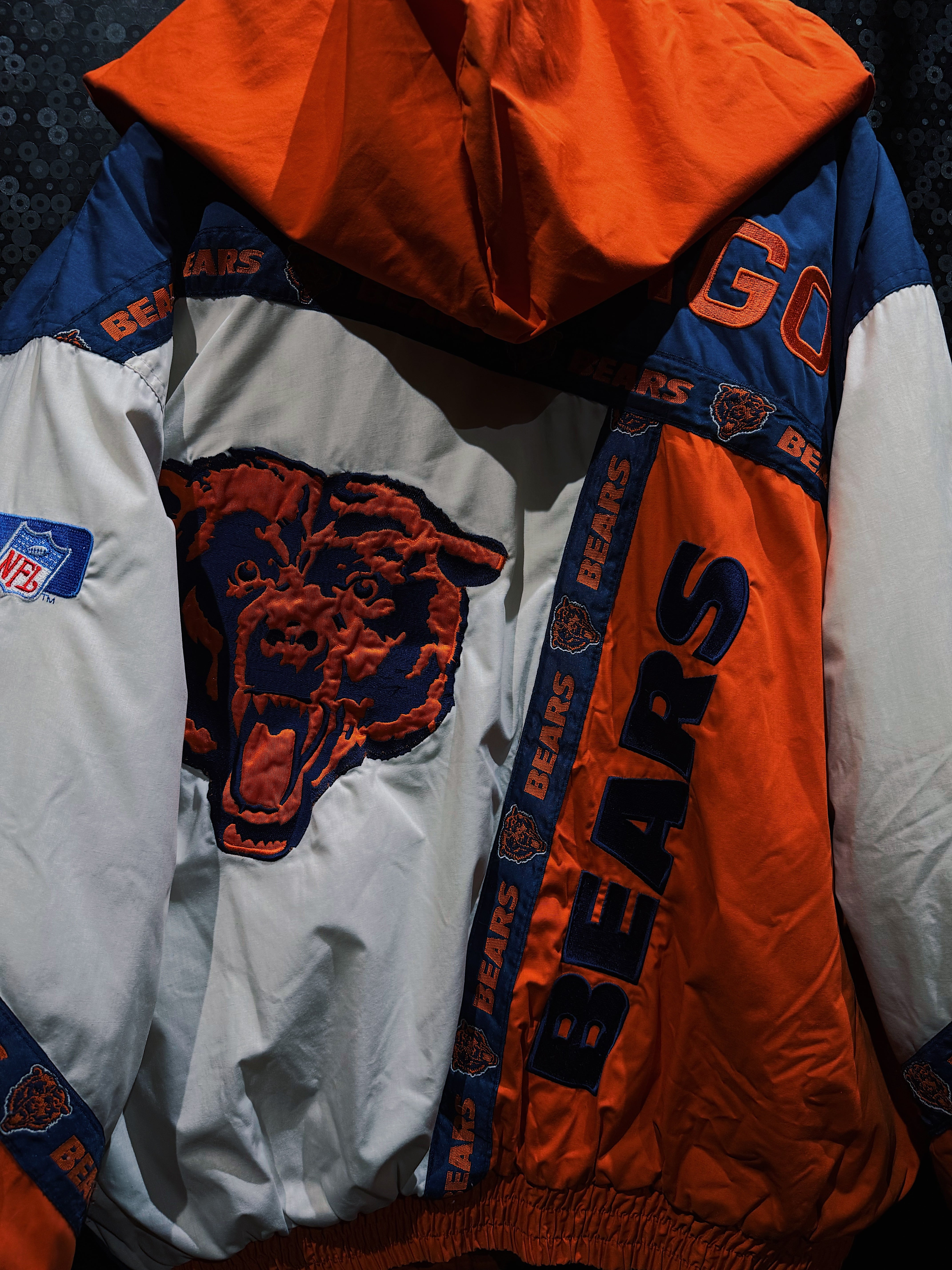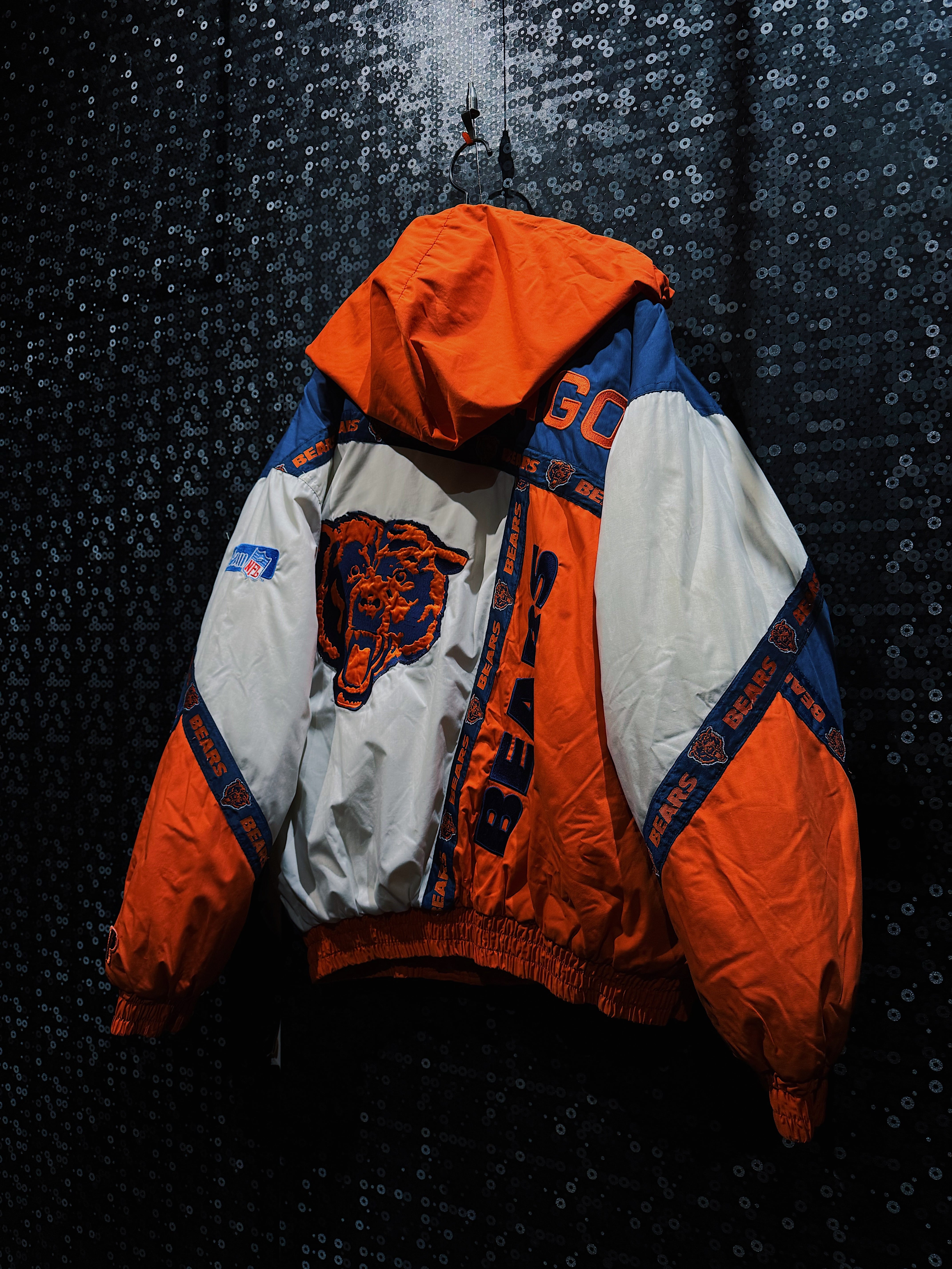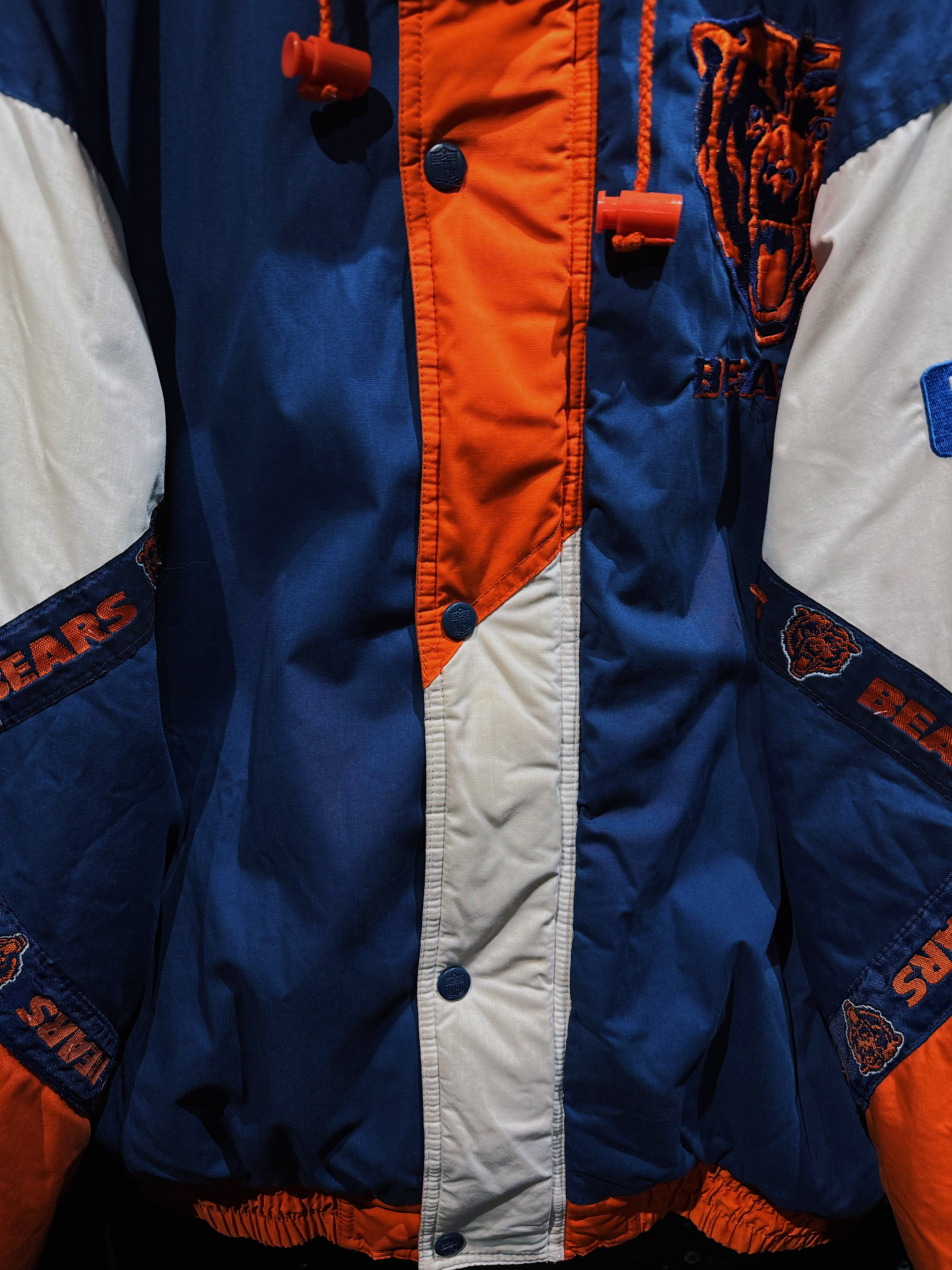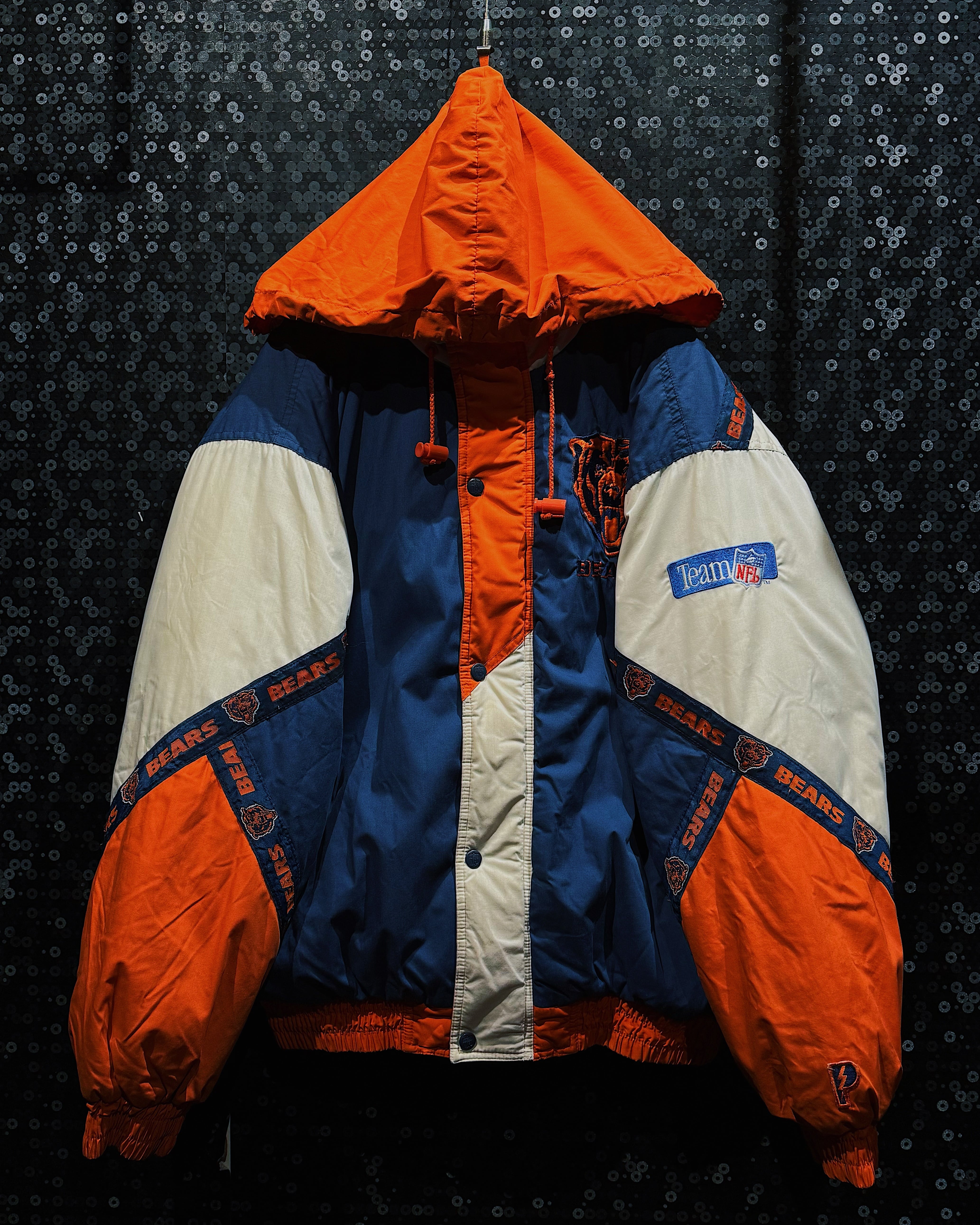 90s NFLオフィシャルアイテムを数多く手がけた PRO PLAYER による、シカゴ・ベアーズのヴィンテージフーデッドパディングジャケット。ネイビー、オレンジ、ホワイトを大胆に切り替えたカラーリングは、Chicago Bears を象徴する王道配色でありながら、現代の視点で見ても過剰なほどの主張を持つ一着。