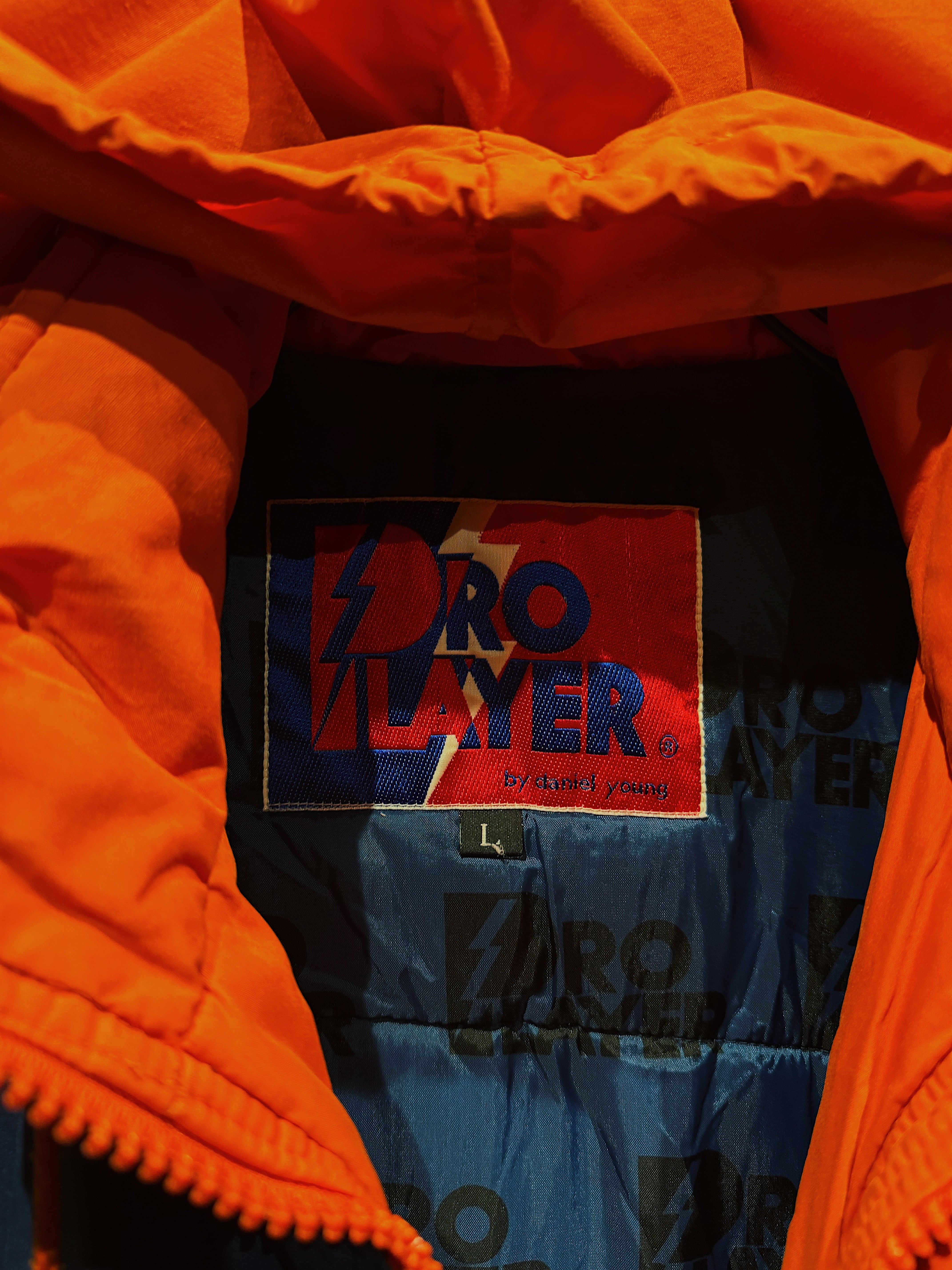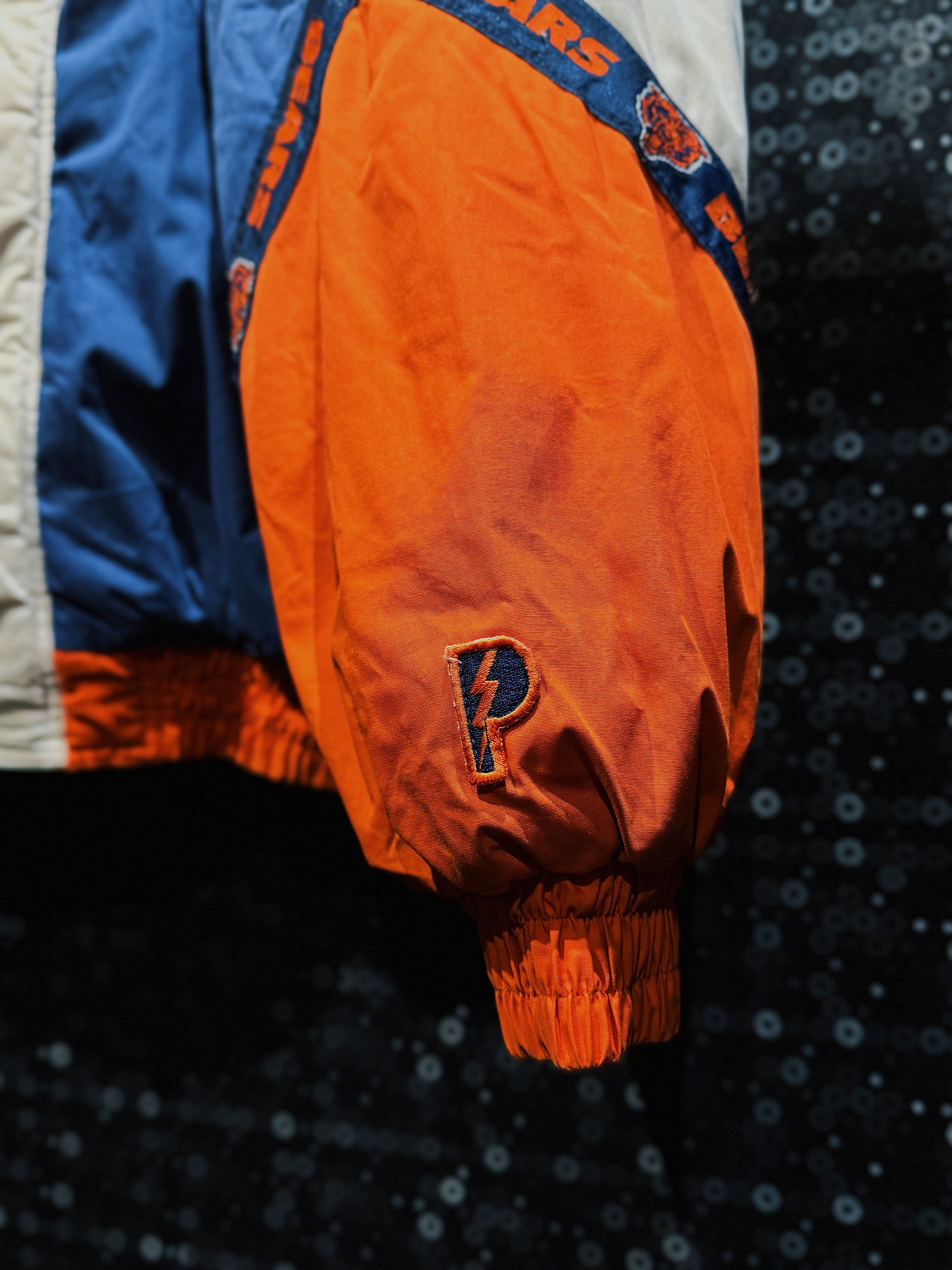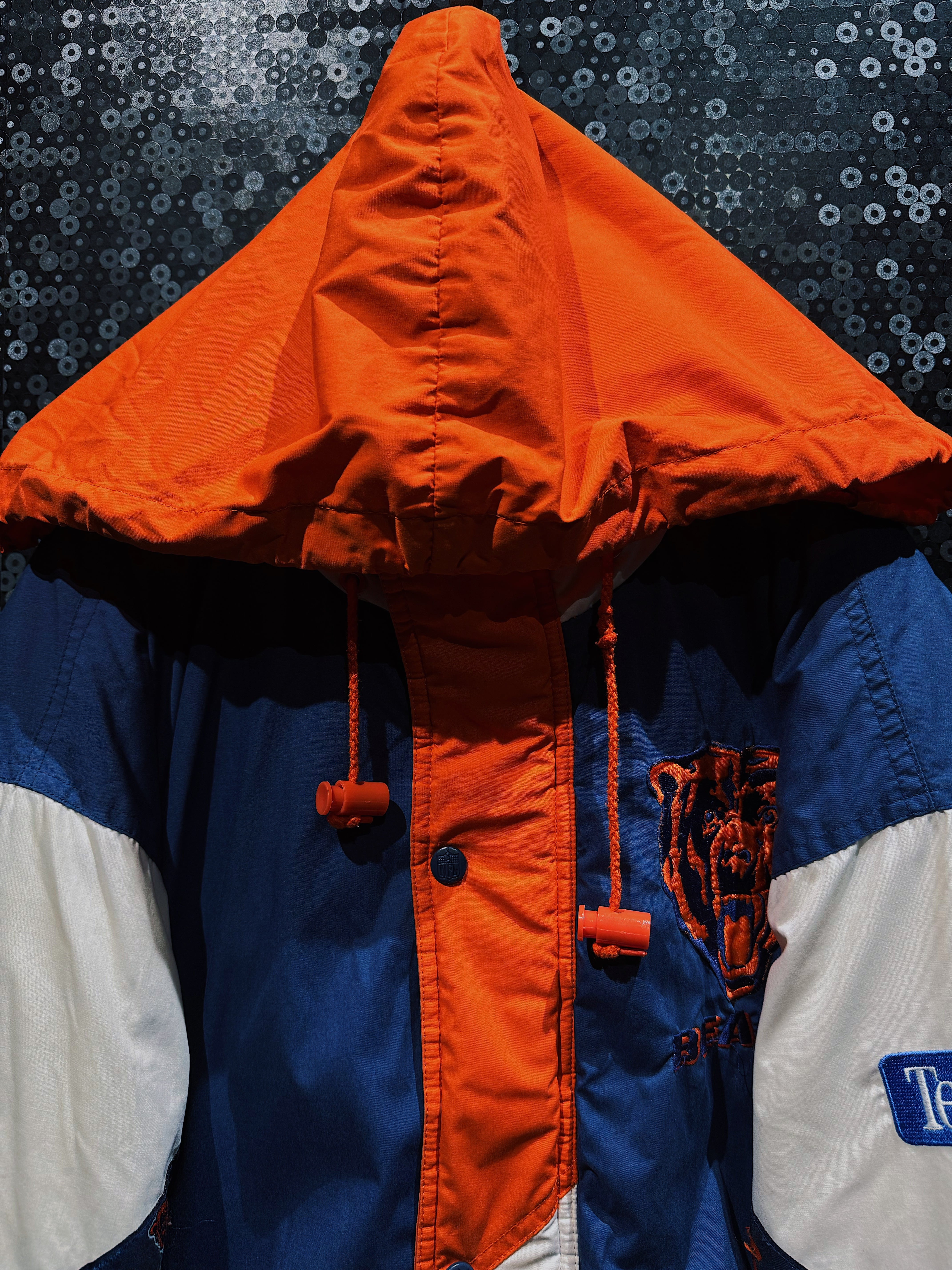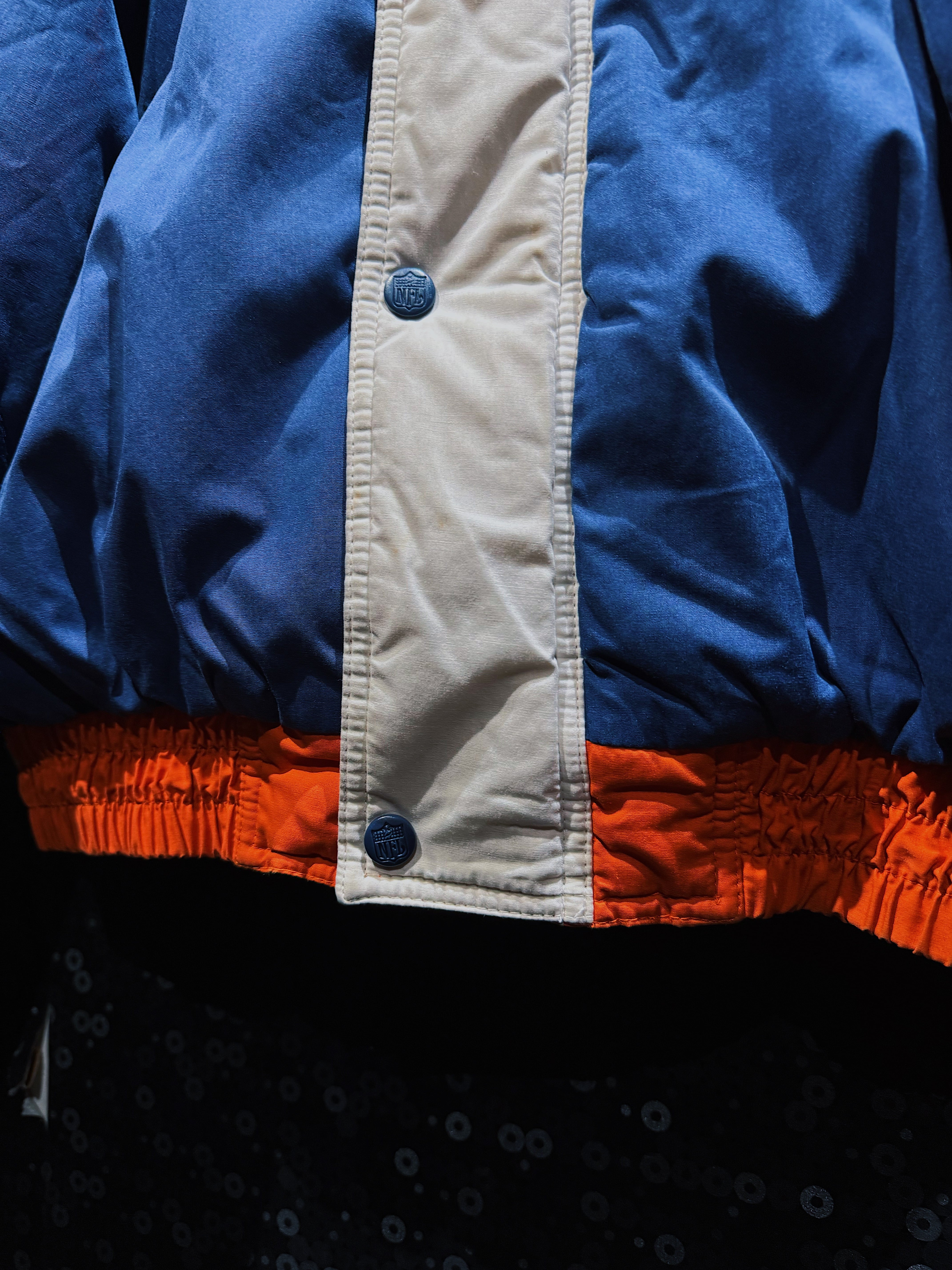 90s NFLオフィシャルアイテムを数多く手がけた PRO PLAYER による、シカゴ・ベアーズのヴィンテージフーデッドパディングジャケット。ネイビー、オレンジ、ホワイトを大胆に切り替えたカラーリングは、Chicago Bears を象徴する王道配色でありながら、現代の視点で見ても過剰なほどの主張を持つ一着。