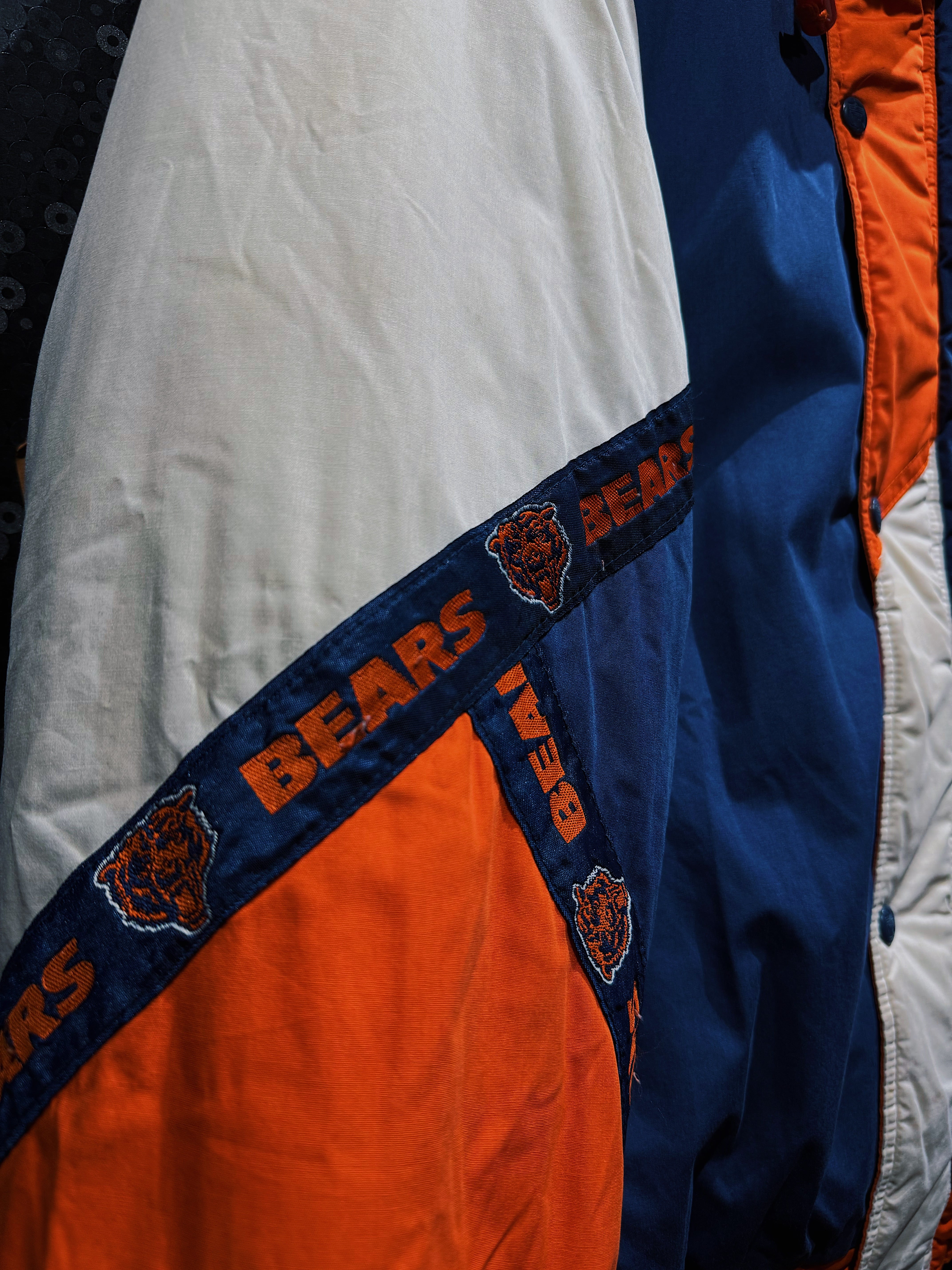 最大の特徴は、アームに斜めに走る「BEARS」ロゴテープと、胸元に配されたベアーヘッド刺繍。さらに袖にはTeam NFLパッチを配置し、完全に“当時の公式プロダクト”としての格を感じさせる構成になっている。フロントはスナップボタン仕様で、内側は中綿入り。防寒性もしっかり確保された、実用性とビジュアルを両立したNFLアウター。