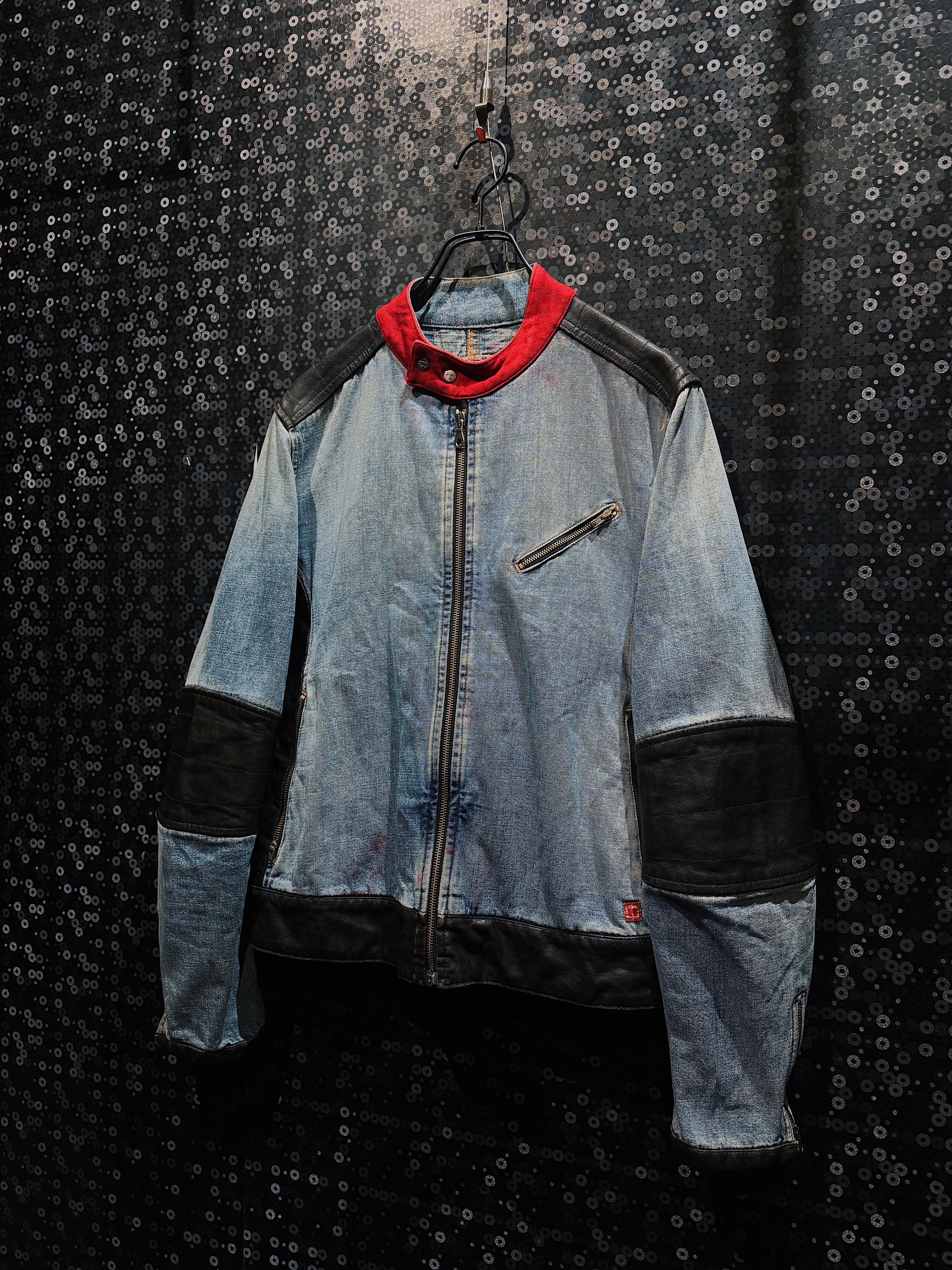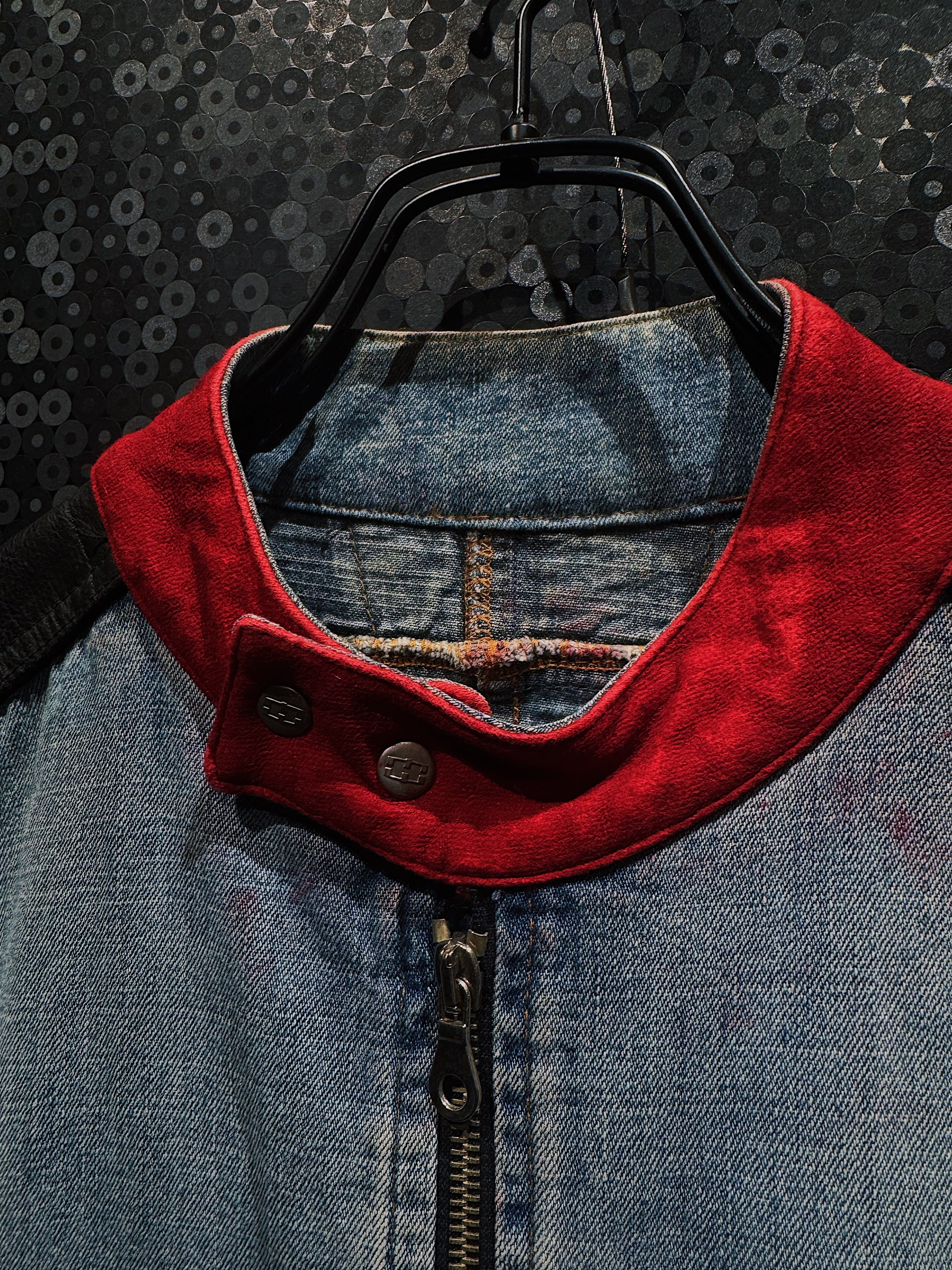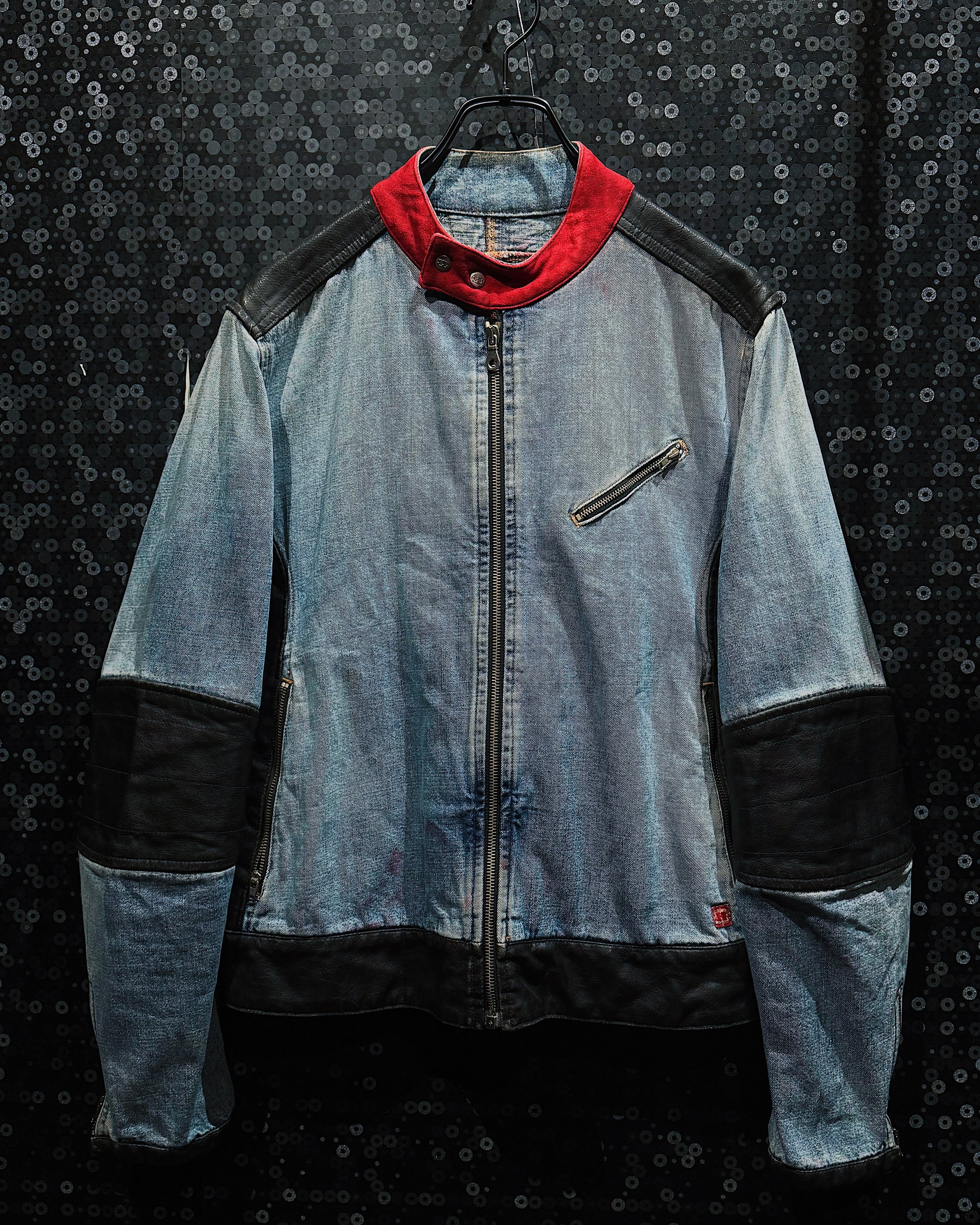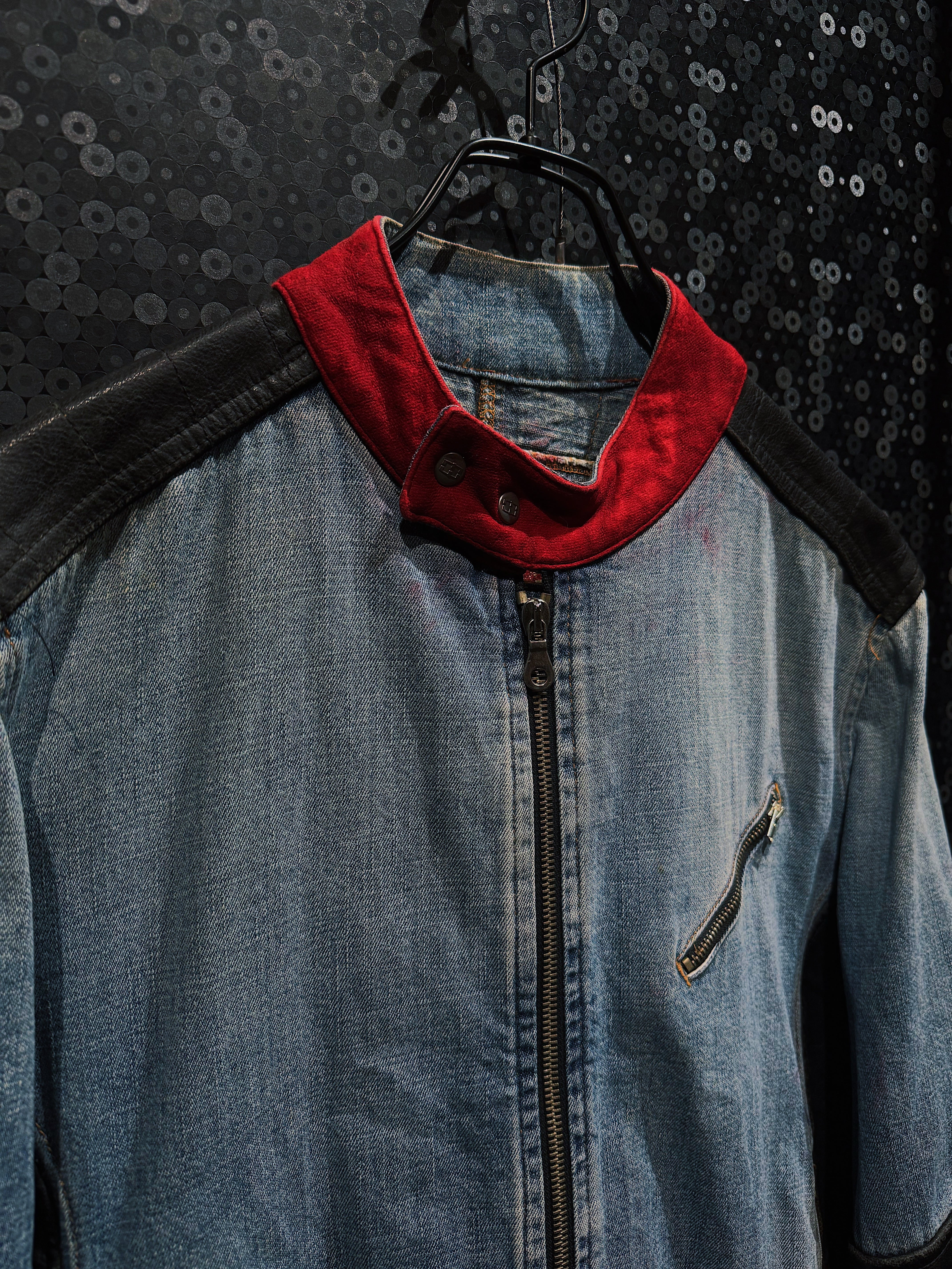 特に目を引くのが、赤のスタンドカラー。フェードしたデニムとブラックレザーの無機質な組み合わせの中で、このレッドが強烈なアクセントとして効いており、MOHAVEらしい90s〜00sストリート×モーターカルチャーの匂いを強く感じさせる。