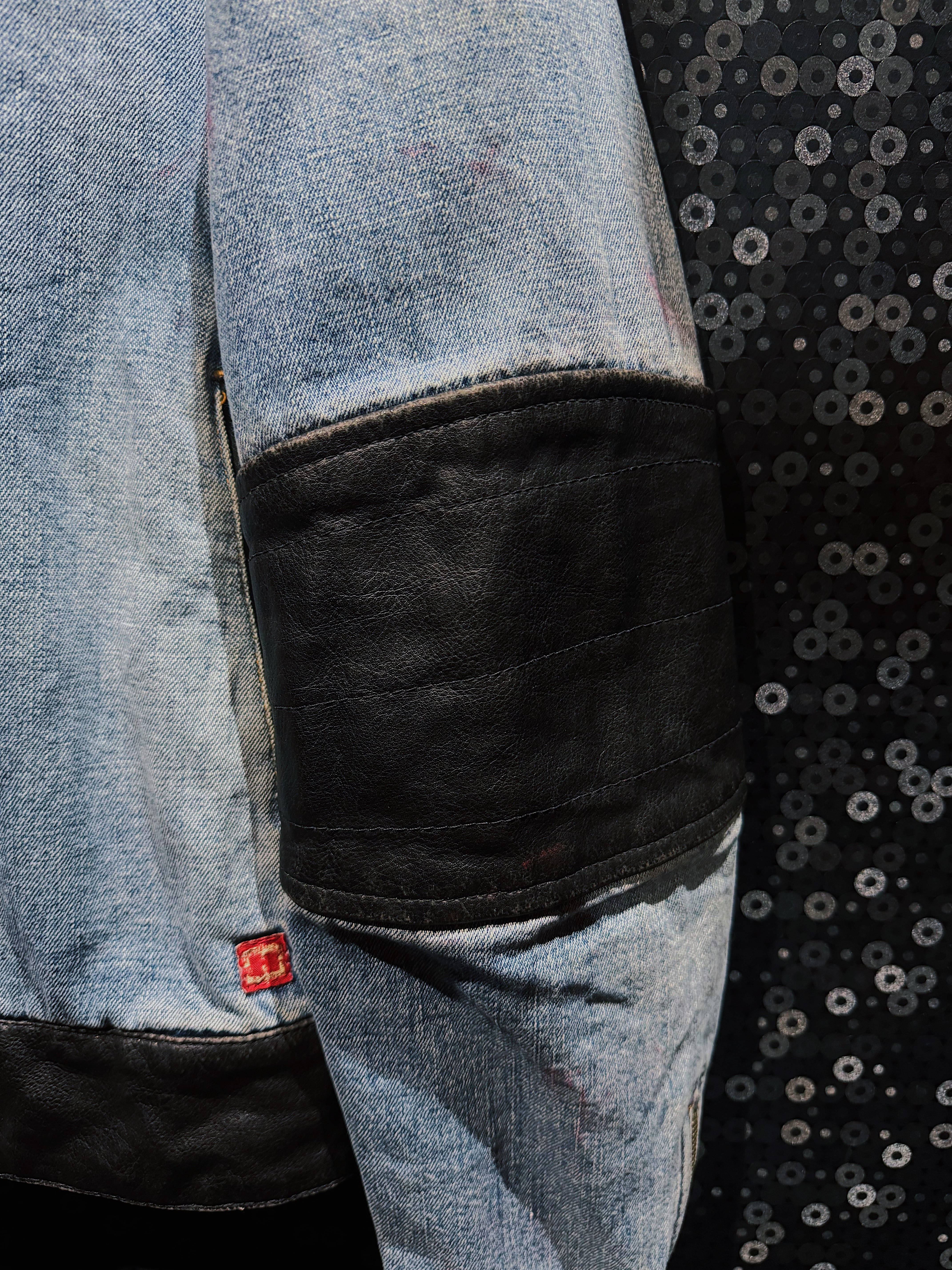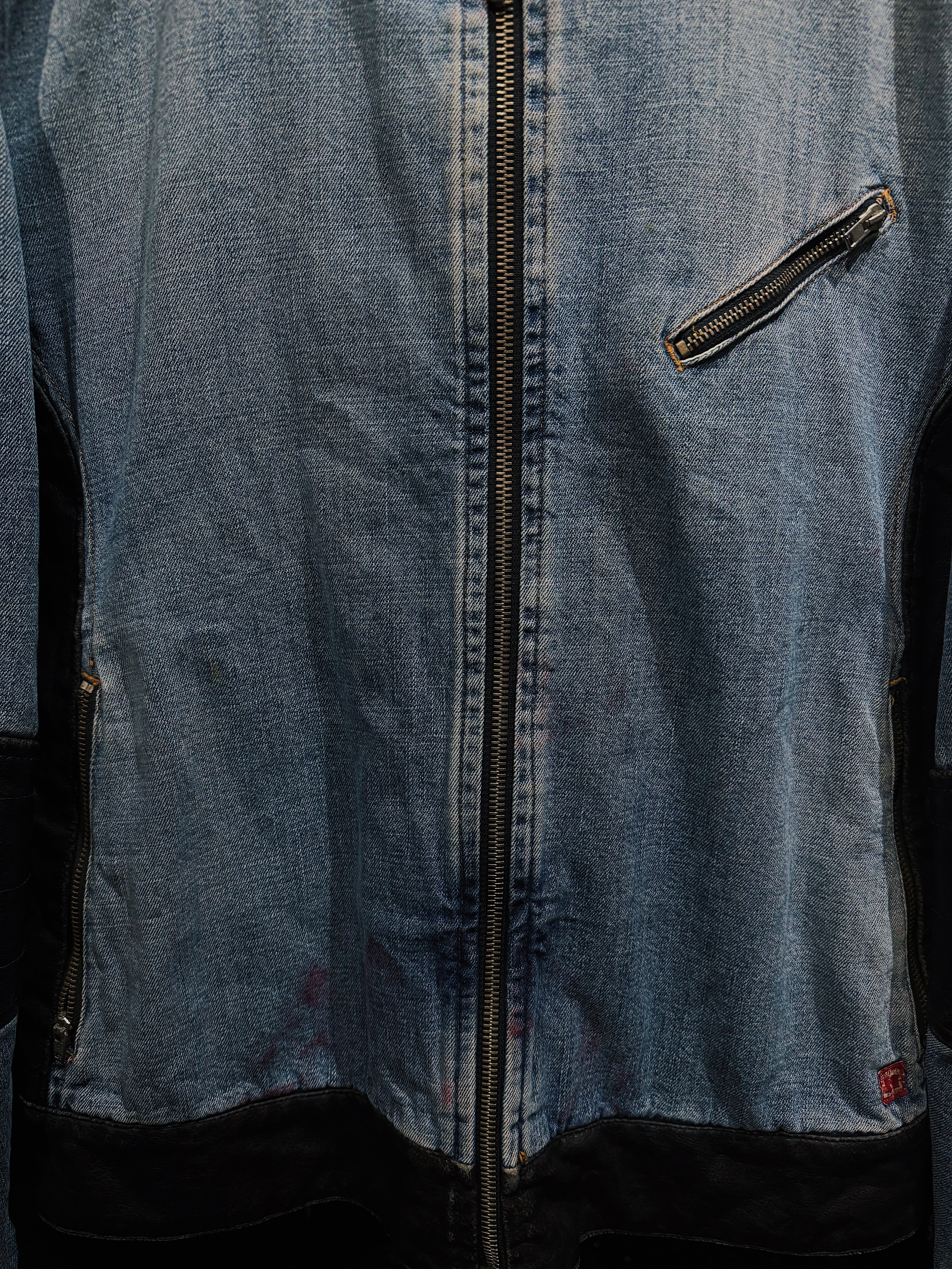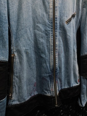 全体は色落ちしたライトインディゴデニムを主体としつつ、肩・肘・裾にブラックレザーを配置することで、ワークとライダースの文脈をクロスさせた非常に攻めた構成。