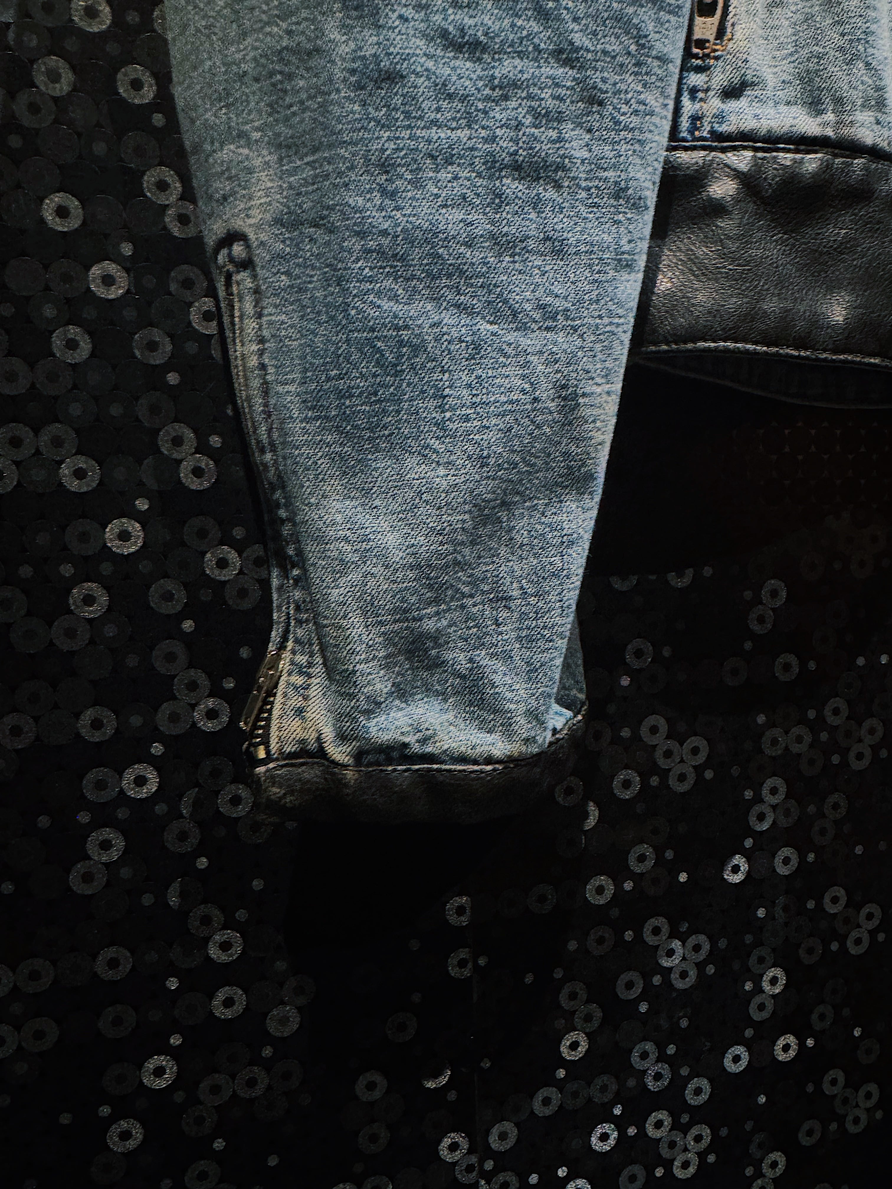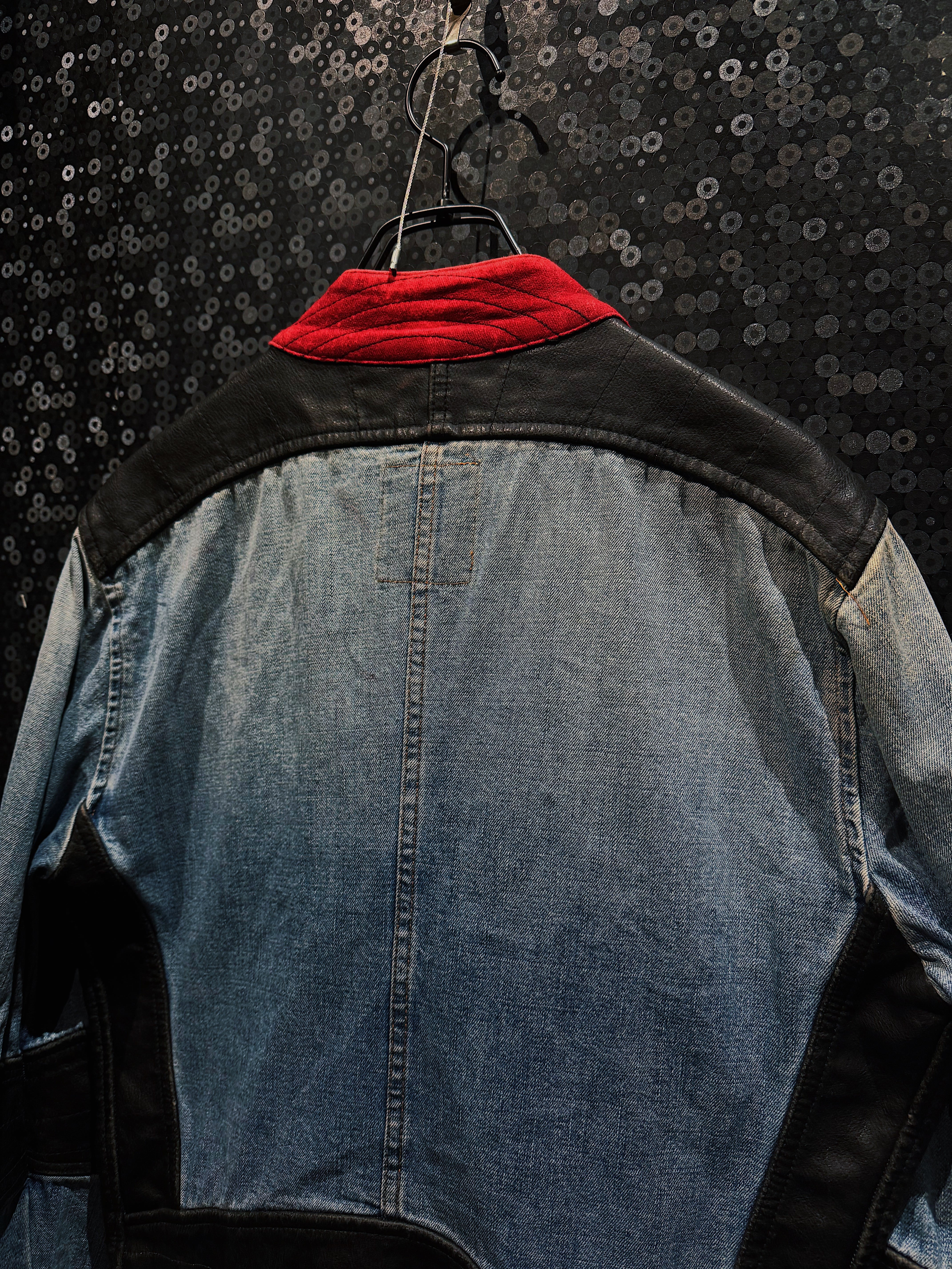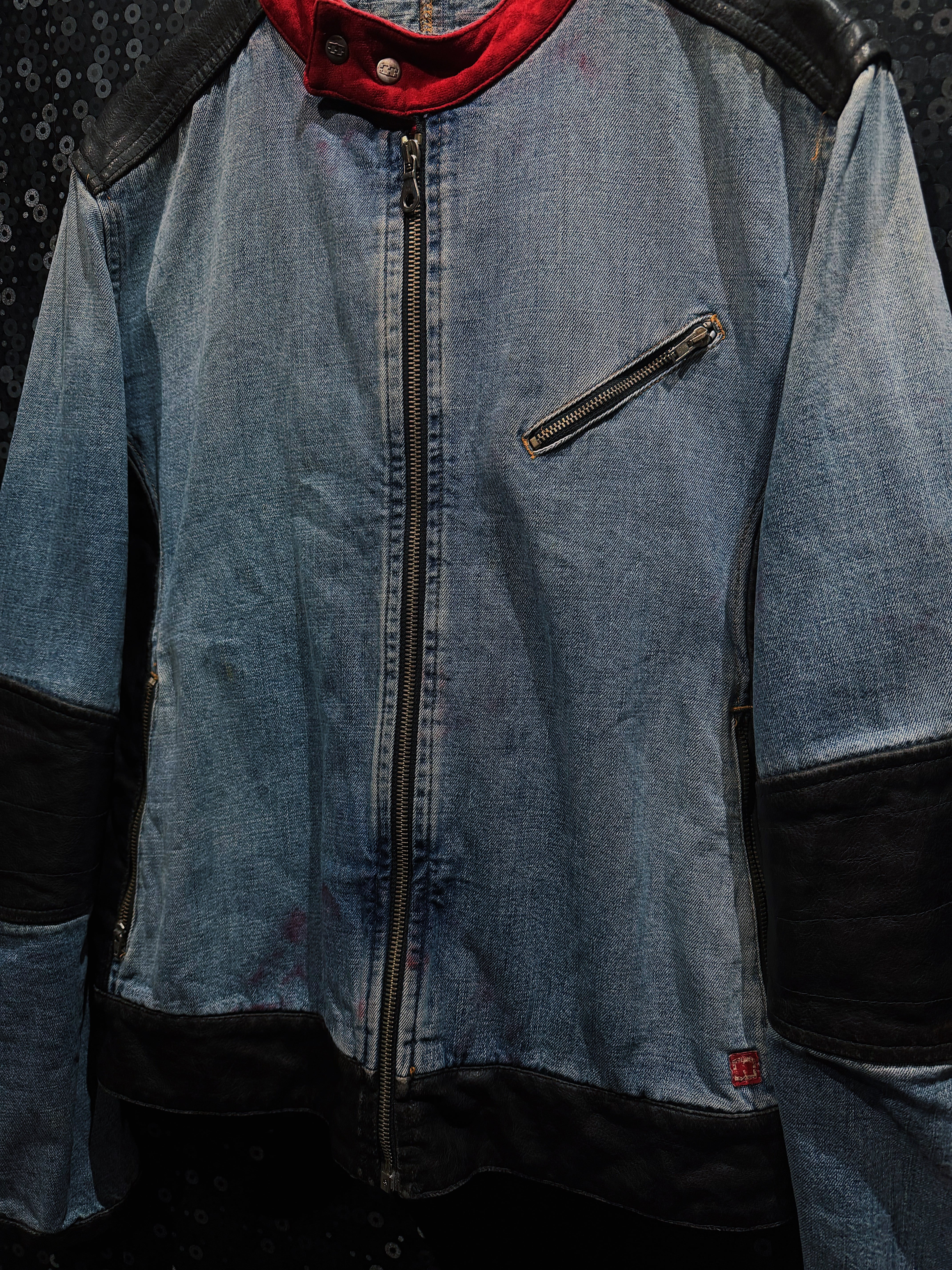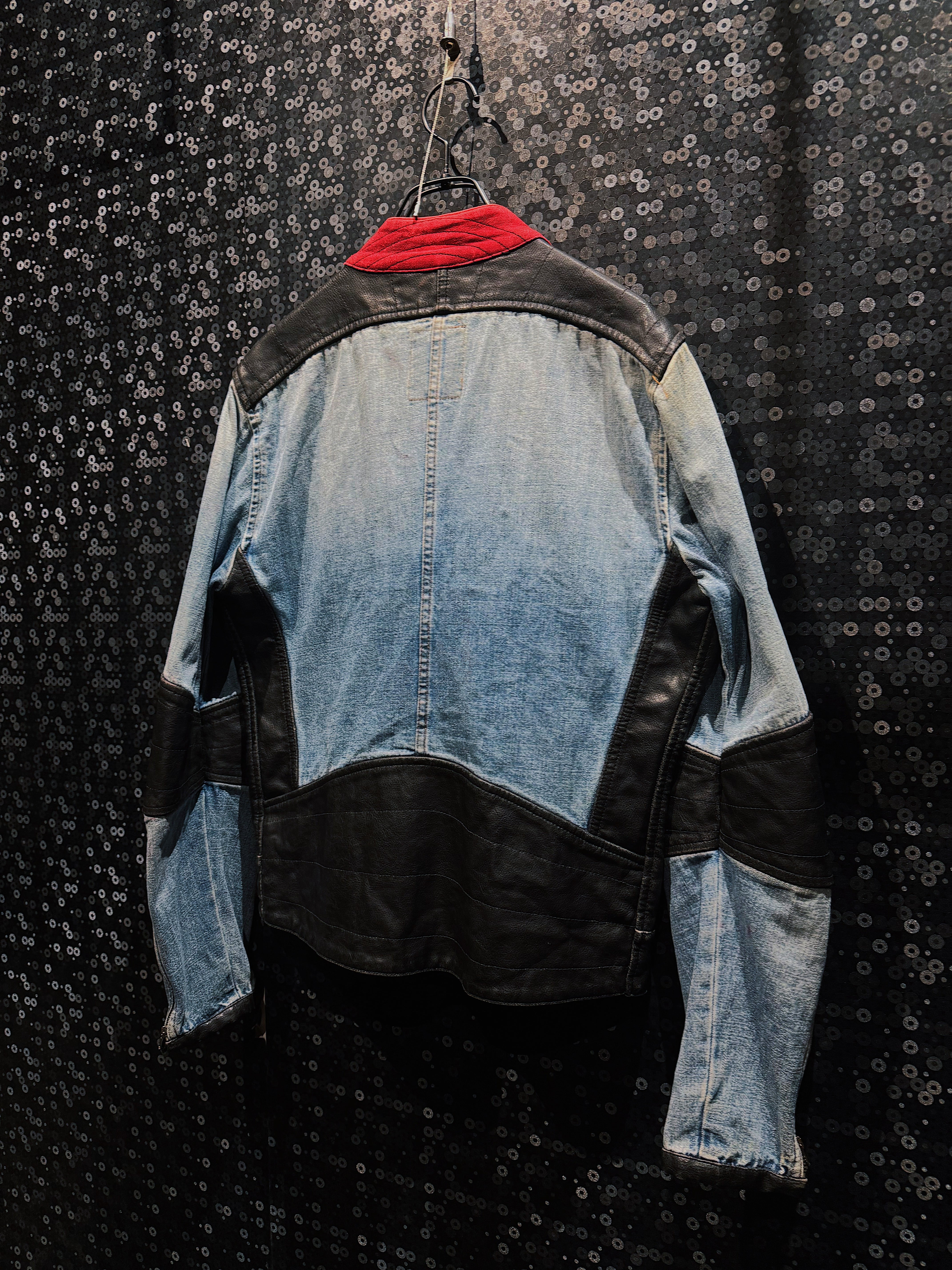 シルエットは細すぎず、無骨すぎないバランス感。フロントの斜めジップポケットや、肘部分のレザーパネルは完全にライダースの思想で、着用時の立体感と存在感はかなり強め。デニム特有の経年フェードと、レザーのシボ感が同時に味として成立しているのもヴィンテージならでは。