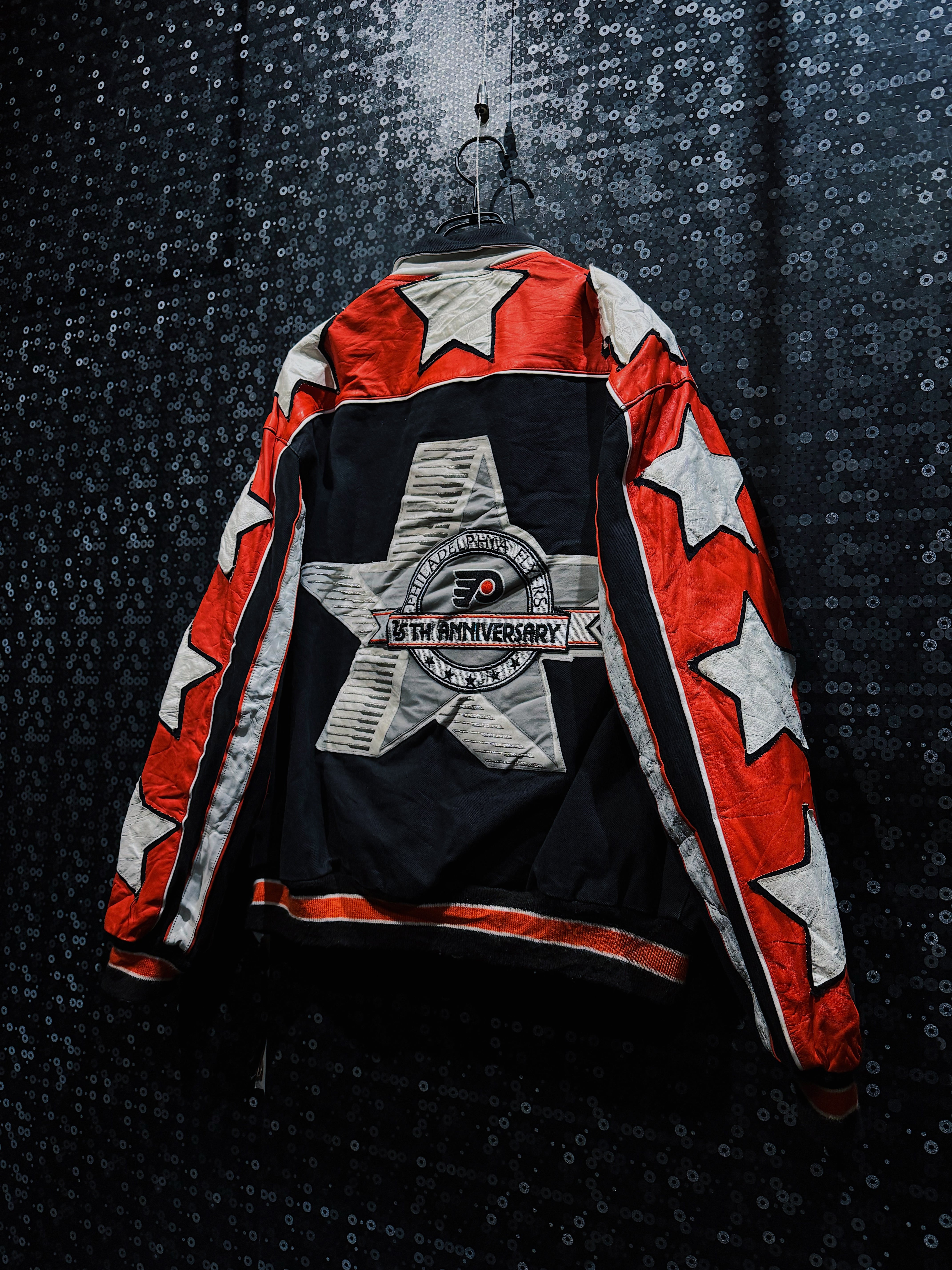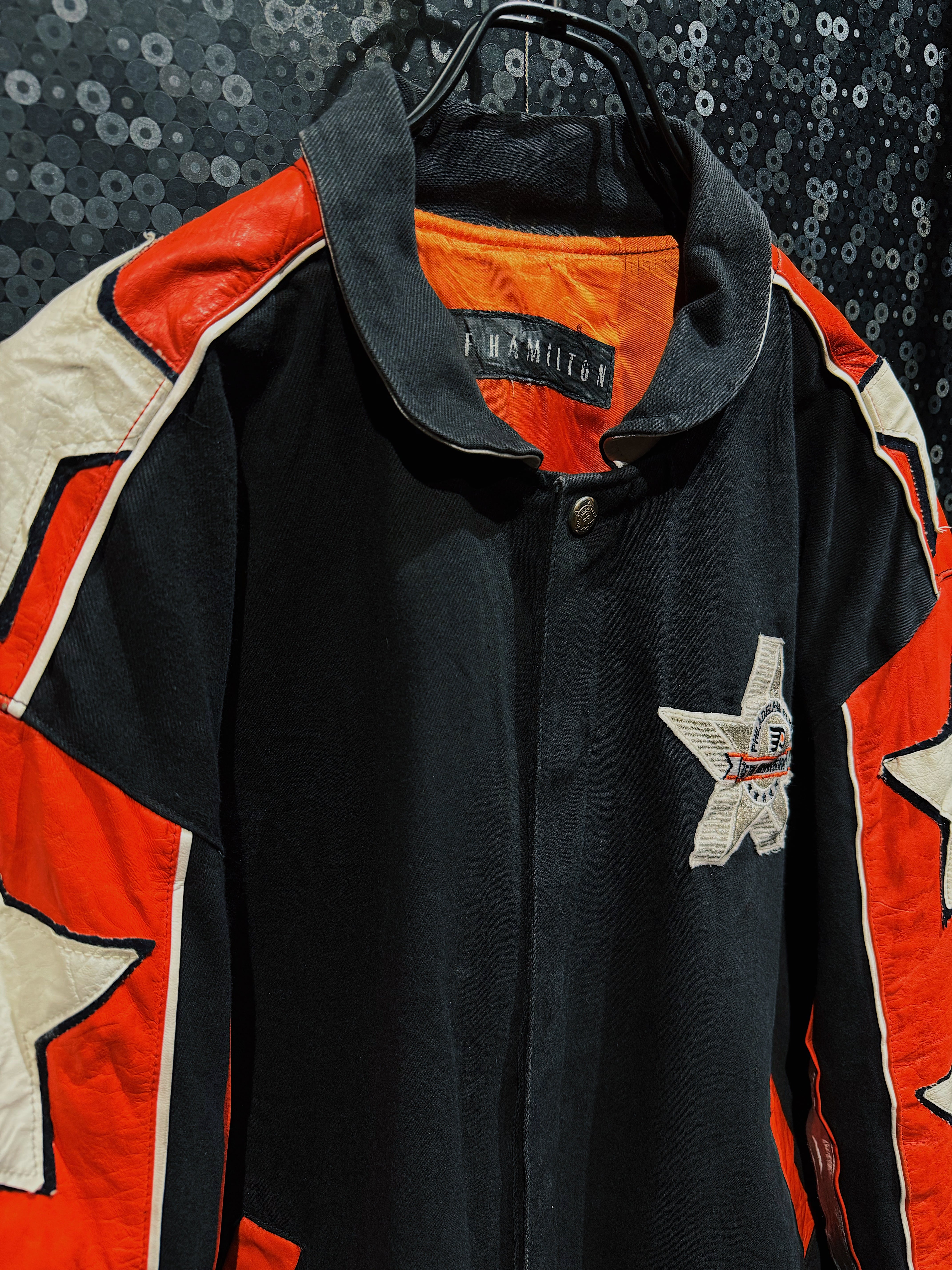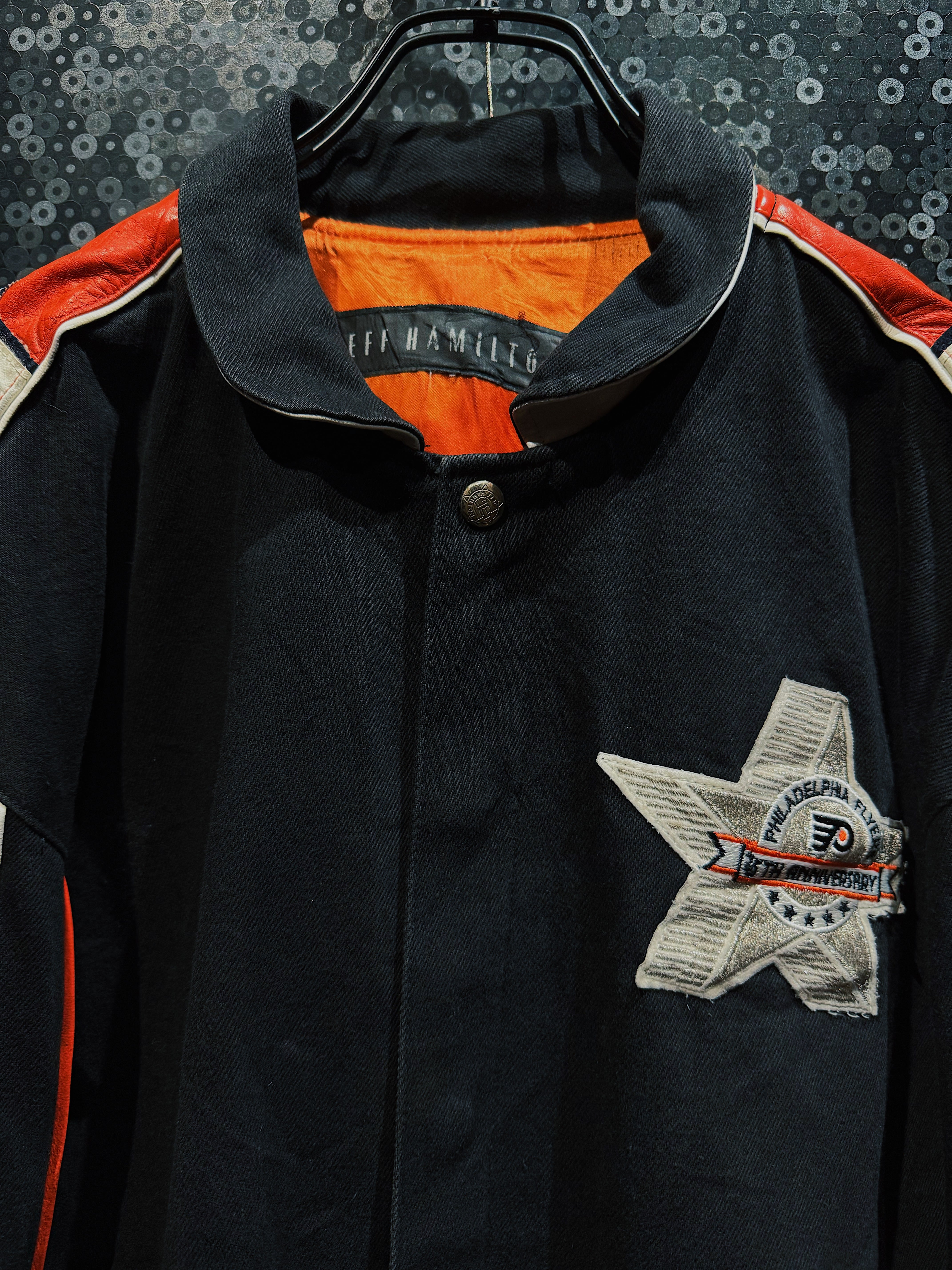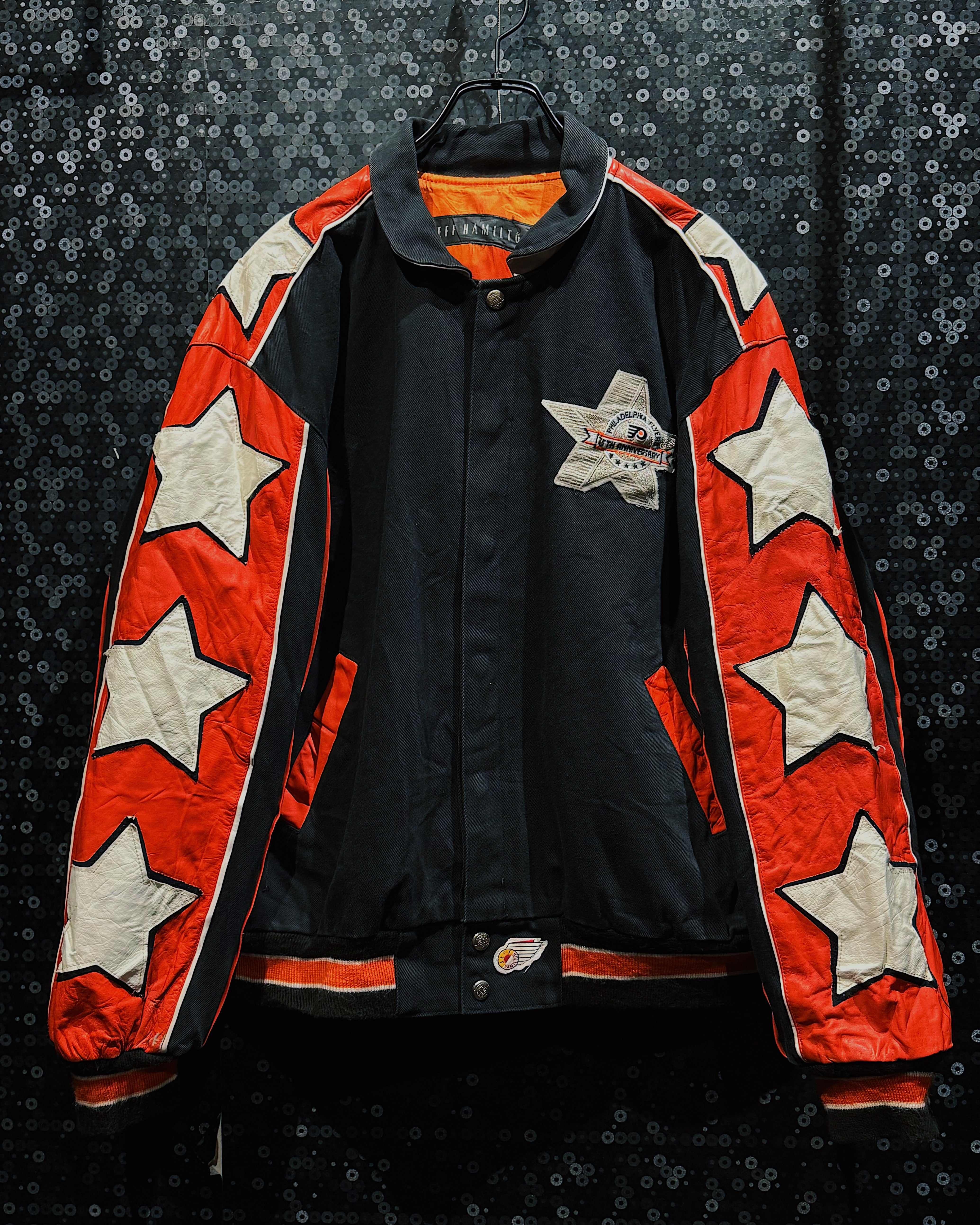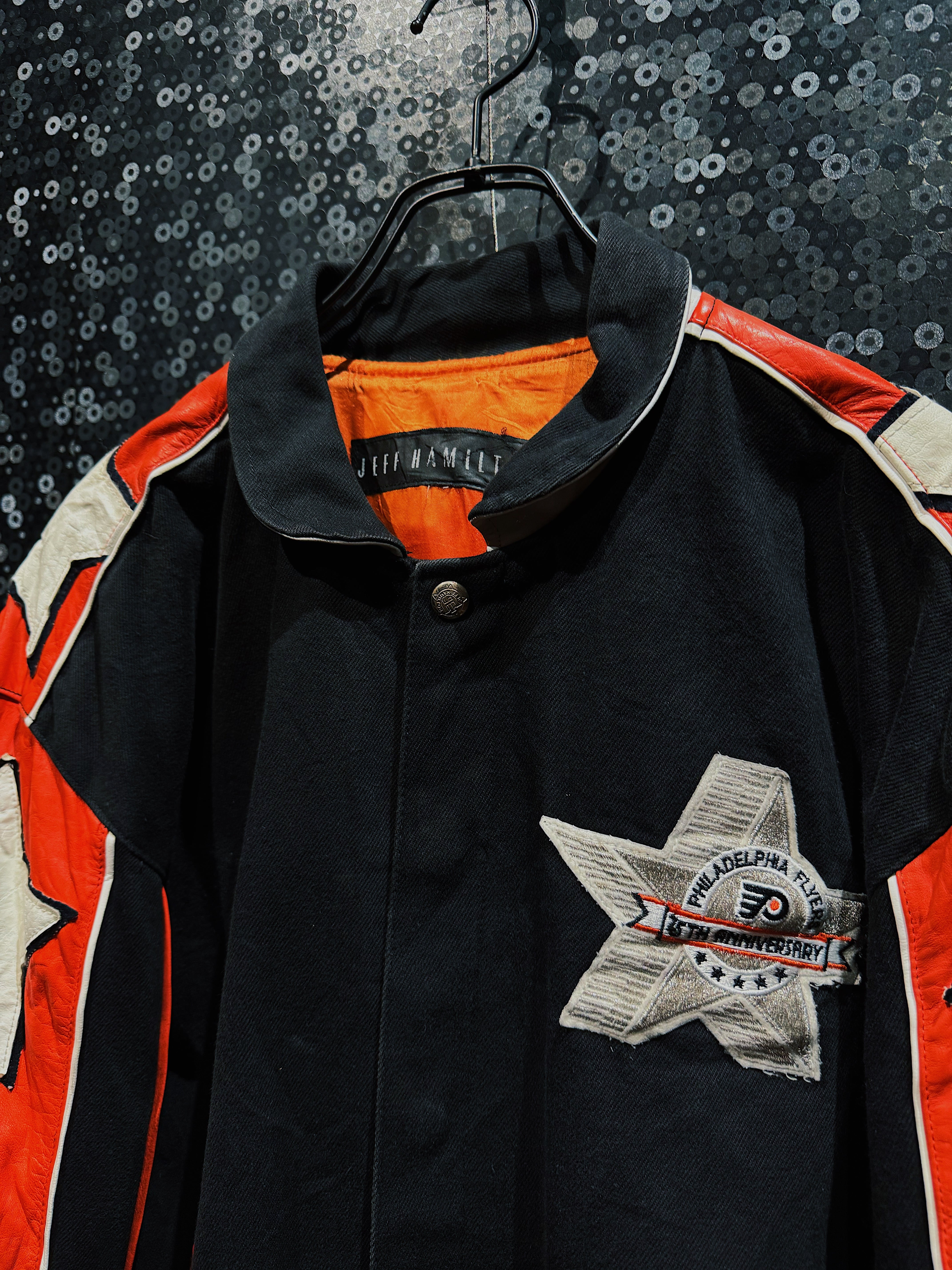 NBA・NFL・MLBをはじめ、アメリカンスポーツとストリートを横断してきた名デザイナー Jeff Hamilton による、フィラデルフィア・フライヤーズ25周年記念のヴィンテージレーシングスタジャン。ブラックボディをベースに、レッド×ホワイトのレザースリーブを大胆に切り替え、両腕にはスターグラフィックを連続配置。スタジャンの枠を超え、レーシングジャケットの攻撃的な文脈を取り込んだ一着。