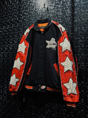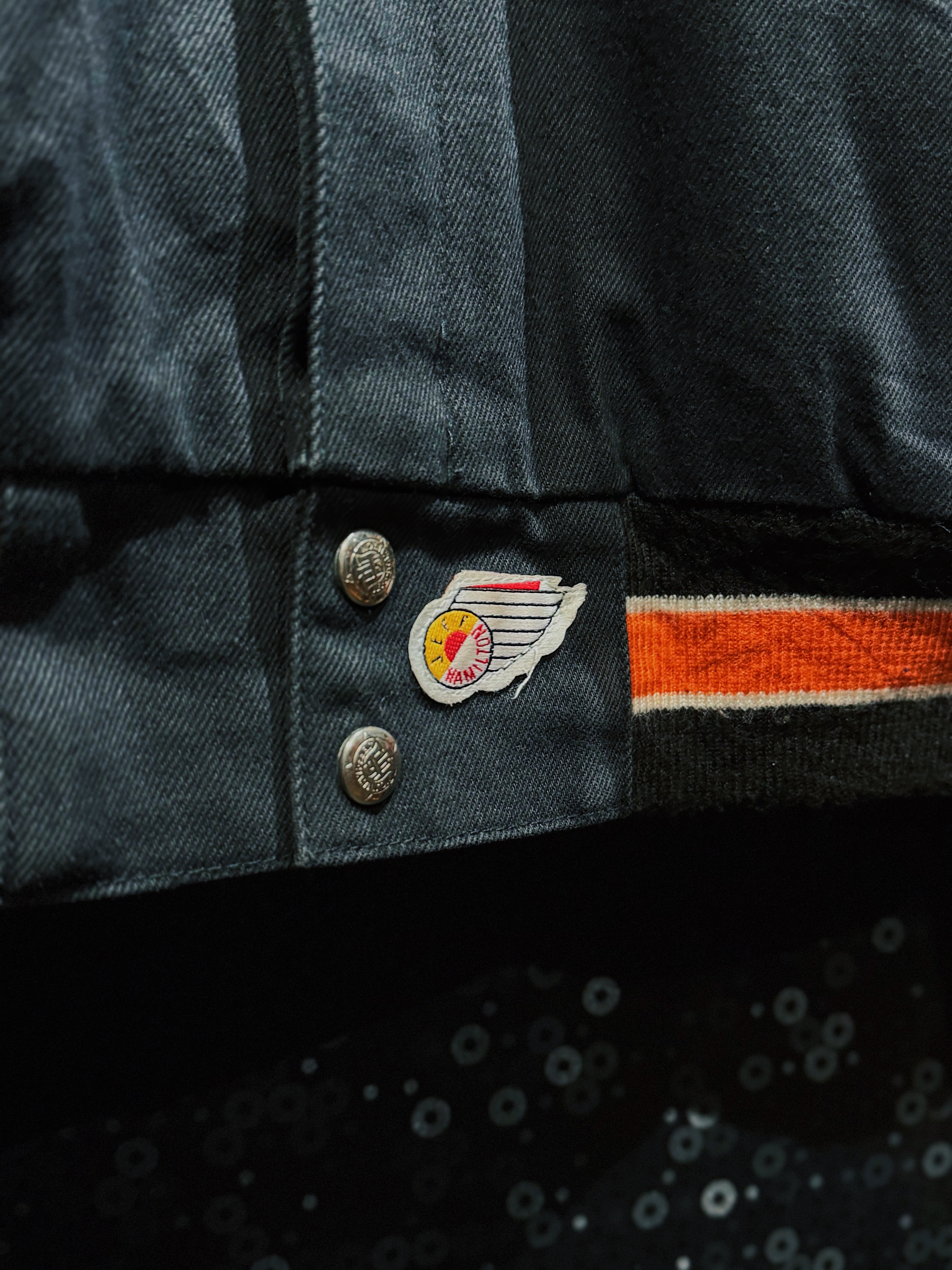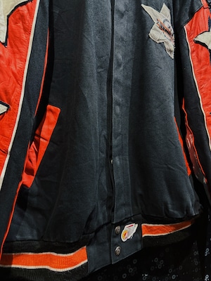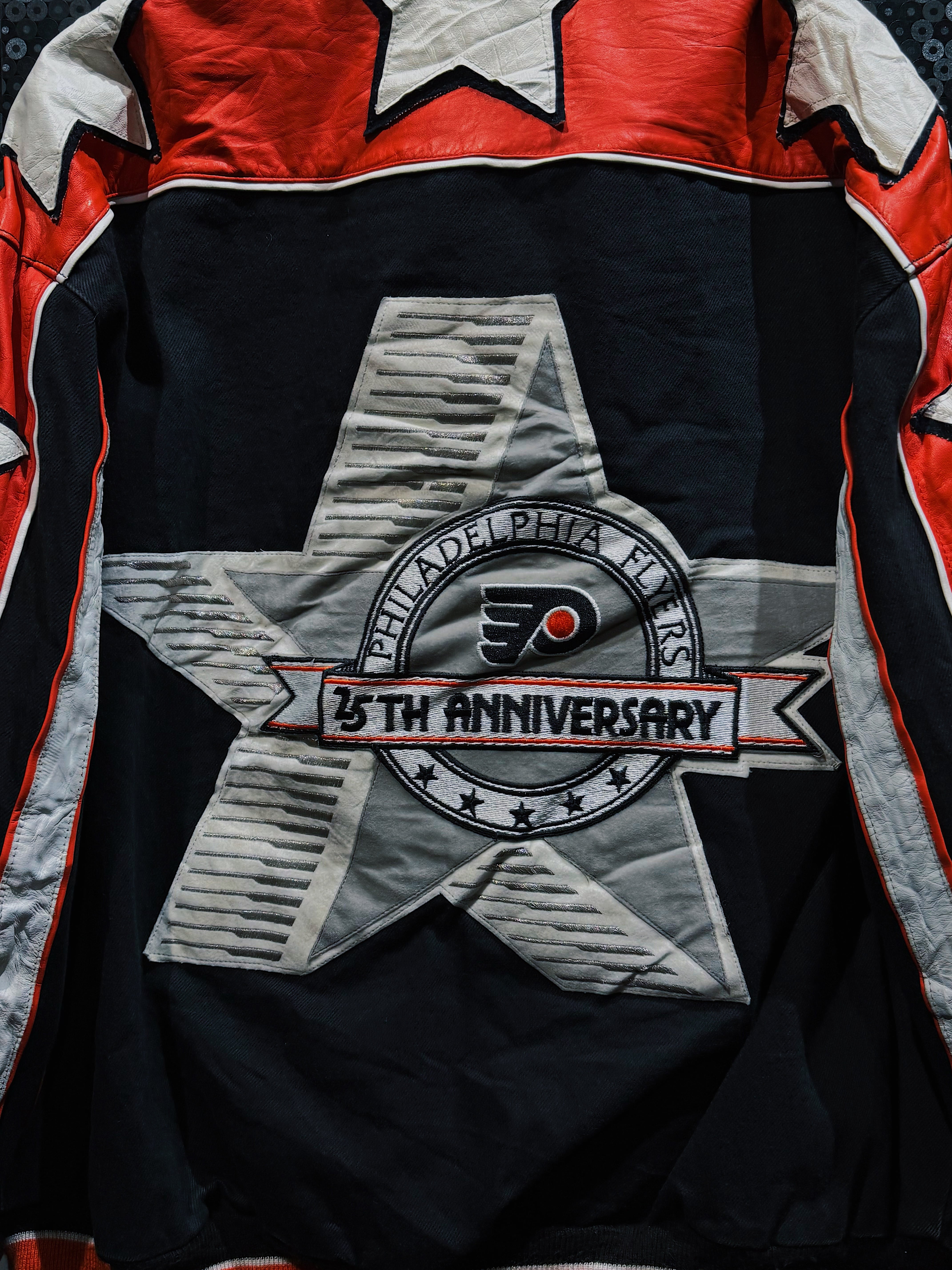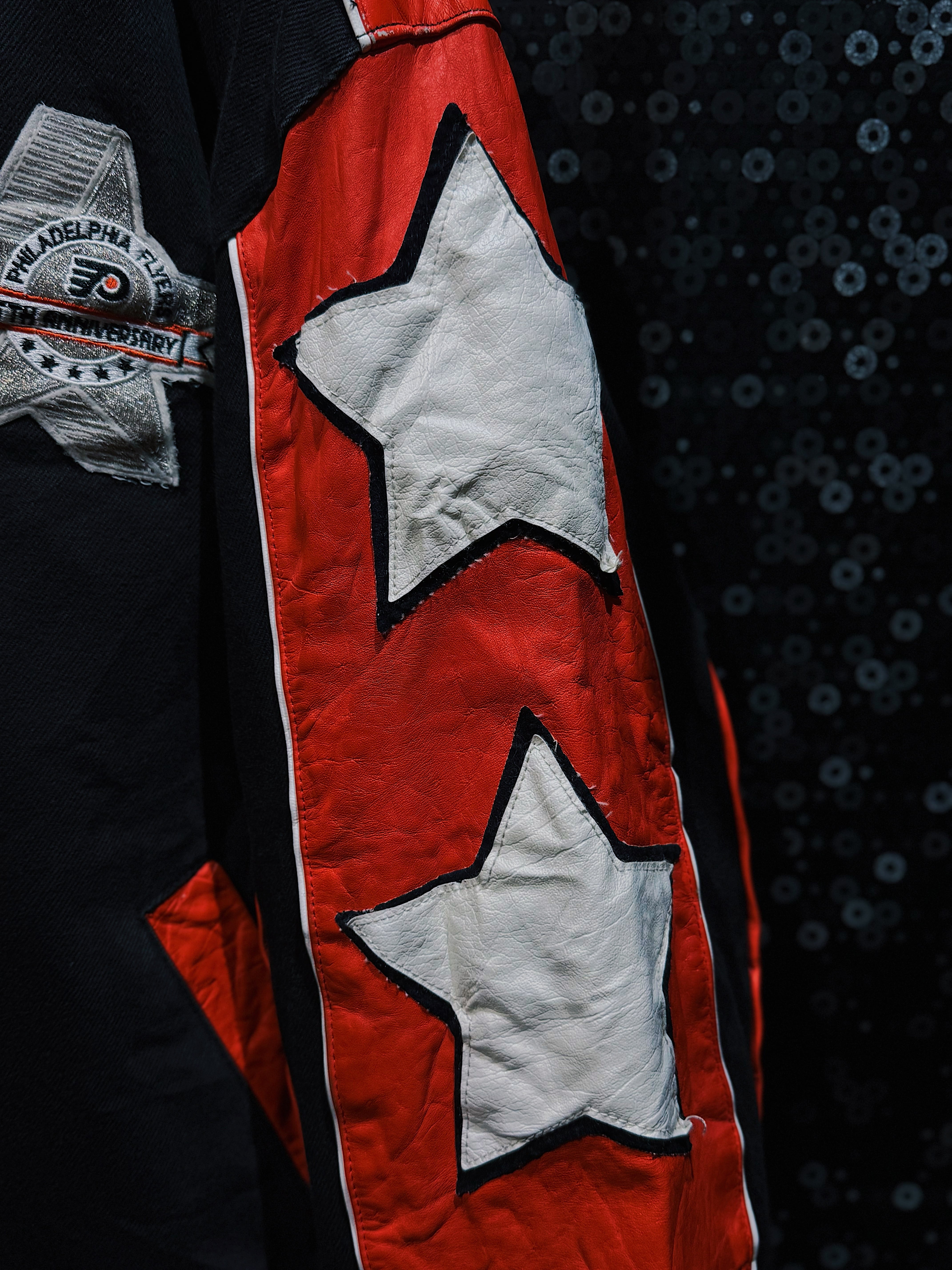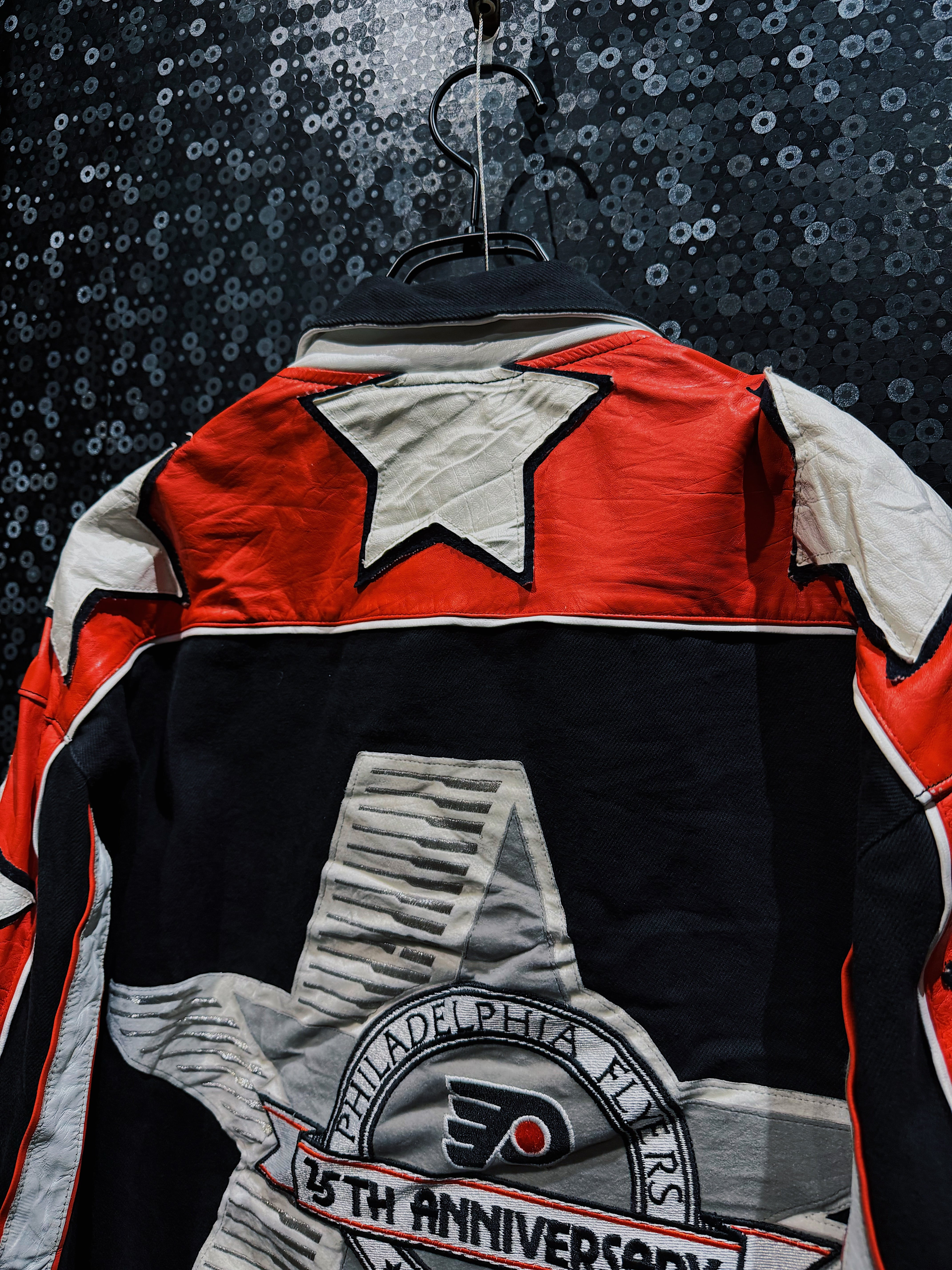 NBA・NFL・MLBをはじめ、アメリカンスポーツとストリートを横断してきた名デザイナー Jeff Hamilton による、フィラデルフィア・フライヤーズ25周年記念のヴィンテージレーシングスタジャン。ブラックボディをベースに、レッド×ホワイトのレザースリーブを大胆に切り替え、両腕にはスターグラフィックを連続配置。スタジャンの枠を超え、レーシングジャケットの攻撃的な文脈を取り込んだ一着。