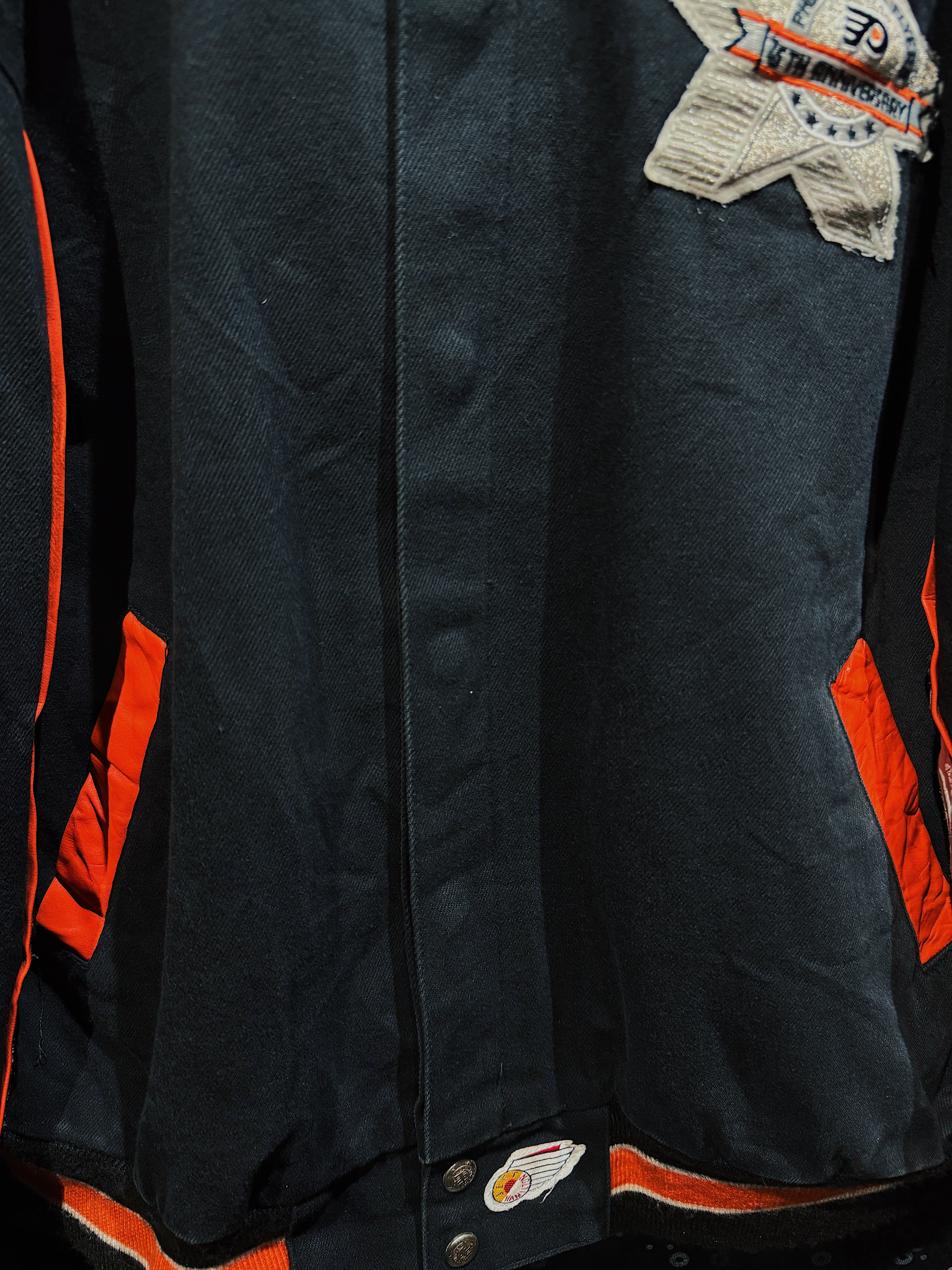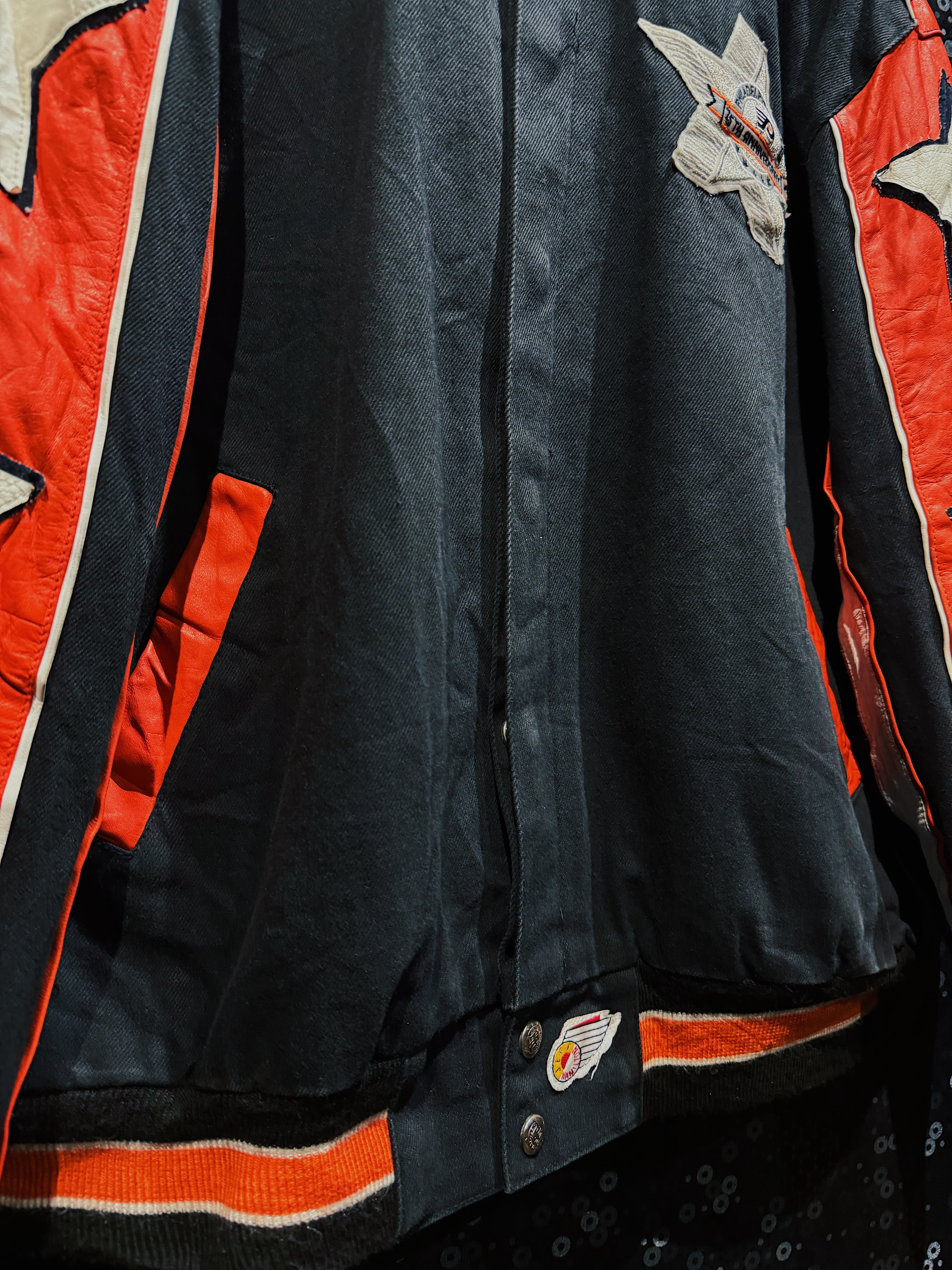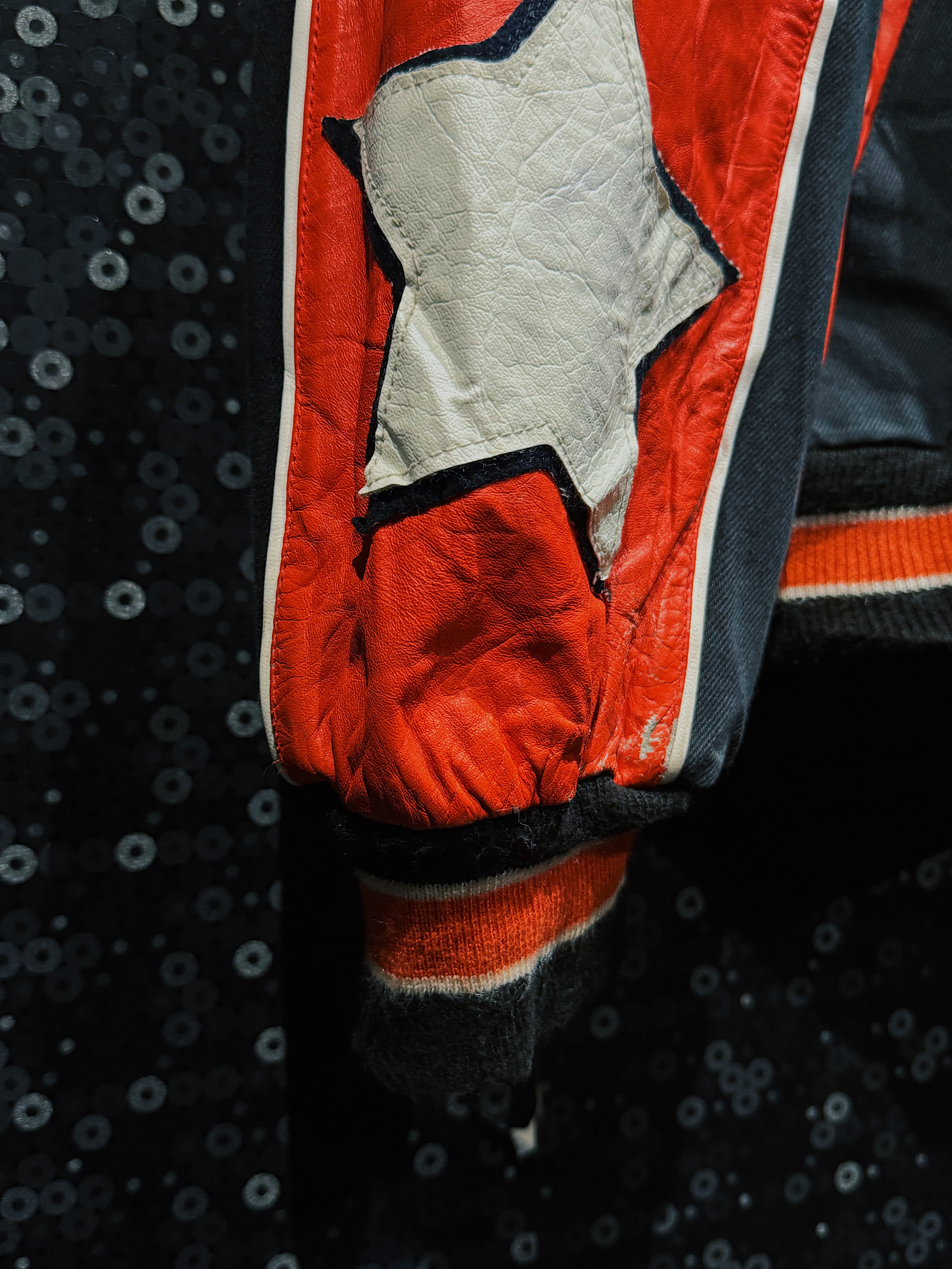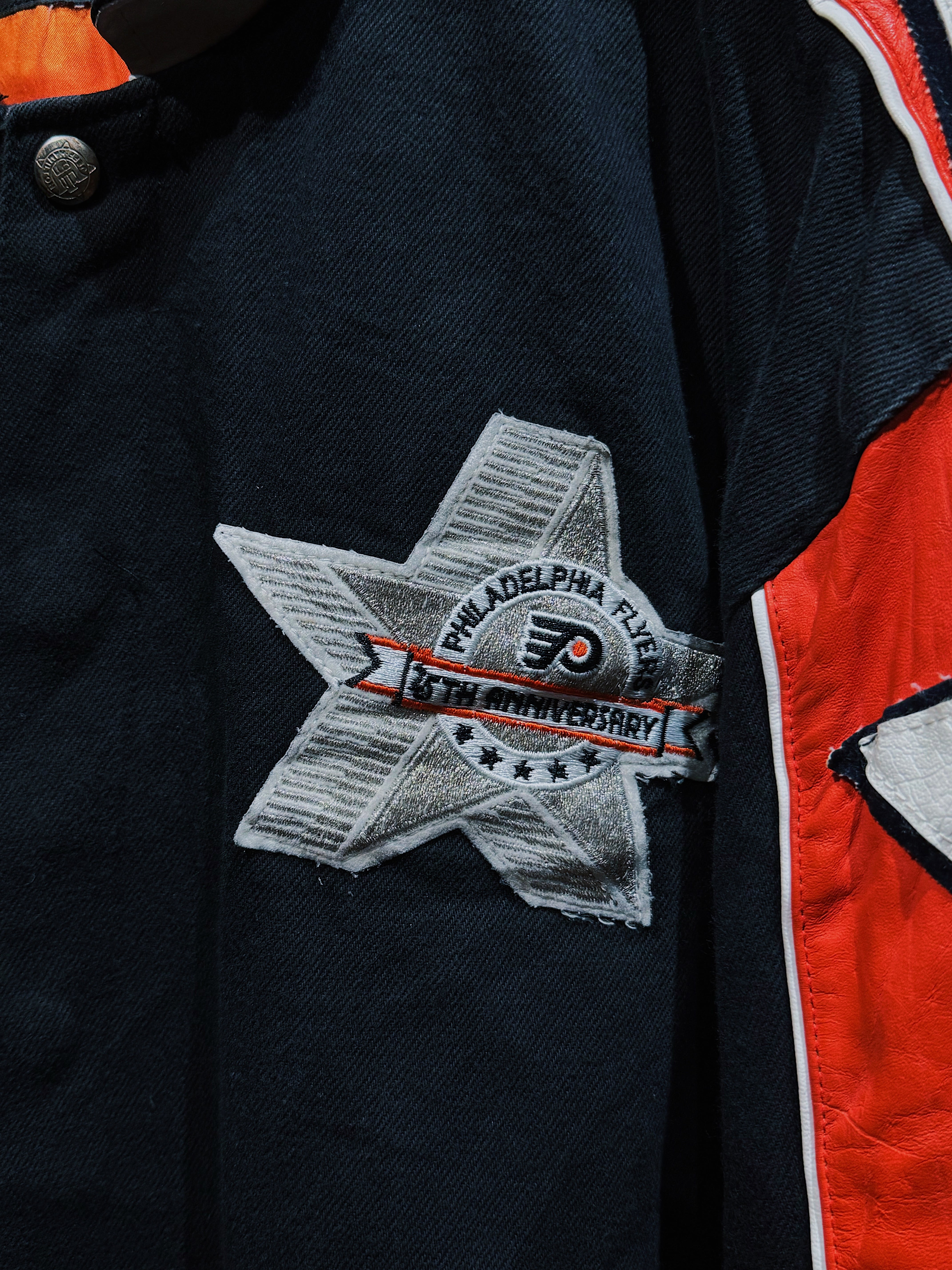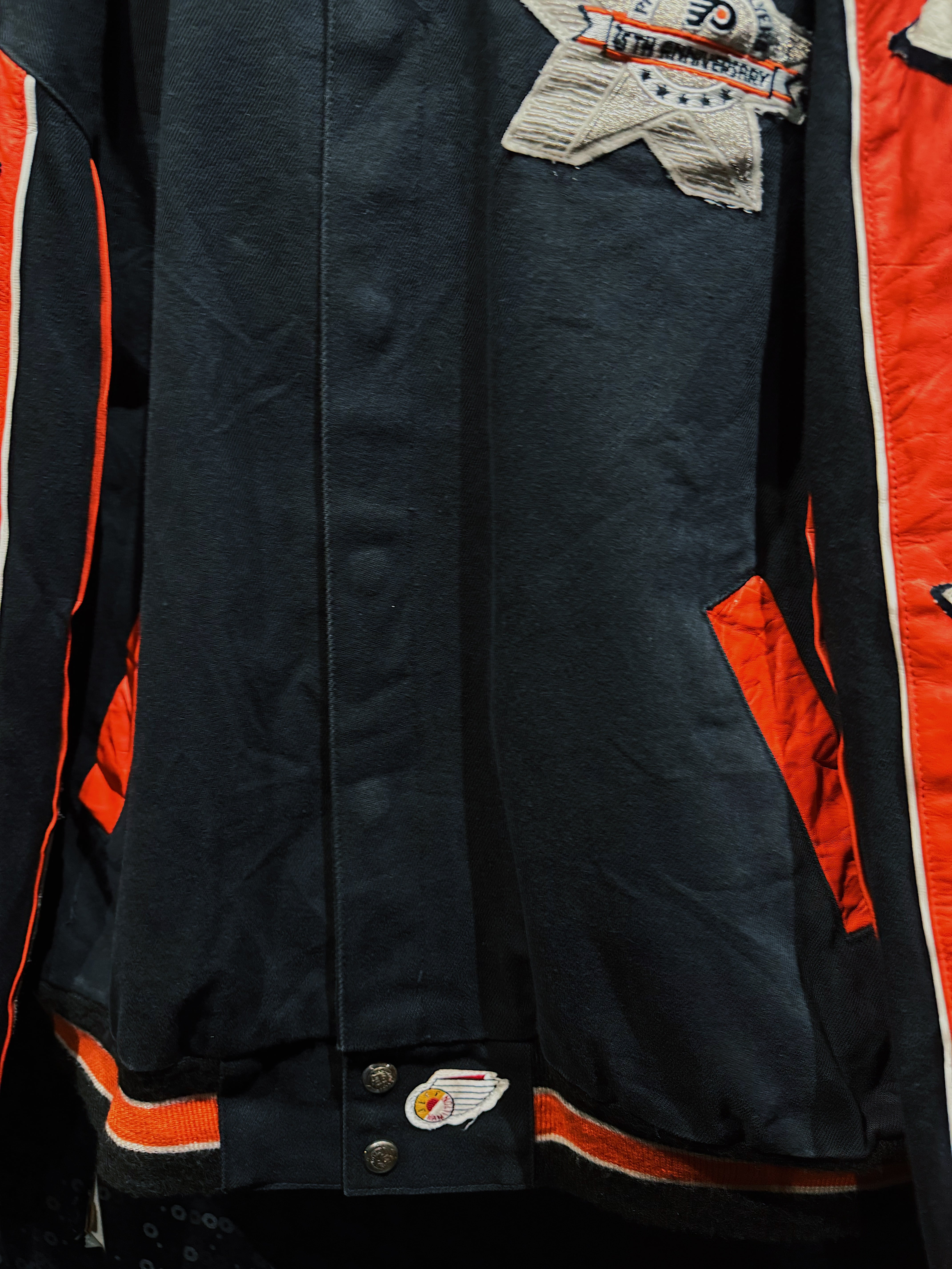 NBA・NFL・MLBをはじめ、アメリカンスポーツとストリートを横断してきた名デザイナー Jeff Hamilton による、フィラデルフィア・フライヤーズ25周年記念のヴィンテージレーシングスタジャン。ブラックボディをベースに、レッド×ホワイトのレザースリーブを大胆に切り替え、両腕にはスターグラフィックを連続配置。スタジャンの枠を超え、レーシングジャケットの攻撃的な文脈を取り込んだ一着。