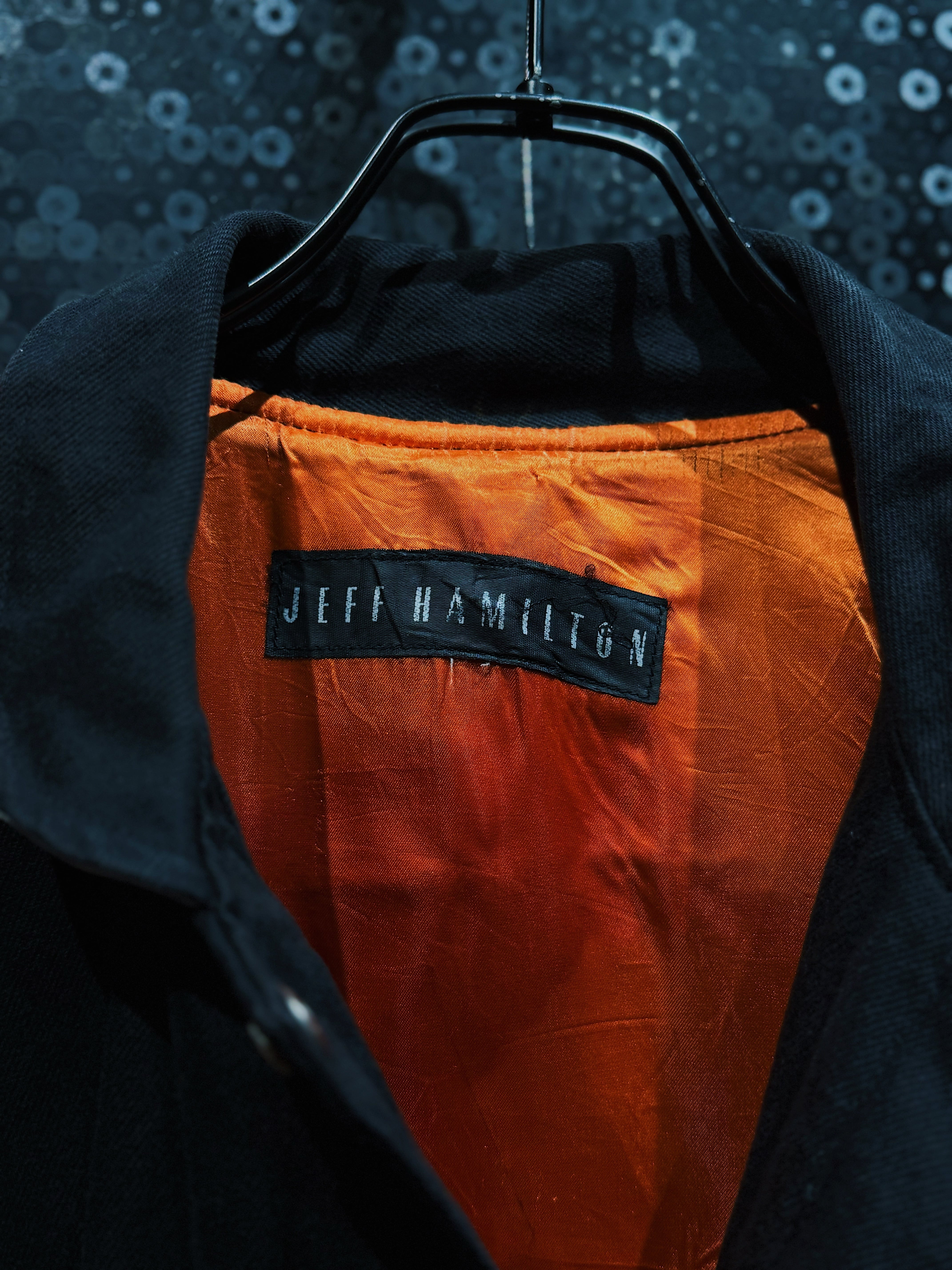 ボディはコットン×ウール系の厚手素材、袖にはレザーを使用した切替仕様。裏地にはオレンジカラーのキルティングが採用され、防寒性と視覚的インパクトを両立。スナップボタンやリブ配色、ワッペン配置に至るまで、すべてが保証書付きのJEFF HAMILTONクオリティで構成されている。