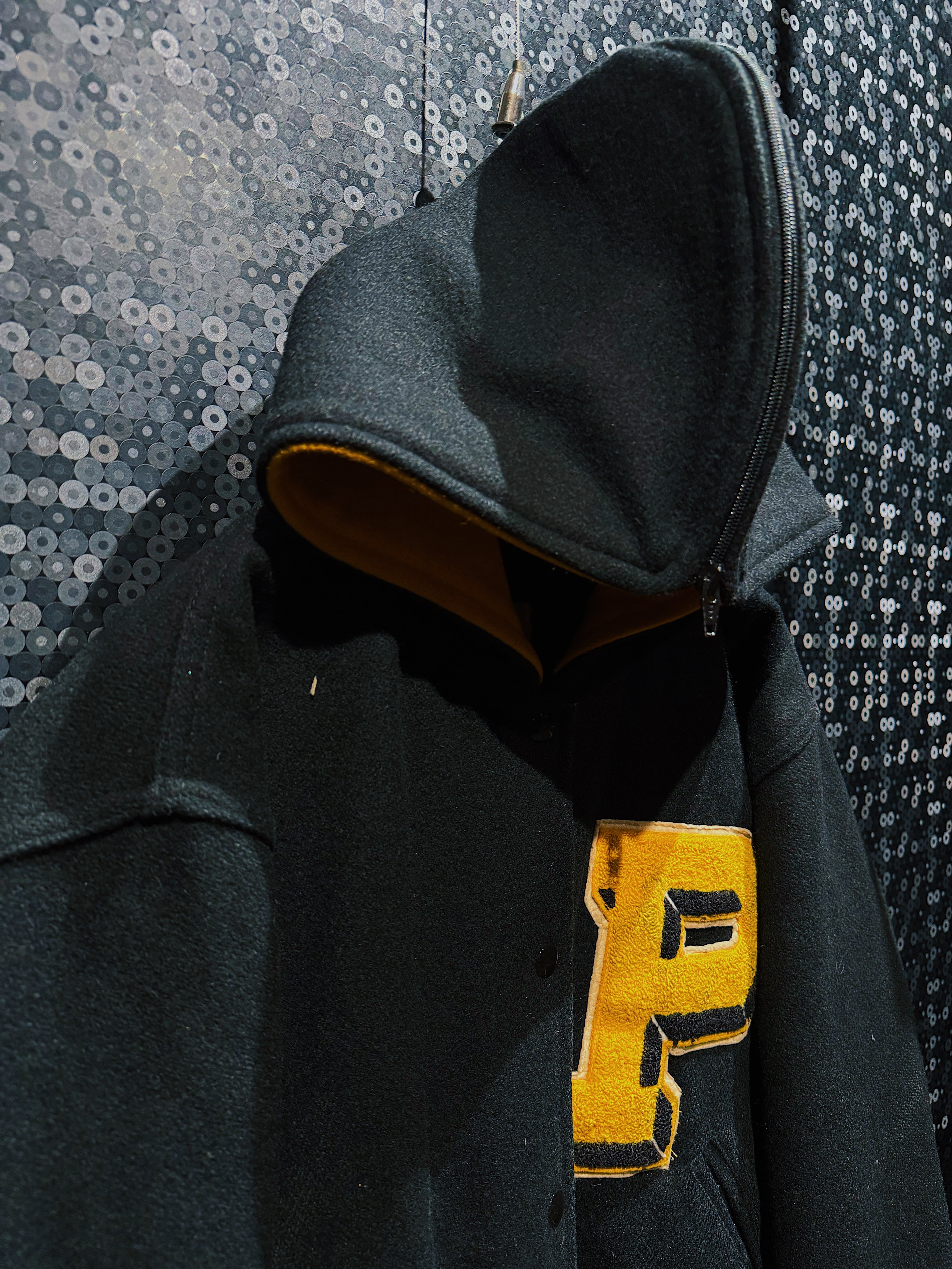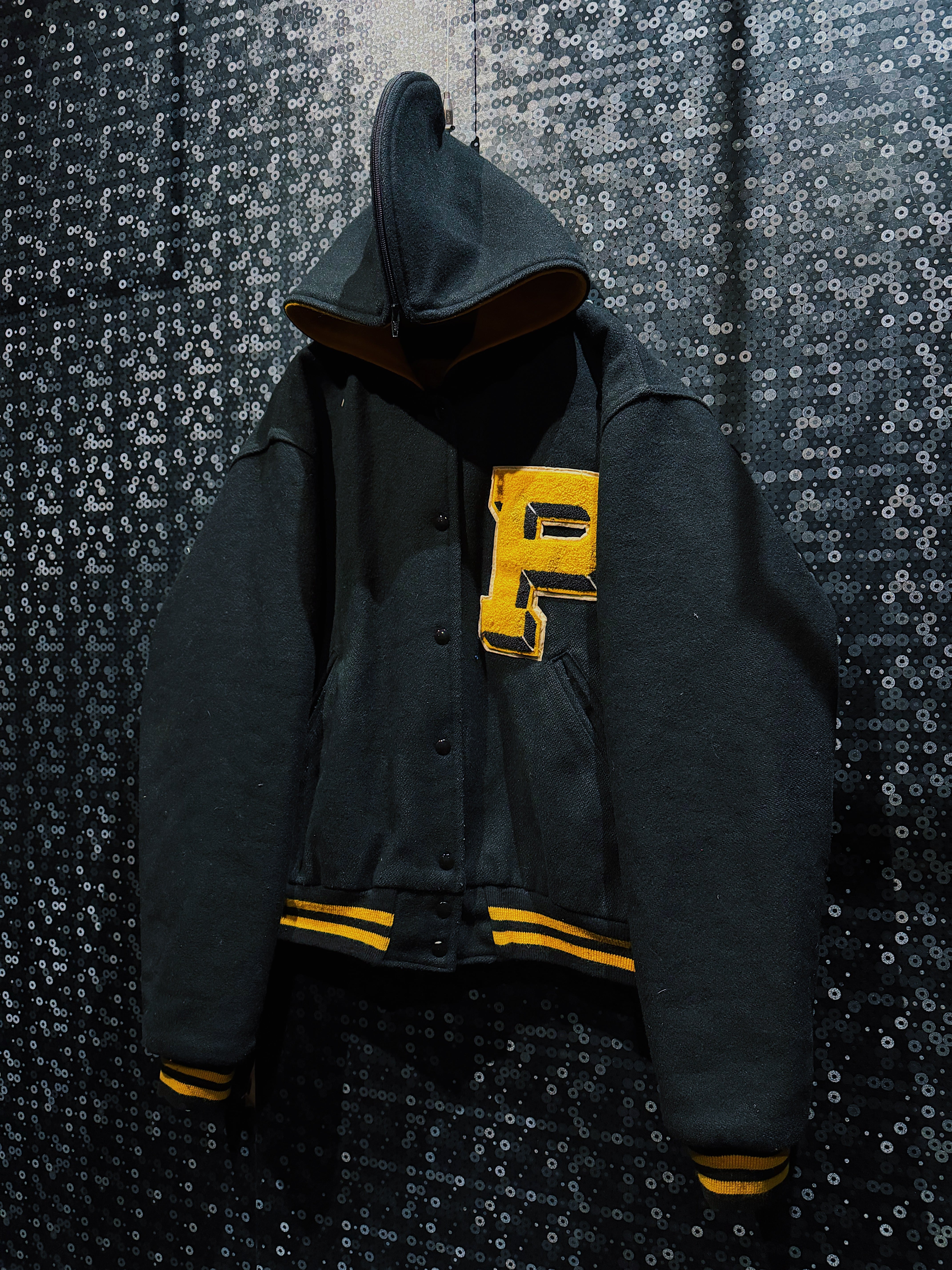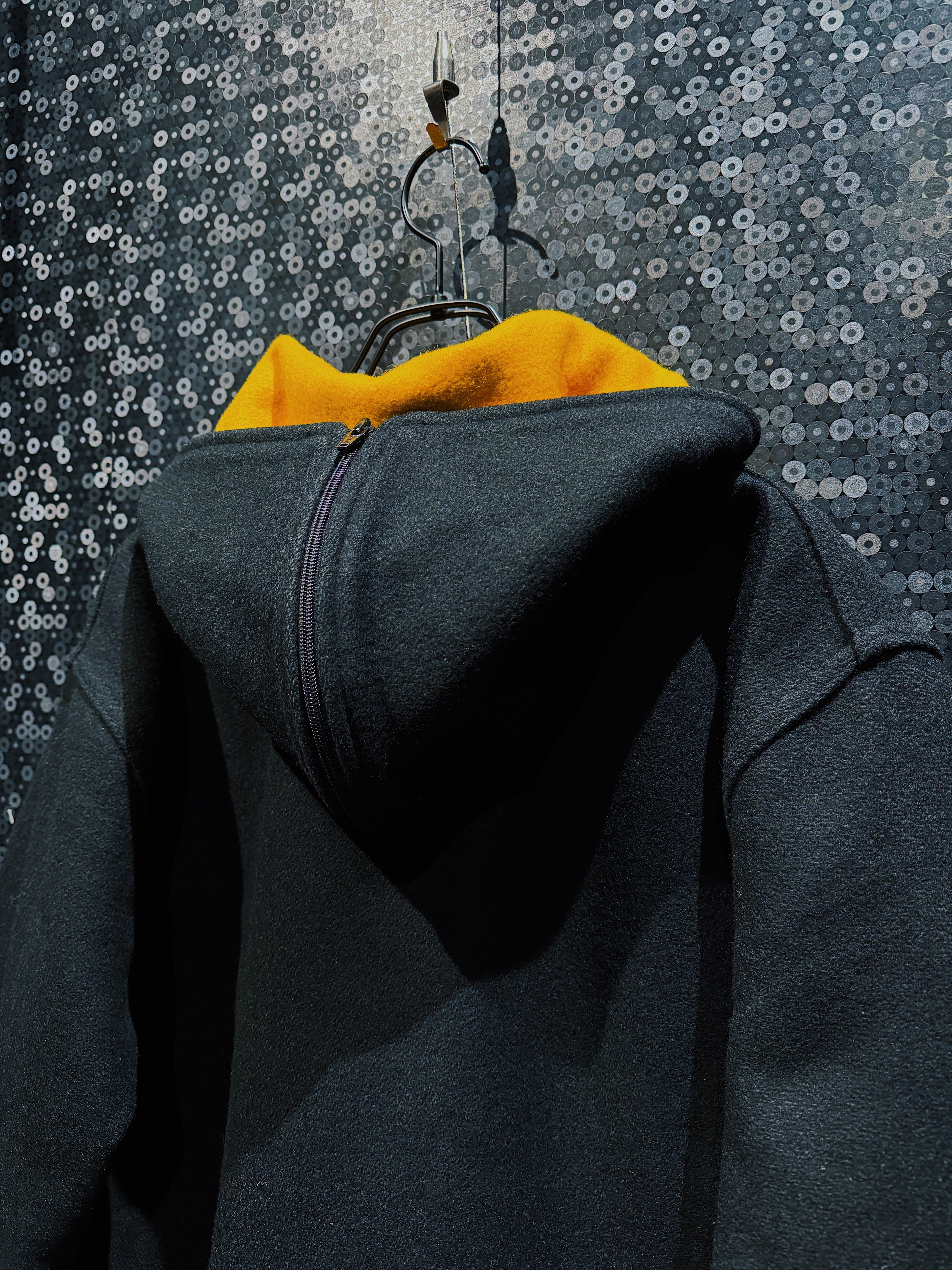 “Athletic Heathering”によるヴィンテージスタジアムジャケットをベースに、フーディーデザインと開閉式ギミックを融合させた異色の一着。クラシックなスタジャンの文脈にありながら、フード部分にはジップによる開閉構造が組み込まれており、閉じた状態では立体感のあるフードシルエット、開くことでフレア状に広がる独特なフォルムへと変化する。着用者の動きやスタイリングによって表情が切り替わる、明確な“仕掛け”を持ったデザイン。