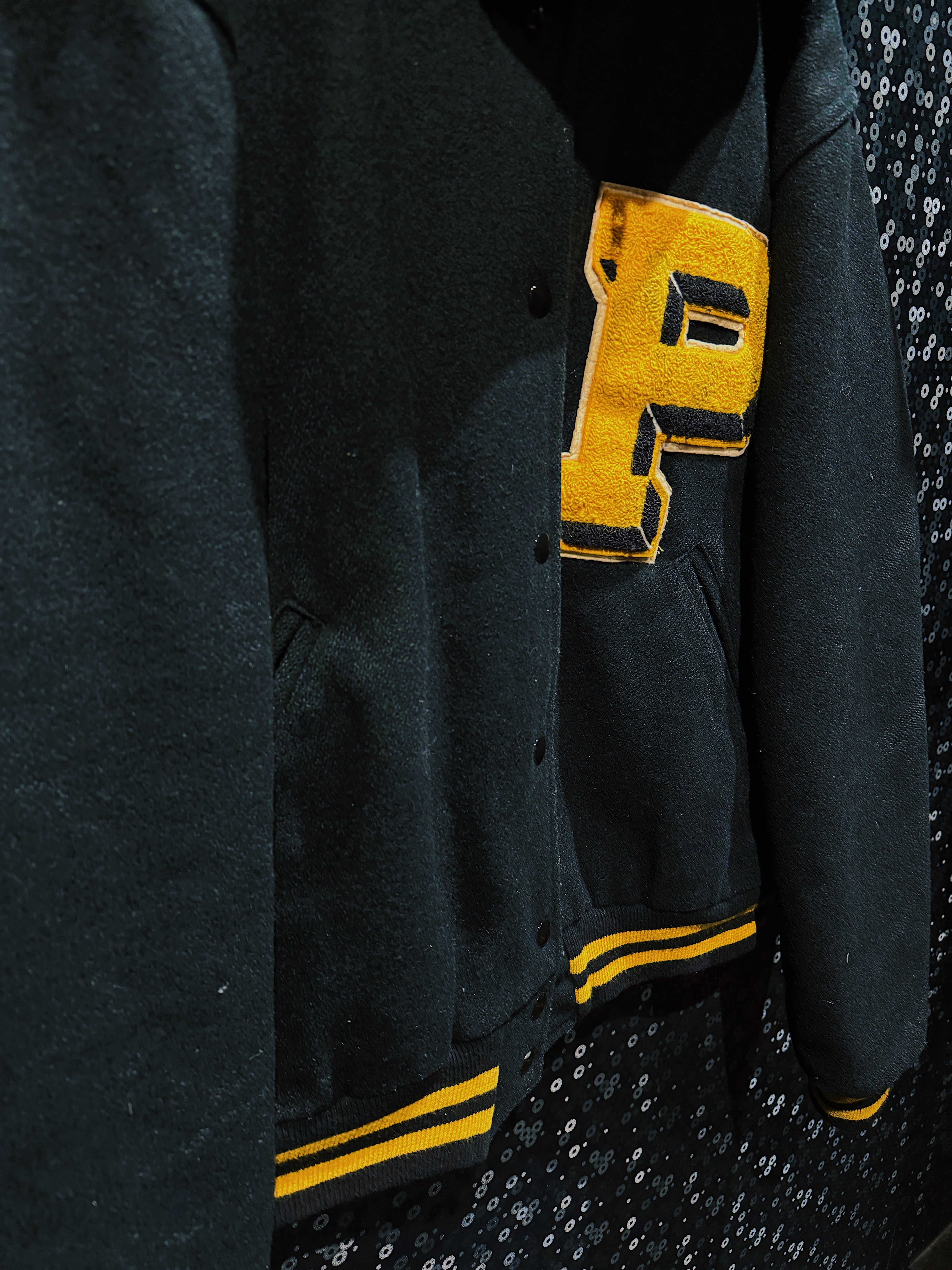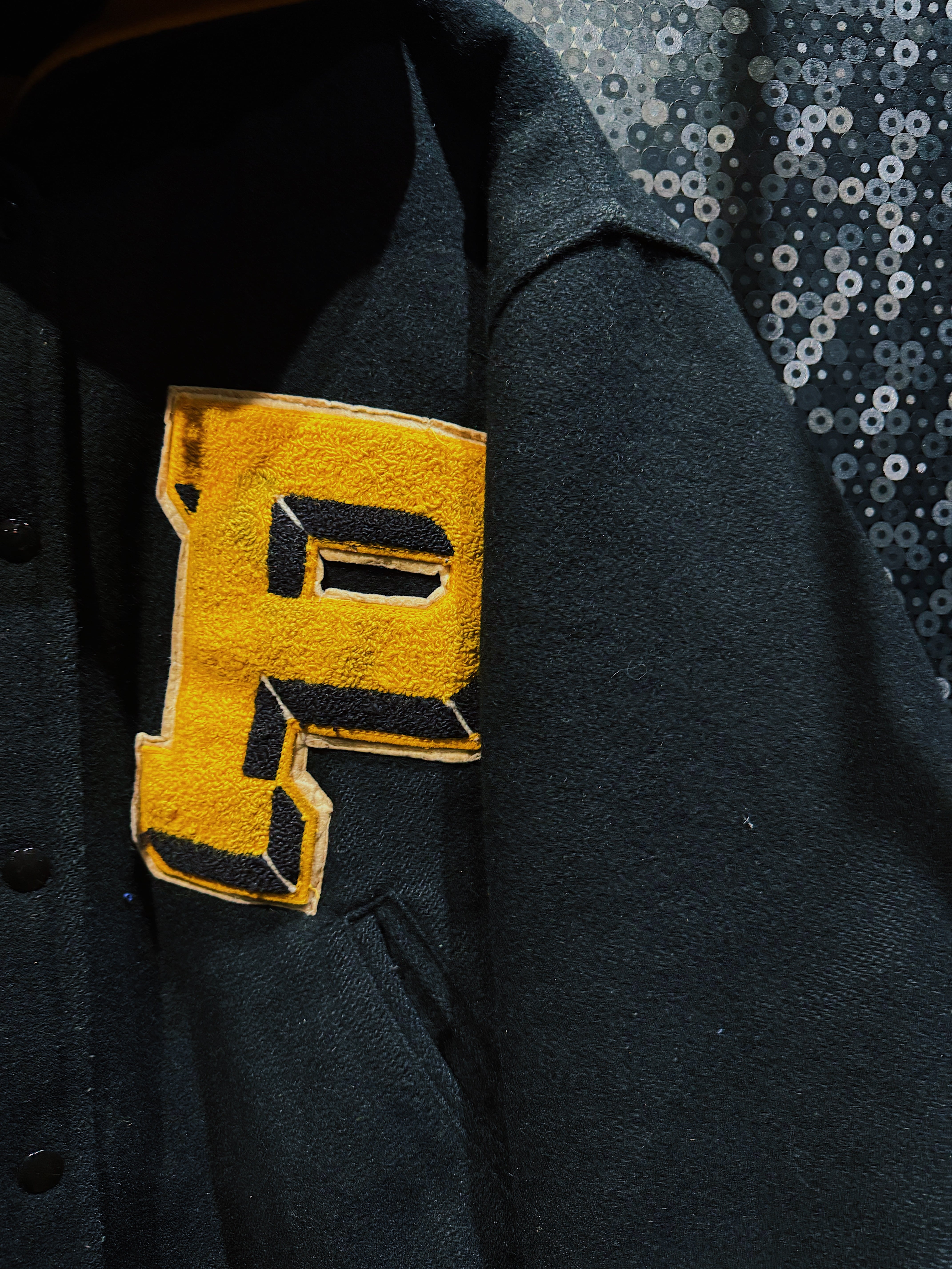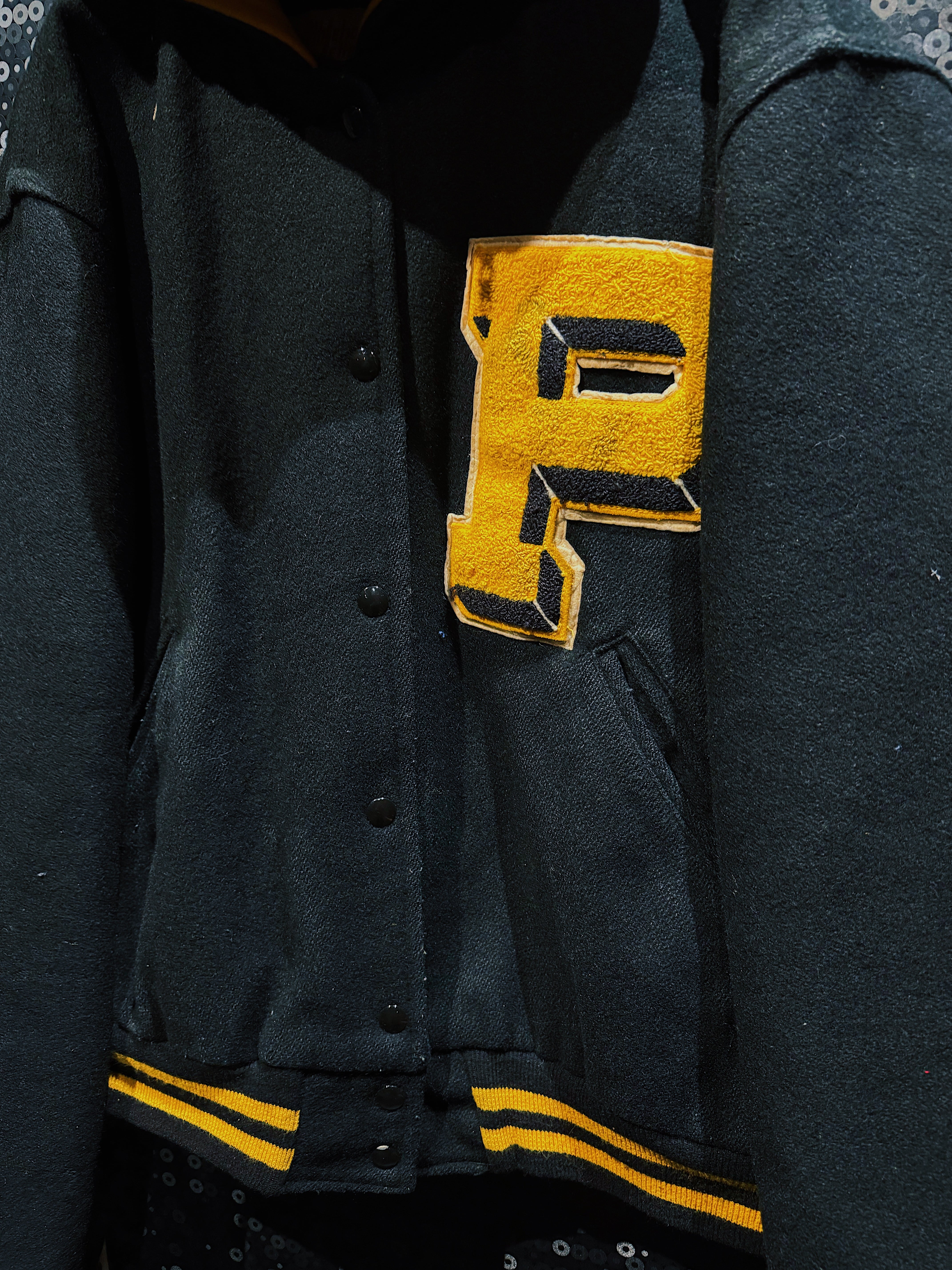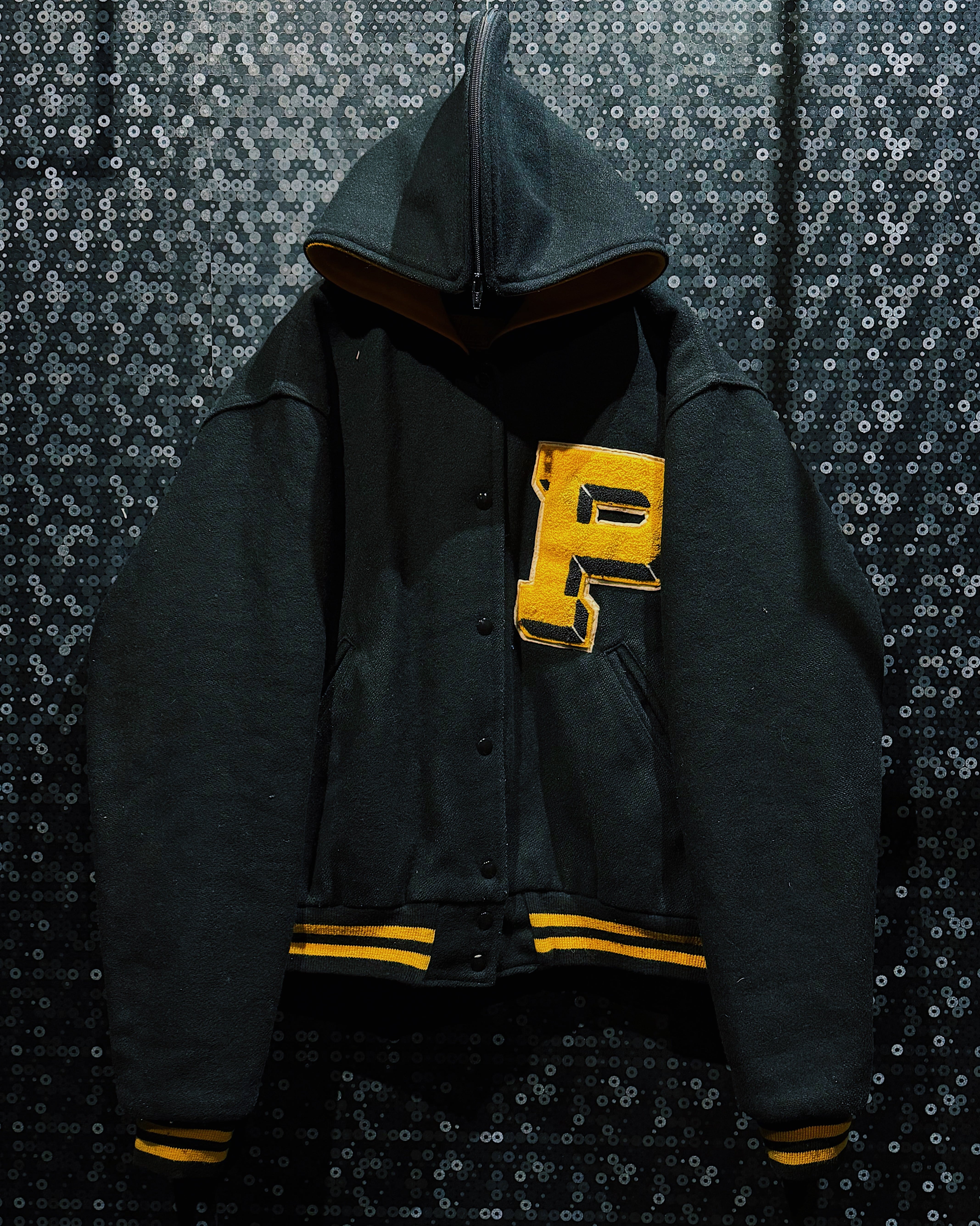 “Athletic Heathering”によるヴィンテージスタジアムジャケットをベースに、フーディーデザインと開閉式ギミックを融合させた異色の一着。クラシックなスタジャンの文脈にありながら、フード部分にはジップによる開閉構造が組み込まれており、閉じた状態では立体感のあるフードシルエット、開くことでフレア状に広がる独特なフォルムへと変化する。着用者の動きやスタイリングによって表情が切り替わる、明確な“仕掛け”を持ったデザイン。