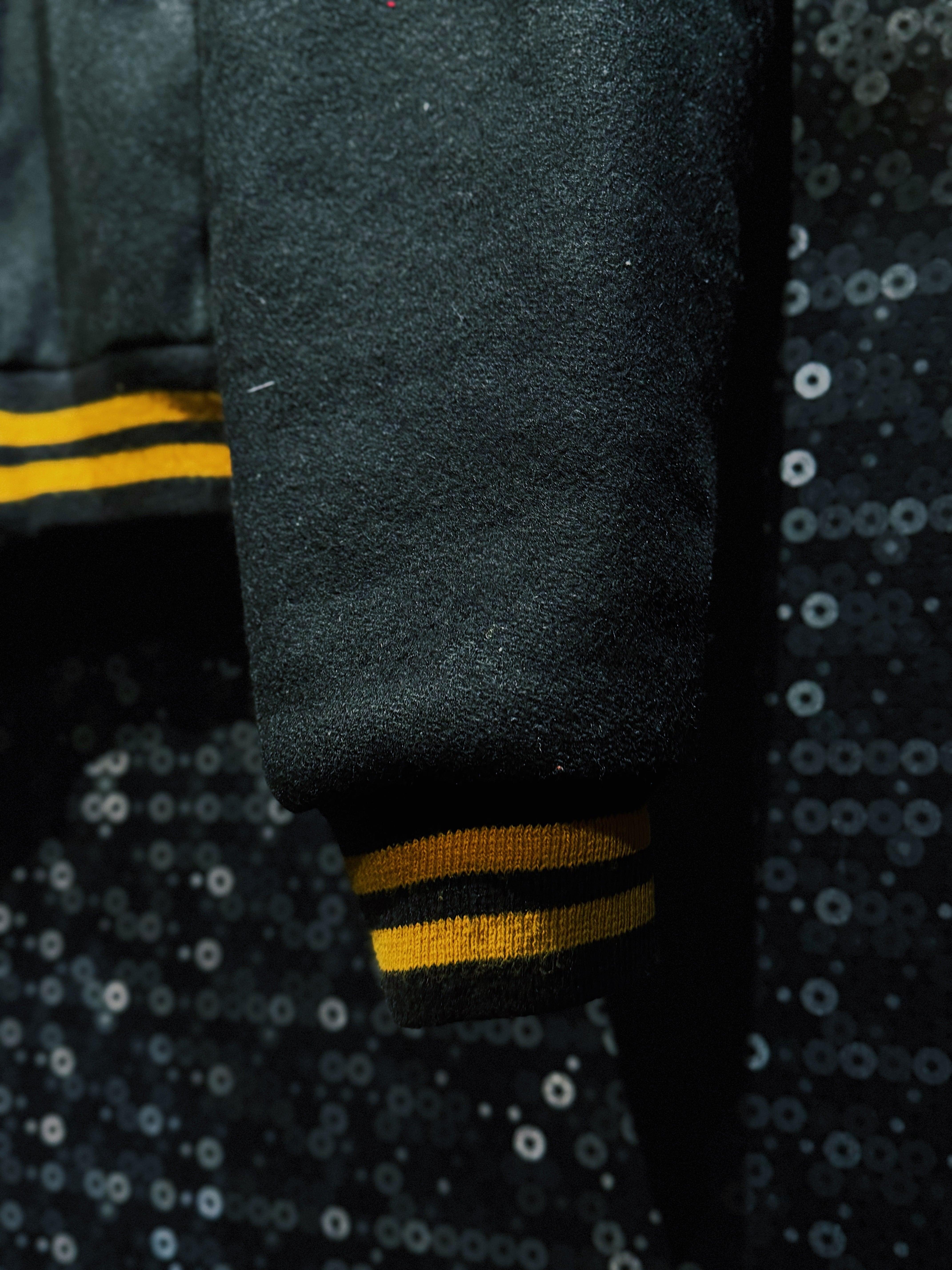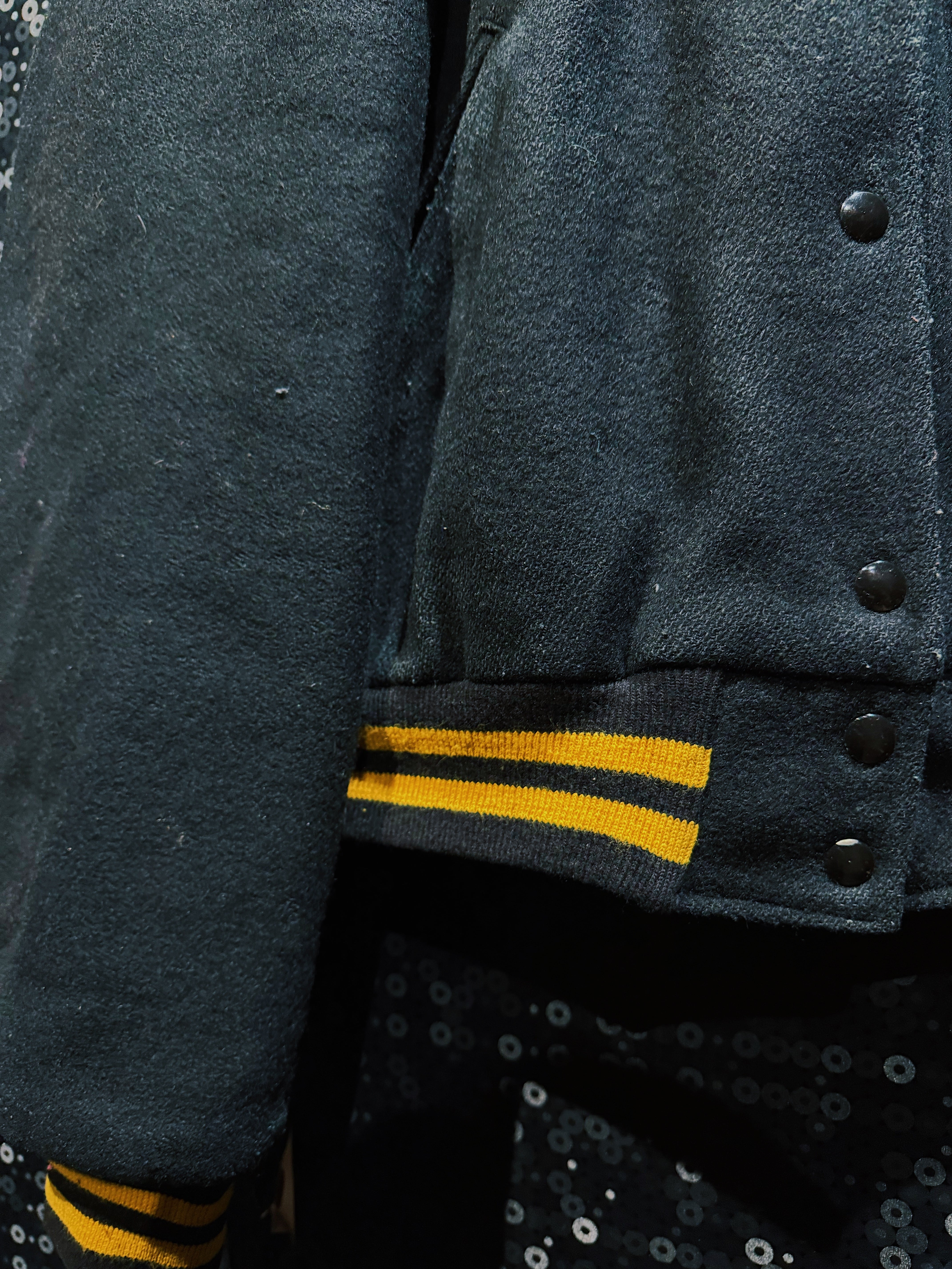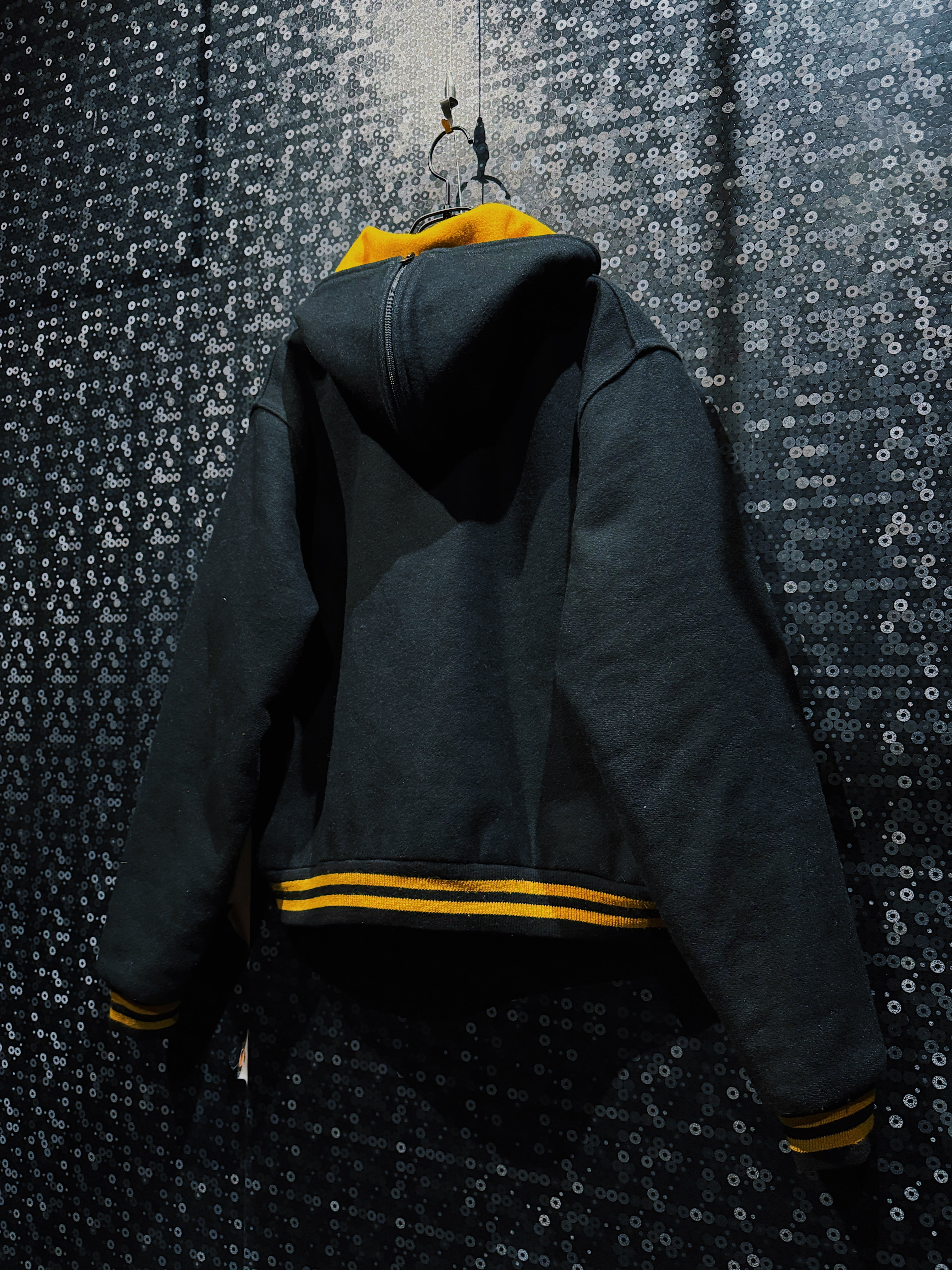 裾・袖のリブにはブラック×イエローのラインを採用し、全体の配色を引き締める構成。スタジャンとしての骨格はしっかり保ちつつ、フーディーとギミックによって完全に別物へ昇華された一着で、AEIEMらしい“既存ジャンルを裏切るヴィンテージ”として提案したいスタジャンフーディー。
