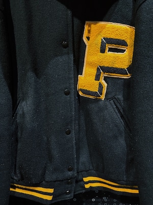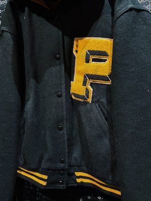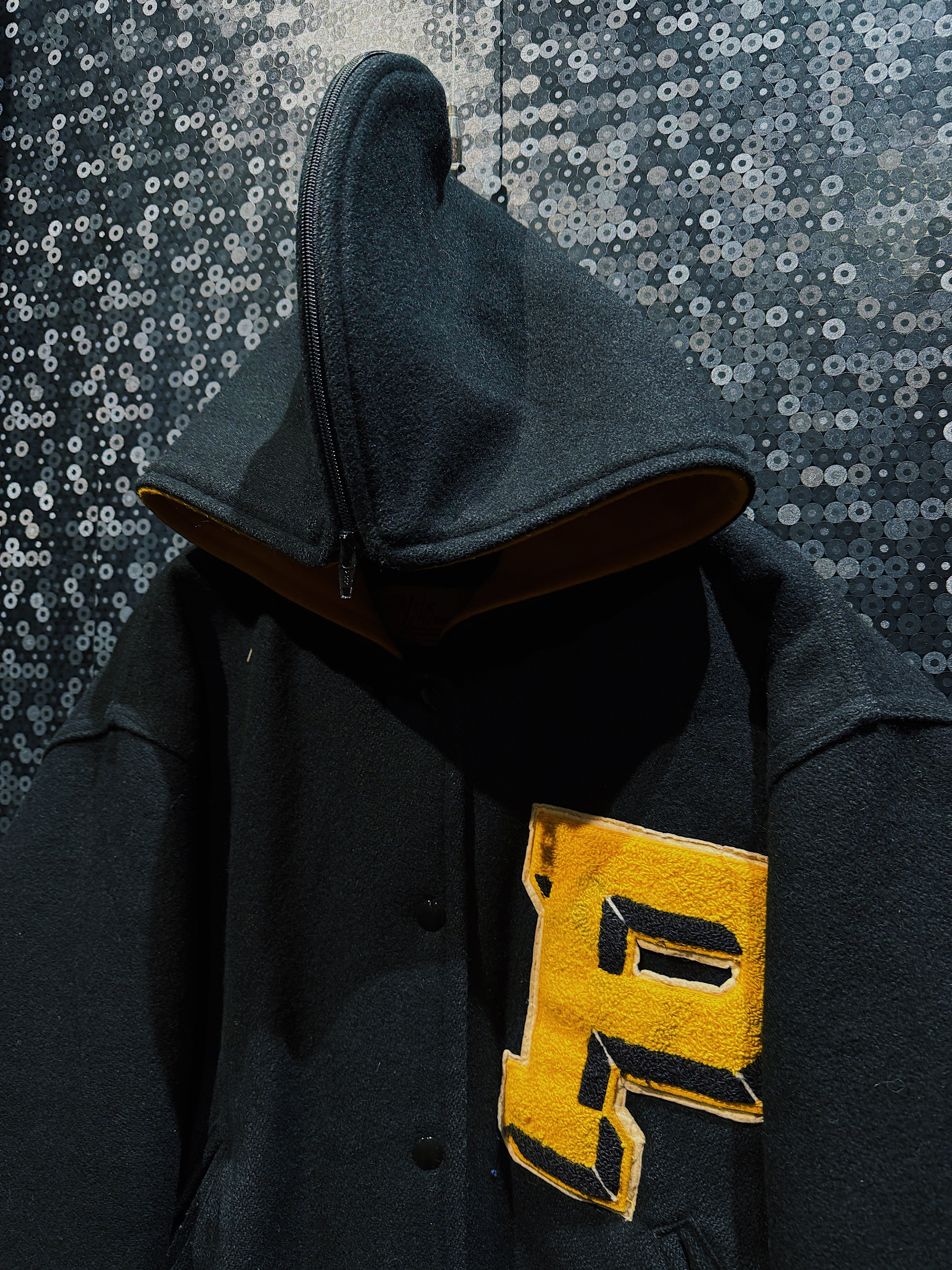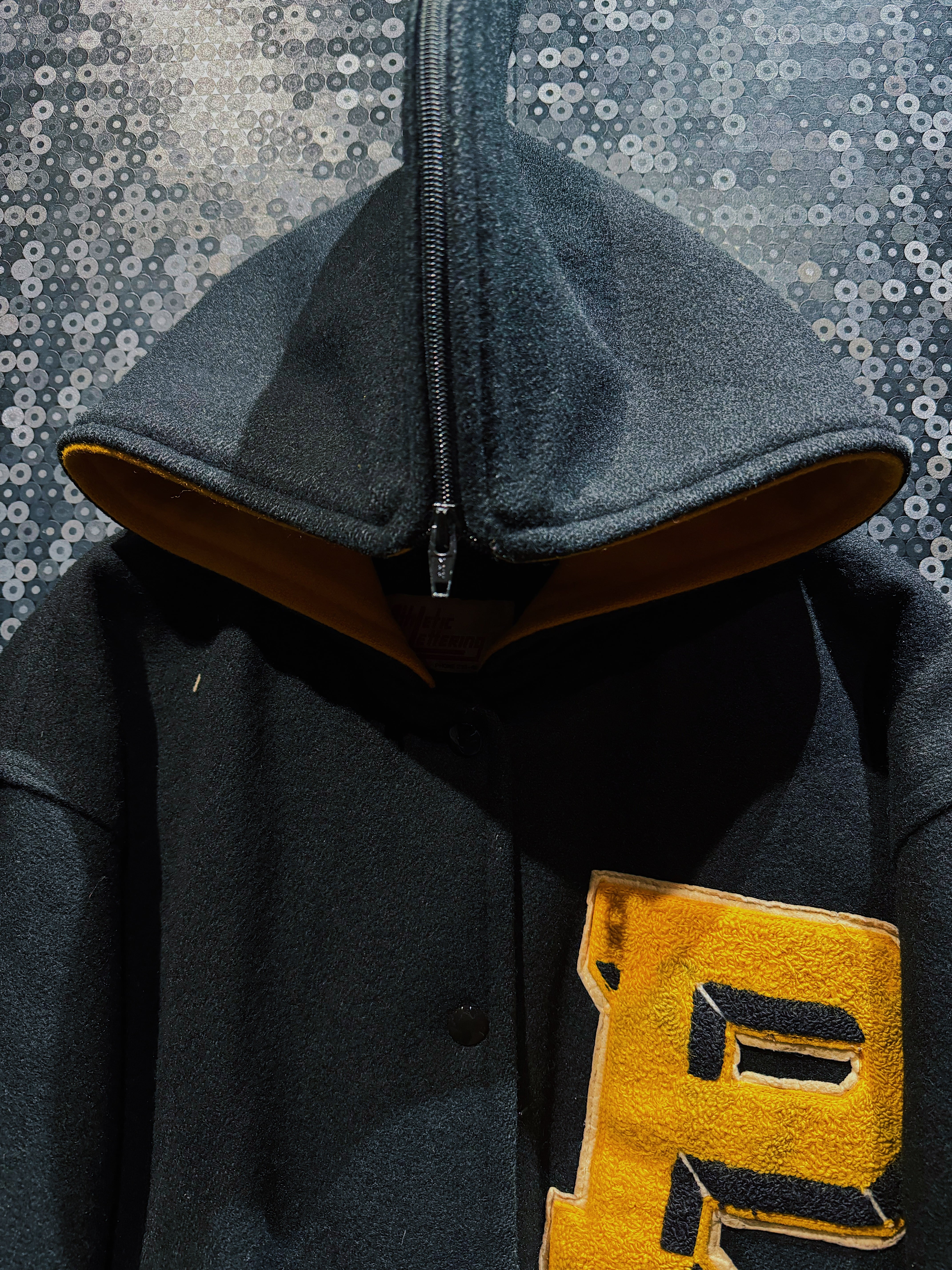 【ÆIEM】“Athletic Heathering” vintage hooded varsity jacket “F” zip-open hood gimmick