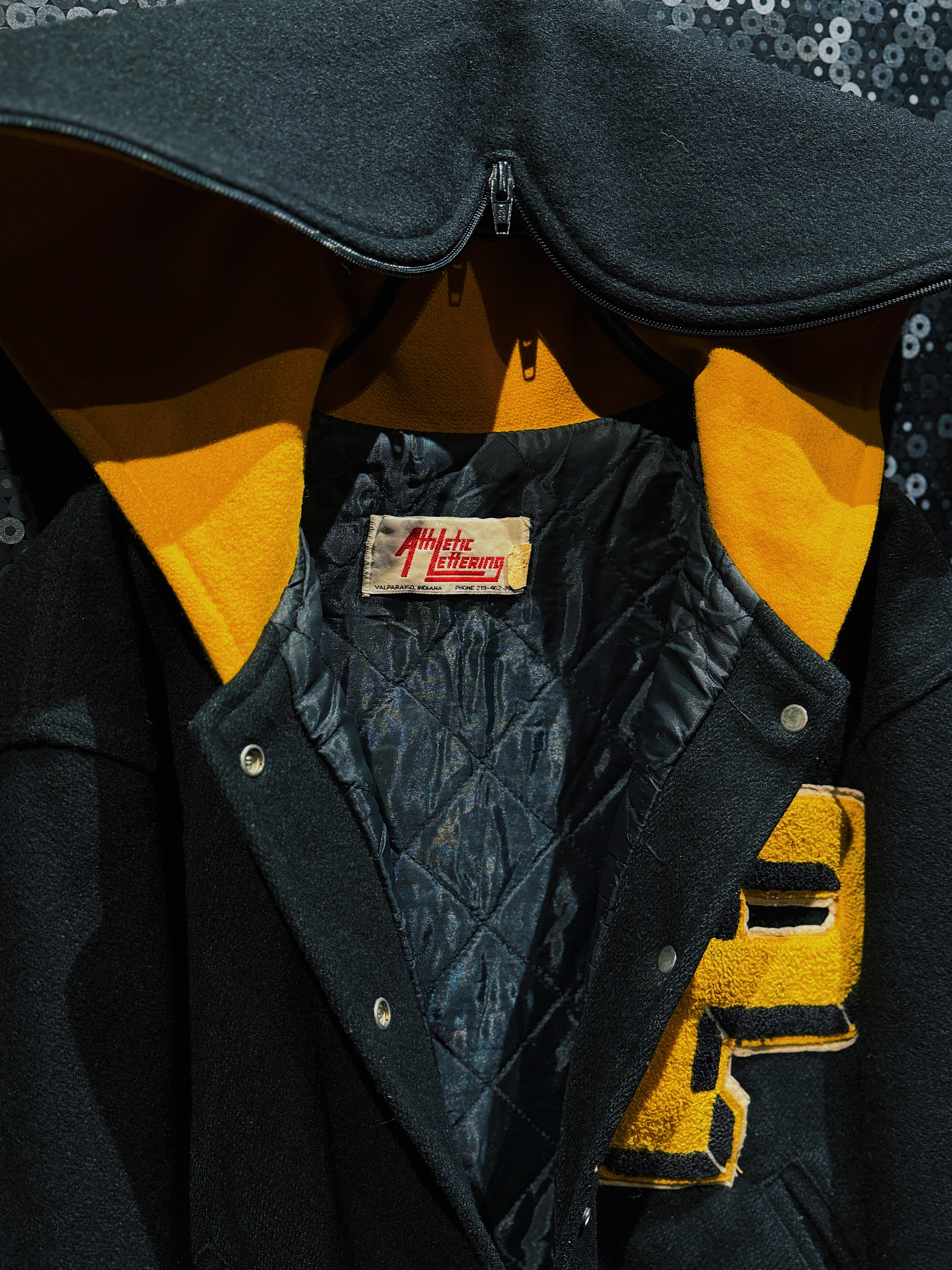 ボディには起毛感のあるブラックウール素材を使用し、内側はキルティング仕様。防寒性を確保しつつ、裏地やフード内側に配されたイエローカラーが、動いた際にさりげなく主張するコントラストを生み出している。フロントの「F」ワッペンはサガラを基調とした立体的な作りで、経年による風合いも含めてヴィンテージならではの存在感を放つ。