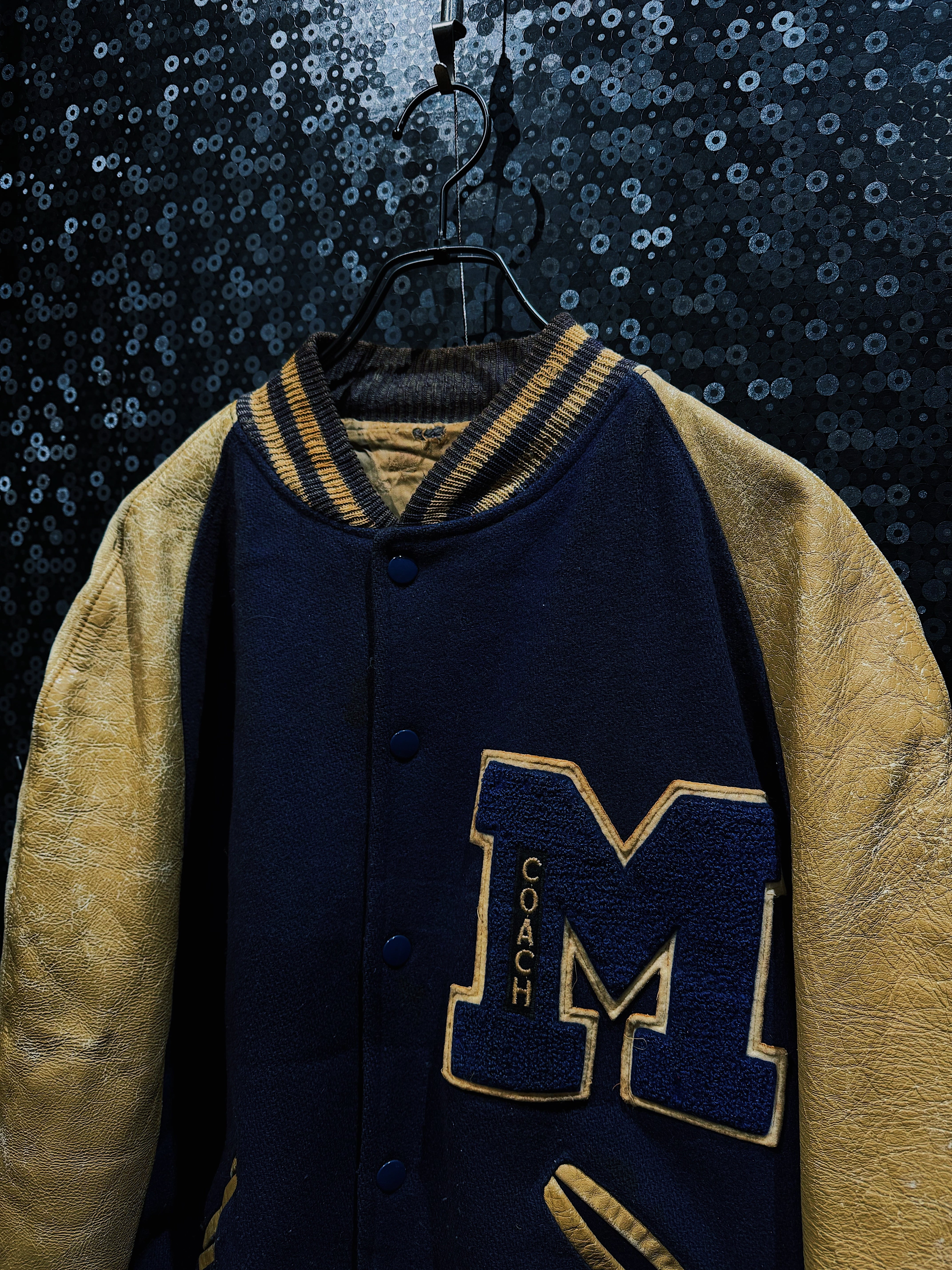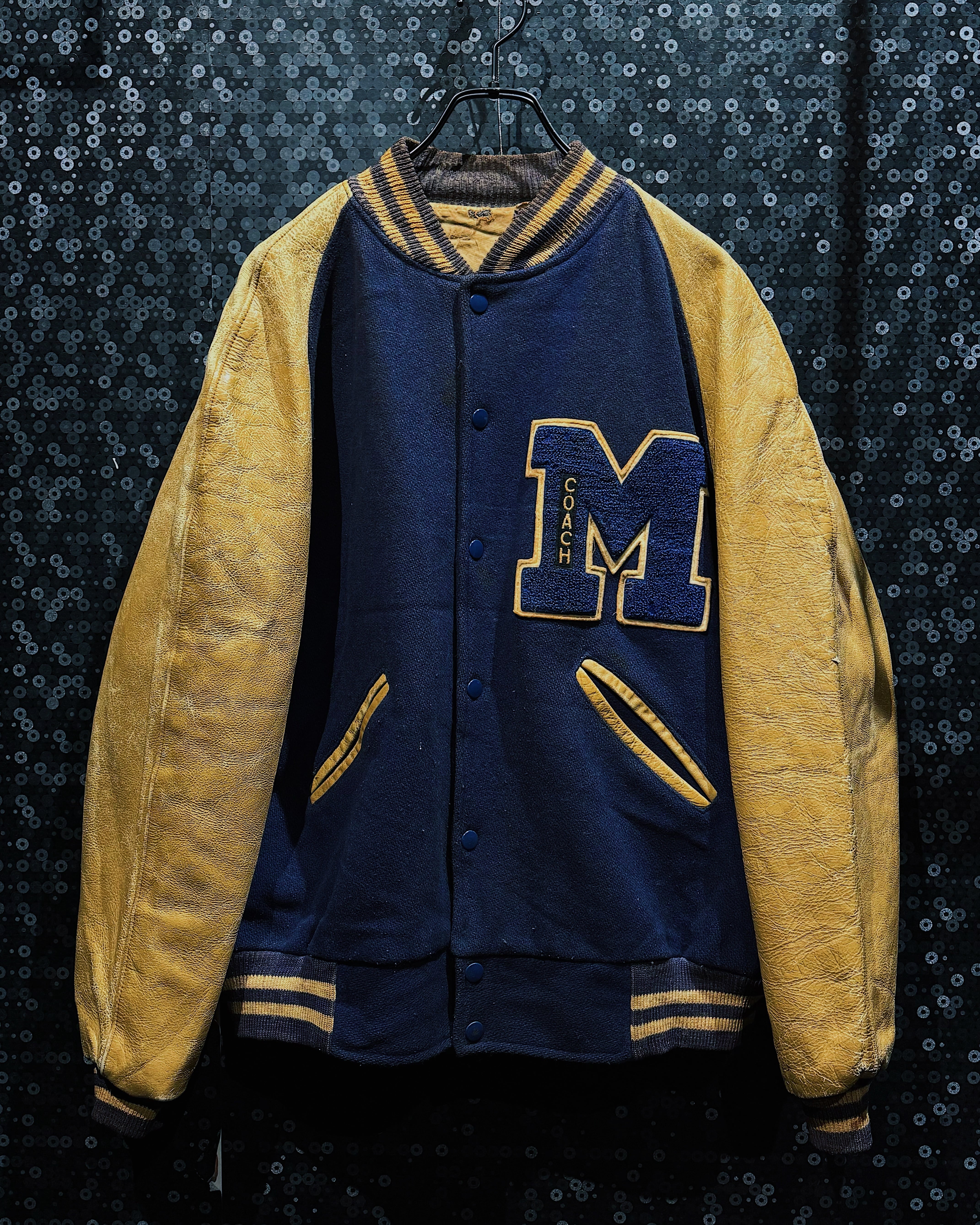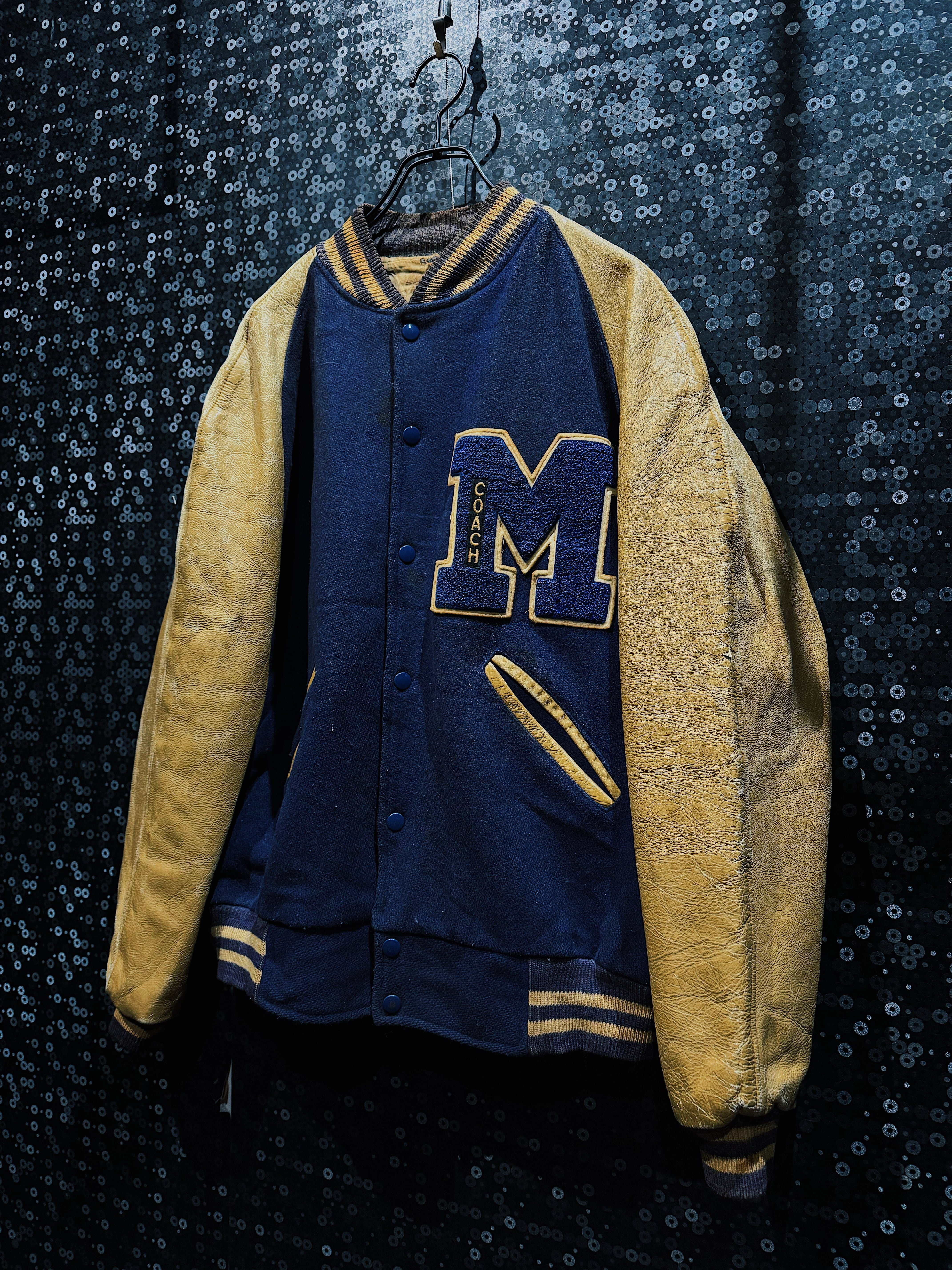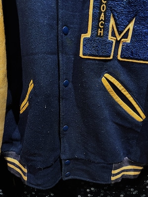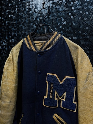 肉厚なネイビーカラーのウールボディに、マスタードイエローのレザースリーブを組み合わせた、クラシックな配色が際立つヴィンテージスタジアムジャケット。フロント左胸に配された大型の“M”サガラワッペンは、縁取りと立体感がしっかりと残る仕様で、縦に入る「COACH」の刺繍がチームウェア由来の背景を強く感じさせるディテールとなっている。