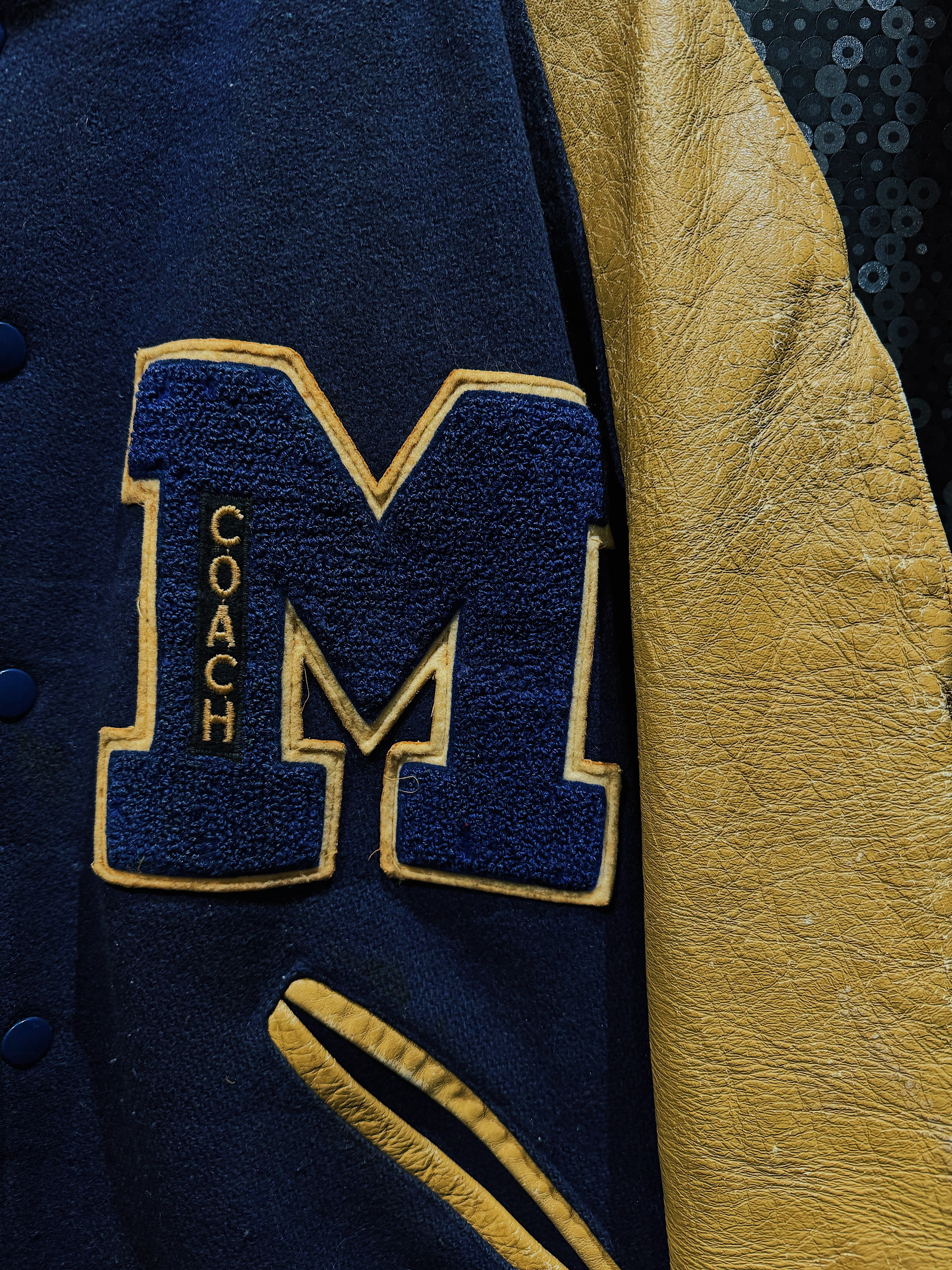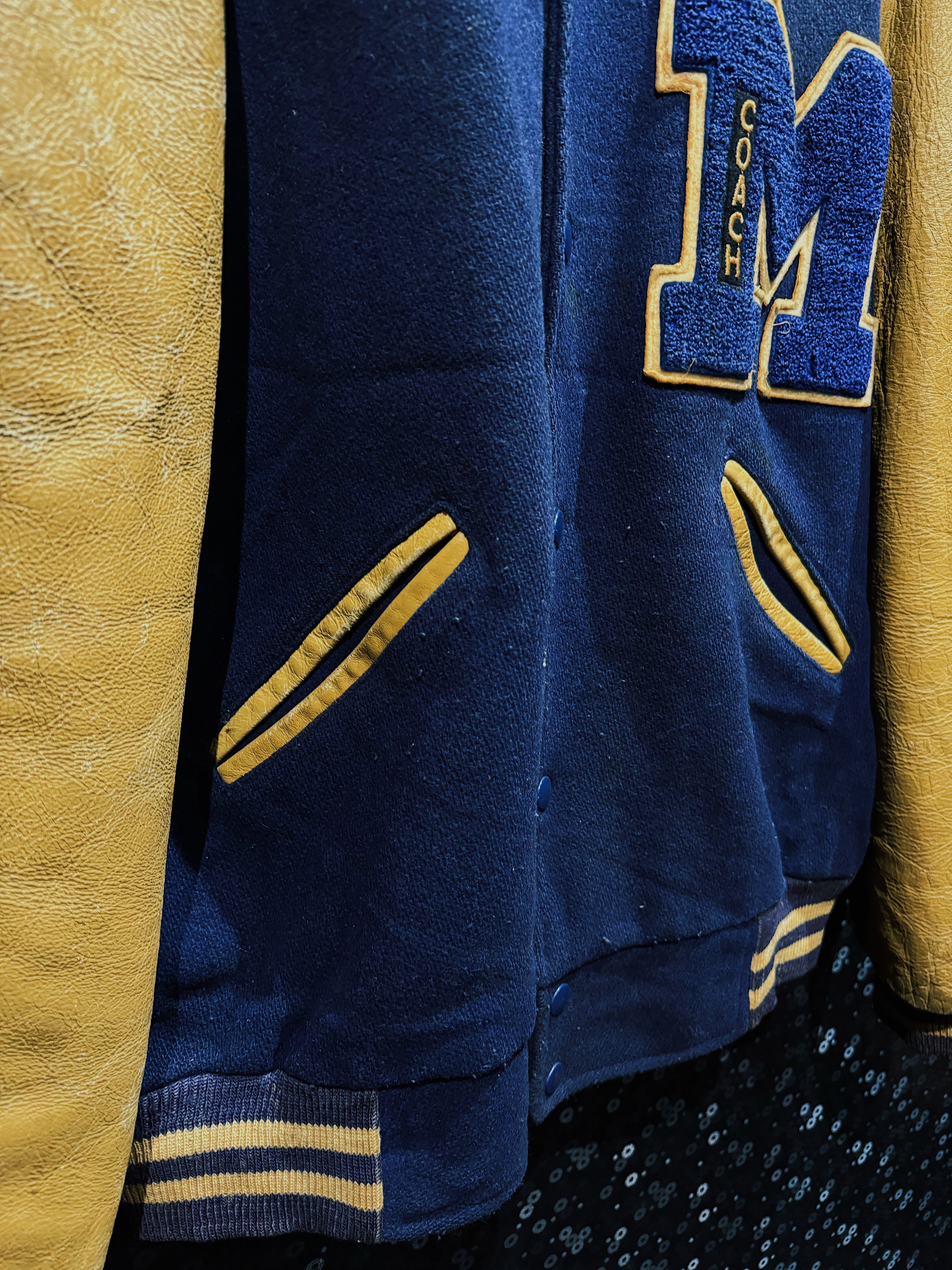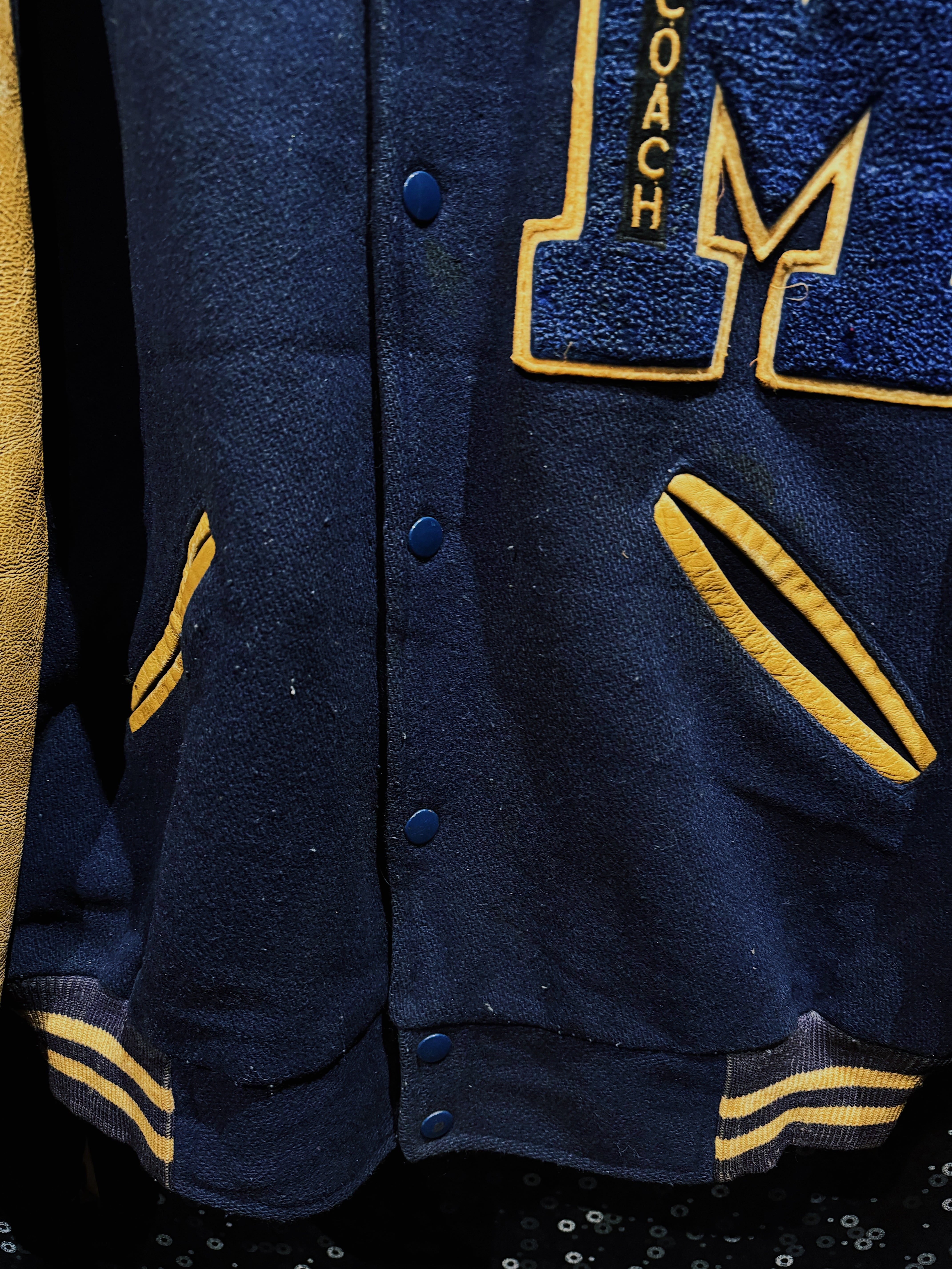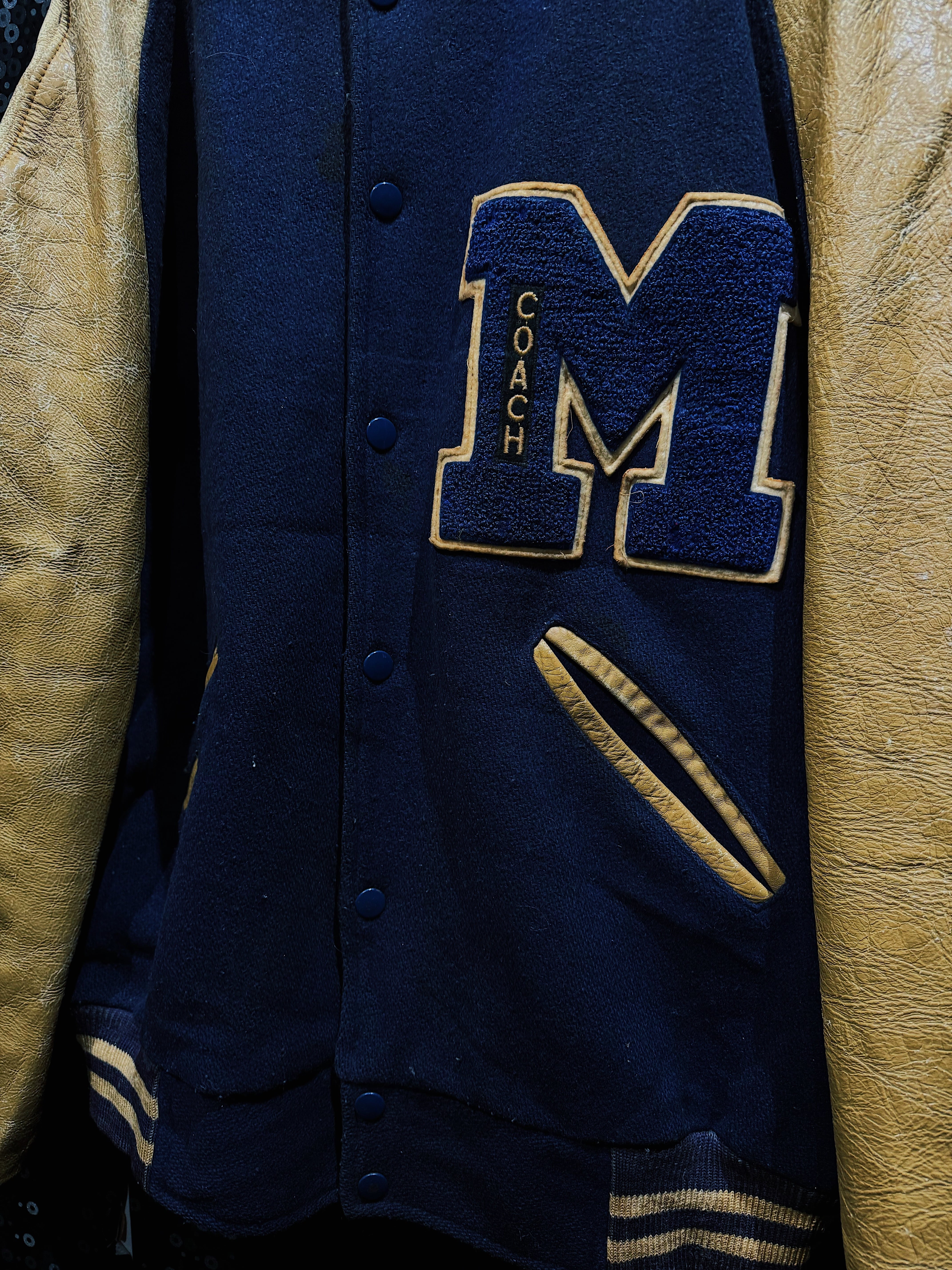 肉厚なネイビーカラーのウールボディに、マスタードイエローのレザースリーブを組み合わせた、クラシックな配色が際立つヴィンテージスタジアムジャケット。フロント左胸に配された大型の“M”サガラワッペンは、縁取りと立体感がしっかりと残る仕様で、縦に入る「COACH」の刺繍がチームウェア由来の背景を強く感じさせるディテールとなっている。