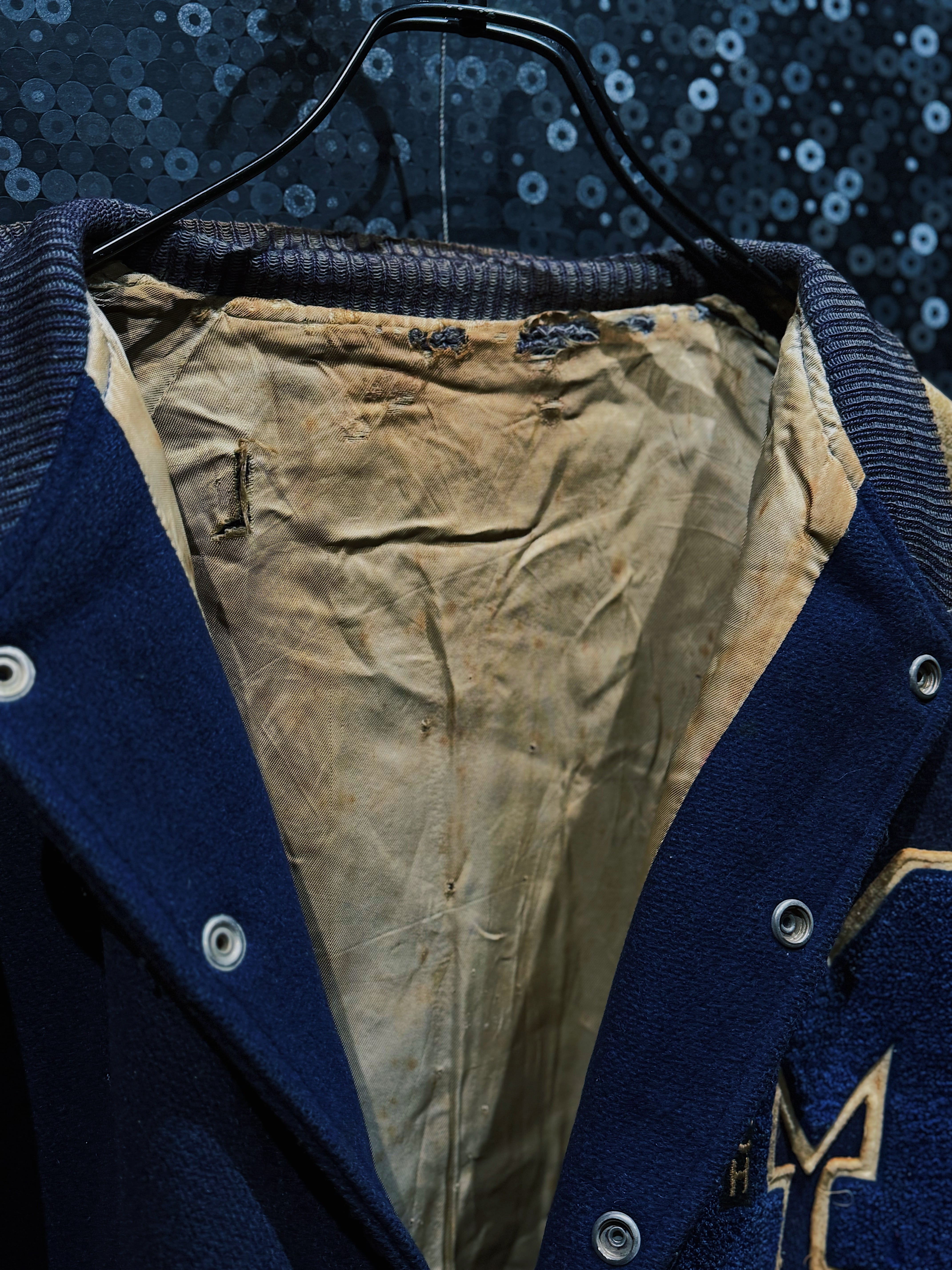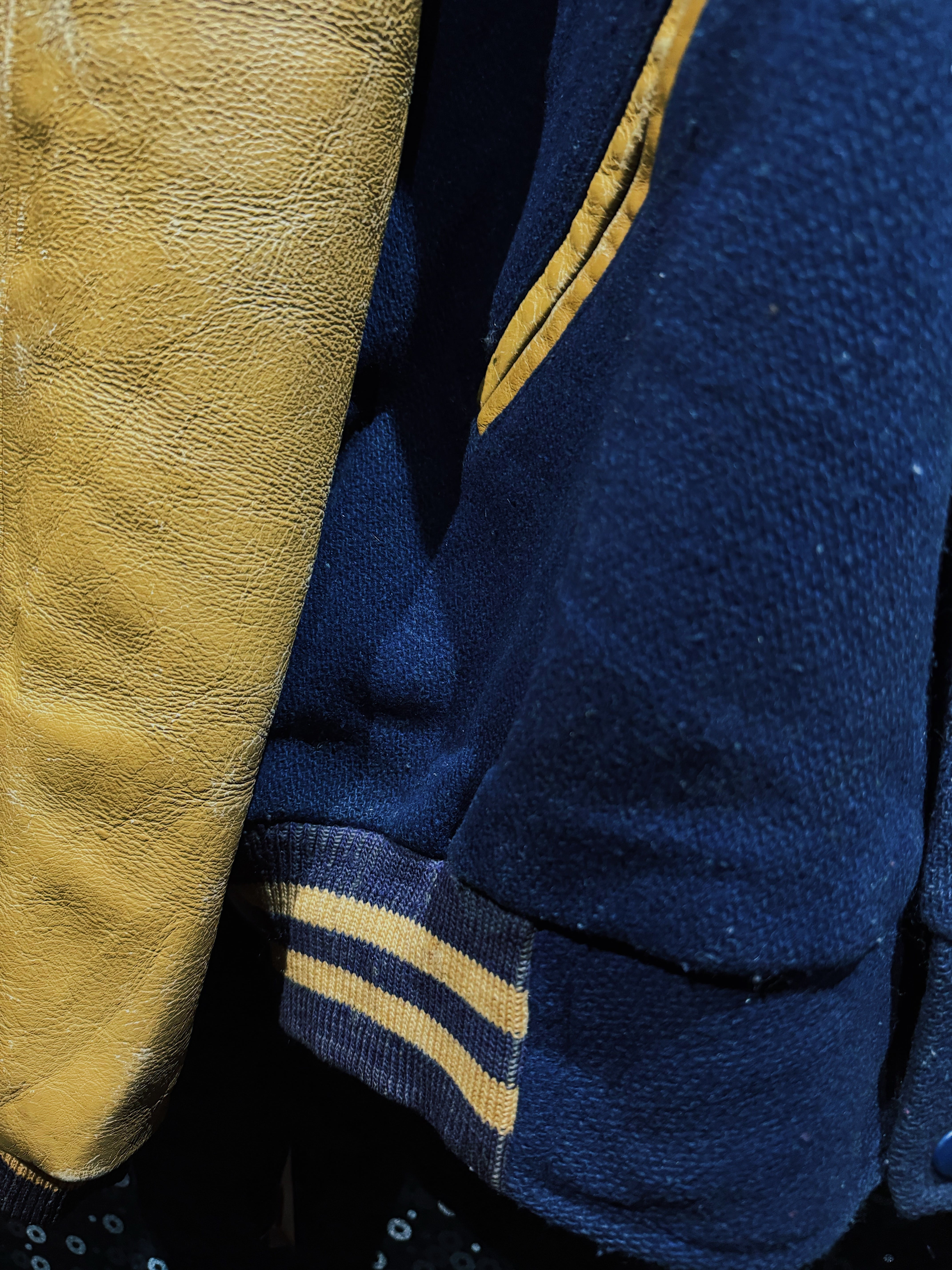 袖部分には厚みのあるリアルレザーが使用され、長年の着用によって刻まれたシワや色ムラ、柔らかくなった質感が一着ごとの個性として表情を形成。リブはネック・袖・裾すべてにライン入りの編み立てが施され、スナップボタンやポケットのレザーパイピングなど、当時のスタジャンらしい作り込みも健在。
