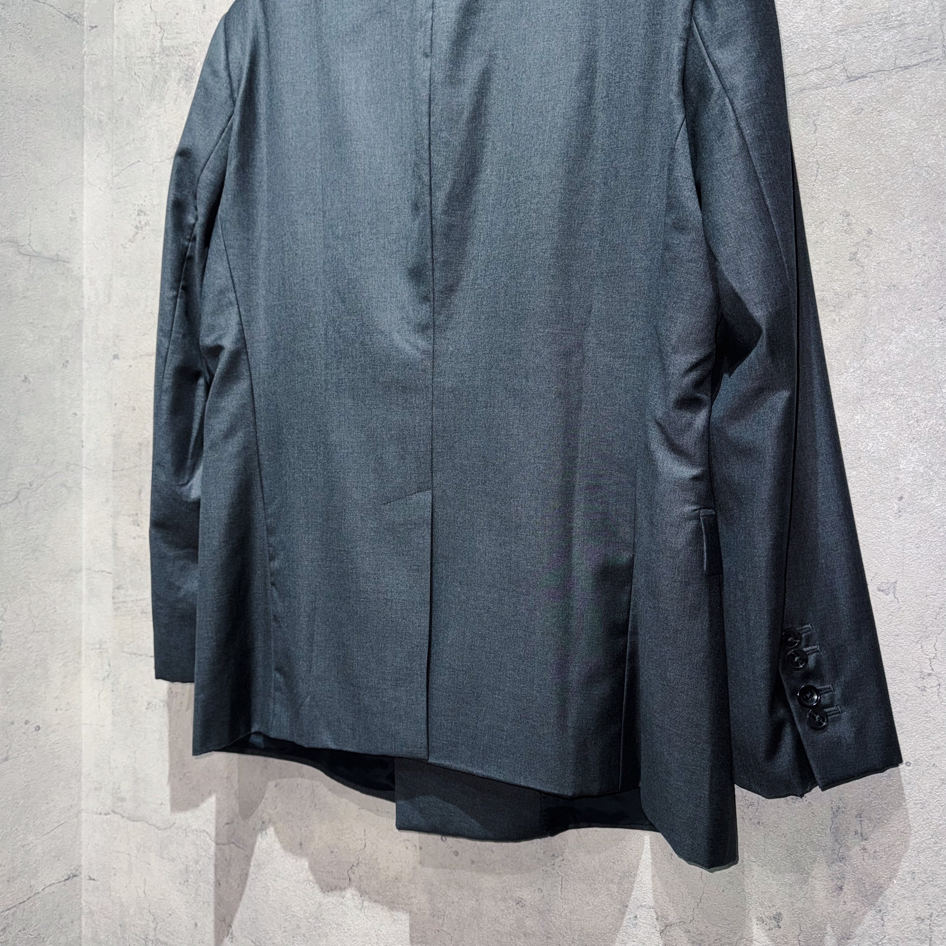 シルバーグレーを身に纏ったクラシックな佇まい。アルマーニらしいクラシカルな佇まいの2ピース。今回ジャケットはダブルブレストでご用意。