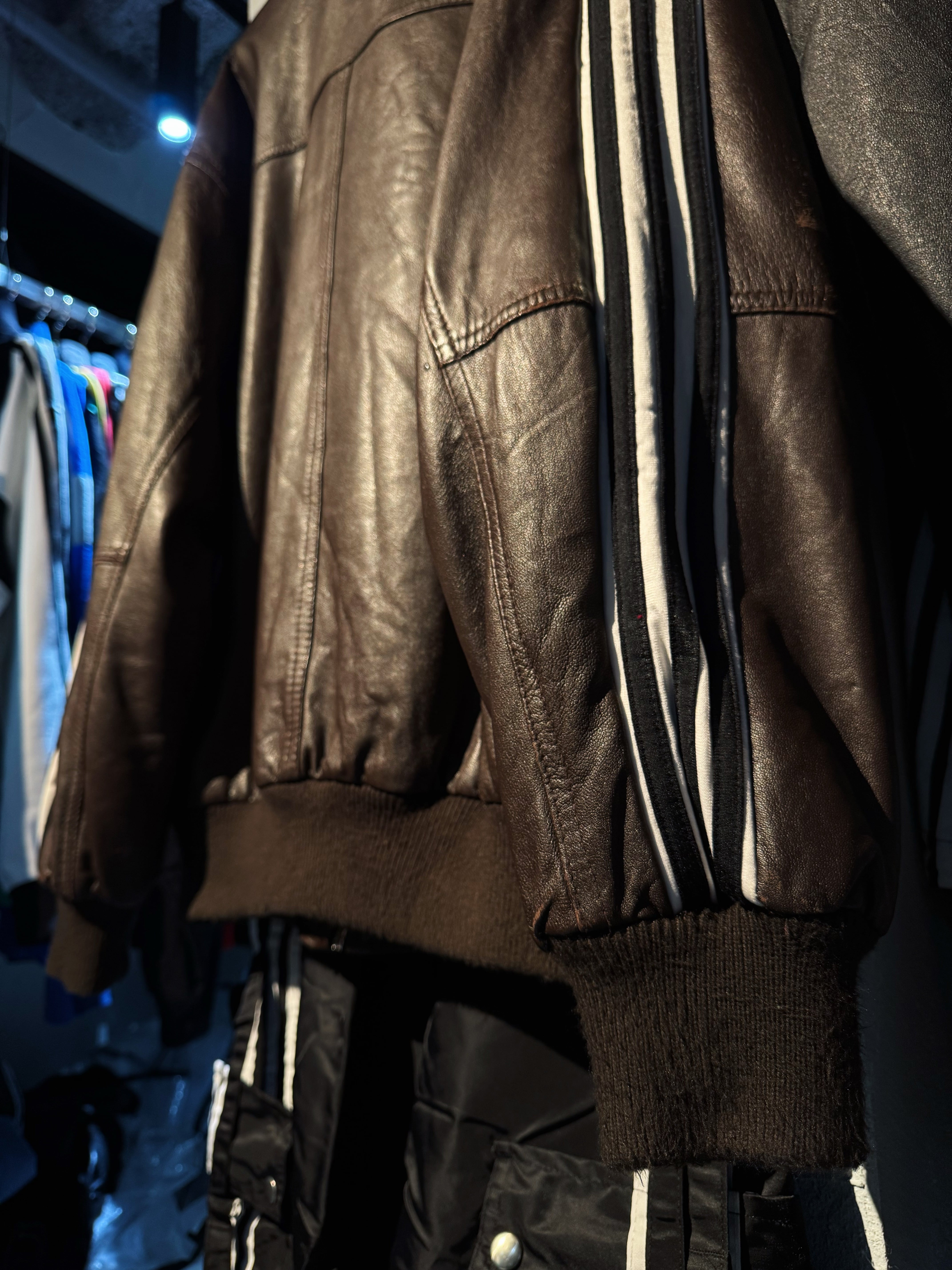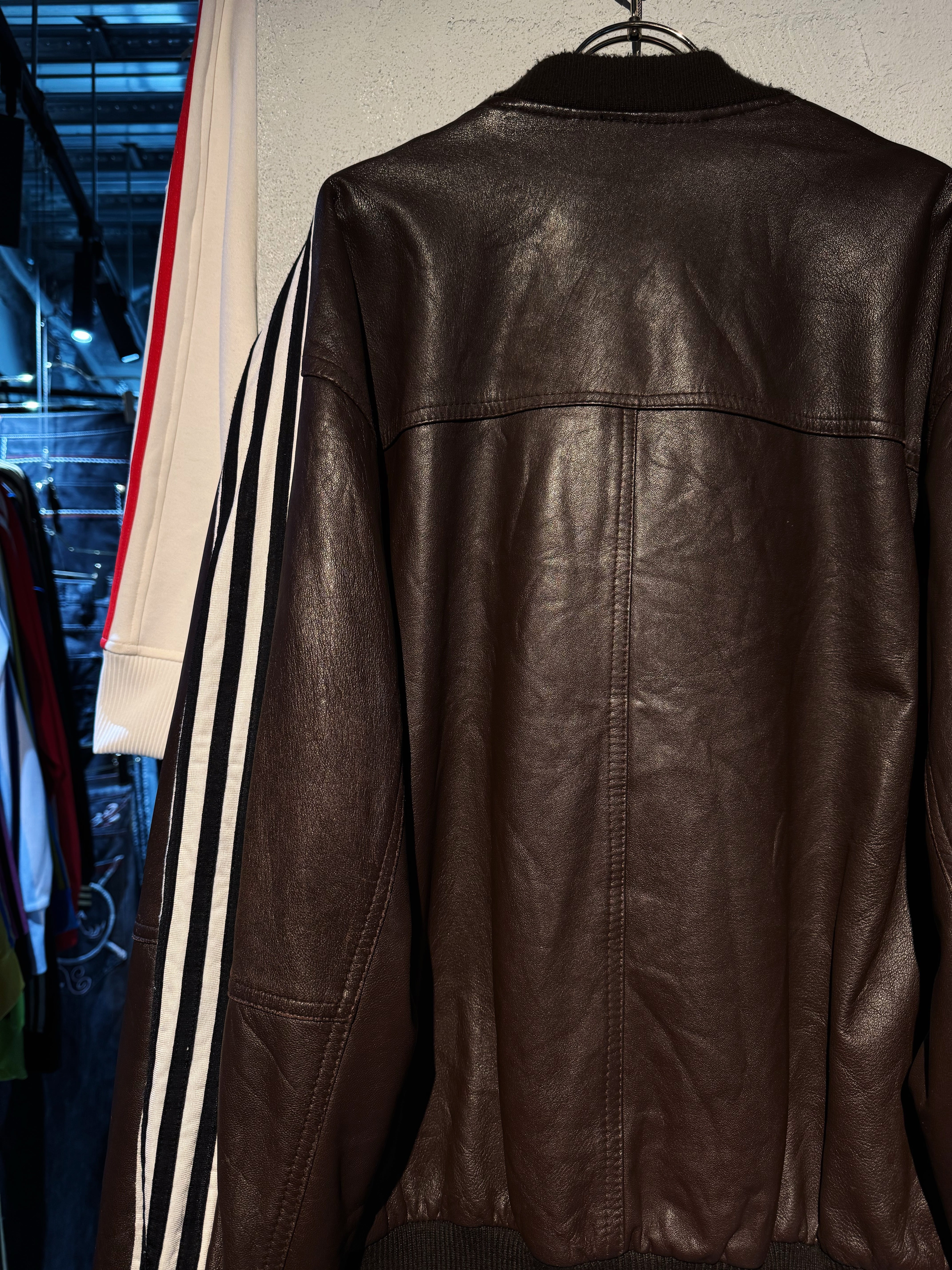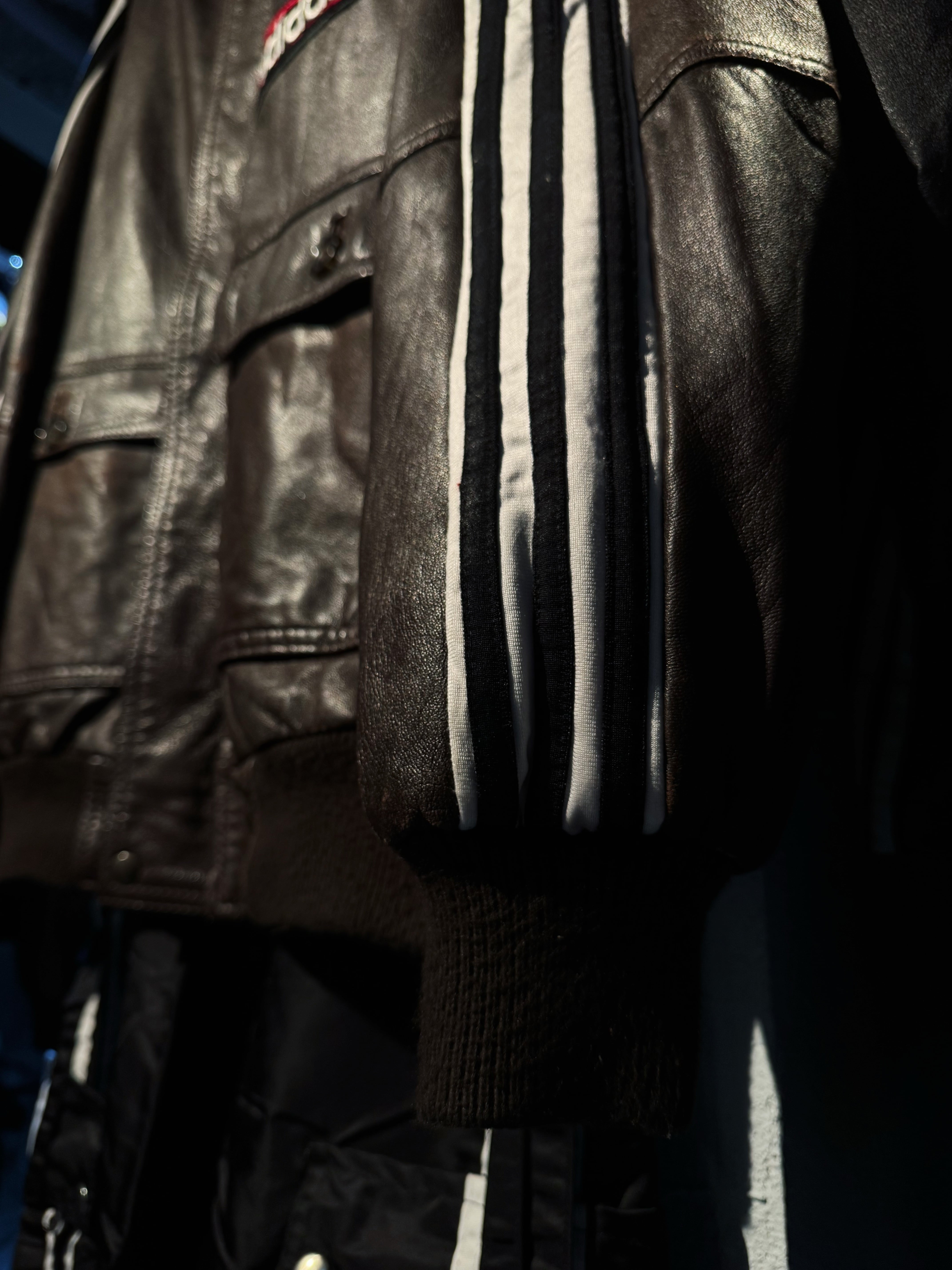 ハリがありモッチモチのレザージャケットにシティーポップでハイストリートなadidasのスリーストライプの上質なトラックテキスタイルを"融合"させてハイモード×ハイストリートなアイテムに。