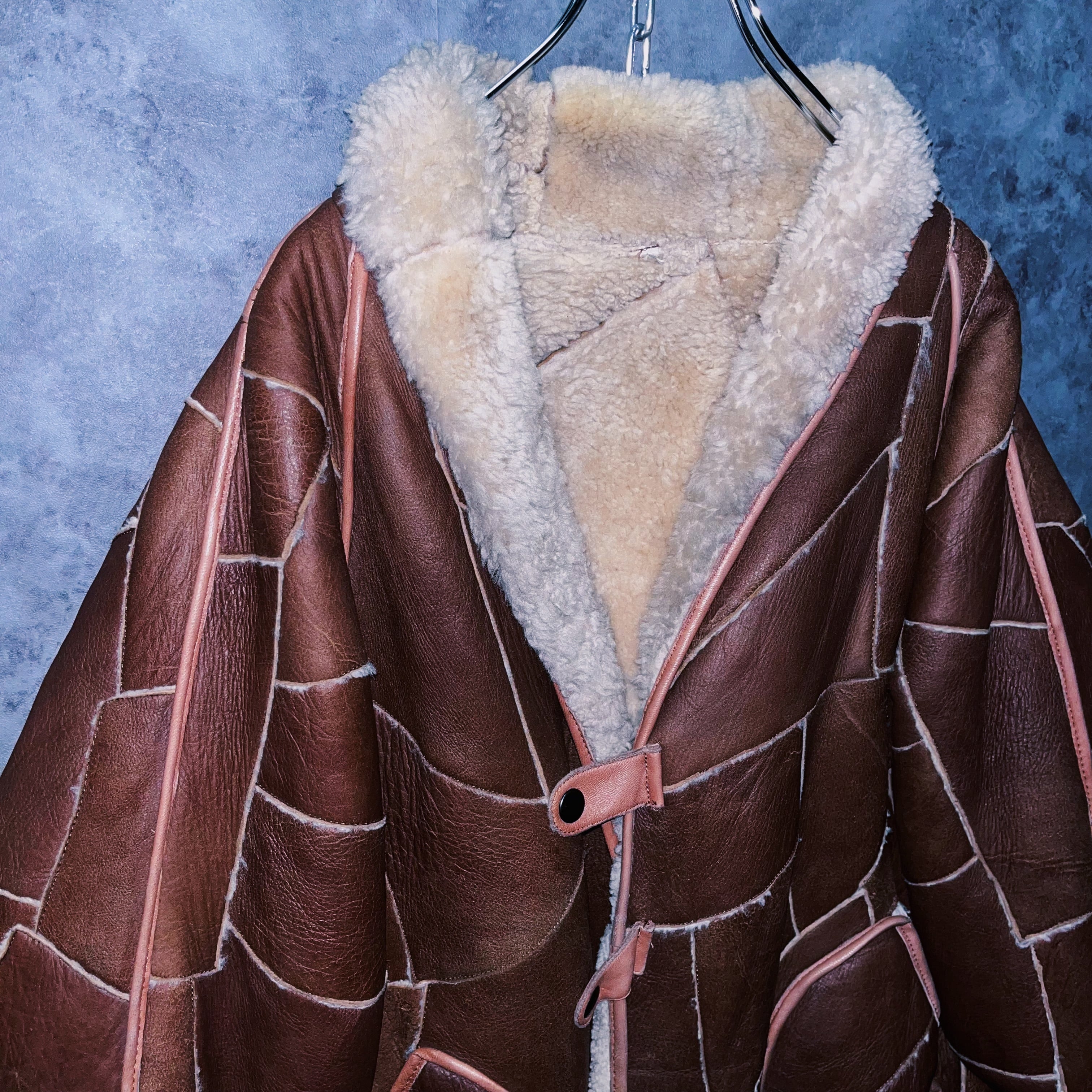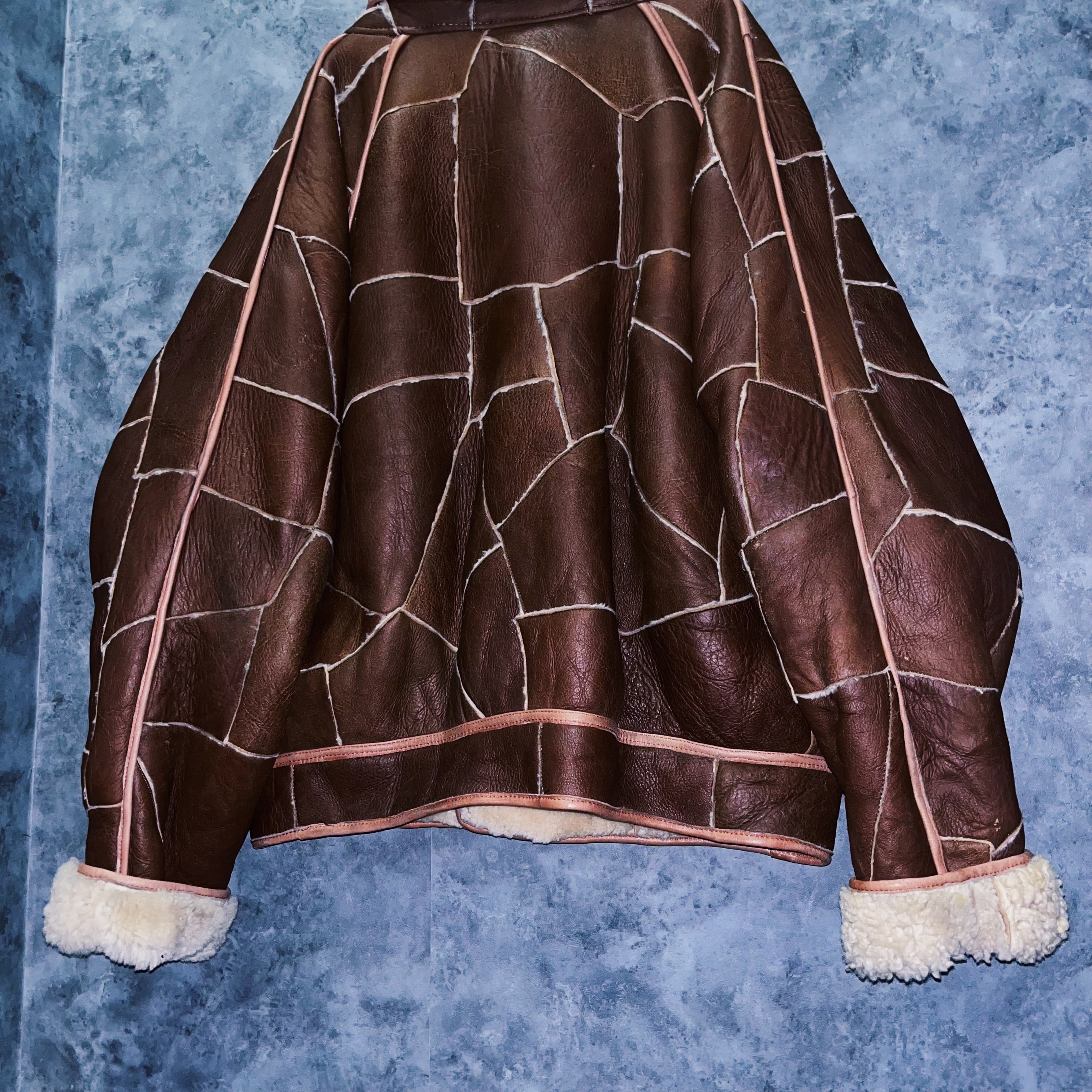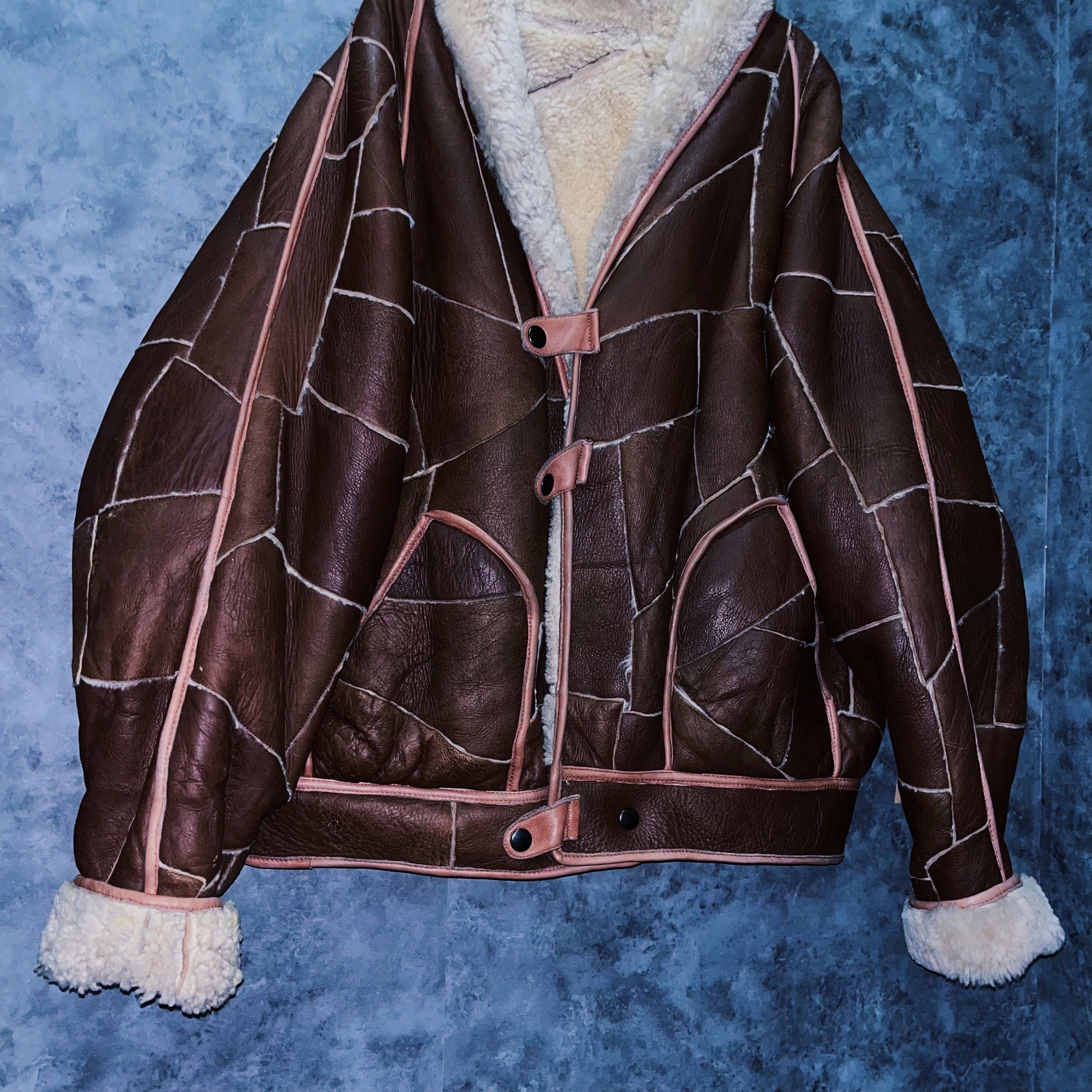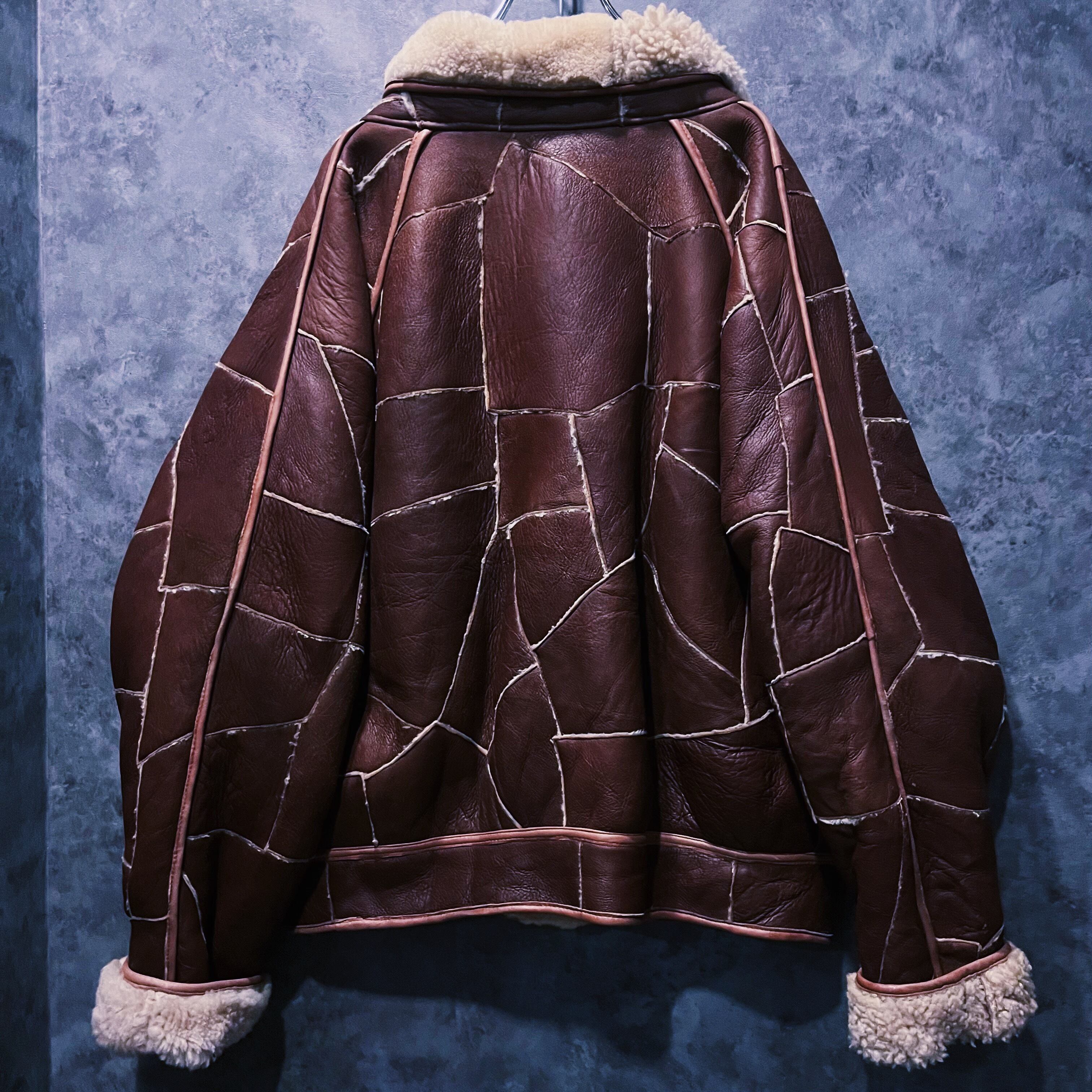クラシカルなブラウンレザーをツギハギにデザインし、裏地にはふわふわのボアを施した一枚。