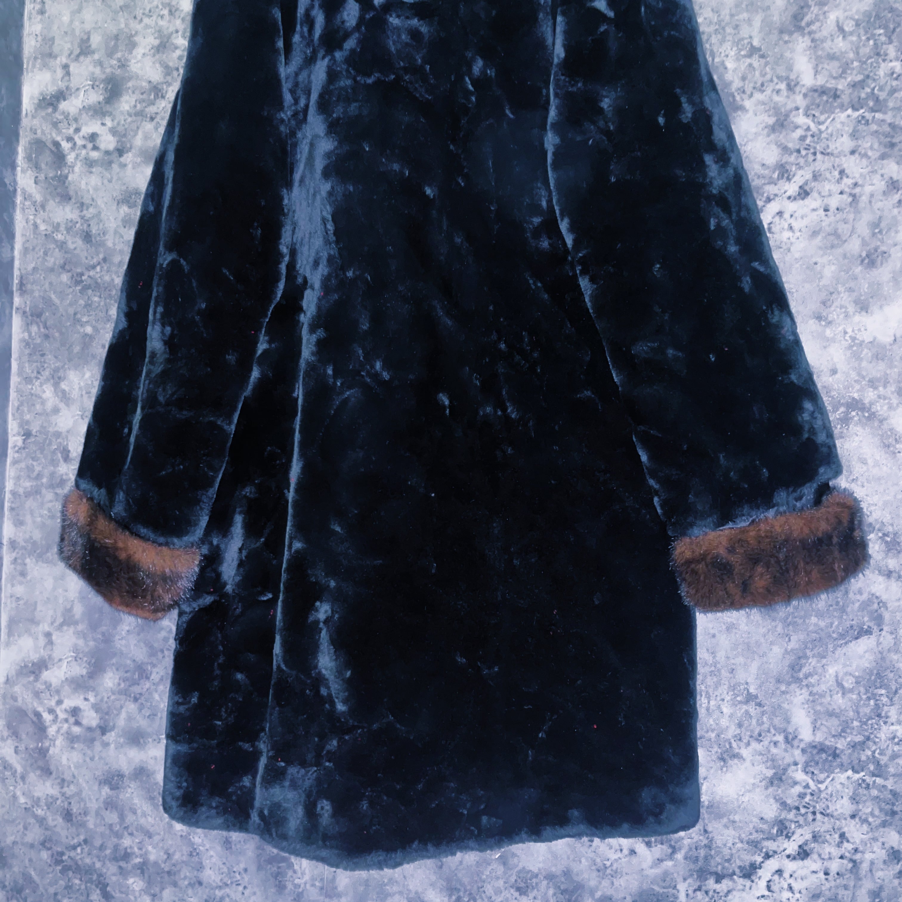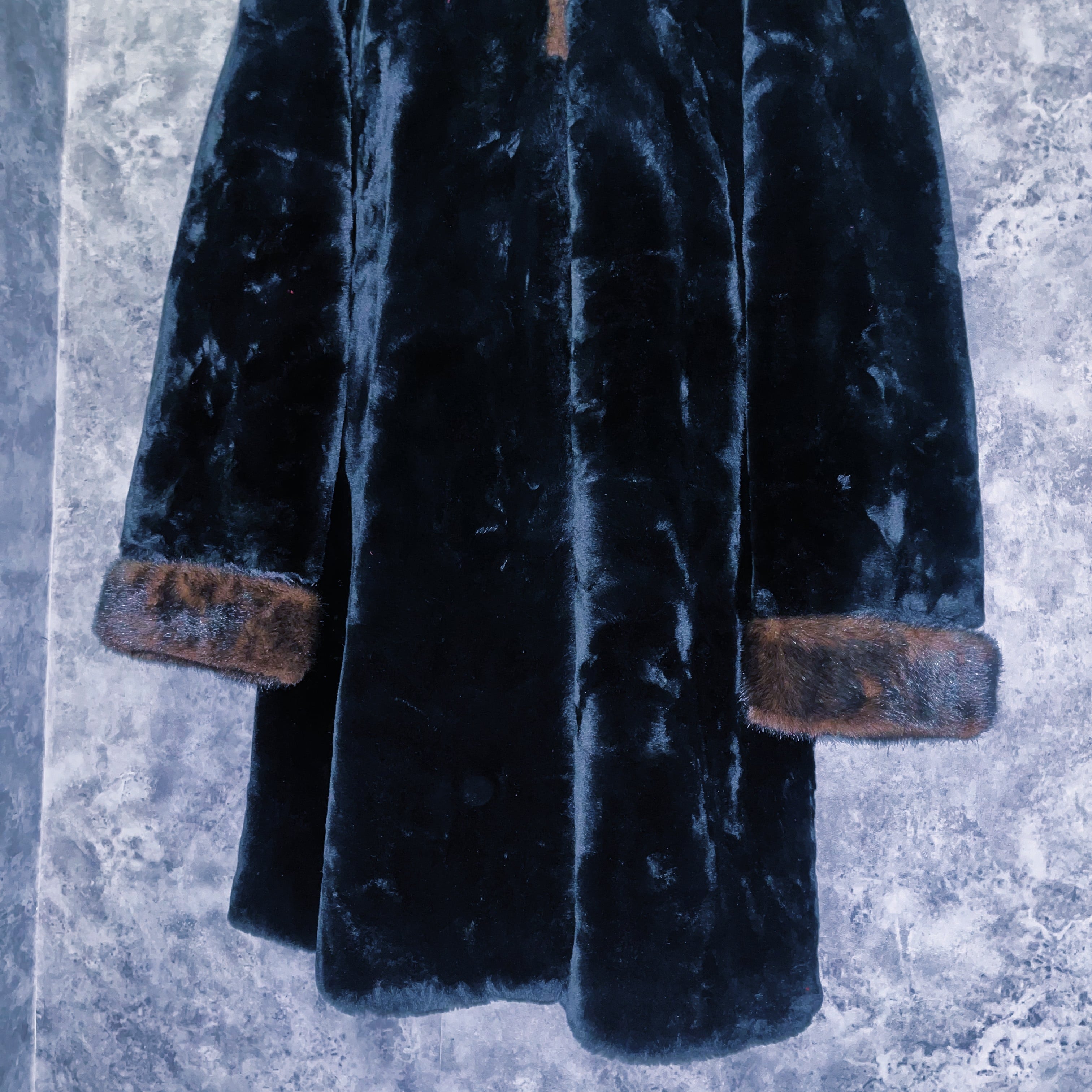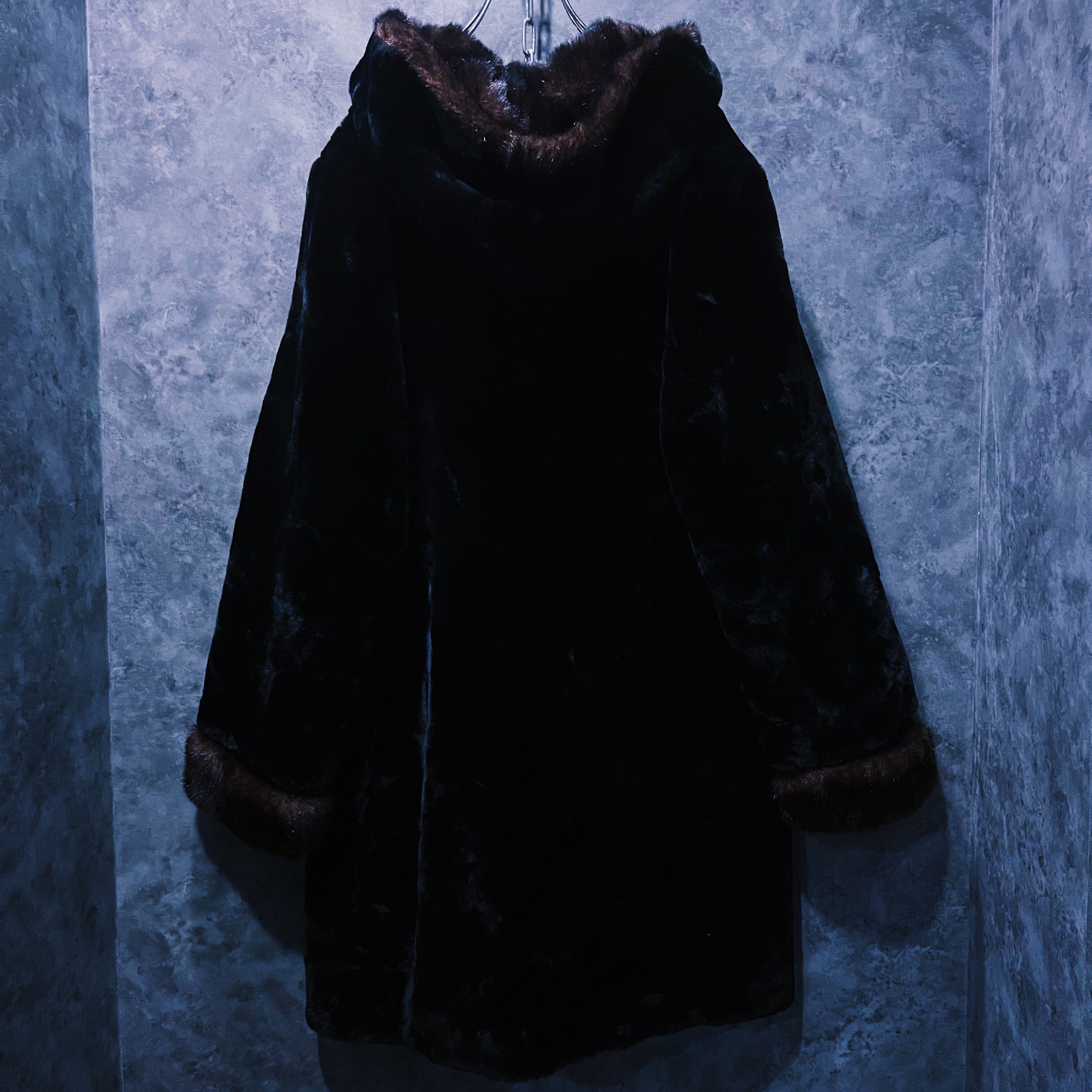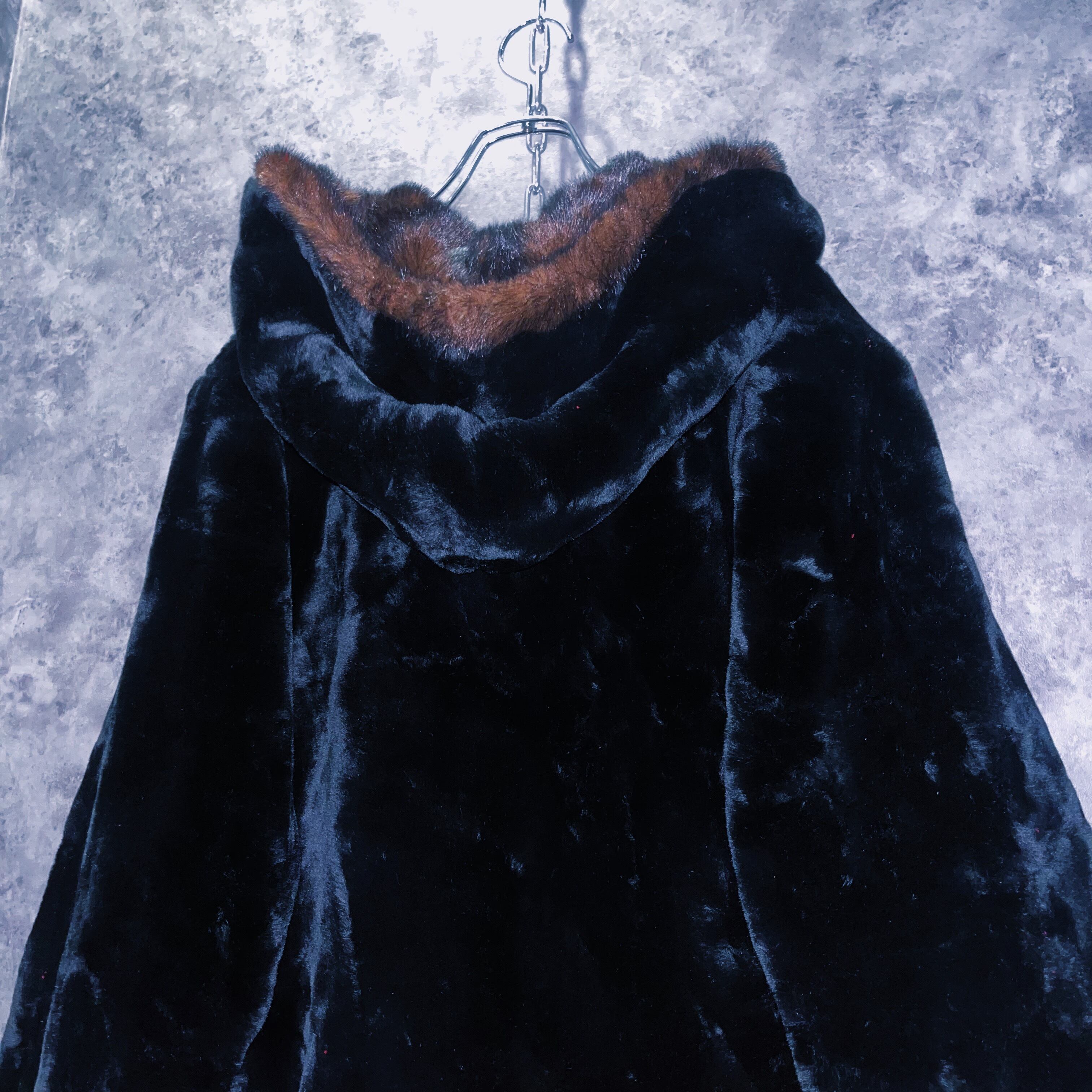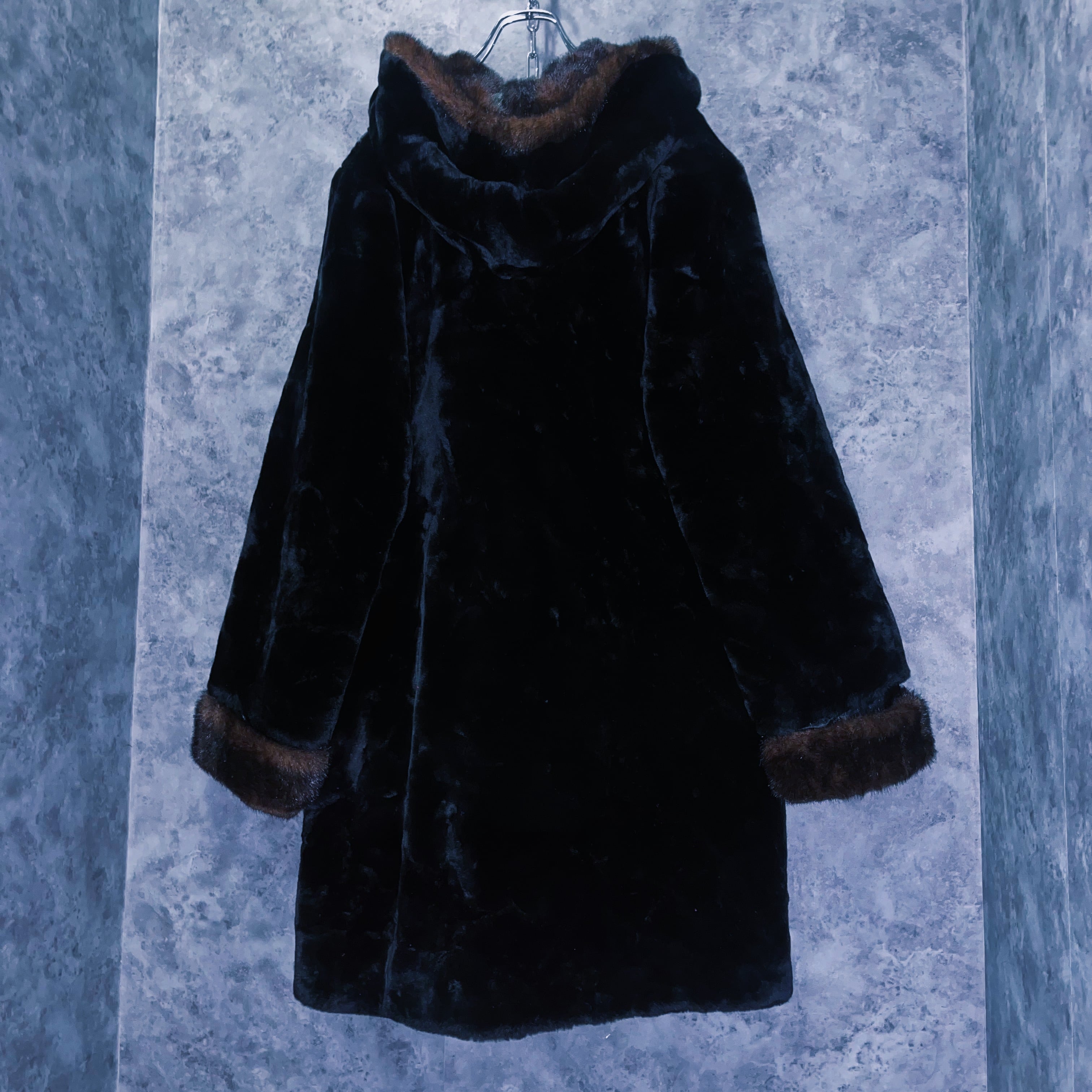 全体を艶やかなファーで覆い、手元やフーディにはフォックスファーを模した毛皮がスイッチングデザインされた一枚。