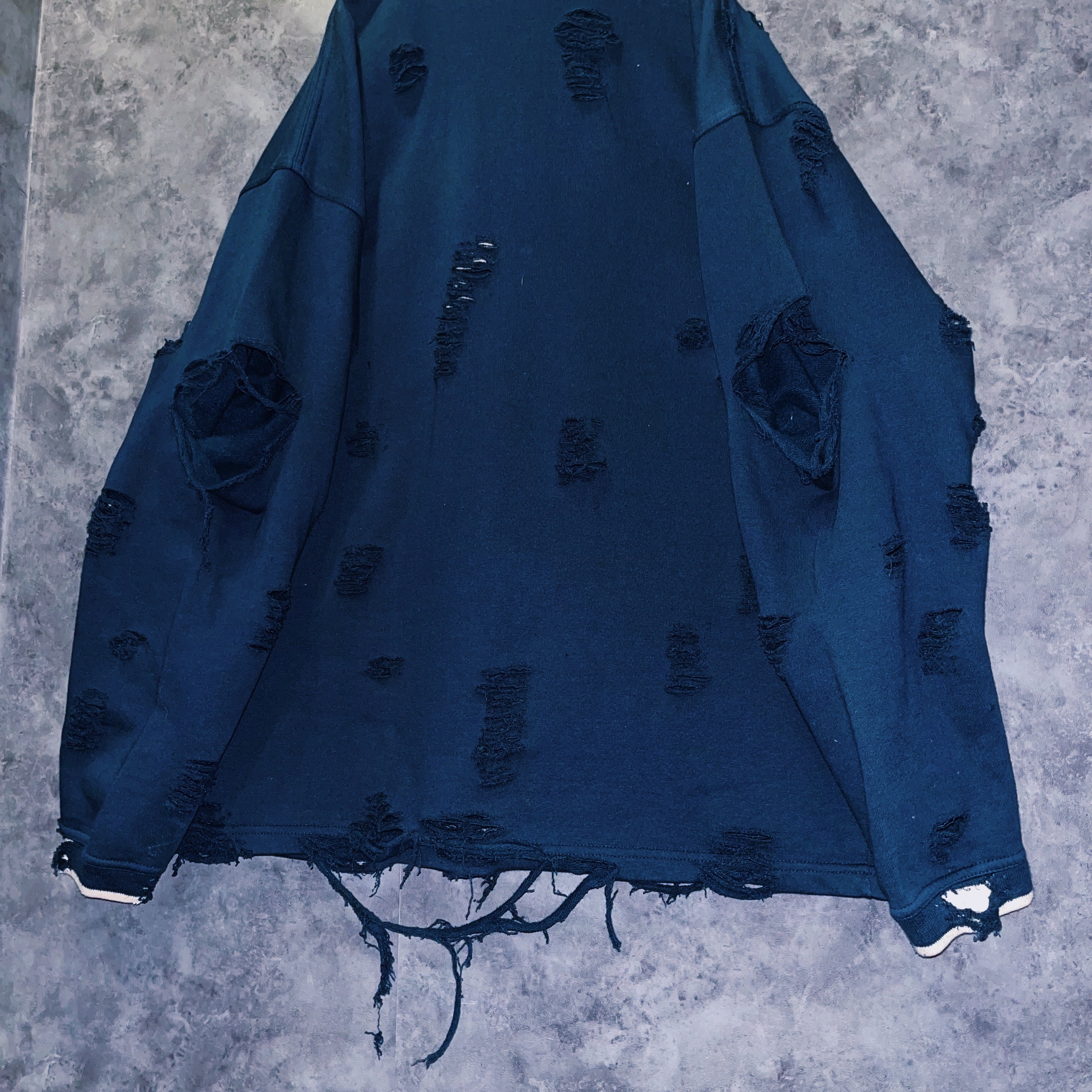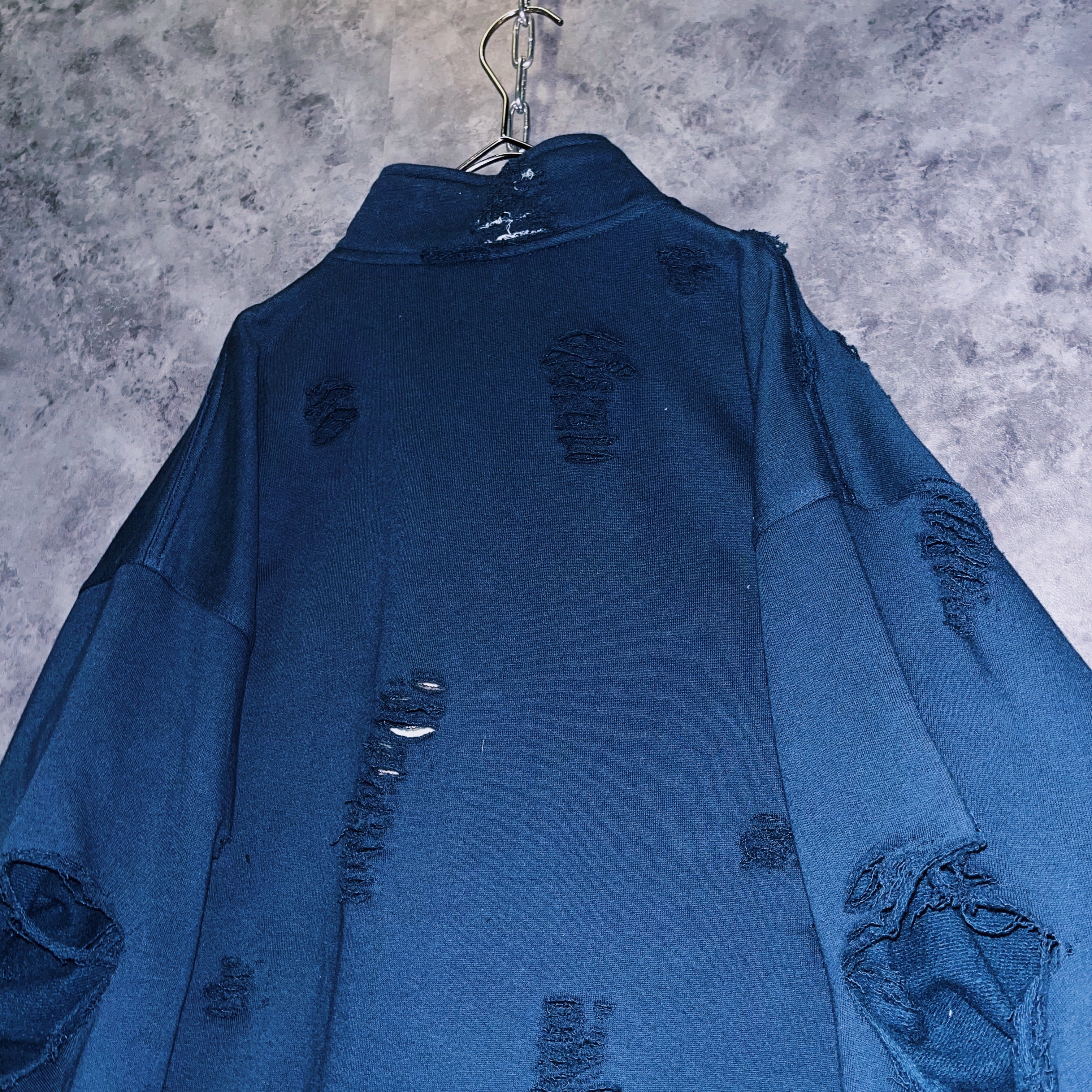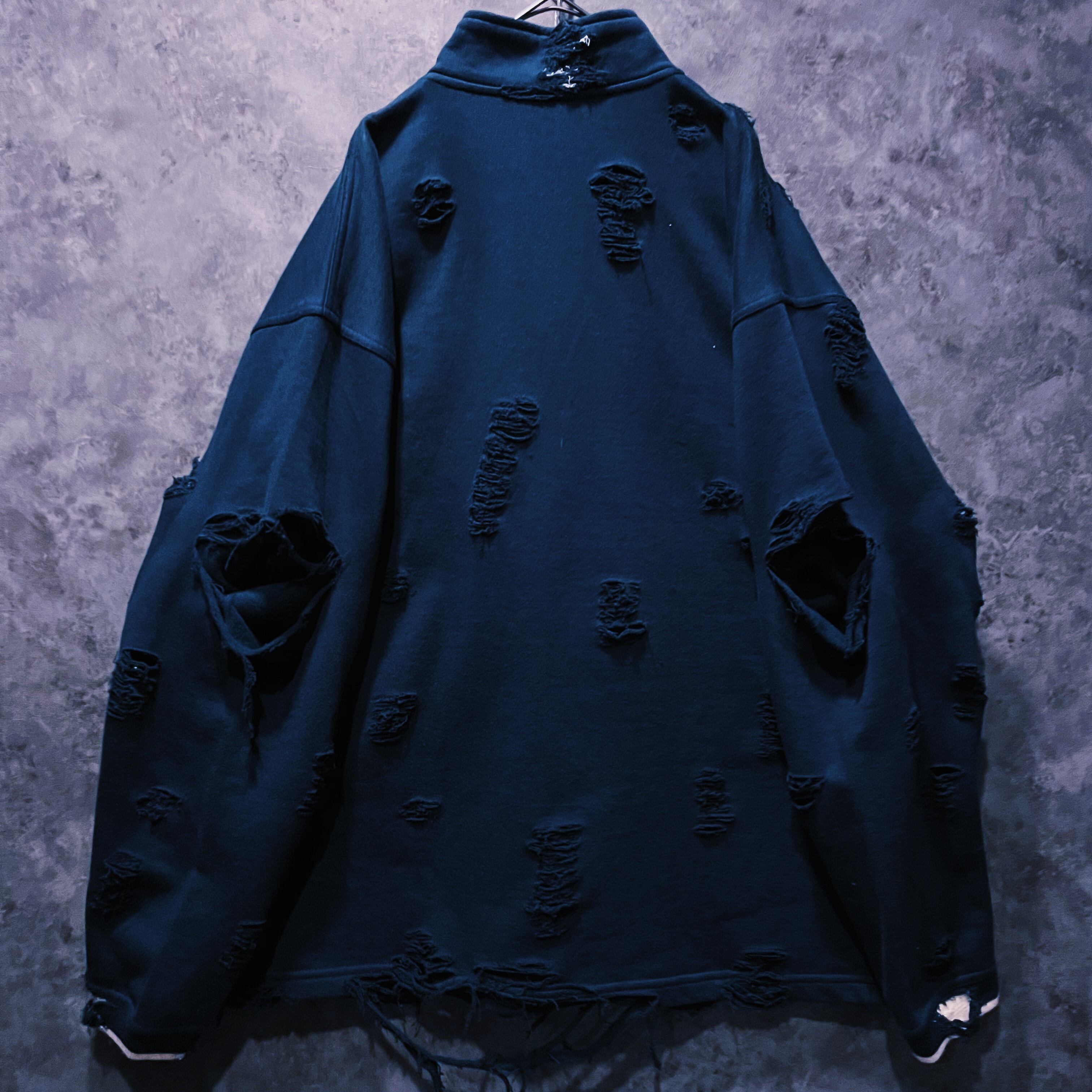 全体的に柔らかい印象のアイテムに当店自慢のグランジカスタムを施したことでエッジの効いたデザインに。一気に引き締まったインパクトと、ハーフジップのスタンドネックが抜群の相性。モードな雰囲気をありありと楽しめる完成度。