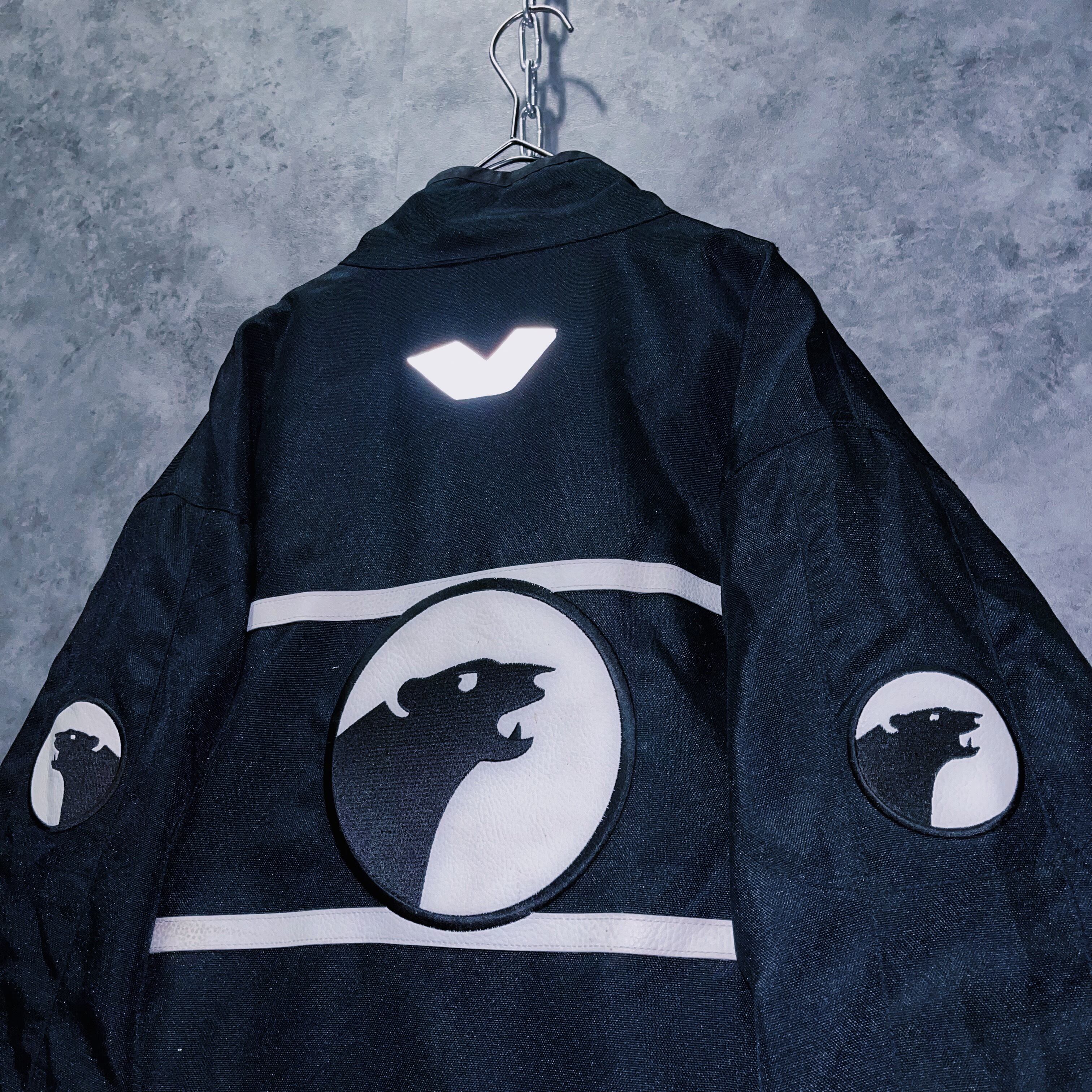 モノトーンカラーで構成されたシンプルなデザインに大きくロゴブランドを施したモーターサイクルジャケット