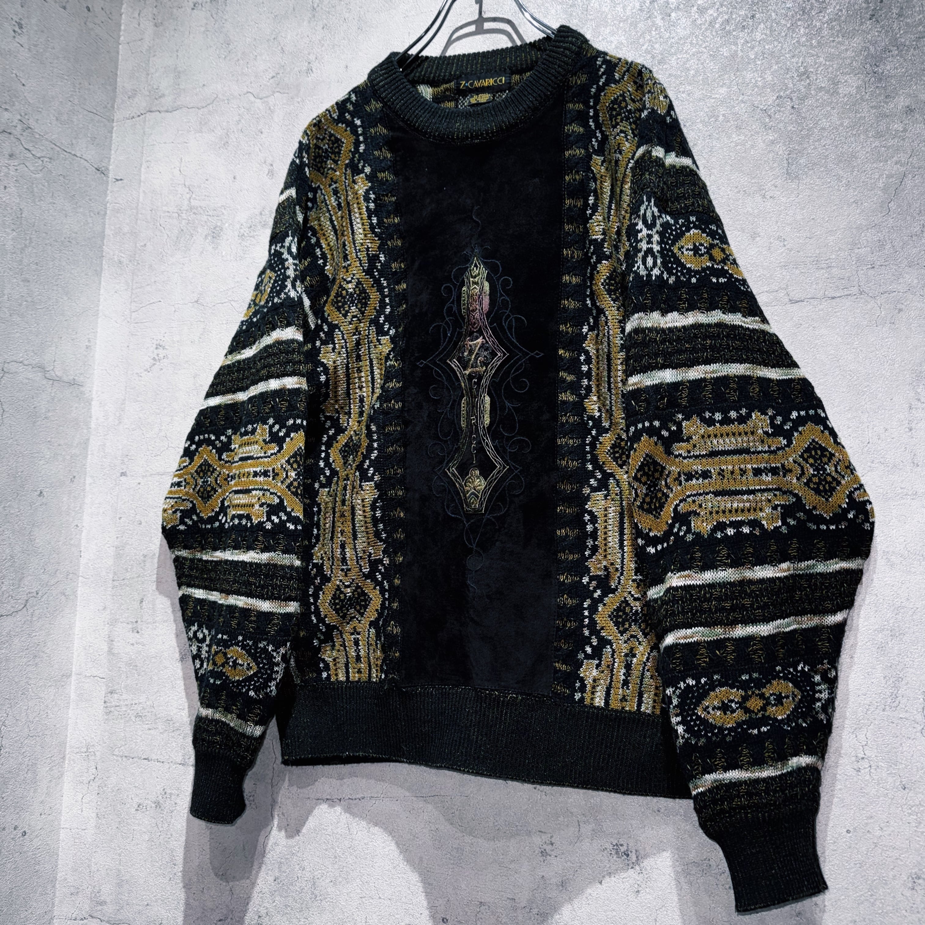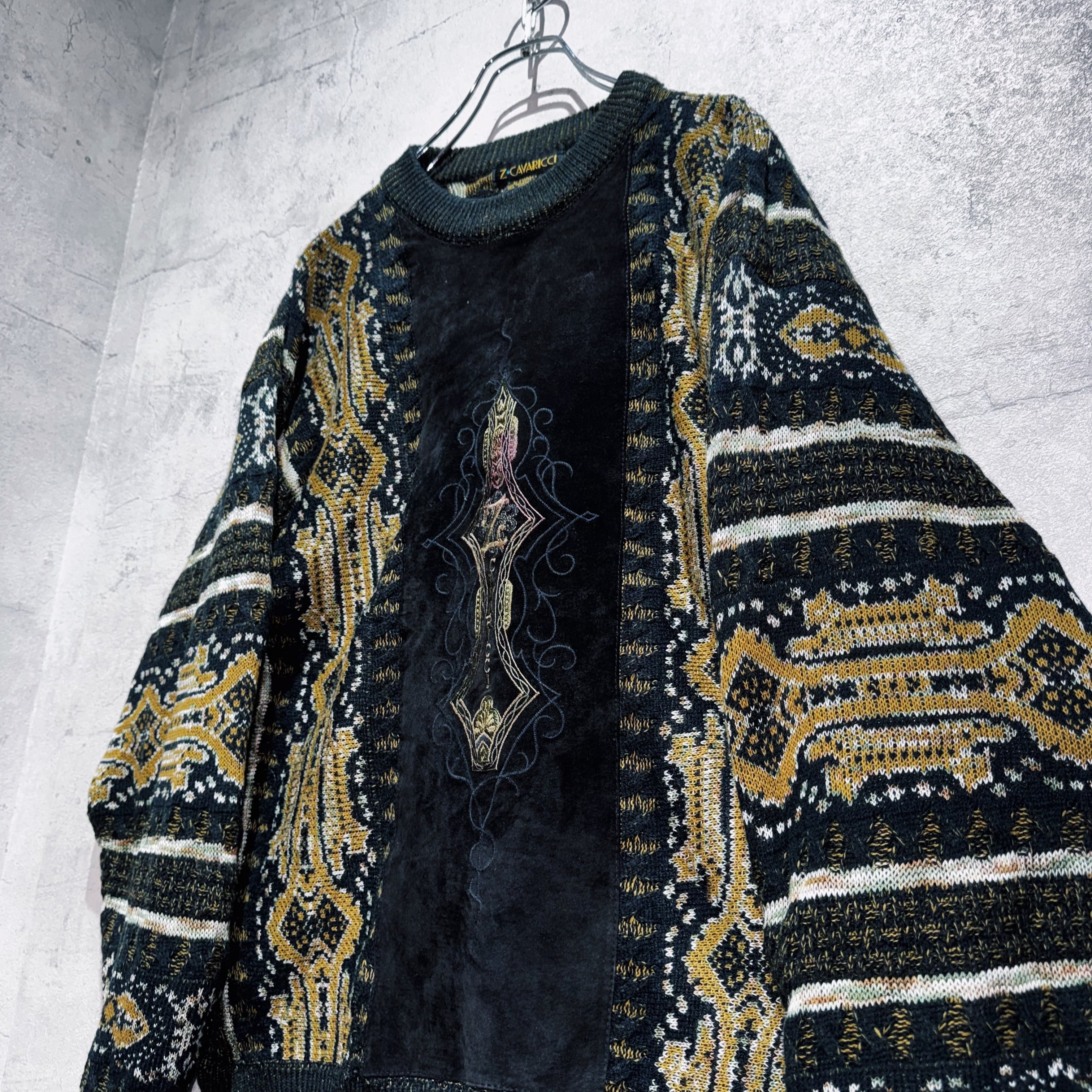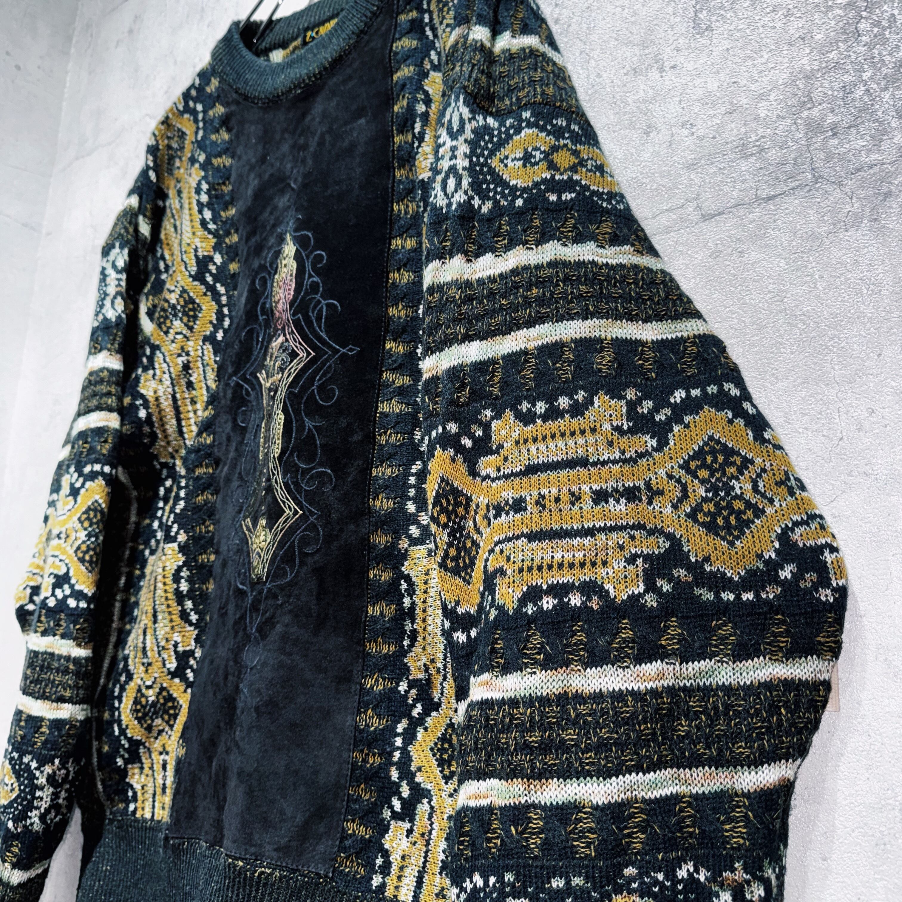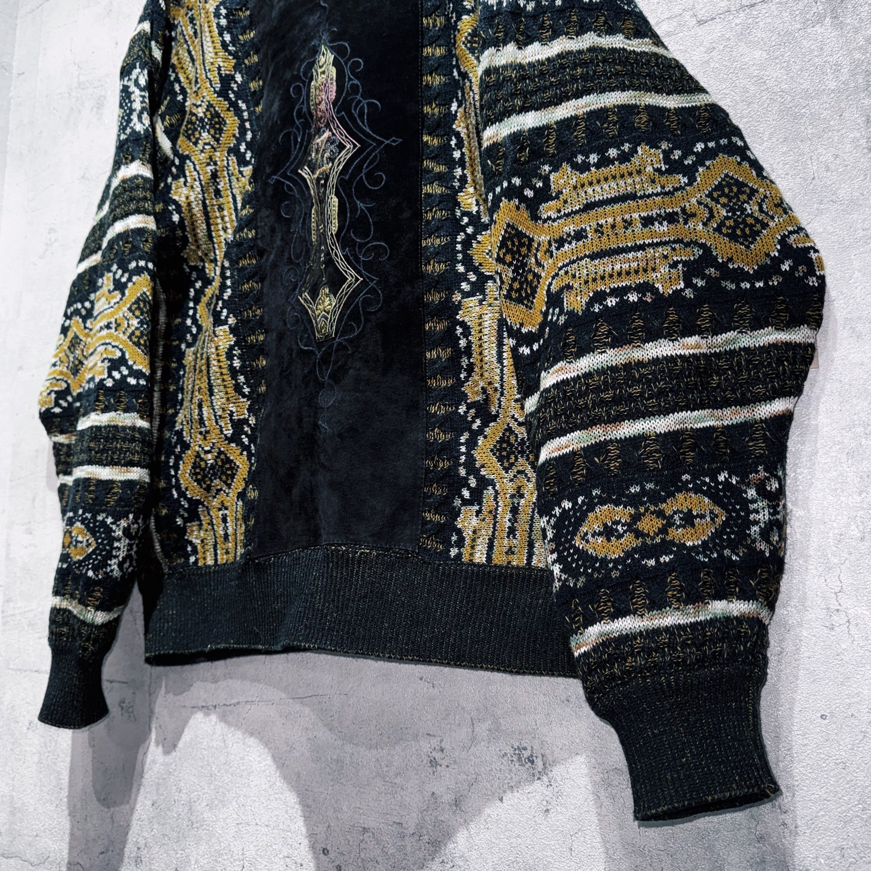 ヴィンテージスエードマテリアルスイッチングデザイントライバルパターンニット