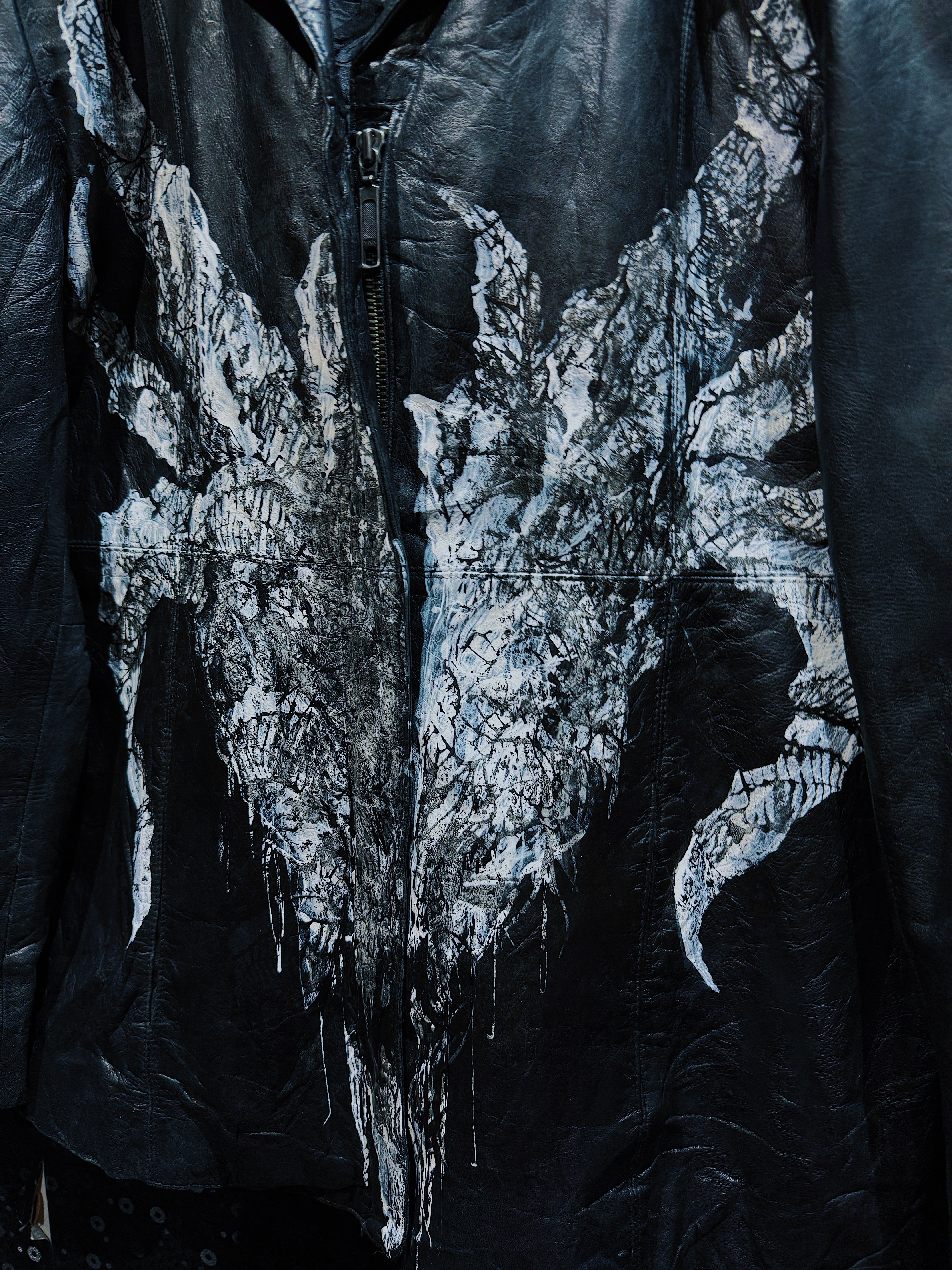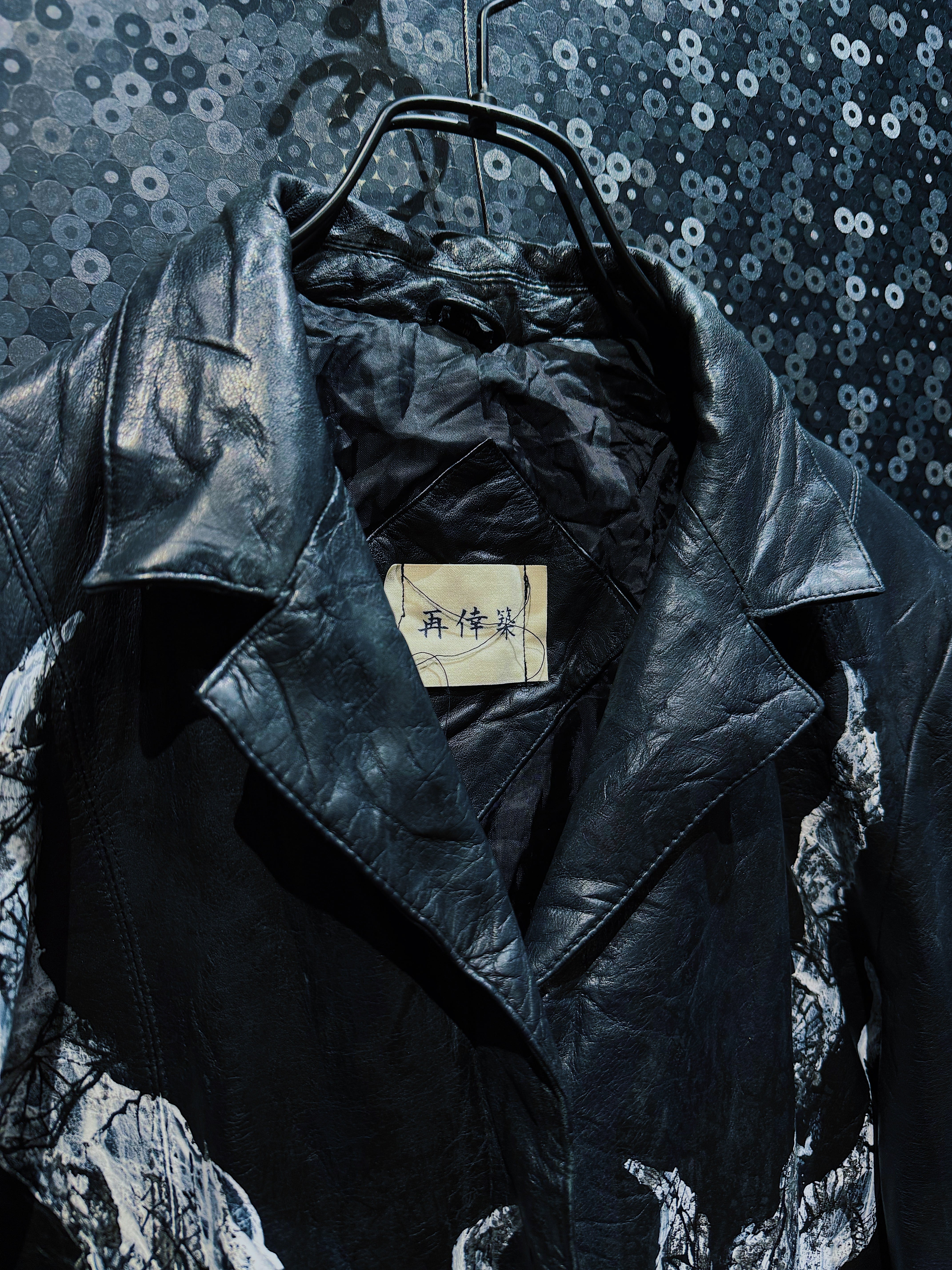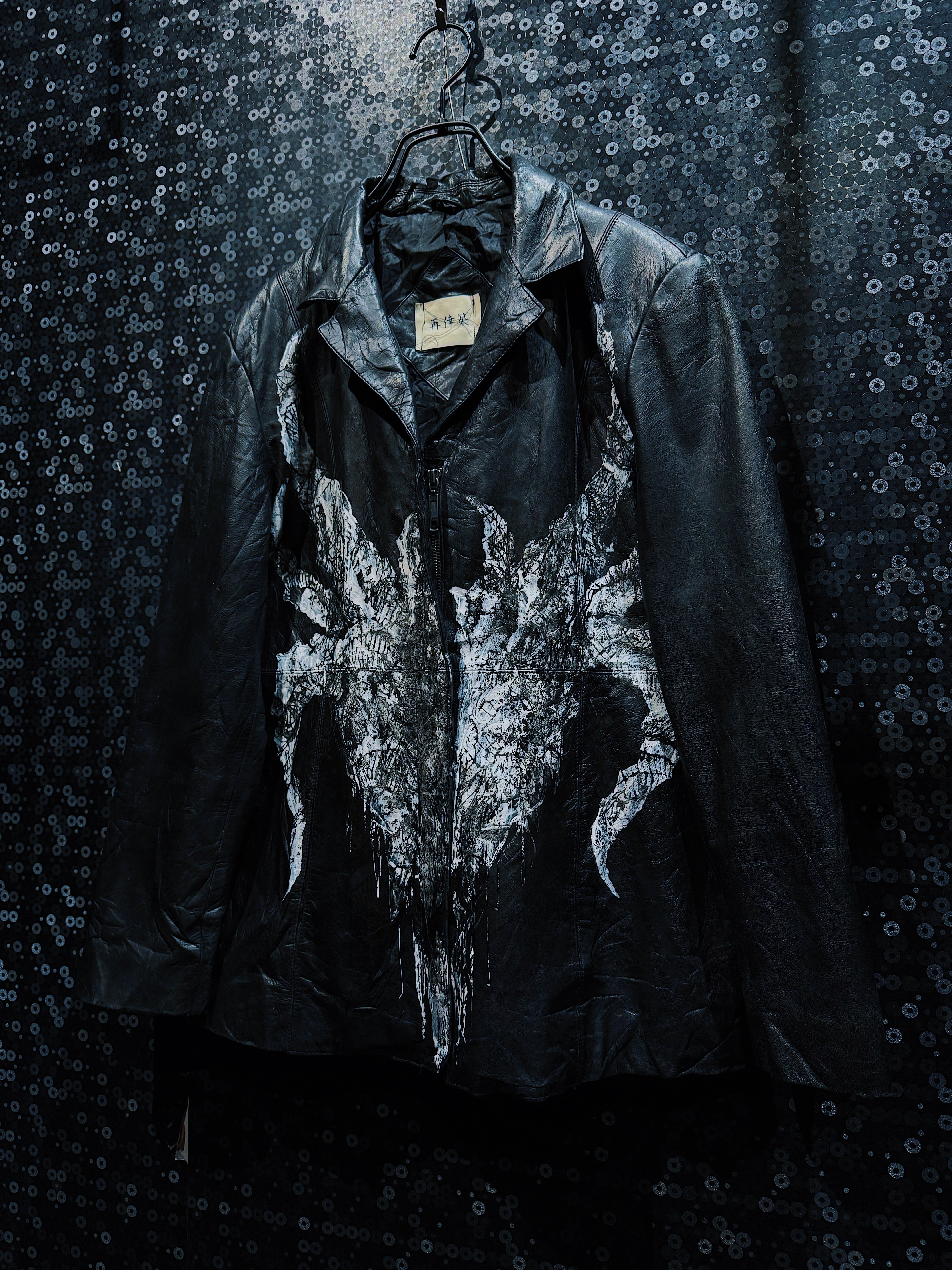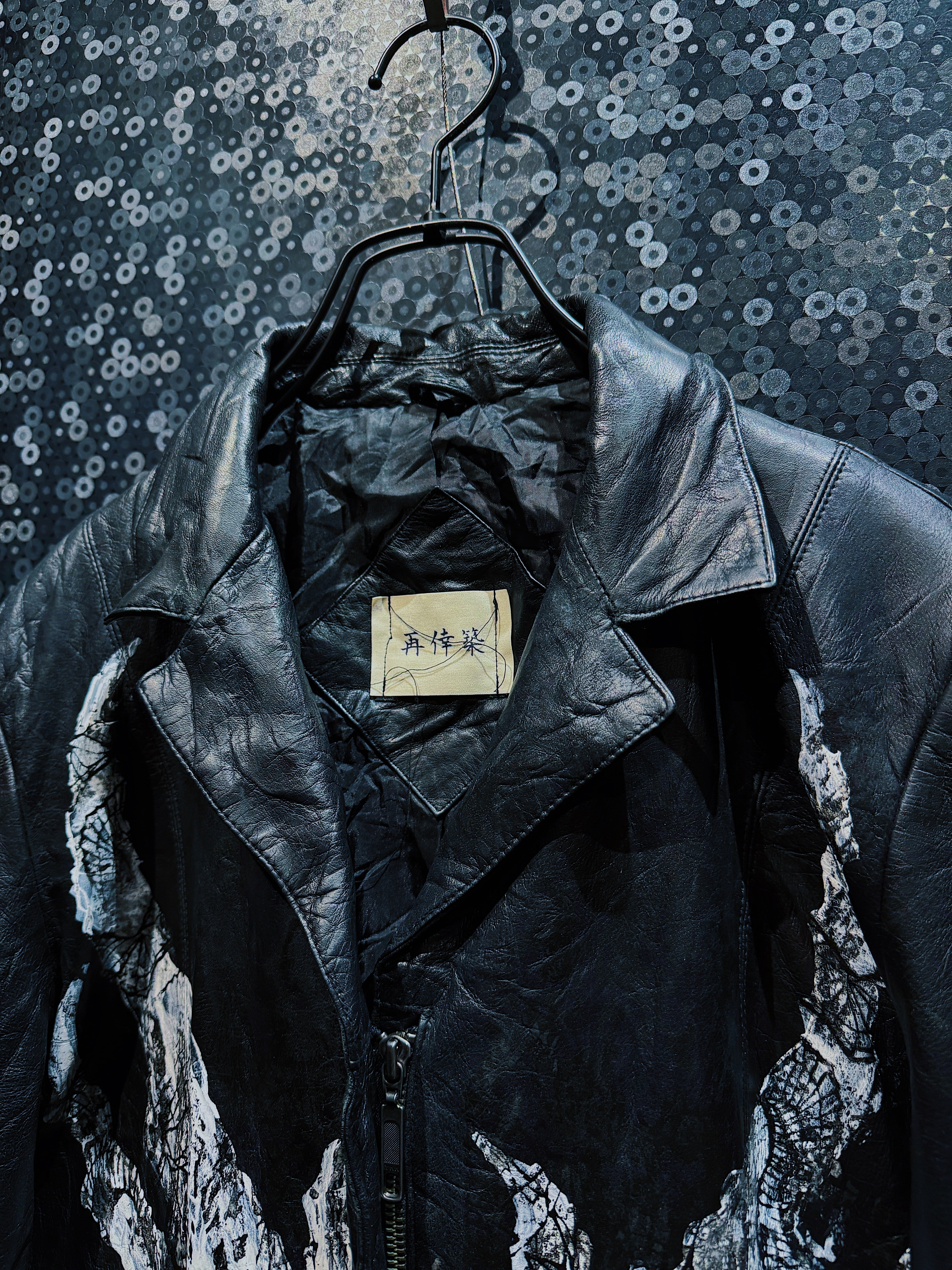 再倖築のゴートレザーをベースに、フロント全面へ再倖築ペイントデザイナー 西澤光太郎 氏によるハンドペイントを施した一点物レザージャケット。本作は氏自身が特に気に入っている個体とされ、素材・筆致・構図のバランスが極めて高い完成度で成立している。