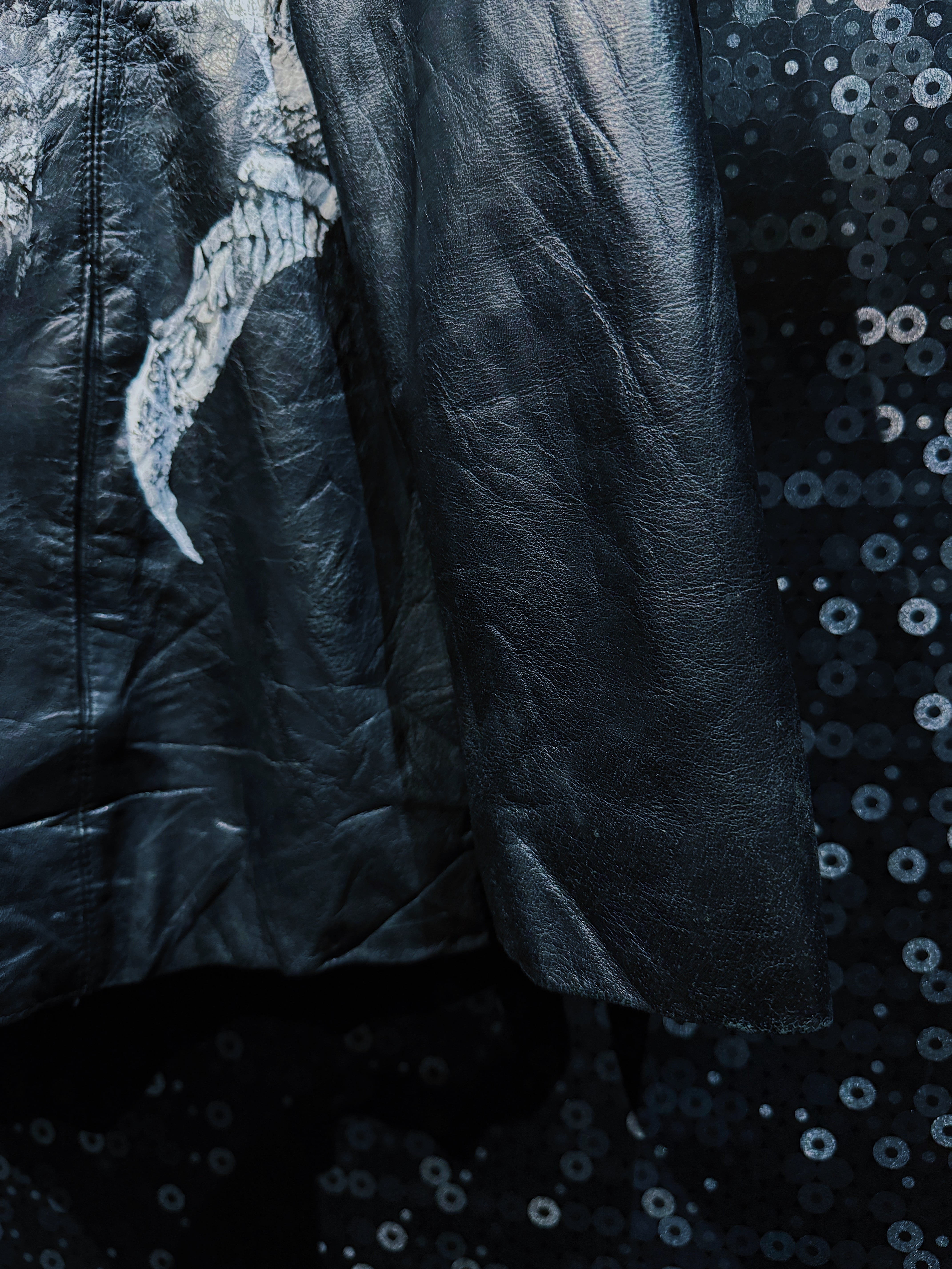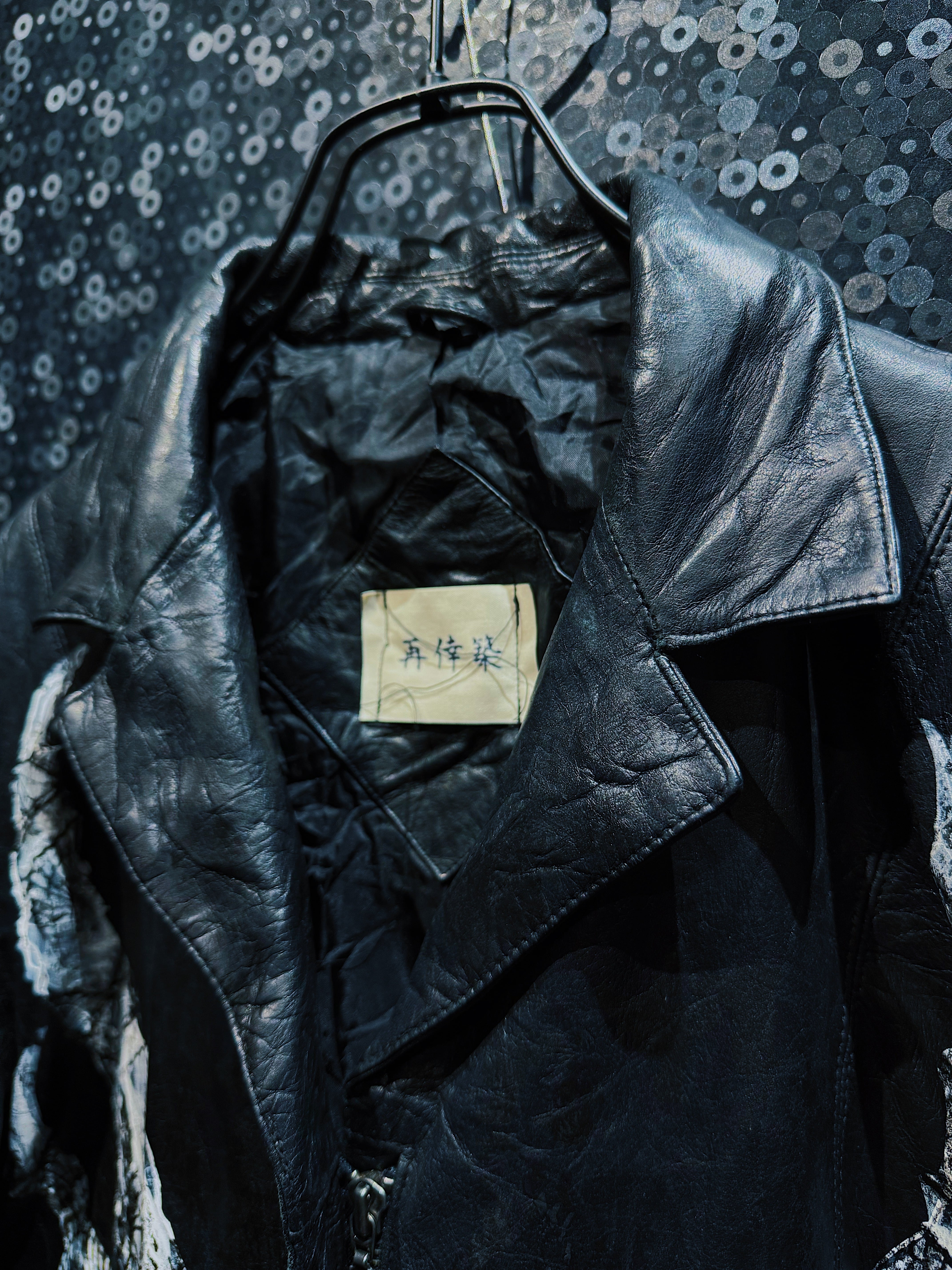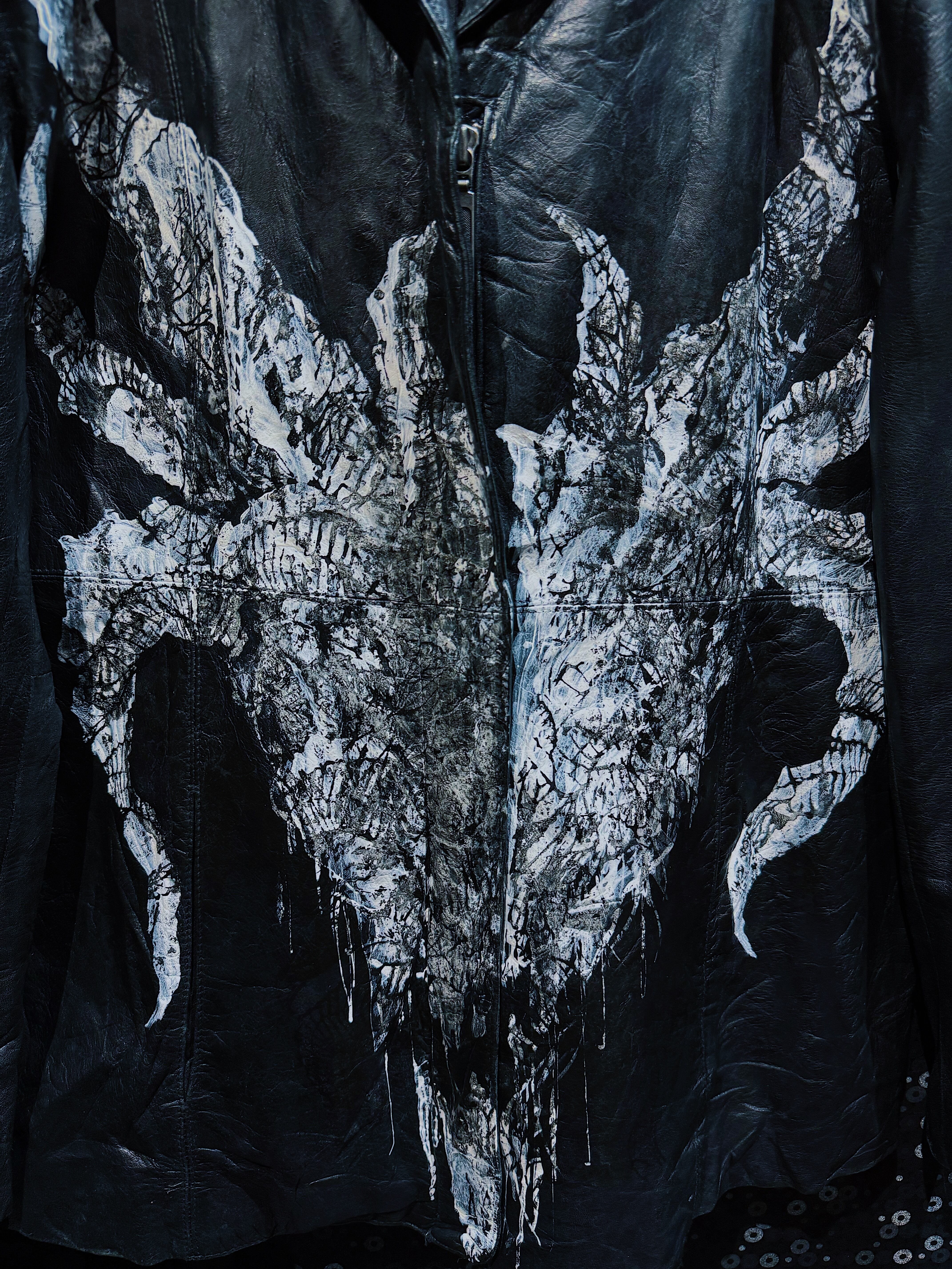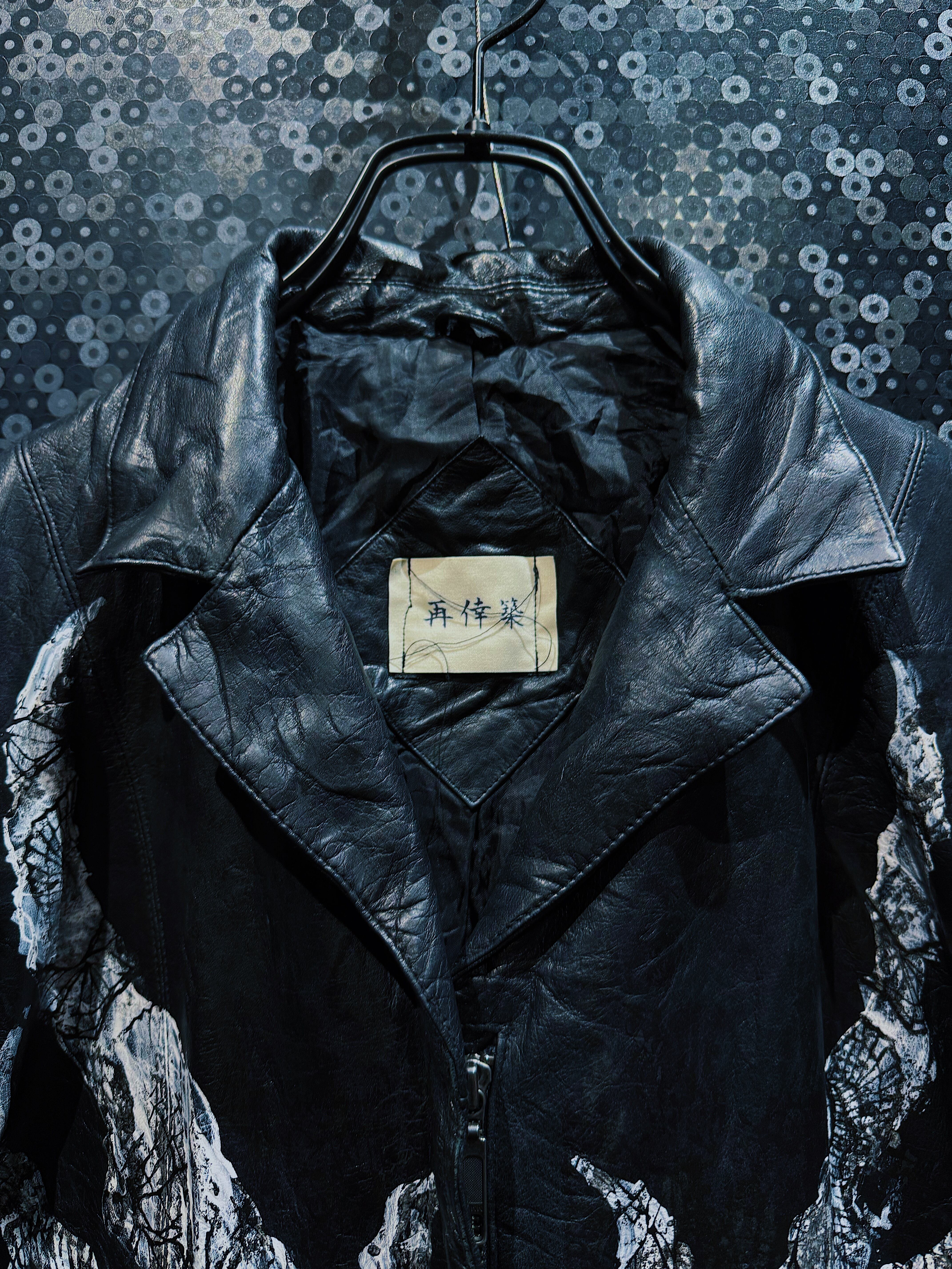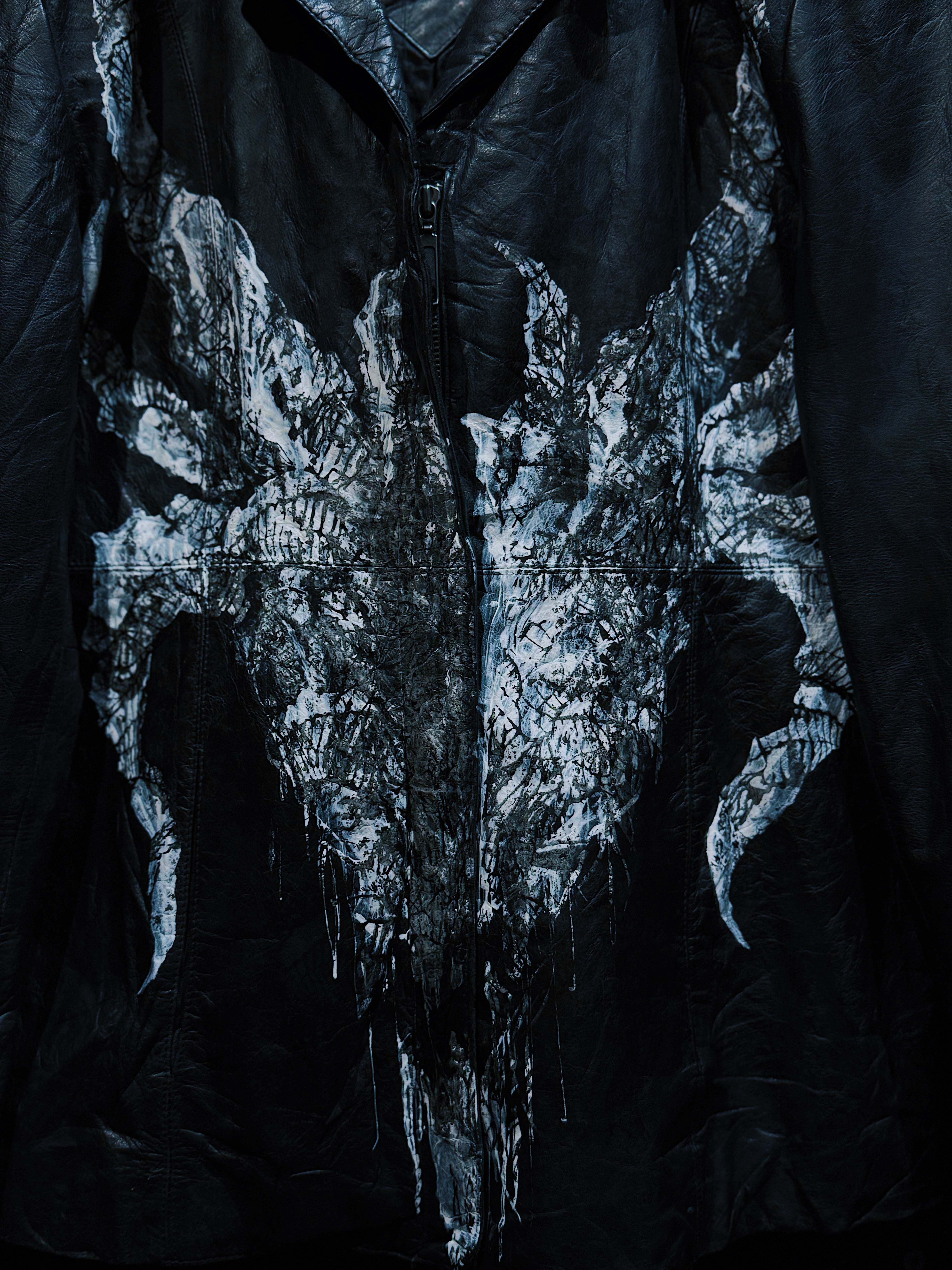 再倖築のゴートレザーをベースに、フロント全面へ再倖築ペイントデザイナー 西澤光太郎 氏によるハンドペイントを施した一点物レザージャケット。本作は氏自身が特に気に入っている個体とされ、素材・筆致・構図のバランスが極めて高い完成度で成立している。